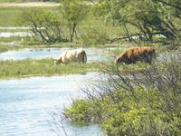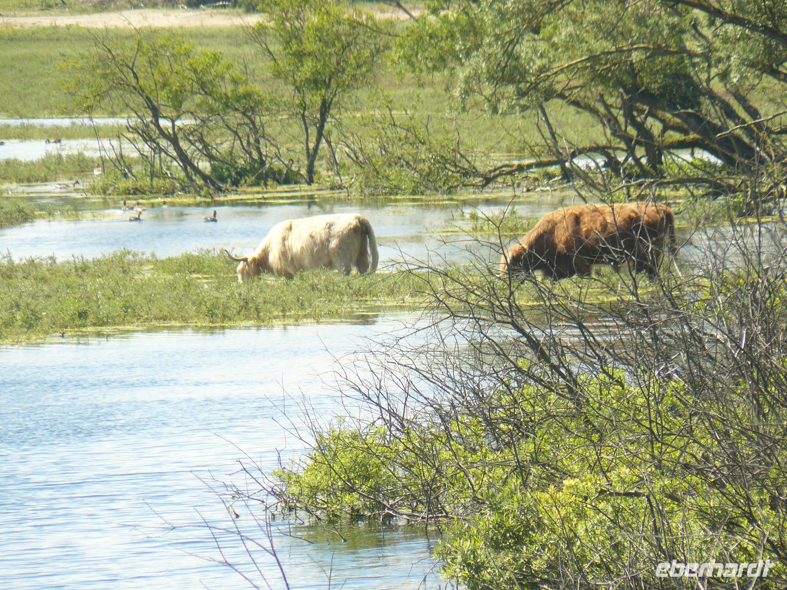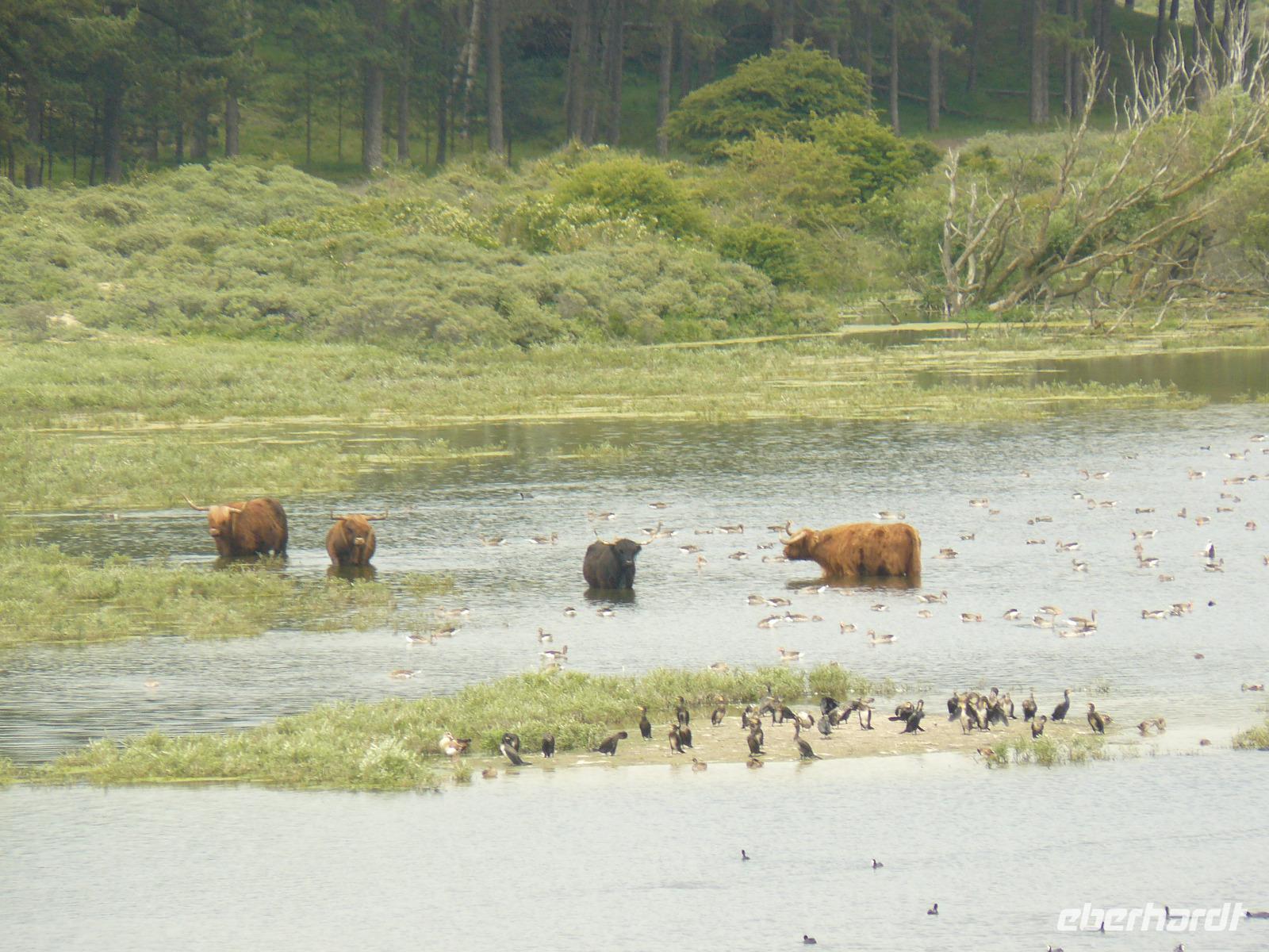 Wir machten Mittagspause am Vogelmeer, (ein „Meer" ist ein See und die „Zee" ist das Meer - Niederländisch ist tückisch!), und da waren sie: die Rinder! Ein Gast saß ihnen im Weg, denn die Rinder wollten baden gehen, und zwar auf einem ganz bestimmten Weg. Das Victory-Zeichen war's wohl nicht, aber die Highlander verstanden: wir blieben ruhig sitzen und die Rinder trotteten schnaubend um uns herum, verschwanden im Wasser und schnaubten weiter. Wir genossen auf dieses Erlebnis hin Ahornsirupwaffeln und Gevulde Koek, niederländische Süßspezialitäten. Am Strand machten wir etwas später in einem Ausflugsrestaurant wieder eine Pause und dann trennte sich die Gruppe: einige Gäste bummelten muschelsuchend am feinen Sandstrand entlang bis zu unserem Hotel. Die anderen folgten der Reiseleiterin auf verwunschenen Pfaden durch die Dünen zurück zum Bahnhof, von wo aus uns der Zug wieder nach Zandvoort zurück brachte. „Erzähl uns doch noch was am Kamin," war die Bitte. Und so gab es an diesem Abend „Das Märchen vom Fingerhut" zu hören, denn am Nachmittag hatten wunderschöne, weißblühende Fingerhutpflanzen unseren Rückweg gesäumt. Später brachen ein paar Gäste noch auf zum Sonnenuntergang am Sandstrand.