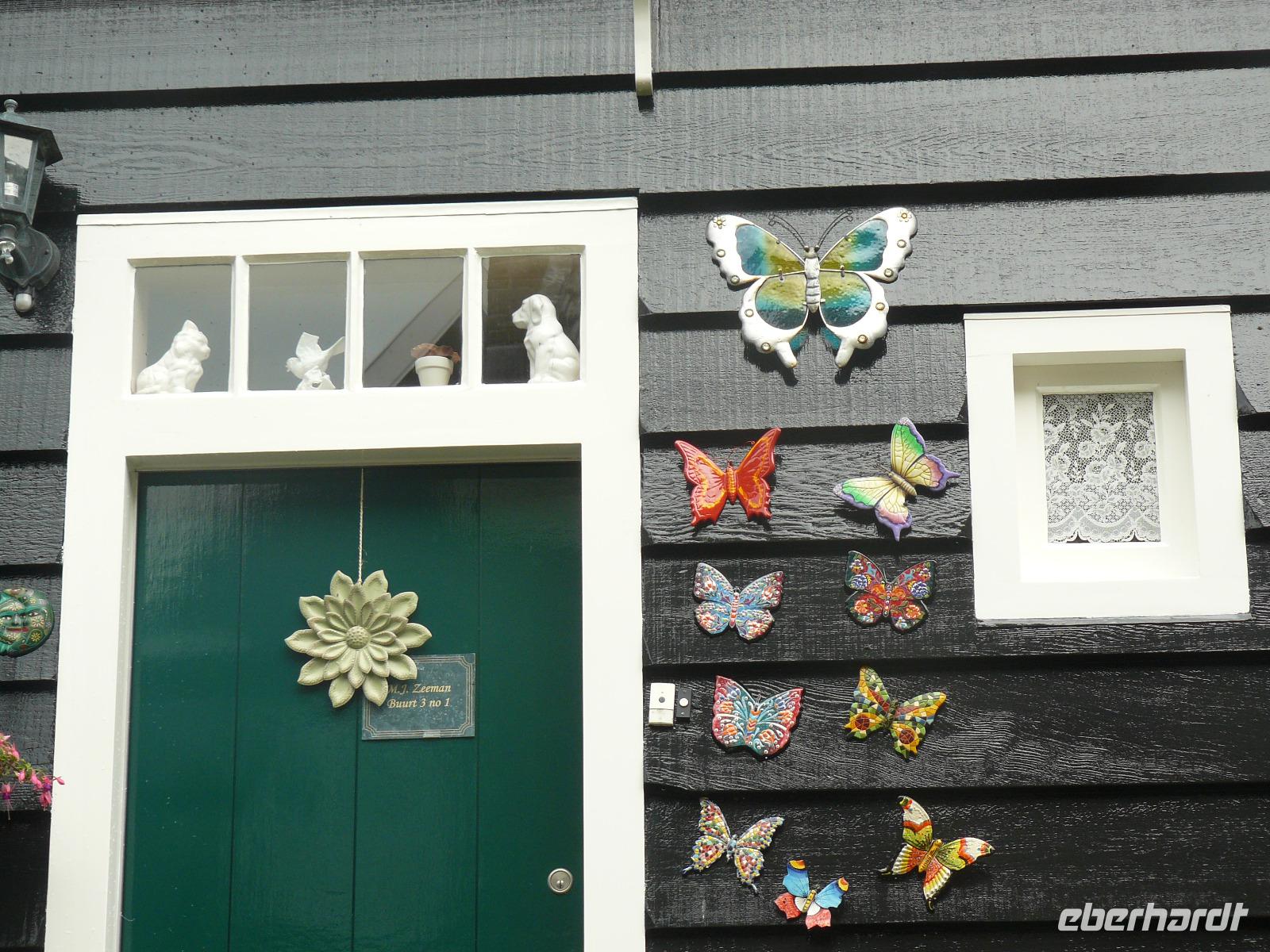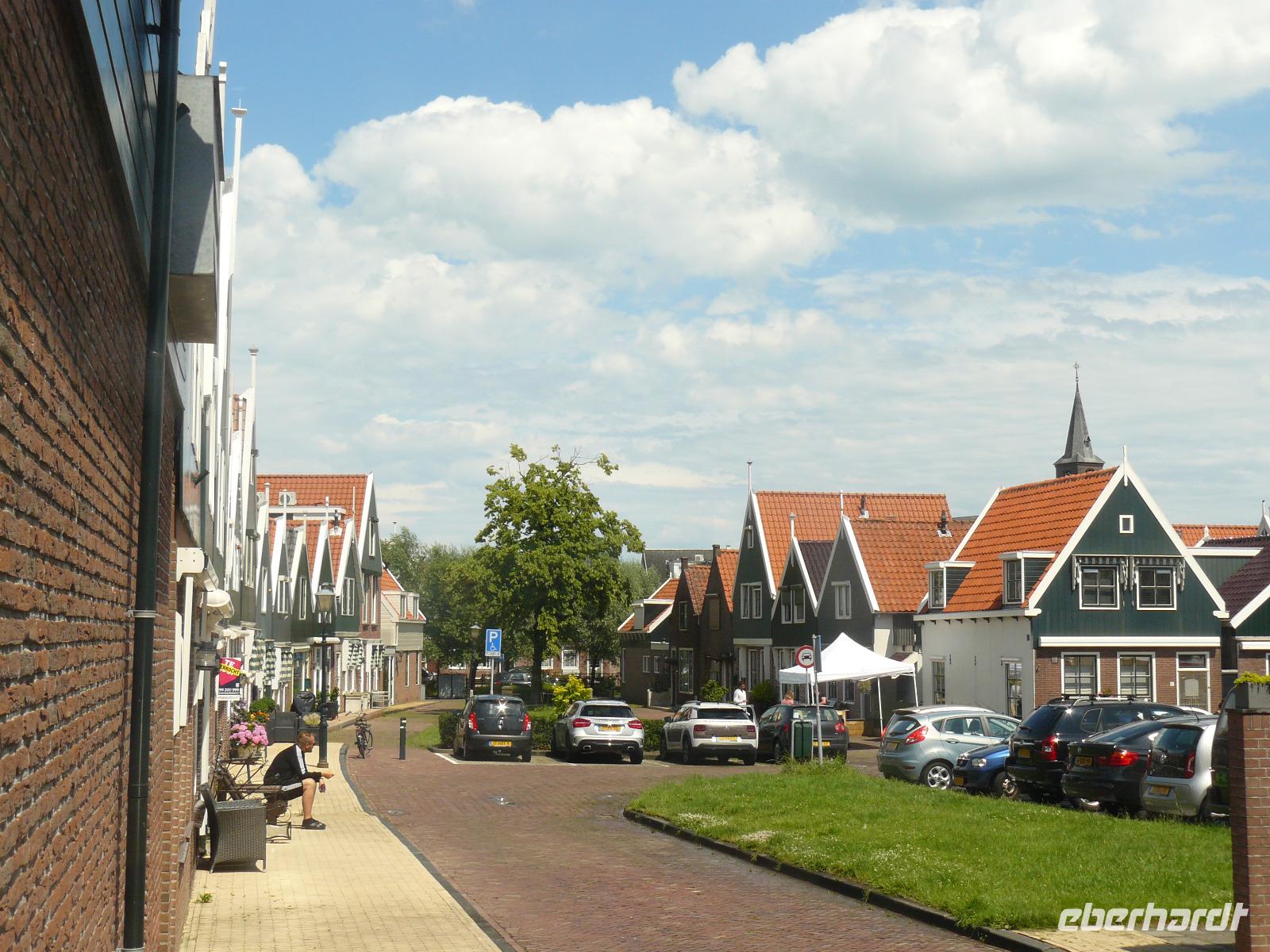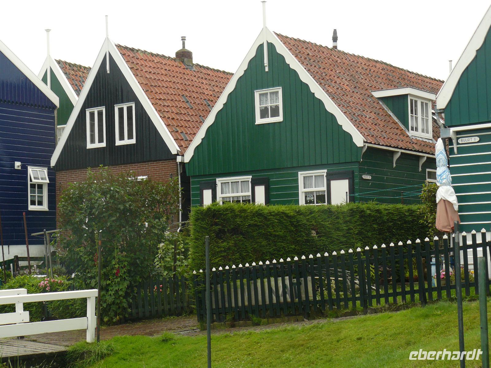 Mit sonnigen Bildern vom Vortag im Herzen zogen wir los. Die hatten wir auch nötig, denn ein weiterer Regentag war angesagt. Wir fuhren mit dem Zug nach Amsterdam und stiegen dort um in den Bus, der uns durch das Waterland über den Deich auf die Insel Marken brachte. Marken war bis 1957 wirklich eine Insel im Ijsselmeer, ist seither aber genau genommen ein Halbinsel. Wir besichtigten den malerischen Ort mit seinen grünen und schwarzen Holzhäusern und wollten eigentlich den Nordteil der Insel wandernd umrunden. Das Wetter machte uns aber mal wieder einen Strich durch die Rechnung. Nach wenigen Metern fing es stärker an zu regnen, und 10 Gäste machten kehrt und erprobten den Einkehrschwung am Hafen des malerischen Dörfchens. Dort wartete es sich gut, denn 2 wanderfreudige Gäste ließen sich von Wind und Wetter nicht zurückhalten, und die Reiseleiterin wanderte mit ihnen los. Allerdings umrundeten wir die Insel nicht ganz - nach eineinhalb Stunden hatten auch wir genug!