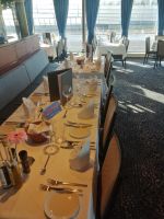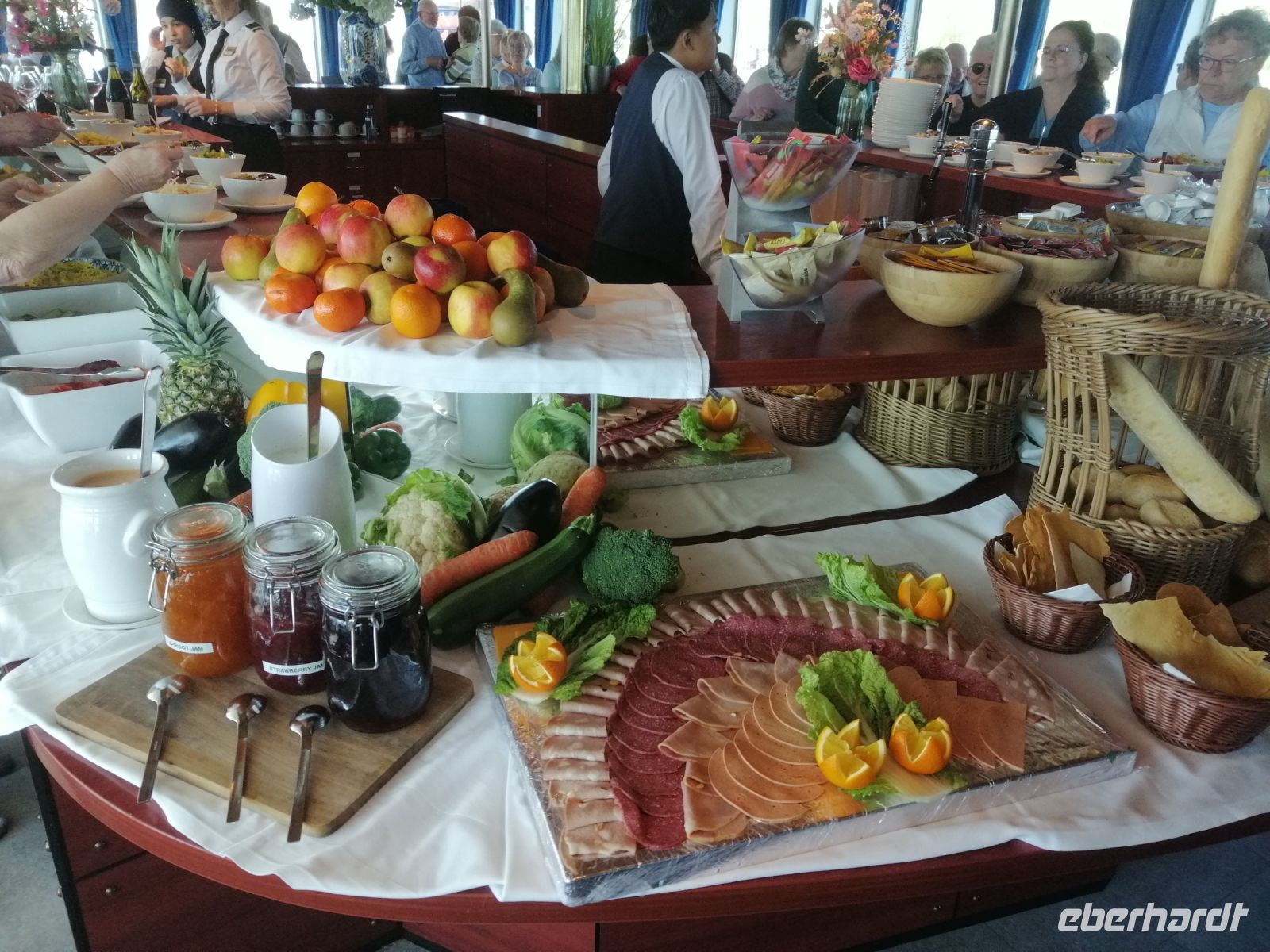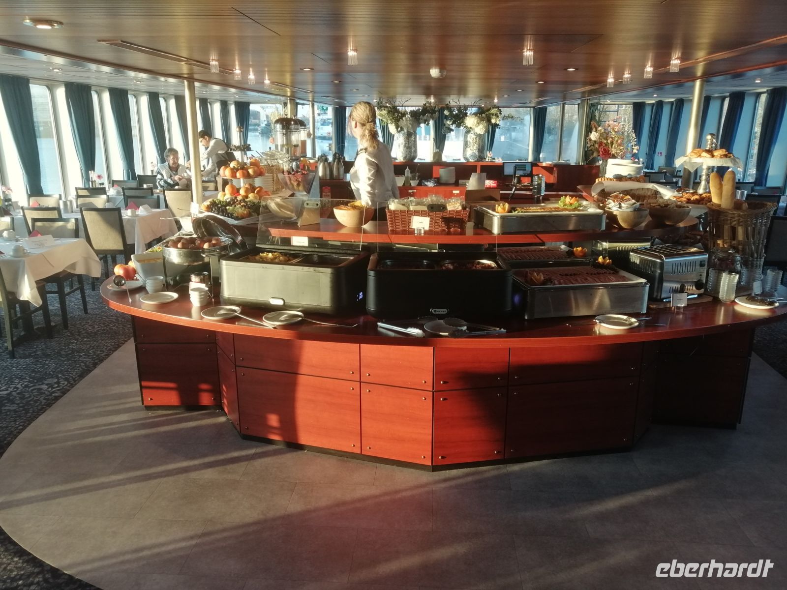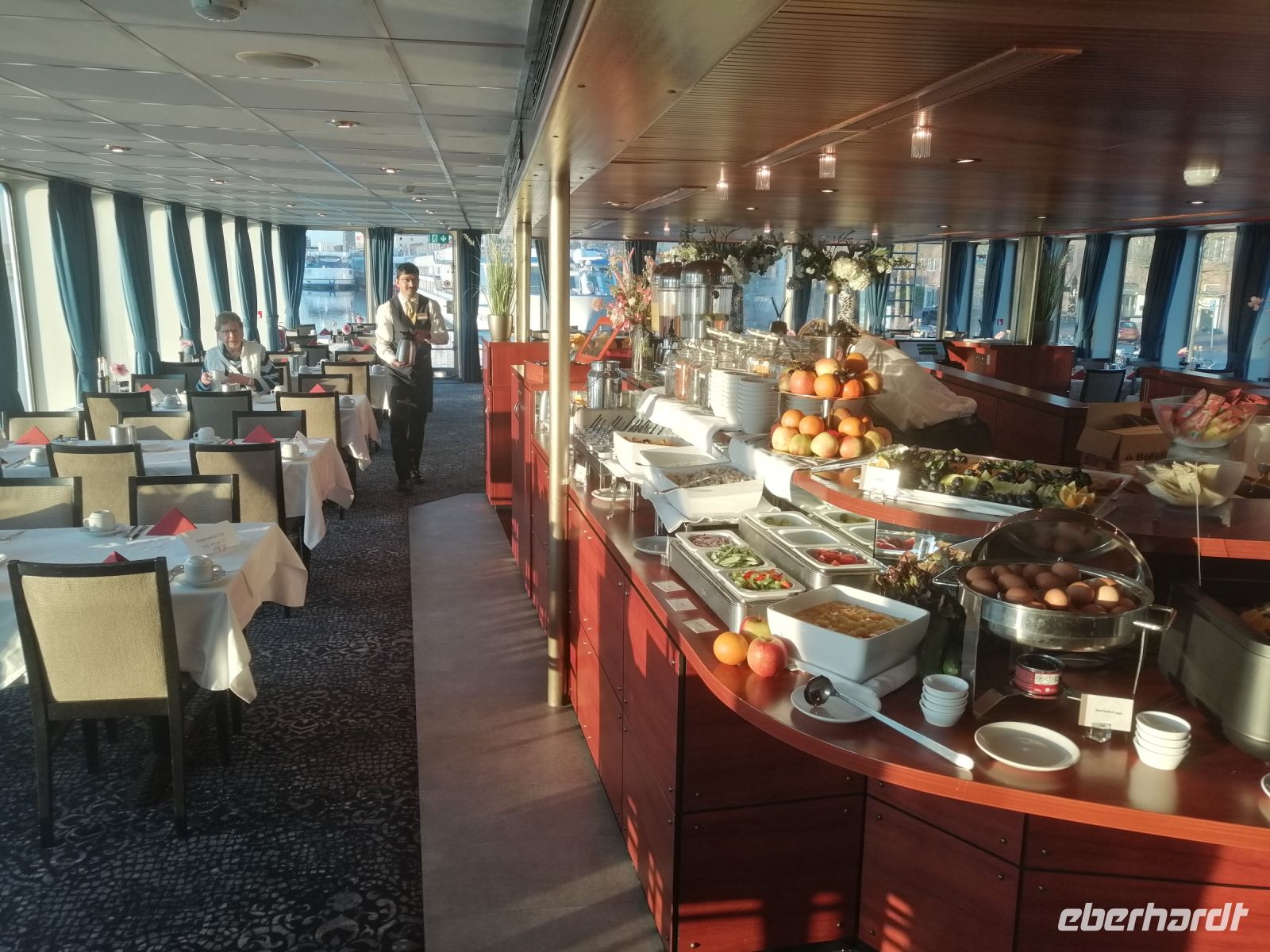 Für unsere Frühaufsteher begann der Tag sanft und wohlig: ab 6:30 Uhr dampfte in der Lounge schon der Kaffee – wer wollte, konnte sich mit einer Tasse Tee oder Kaffee langsam wachduften lassen, während draußen der Morgennebel noch zart über dem Wasser hing. Ab 7:30 Uhr wartete dann das Frühstücksbuffet – reich gedeckt und wie immer mit Blick auf die vorbeiziehende Landschaft.
