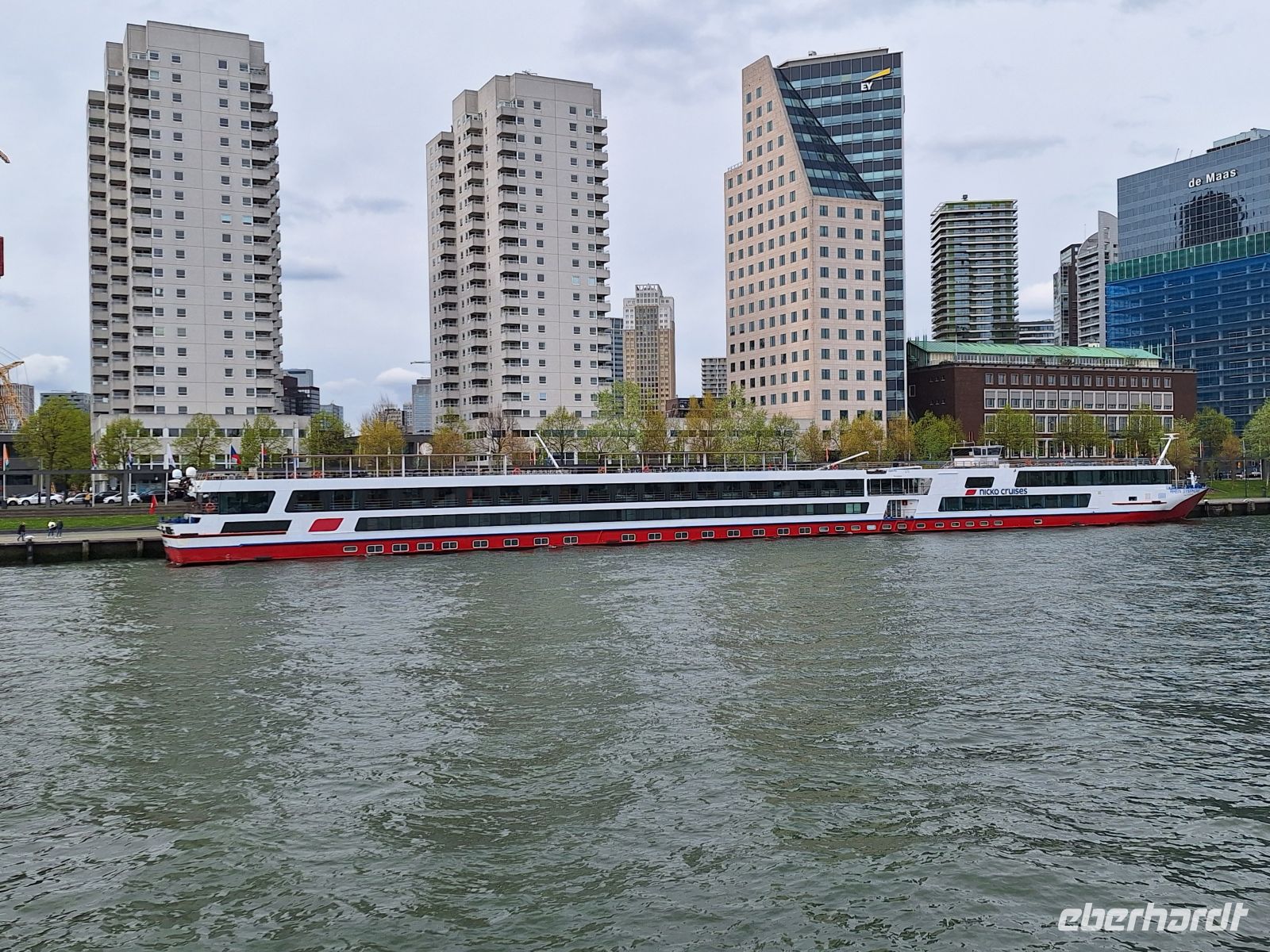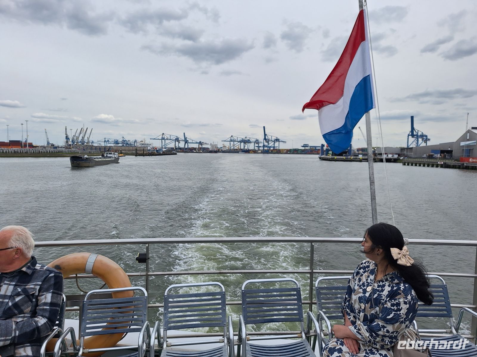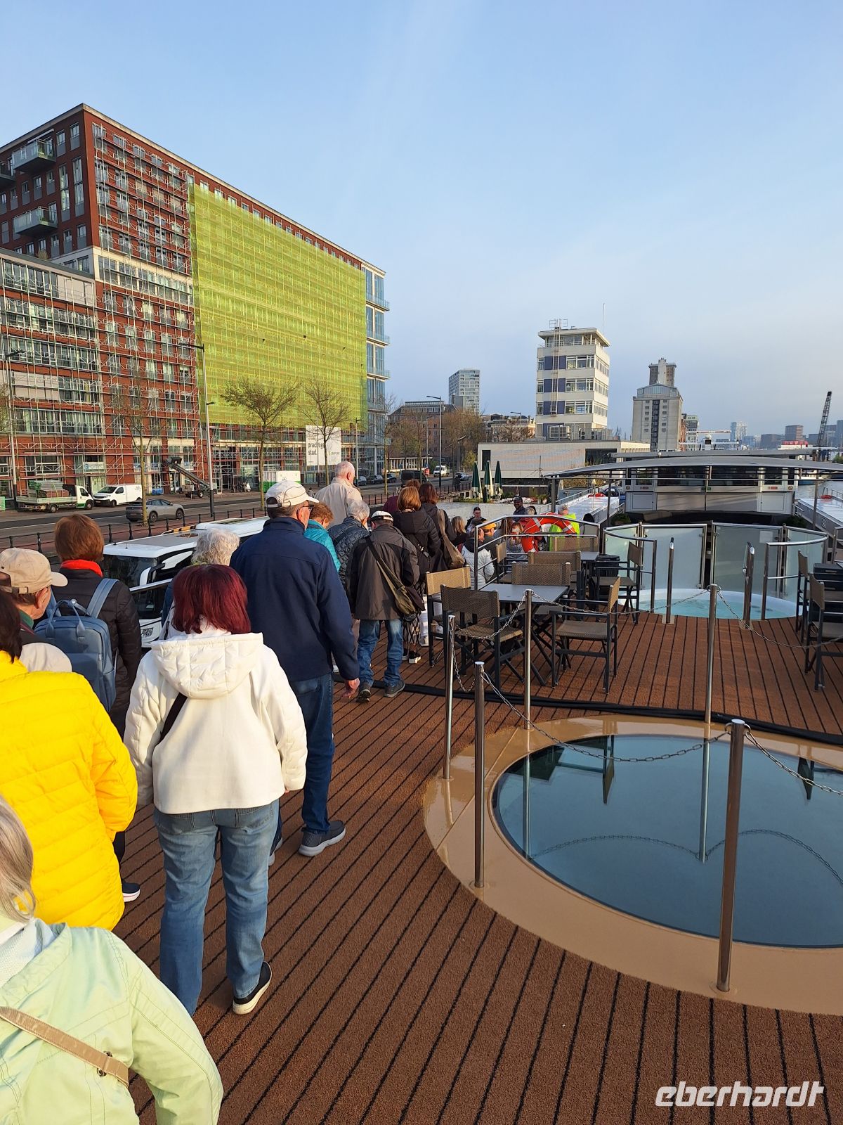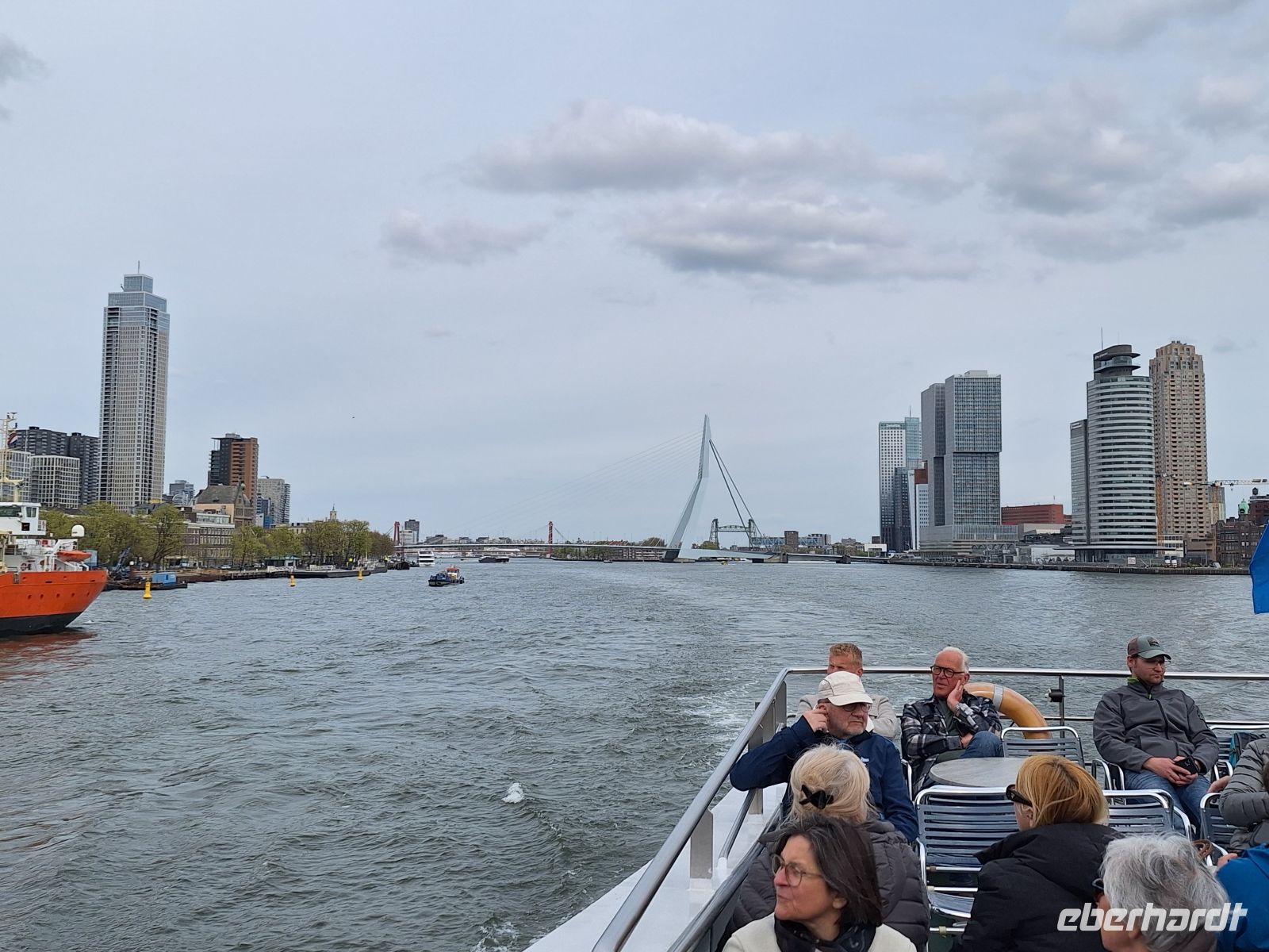 Am Nachmittag lud uns die Reederei zu einer Stadtrundfahrt mit anschließender Hafenrundfahrt ein. Rotterdam ist eine beeindruckende Stadt, die vor allem durch ihre imposante Architektur besticht. Vorgaben oder Bestimmungen scheint es nicht zu geben, jeder kann bauen wie er will. Man kann herrliche Hochhäuser betrachten, wo man sich fragt, kippen die nicht mal um? Es ist ein großer Kontrast zur üblichen holländischen Bauweise, das gefällt nicht allen Einheimischen, da gibt es große Diskussionen. Aber den Touristen gefällt das Stadtbild. Immerhin wurde die Stadt im Weltkrieg fast vollständig zerstört. Während der anschließenden Hafenrundfahrt wurde das Stadtbild vom Wasser aus nochmals beeindruckend bestätigt. Wir konnten natürlich nicht die gesamten 40 Kilometer des Hafens betrachten, aber wesentliche Sehenswürdigkeiten konnten alle in den Gedanken und im Bild festhalten. Besonders imposant war die Vorbeifahrt am Schiff „Rotterdam“ dem ersten Kreuzfahrtschiff das über den Atlantik von Rotterdam nach New York fuhr. Vorbei an großen Containerschiffen kehrten wir mit vielen Eindrücken zu unserm „Kreuzfahrtschiff“ zurück. Zum Abendessen verwöhnte uns das Küchen- und Servicepersonal wieder mit einem leckeren 4-Gang Menü. Mit vielen schönen Momenten und gesättigt ließen wir den Abend gemütlich im Salon ausklingen, während draußen langsam die Lichter Rotterdams im Wasser glitzerten.