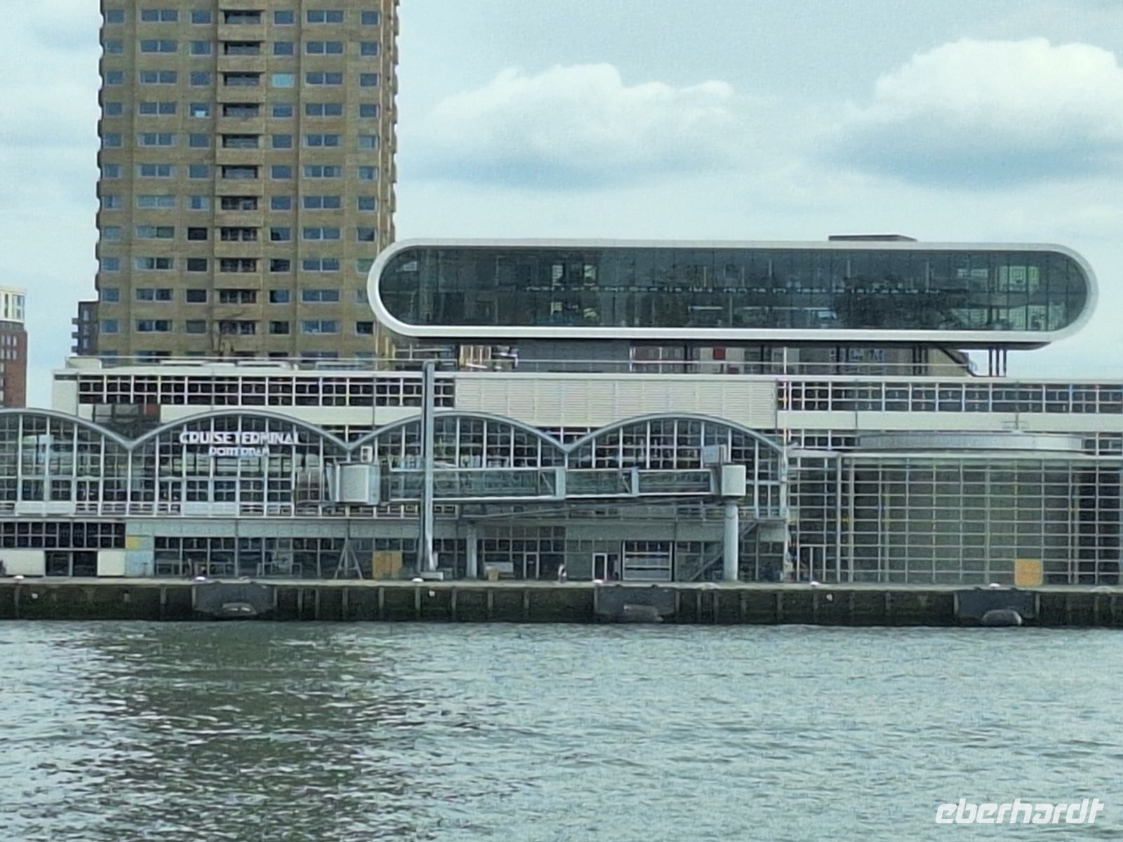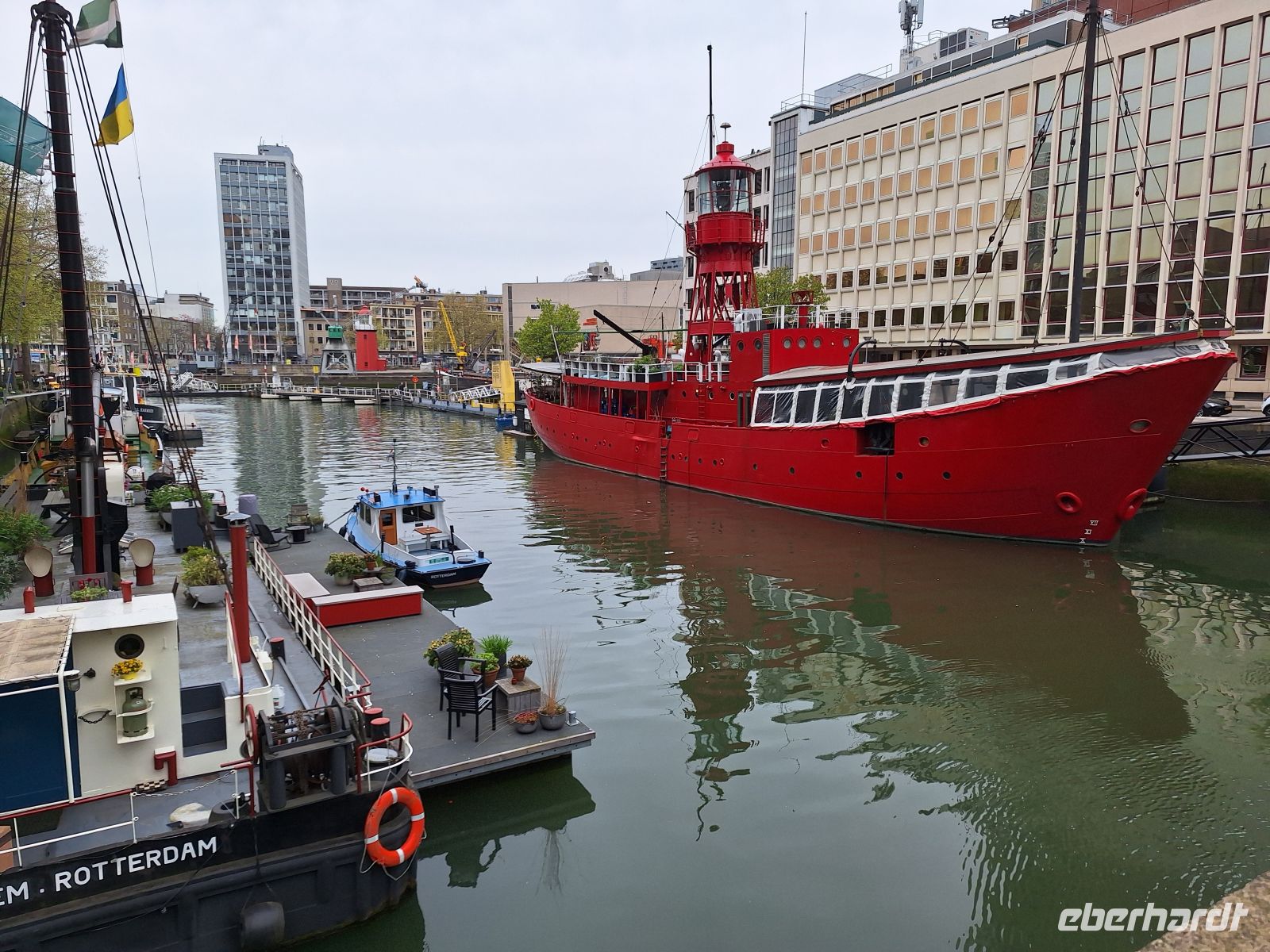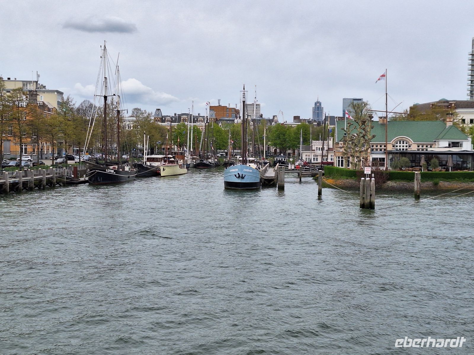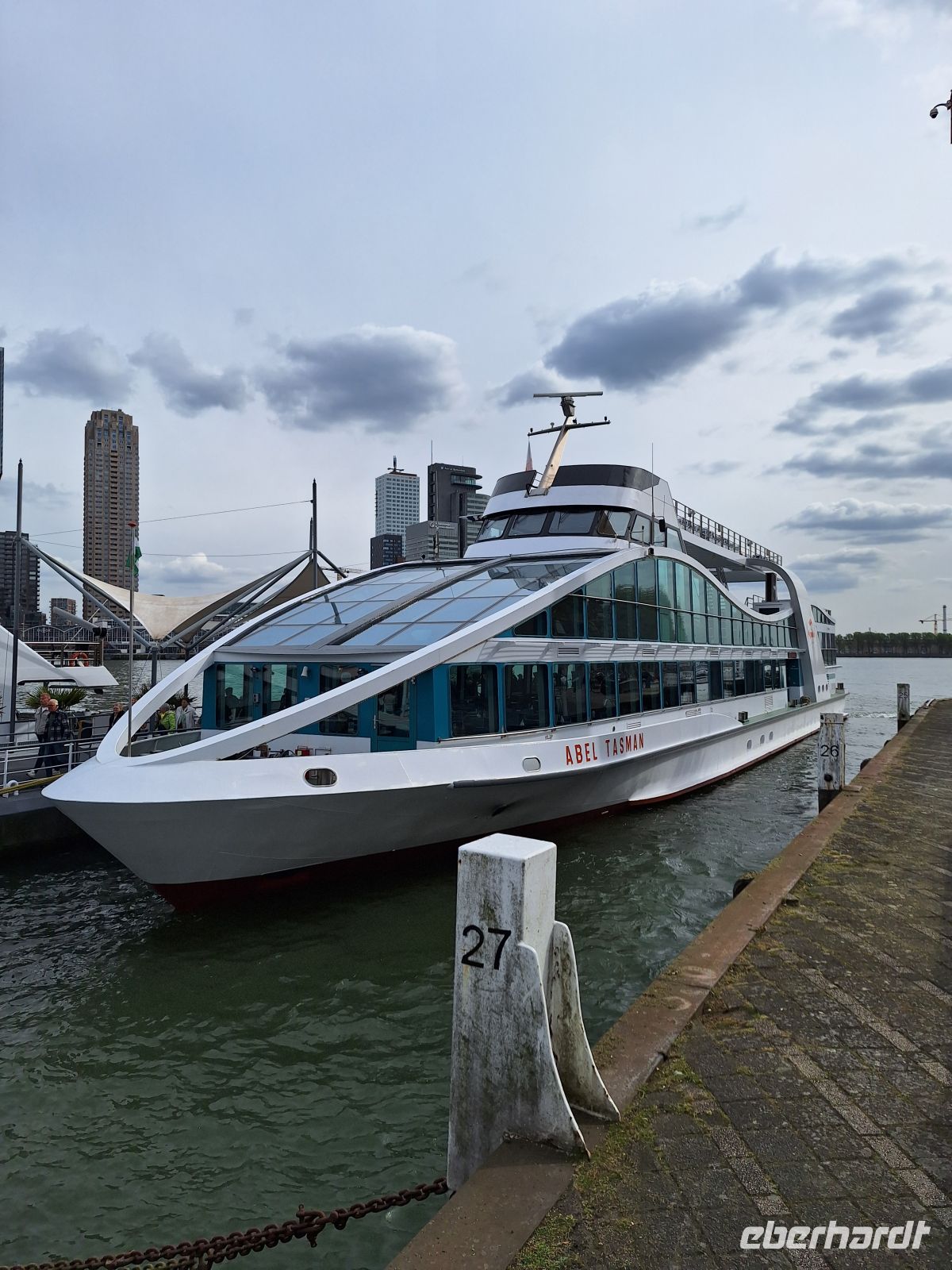 Am Nachmittag lud uns die Reederei zu einer Stadtrundfahrt mit anschließender Hafenrundfahrt ein. Rotterdam ist eine beeindruckende Stadt, die vor allem durch ihre imposante Architektur besticht. Vorgaben oder Bestimmungen scheint es nicht zu geben, jeder kann bauen wie er will. Man kann herrliche Hochhäuser betrachten, wo man sich fragt, kippen die nicht mal um? Es ist ein großer Kontrast zur üblichen holländischen Bauweise, das gefällt nicht allen Einheimischen, da gibt es große Diskussionen. Aber den Touristen gefällt das Stadtbild. Immerhin wurde die Stadt im Weltkrieg fast vollständig zerstört. Während der anschließenden Hafenrundfahrt wurde das Stadtbild vom Wasser aus nochmals beeindruckend bestätigt. Wir konnten natürlich nicht die gesamten 40 Kilometer des Hafens betrachten, aber wesentliche Sehenswürdigkeiten konnten alle in den Gedanken und im Bild festhalten. Besonders imposant war die Vorbeifahrt am Schiff „Rotterdam“ dem ersten Kreuzfahrtschiff das über den Atlantik von Rotterdam nach New York fuhr. Vorbei an großen Containerschiffen kehrten wir mit vielen Eindrücken zu unserm „Kreuzfahrtschiff“ zurück. Zum Abendessen verwöhnte uns das Küchen- und Servicepersonal wieder mit einem leckeren 4-Gang Menü. Mit vielen schönen Momenten und gesättigt ließen wir den Abend gemütlich im Salon ausklingen, während draußen langsam die Lichter Rotterdams im Wasser glitzerten.