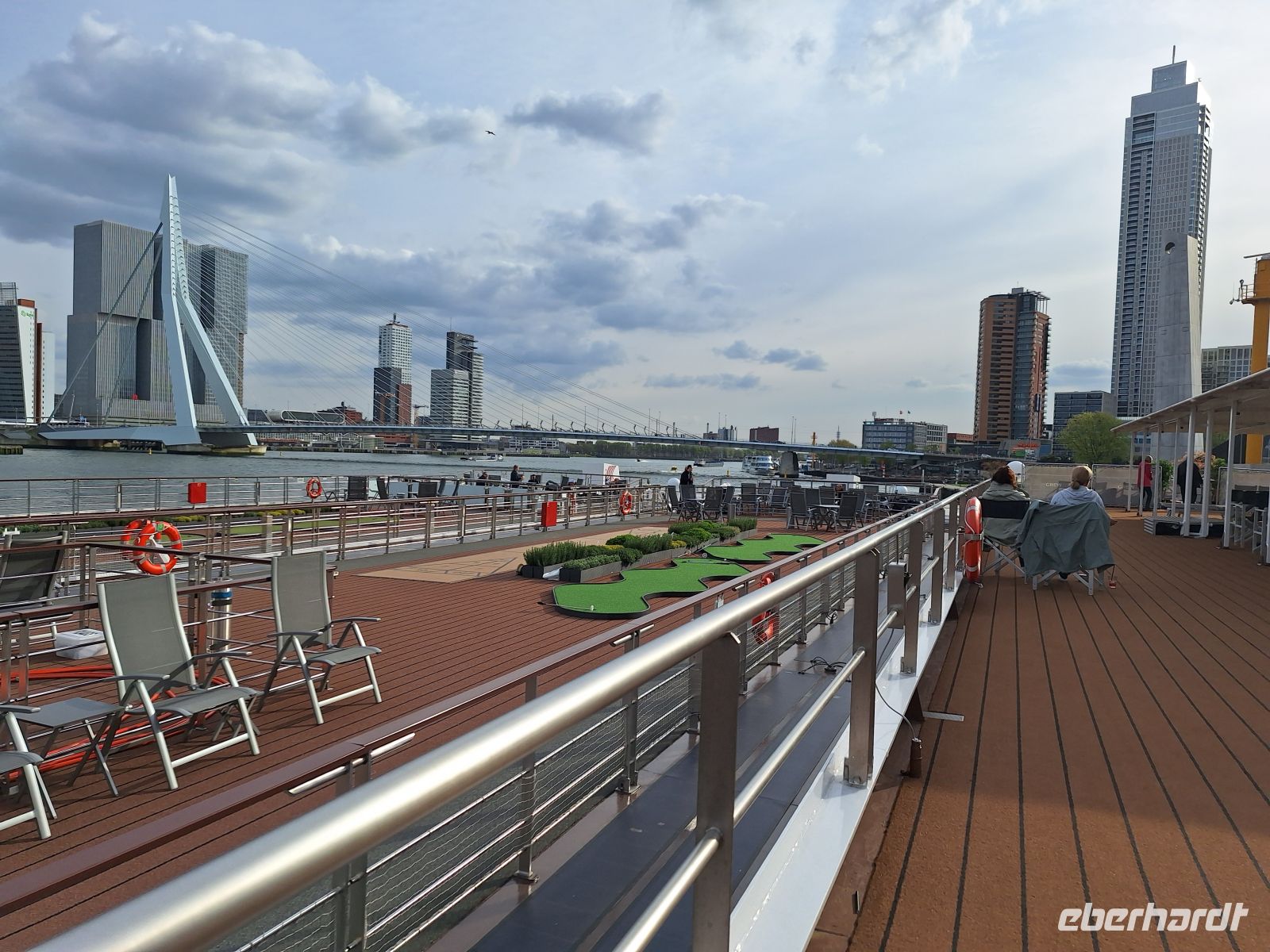 Ein reichhaltiges und schmackhaftes Abendessen war ein guter Start für unsere Reise. Anschließend lud die Bar zum Kennenlernen und Verweilen ein. Und wer wollte, konnte beim Blick auf das Wasser schon mal von Windmühlen, Blumenmeeren und holländischem Käse träumen.