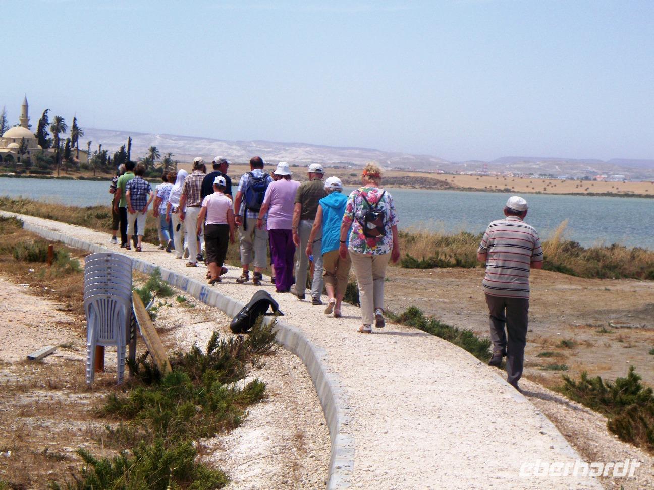 Am Morgen fuhren wir nach Ayia Napa. Doch bevor es richtig losgehen konnte, begrüßten wir unseren Buschauffeur Jorgos mit einem kräftigen „Kalimera“. Unser erster Stopp war das ehemalige Kloster in Ayia Napa aus dem Jahr 1530. Heute dient es u.a. als Museum. Doch bevor wir die Anlage richtig betraten bestaunten wir noch eine jahrhundertealte Sykomore. Sie war so unheimlich groß und gut erhalten. Nach dem Besuch der Klosteranlage ging es weiter nach Larnaca, entlang der „Roten Dörfer“, die ihren Namen durch die rote fruchtbare Erde erhalten haben. In Larnaca besuchten wir die berühmte Lazarus-Kirche aus dem 10. Jahrhundert. Danach hatten wir Zeit an der Palmenpromenade lang zu schlendern. Weiter ging es zum Salzsee. Hier legten wir ein gemütliches Picknick ein, es gab alles was das Herz begehrt. Egal ob Gemüse, Wurst, typischer Halloumi oder Fetakäse bis hin zum Wein. Den Abschluss vom Picknick bildete ein klarer Verdauungsschnaps. Danach liefen wir gemütlich am Salzsee entlang zur Hala-Sultan-Tekke. Die Hala-Sultan-Tekke ist ein moslemischer Wallfahrtsort und hier soll eine enge Vertraute des Propheten Mohammeds ruhen. Unser letzter Stopp an diesem Tag war in Pyla. Dieser Ort befindet sich in der Pufferzone der UNO und leider ist das Fotografieren hier verboten. Aber davon ließen wir uns nicht weiter stören. Wir genossen in einem Dorfkaffino einen türkischen Kaffee und beobachteten die griechisch- und türkischen Zyprioten beim gemeinsamen Zusammenleben. Außerdem erfreuten wir uns beim Backgammonspielen von unserem Buschauffeur und Reiseleiter. Das Match hieß Jorgos gegen Jorgos. Das ein Jorgos gewinnt war allen von uns klar. Wir wussten nur noch nicht wer gewinnt und verfolgten das Spiel aufmerksam. Es gewann unser Reiseleiter. Nach dem spannenden Spiel ging es entlang der „Verbotenen Zone“ zurück in unser Hotel. Die restliche Zeit bis zum Abendessen verbrachten wir mit einer Erfrischung im Meer. Doch das Wasser war nicht für jeden so angenehm wie für uns Deutsche. Jorgos empfand das Wasser als extrem kalt, doch mit viel Mut traute er sich doch hinein. Bei einem schönen Abendessen unterhielten wir uns über den gelungenen Tag und ließen im Anschluss den Abend an der Bar ausklingen.