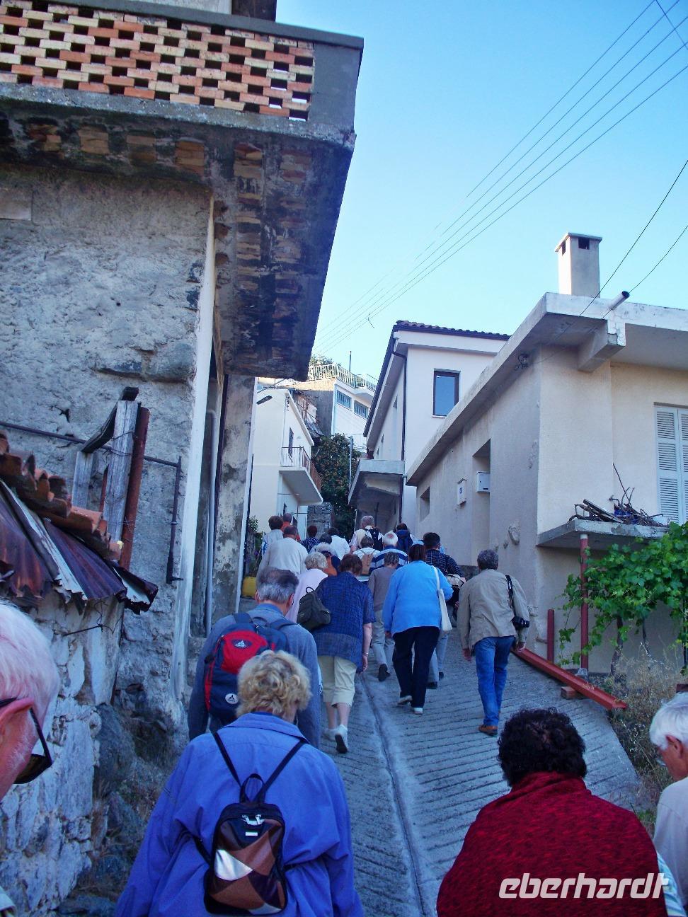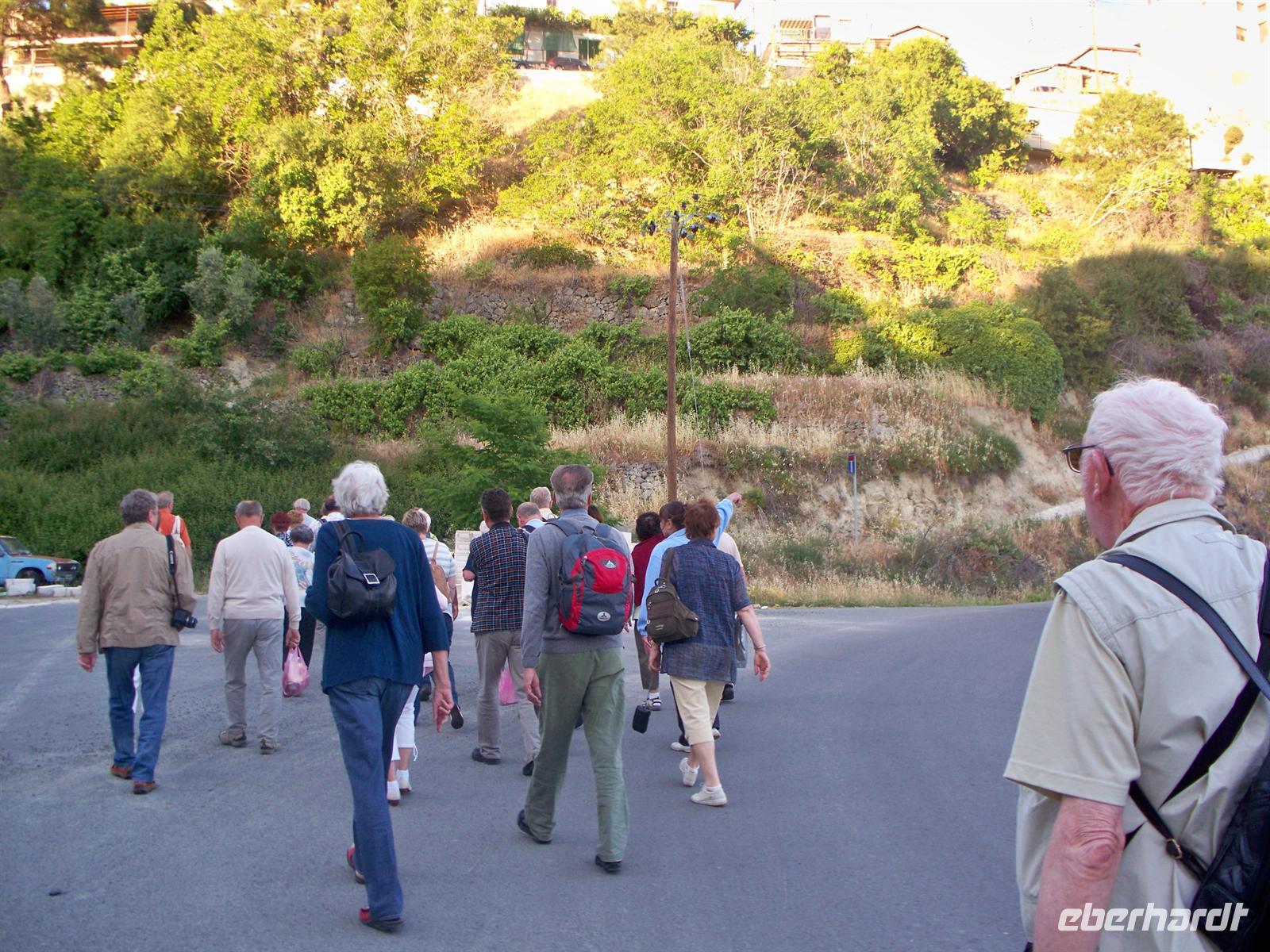 Den heutigen Tag konnte jeder Gast bis nachmittags individuell gestalten. Einige von uns gingen wandern und andere genossen die idyllische Ruhe am Pool. Gegen 16Uhr trafen wir uns alle wieder und Ismini, die Chefin unserer Partneragentur, zeigte uns Agros bei einem Spaziergang. Wir lernten die einzige Rosenmanufaktur auf der Insel kennen. Hier konnten wir sehen, wie aus gepflückten Rosenblättern Rosenwasser, -likör, -cremé oder ähnliches hergestellt wird. Weiter ging es zu Niki, sie stellt Marmelade und kandierte Früchte her. Unsere letzte Station war die Dorffleischerei. Alle Stationen waren natürlich mit einer Verkostung verbunden. Im Anschluss liefen wir in eine schöne gemütliche Taverne. Hier wartete Jorgos wieder auf uns und wir mussten uns schon wieder von Ismini verabschieden. Bei einem typischen Meze-Essen und lokalem Wein ließen wir es uns gut gehen. Nach dem vielen Essen hatten wir keine Lust mehr bergan zu unserem Hotel zu laufen, deshalb sind wir mit dem Bedford-Oldtimer-Bus zum Hotel gefahren. Es war noch ein Erlebnis zum Abschluss des Tages und ein Vorgeschmack auf den nächsten.