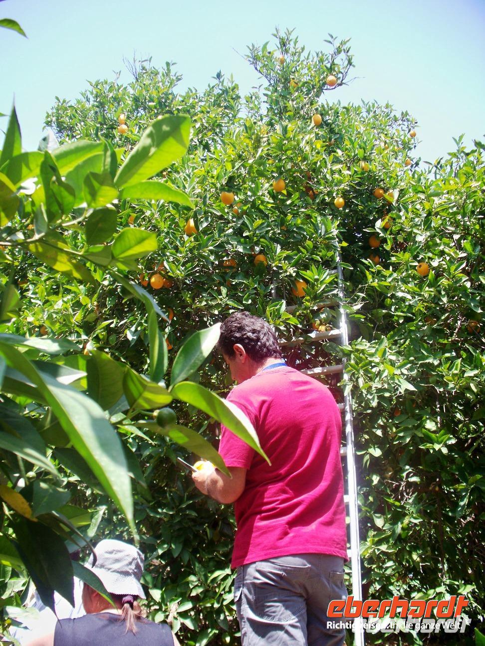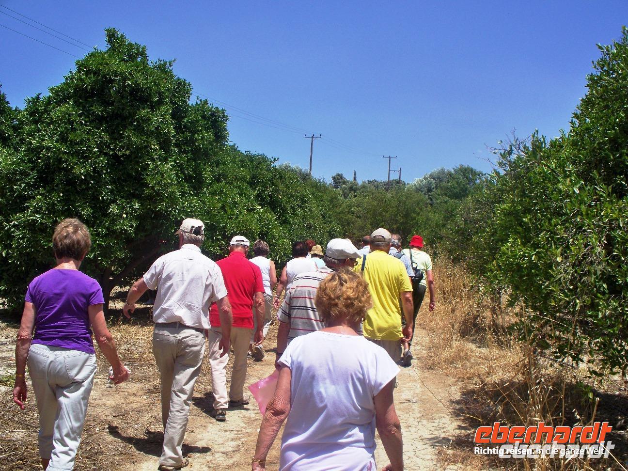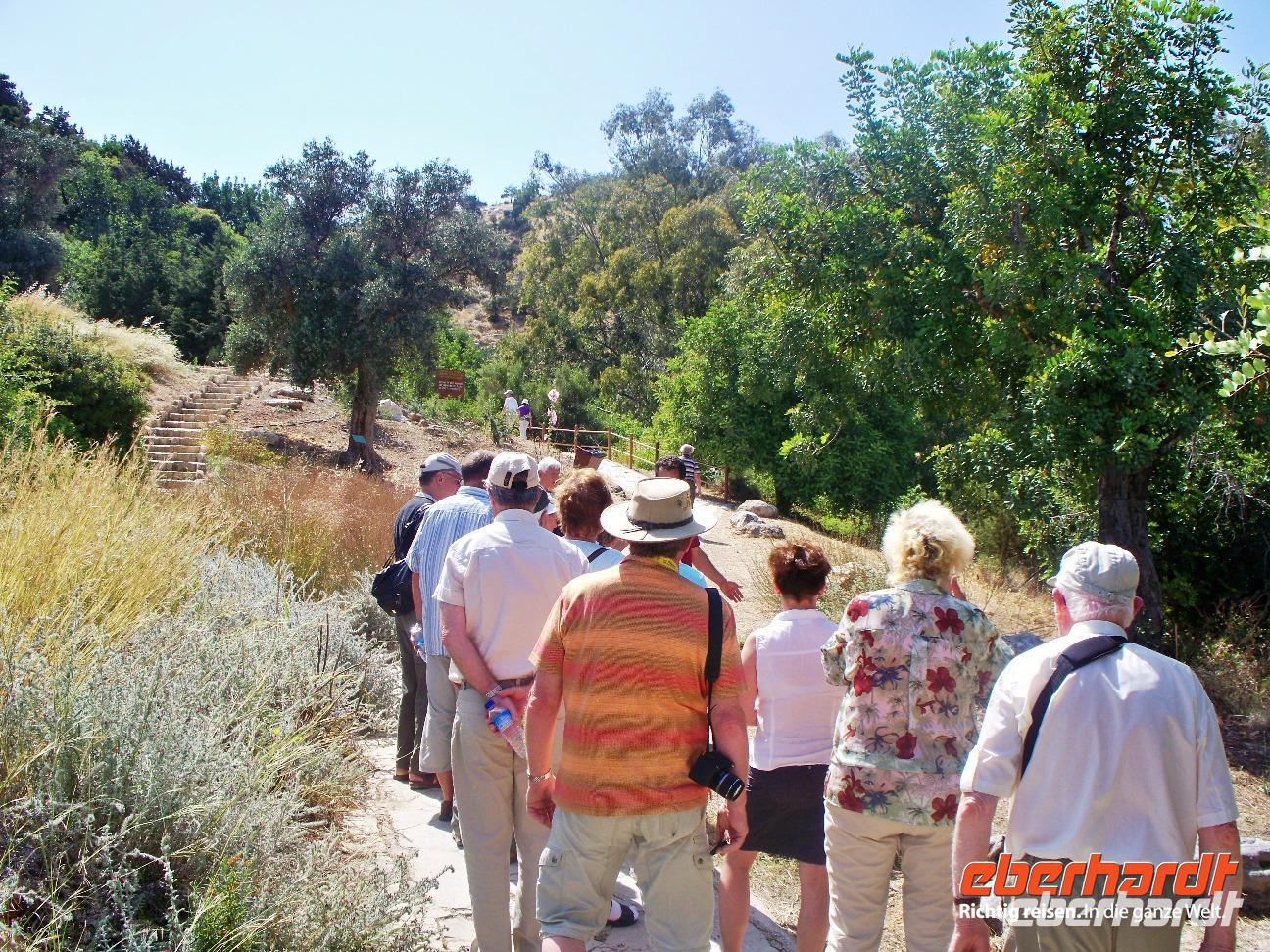 Am vorletzten Tag zeigte uns Jorgos noch einmal sehr viel wunderschönes von seiner Heimat. So besuchten wir das Haus des Dionysos mit vielen beeindruckenden Mosaiken, welche auch noch sehr gut erhalten sind. Nach nur ca. 5 Minuten erreichten wir die Königsgräber. Im Anschluss fuhren wir weiter zum Felsenkloster des Agios Neofytos aus dem 12. Jahrhundert, wo wir u.a. die Höhlenkirche besichtigten. Unser nächster geplanter Stopp war das Fischerdorf Latsi. Doch bevor wir es erreichten legten wir eine Pause an einer Orangenplantage ein. Hier hatten wir die Gelegenheit selber frische Orangen zu pflücken. Einige Gäste waren so eifrig dabei und kletterten sogar auf die Leiter und auf den Baum um die schönsten Orangen zu pflücken. Sie waren so lecker und saftig. Einfach super. Solche Orangen isst man nicht jeden Tag. Nach diesem Highlight konnte es nun weiter gehen nach Latsi. Hier machten wir unsere Mittagspause. Nach der Stärkung ging es auf die Akamas-Halbinsel. Bei einem Mittagsspaziergang schauten wir uns das Bad der Aphrodite an, denn der Legende nach, soll hier der bevorzugte Badeplatz von Aphrodite und der Treffpunkt mit ihrem heimlichen Liebhaber Adonis gewesen sein. Jorgos sagte uns, wenn man in dem Wasser badet, wird man bis zu 20 Jahre jünger. Leider ist baden verboten, doch viele nahmen das Wasser aus der Quelle und beträufelten sich damit. Nach der Besichtigung vom Bad der Aphrodite ging unser kleiner Spaziergang auf der Akamas-Halbinsel weiter. In dieser Zeit hatten wir immer einen traumhaften Blick zum Meer nach unten. Von hier aus sah man, welche schöne Farbe das Meer hat. Danach machten wir uns wieder auf dem Rückweg zum Hotel.