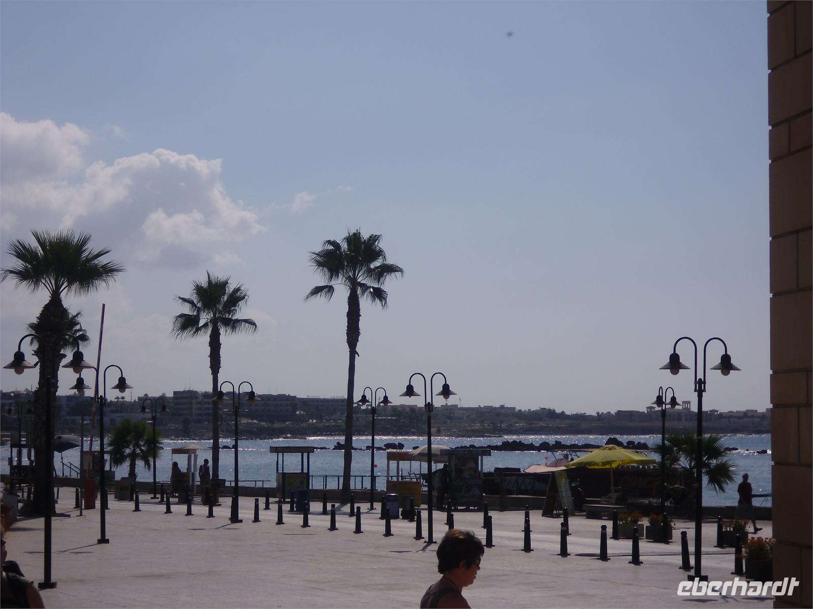 Der Weg vom Hotel Cynthiana zur Bushaltestelle sind nur ca. 5 Minuten und die Busfahrt nach Pafos ist relativ günstig. Nach einem Fahrplan haben wir im Hotel nicht gefragt, da die Busse aller 10 Minuten fahren. Wir entschieden uns für den Bus zum Hafen. Nach einer Busfahrt von ungefähr 25 Minuten kamen wir am malerischen Hafen an. Von hier aus haben wir einen Spaziergang an der Hafenpromenade unternommen und besuchten immer wieder die Geschäfte um uns mit Souveniren für die Verwandten einzudecken. Anschließend nahmen wir den Bus zum Markt, wo wir uns zuerst mit einem sehr leckeren Stück Apfelkuchen stärkten. Nach dieser Stärkung begaben wir uns auf den Markt und schauten was die Händler alles anzubieten hatten. Nach unserer Erkundungstour nahmen wir wieder bequem den Linienbus zum Hotel.