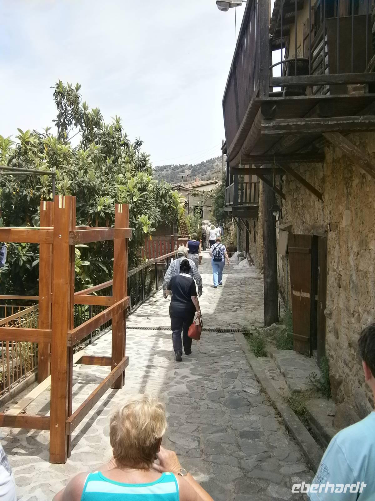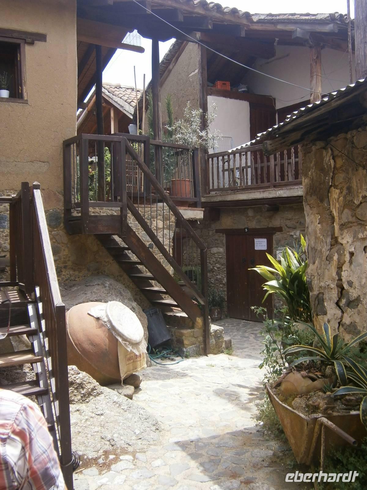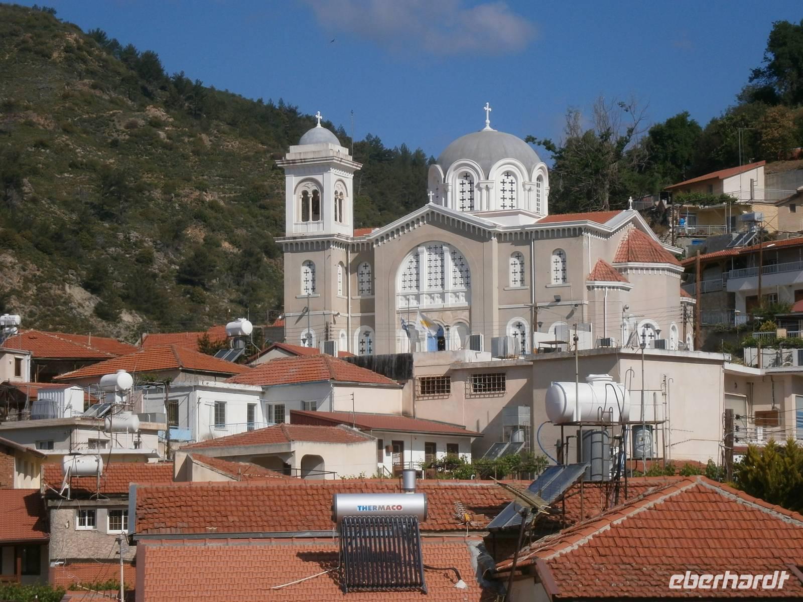 Am Anfang stand der Besuch der Scheunendachkirche in Pelendri, welche auch zum UNESCO-Weltkulturerbe gehört. Während unseres Aufenthaltes in Pelendri ging der Gottesdienst zu Ende - jede Kirche in Deutschland würde vor Neid erblassen über die Anzahl der Kirchgänger, es herrschte erst mal ein gewisses Verkehrschaos. Weiter ging die Fahrt zum Kalidonia Wasserfall, der mit einer Wanderung von 1,5km über Stock und Stein erreicht wurde. Der Rückweg war dann deutlich ebener. Abwärts ging es dann mit dem Bus nach Fioni zum Mittagessen in die Taverne Neraida bei Wirt Dimitris, auch wieder ein Mezze-Essen, aber diesmal mehr aus dem Backofen - wir haben kaum Platz genommen in der Taverne, fing es an zu hageln, etwas was selbst Georgios in seinem Leben bisher sehr selten erlebt hat. Nach dem üppigen Essen, selbstverständlich wieder mit Weiß- und Rotwein ging es weiter zum Heimatmuseum des Dorfes, welches durch Herrn Pilavakis gestiftet wurde und viele eindrucksvolle Zeitzeugen vom Leben auf dem Lande beherbergte. Weiter ging es bergauf und -ab zum Weingut Anthenodorou, auf dem wir uns bei einer Verkostung von den sehr guten Qualitäten zypriotischer Weine und Olivenöle überzeugen konnten. Mit dem gemeinsamen Abendessen ging auch dieser erlebnisreiche Tag zu Ende.