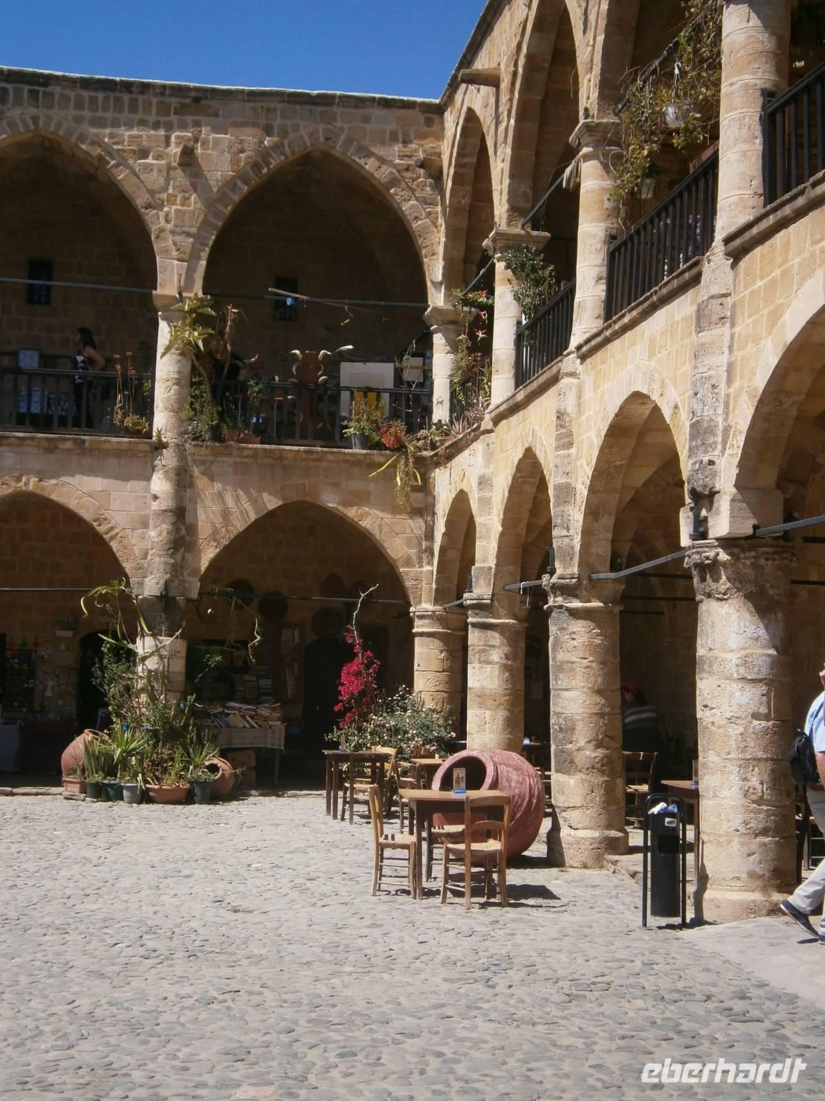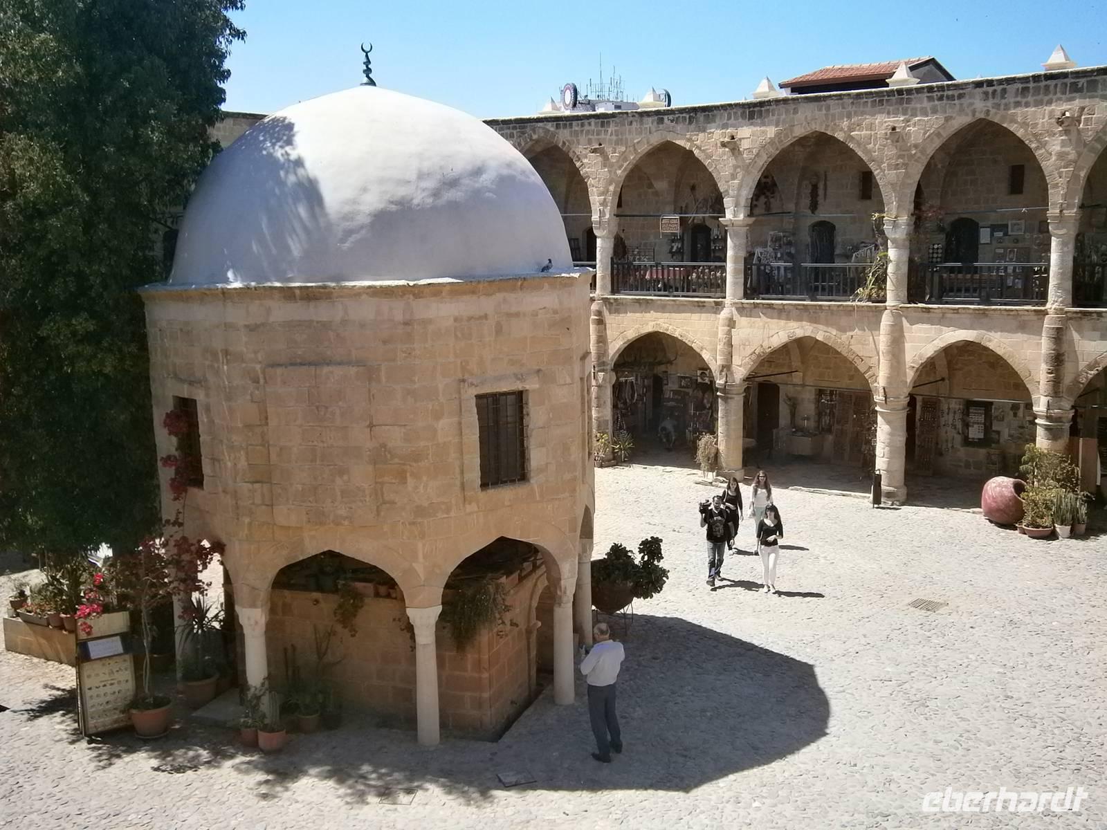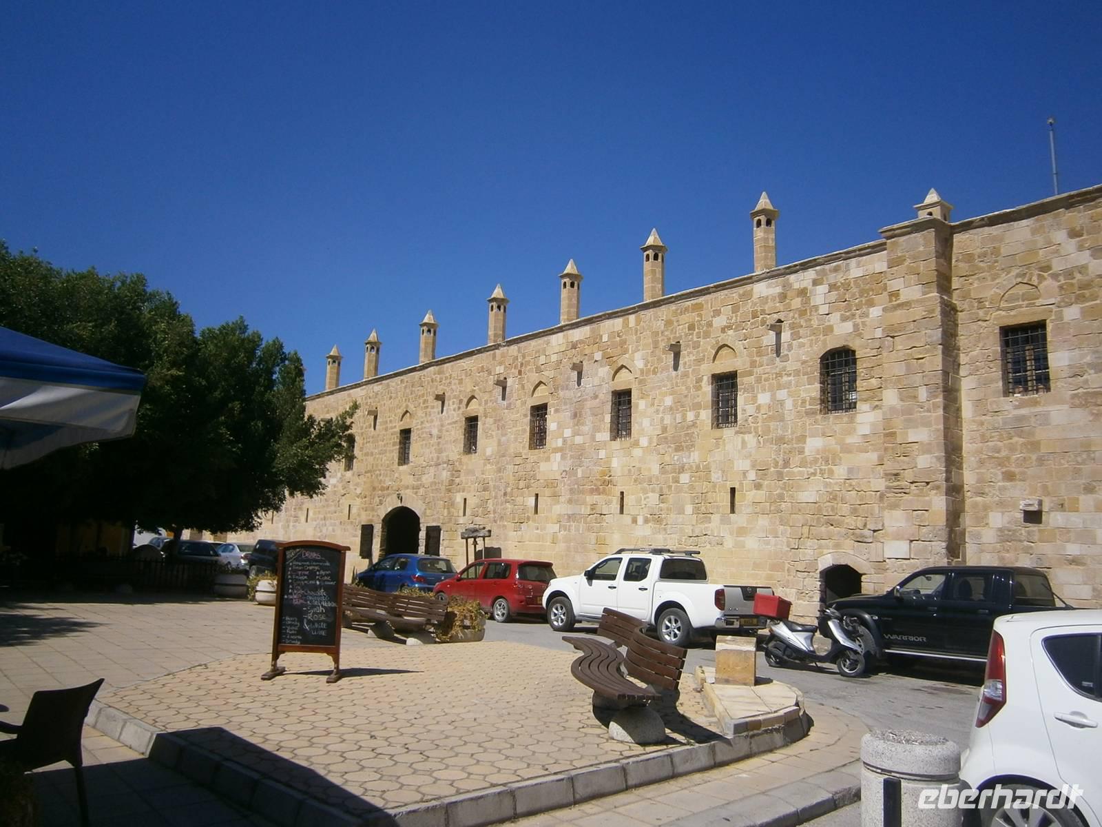 Nach der Mittagspause überschritten wir im Zentrum der Altstadt die Demarkationslinie, welche auch die Hauptstadt in einen türkischen und einen zypriotischen Teil trennt, erhielten wieder einen Begleiter und besuchten die Saint Sophia Cathedral, jetzt Selimiye-Moschee. Dort trafen wir auf einen ganz strengen „Kirchendiener", welcher darauf bestand, dass unsere weiblichen Gäste nur mit Kopfbedeckung in die Moschee durften. Im Anschluss an den Besuch der Moschee gingen wir in eine wieder sehr schön aufgebaute ehemalige Karawanserei, die heute viele kleine handwerkliche Geschäfte und ein Restaurant beherbergt. Nach Rückkehr in den zypriotischen Teil von Nikosia bezogen wir unser Hotel im unmittelbaren Zentrum der Hauptstadt und trafen uns 19:00 Uhr zum gemeinsamen Abendessen. Scheinbar sahen wir etwas hungrig aus, aber mit dem als Vorspeise gedachten großen Teller Spagetti waren dann doch einige Gäste überfordert.