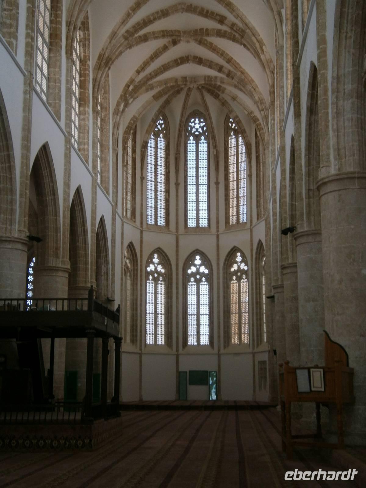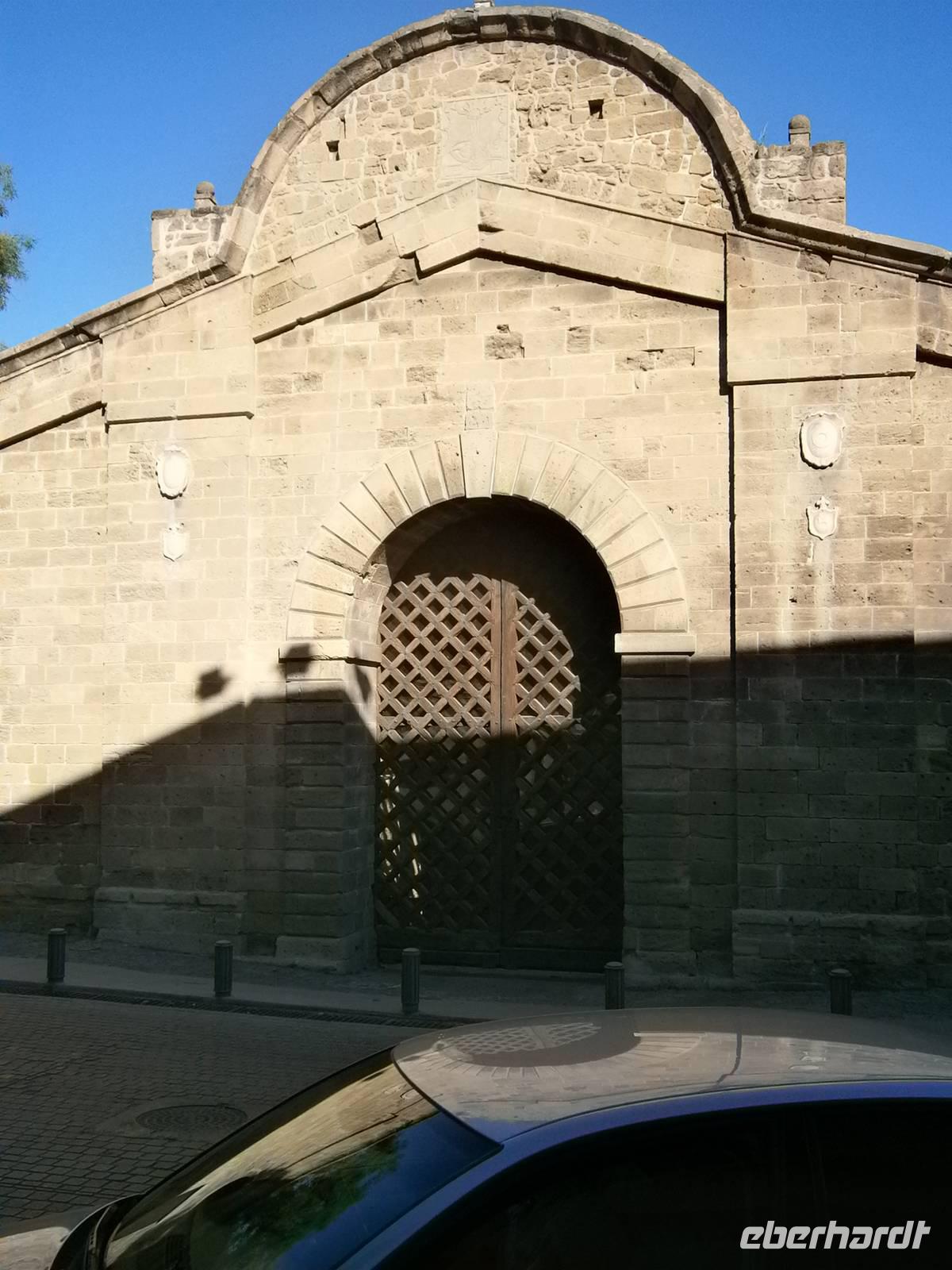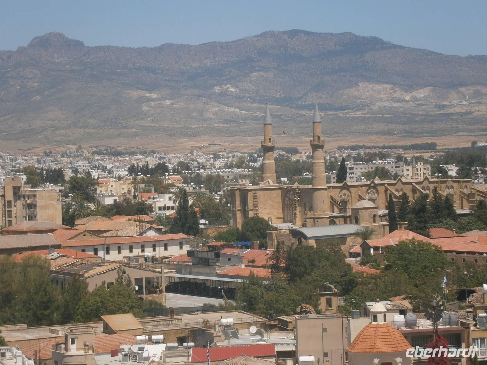 Nach der Mittagspause überschritten wir im Zentrum der Altstadt die Demarkationslinie, welche auch die Hauptstadt in einen türkischen und einen zypriotischen Teil trennt, erhielten wieder einen Begleiter und besuchten die Saint Sophia Cathedral, jetzt Selimiye-Moschee. Dort trafen wir auf einen ganz strengen „Kirchendiener", welcher darauf bestand, dass unsere weiblichen Gäste nur mit Kopfbedeckung in die Moschee durften. Im Anschluss an den Besuch der Moschee gingen wir in eine wieder sehr schön aufgebaute ehemalige Karawanserei, die heute viele kleine handwerkliche Geschäfte und ein Restaurant beherbergt. Nach Rückkehr in den zypriotischen Teil von Nikosia bezogen wir unser Hotel im unmittelbaren Zentrum der Hauptstadt und trafen uns 19:00 Uhr zum gemeinsamen Abendessen. Scheinbar sahen wir etwas hungrig aus, aber mit dem als Vorspeise gedachten großen Teller Spagetti waren dann doch einige Gäste überfordert.