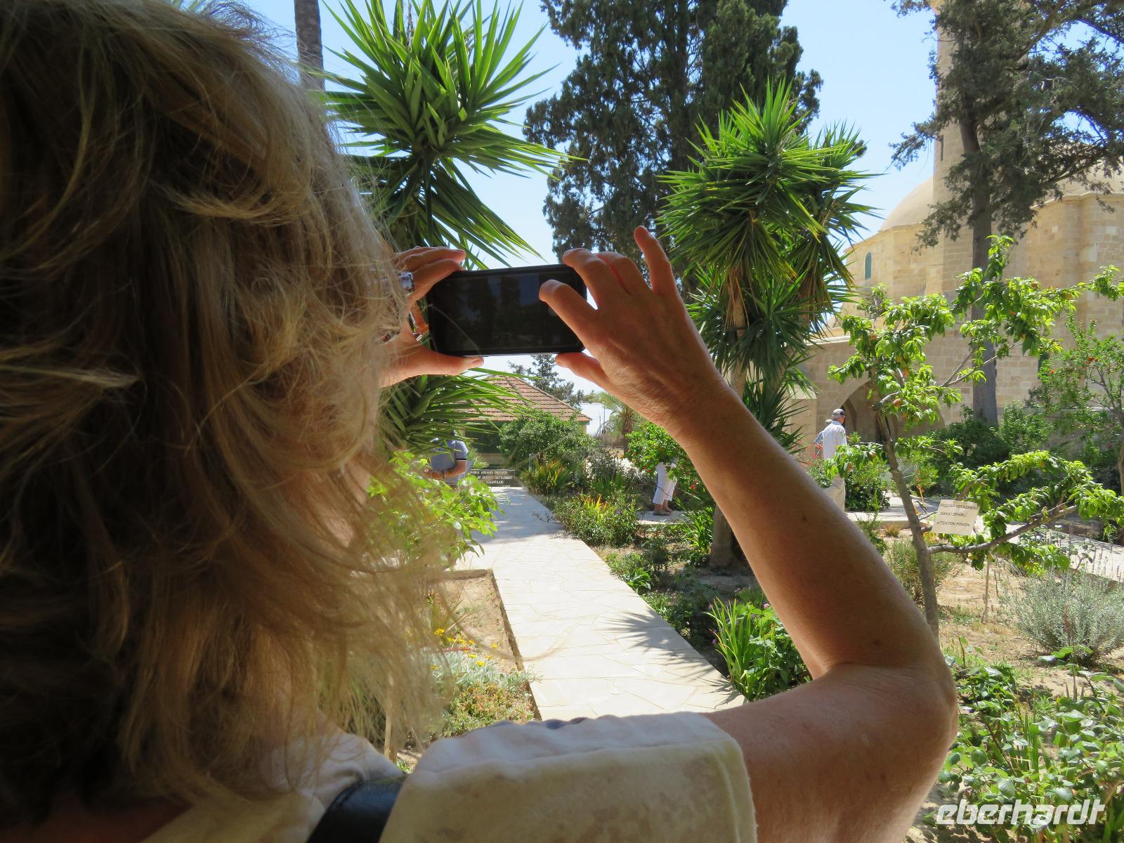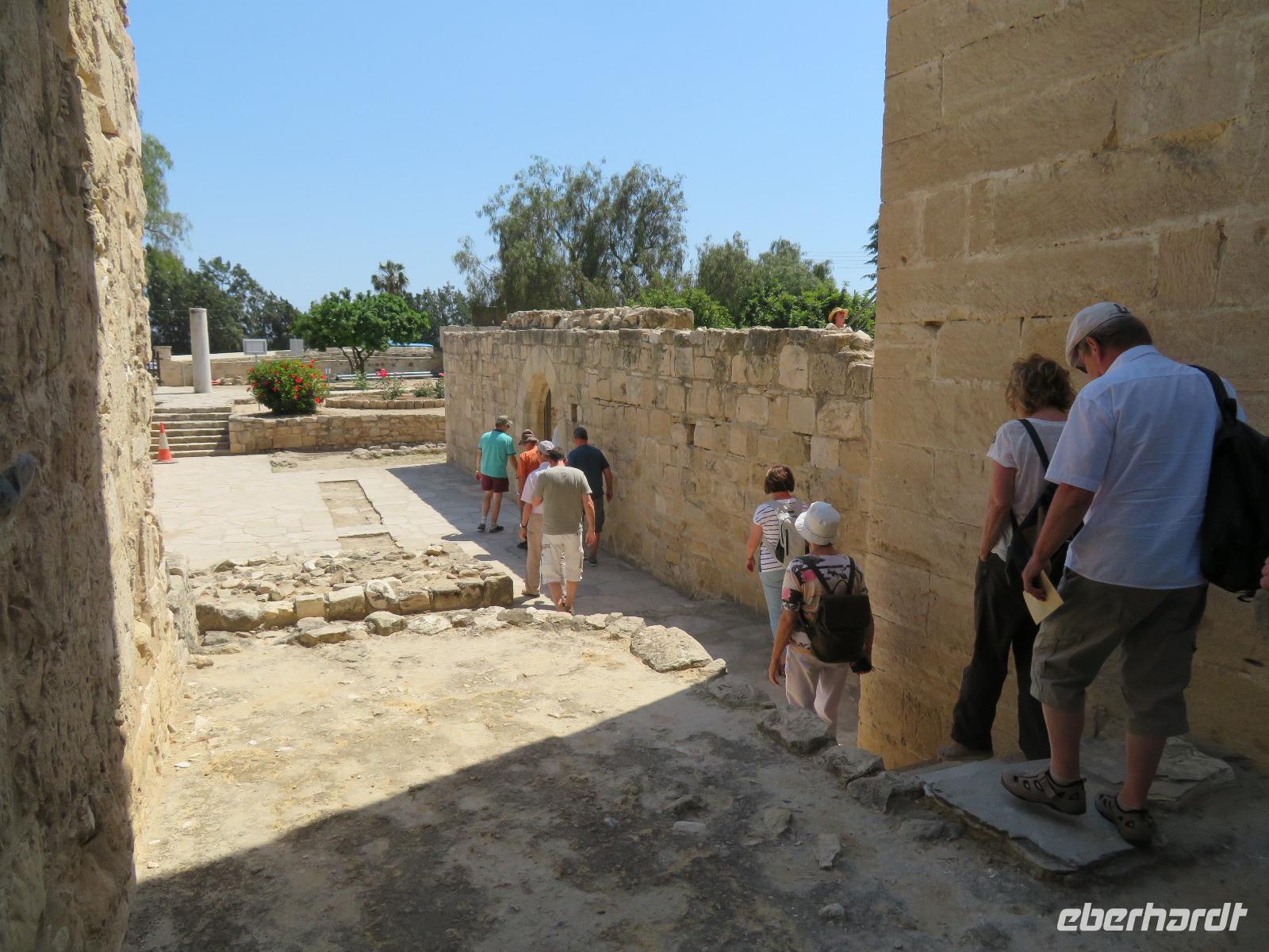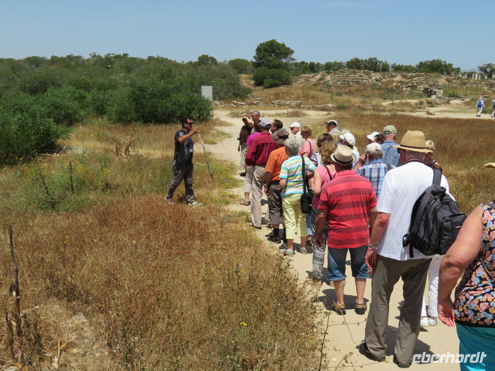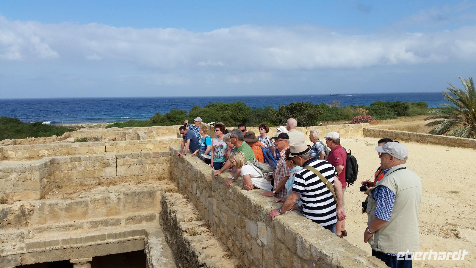 Nach dem Frühstück mit Meeresrauschen begann unser erster Ausflug unserer Rundreise Zypern. Im Bus begrüßte uns herzlich unser örtlicher Reiseleiter Jorgos und wir fuhren entlang der Küste bis zu den etwas außerhalb von Paphos gelegenen Königsgräbern, die aus dem 3. Jahrhundert stammen. In diesen historischen und begehbaren Ruhestätten wurden allerdings wahrscheinlich nie Könige beigesetzt, sondern sie wurden von der Oberschicht genutzt, weil es zu dieser Zeit keine Stadtkönige mehr auf Zypern gab. Nach nur wenigen Minuten Busfahrt erreichten wir dann die herausgeputzte Innenstadt von Paphos. Die Stadt ist in diesem Jahr gemeinsam mit der dänischen Stadt Aarhus „Kulturhauptstadt Europas" und es finden zahlreiche kulturelle Veranstaltungen vor den Kulissen des historischen Hafens und des archäologischen Parks statt. Den Archäologischen Park der Stadt Paphos, der sich unweit des Hafens befindet besuchten wir dann anschließend. Dort steht das Haus des Dionysos mit seinen Bodenmosaiken, geschützt von einem nachträglich errichteten Pavillon. Die Mosaiken aus dem 2. Jahrhundert n. Chr. wurden 1962 bei Bauarbeiten entdeckt und freigelegt. Es ist immer wieder beeindruckend, mit welcher Genauigkeit und ohne moderne Hilfsmittel die Menschen damals die Mosaike gesetzt haben. Im Anschluss bummelten wir noch entlang des Hafens, bevor wir die Stadt verließen und weiter zum Kloster des heiligen Neophytos-Kloster bei Mesogi fuhren. Dort stiegen wir die wenigen Stufen zur Eremitenhöhle und zur Höhlenkapelle hinauf, die der heilige Neophytos im 12. Jahrhundert eigenhändig errichtete und über 50 Jahre dort allein lebte. Zu seinen Ehren wurde nach seinem Tod in unmittelbarer Nähe das gleichnamige Kloster errichtet, dessen Kirche wir mit seinen zahlreichen Ikonen ebenfalls besuchten. Nach einem kleinen Spaziergang durch die Klosteranlagen fuhren wir anschließend weiter in Richtung Akamas-Halbinsel. Doch zuvor legten wir am Mittag noch einen Stopp in dem urigen Weindorf Kathikas ein um in der örtlichen Taverne ein typisch zypriotisches Meze-Essen zu genießen. Ein Meze-Essen Meze besteht aus vielen verschiedenen Speisen, die nacheinander auf kleinen Tellern serviert werden. Typisch dazu trinkt man Wein, Wasser und Schnaps. Nach diesem kulinarischen Höhepunkt setzten wir unsere Fahrt Richtung Akamas durch die Weinberge fort und erreichten am frühen Nachmittag den kleinen Fischerort Latchi. Von hier waren es dann nur noch wenige Kilometer bis zum Eingang des Naturschutzgebiet Akamas. Wir verließen den Bus und spazierten ein Stück entlang der zerklüfteten Küste. Während des Spazierganges besuchten wir das „Bad der Aphrodite", wo die Göttin der Liebe und Fruchtbarkeit laut der Mythen im Schatten eines Feigenbaumes gebadet haben soll. Die Akamas-Halbinsel verdankt ihren Namen dem Sohn des Theseus, der hier auf dem Rückweg von der Stadt Troja an Land gegangen sein soll. Die Halbinsel ist ein beliebtes Wandergebiet und kann eine außergewöhnliche Flora und Fauna vorweisen. Außerdem ist sie noch relativ unberührt, denn das Gebiet des Naturparks darf nicht bebaut werden. Während unseres Spazierganges bot sich uns ein toller Blick über das türkisblaue Wasser und der weite Blick in die Bucht von Chrysochou. Nach einer entspannten Rückfahrt durch die Weinberge am späten Nachmittag erreichten wir dann wieder unser Hotel bei Paphos.