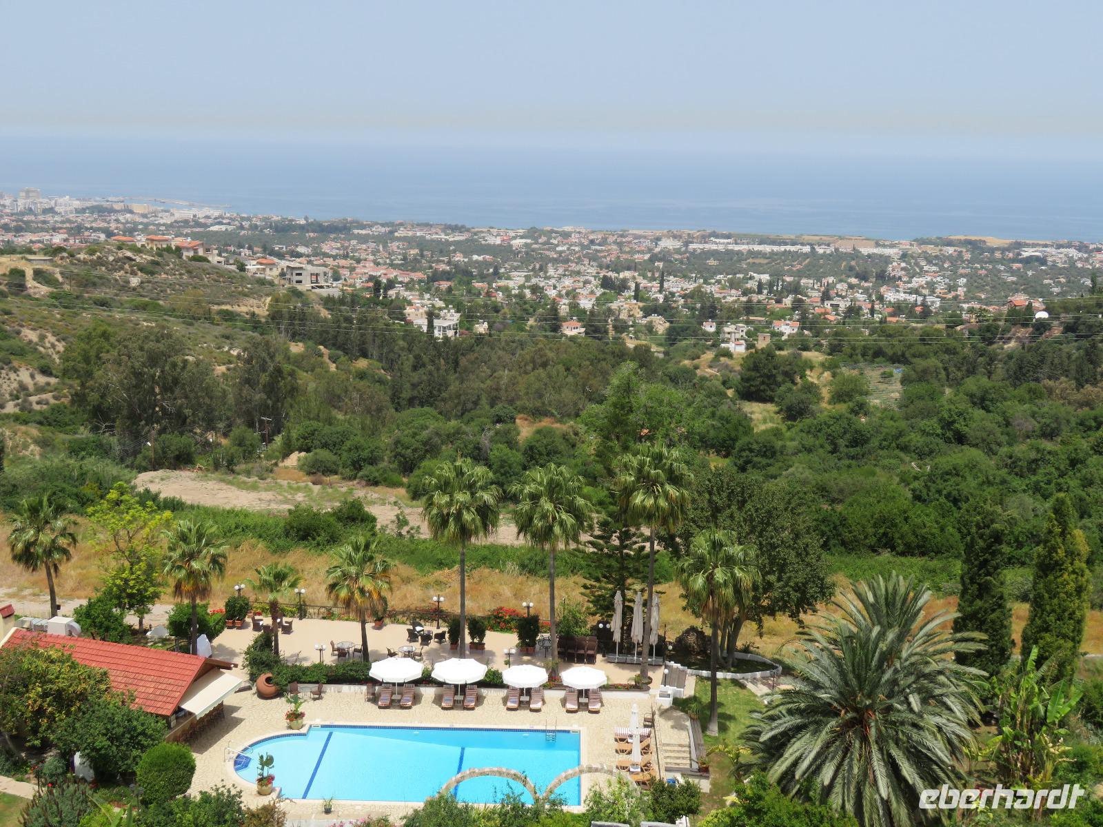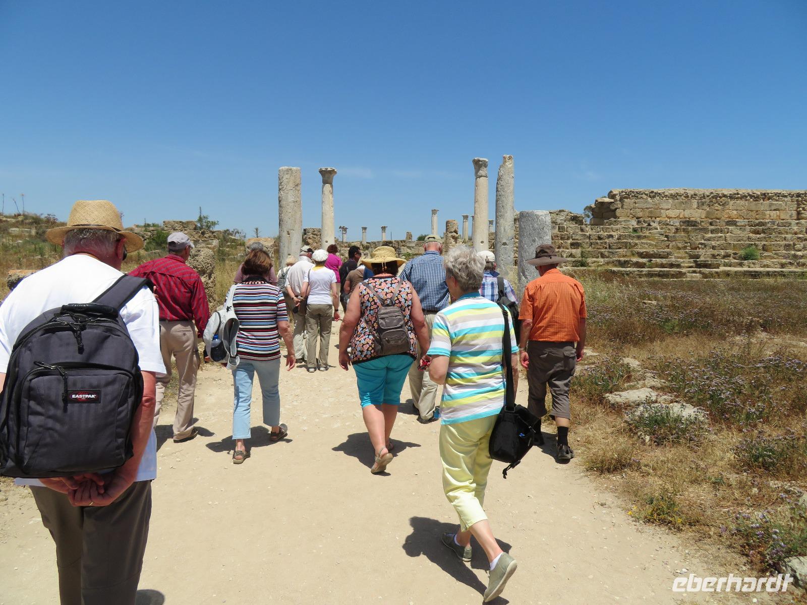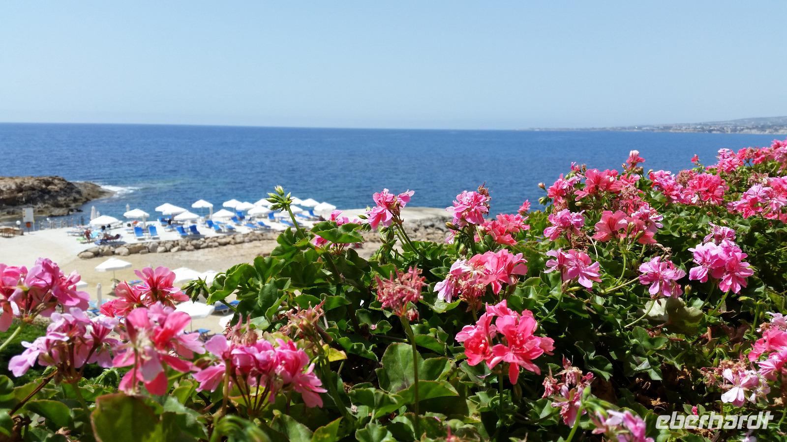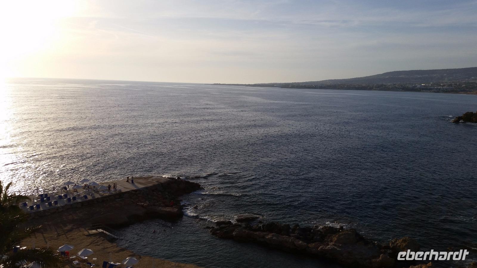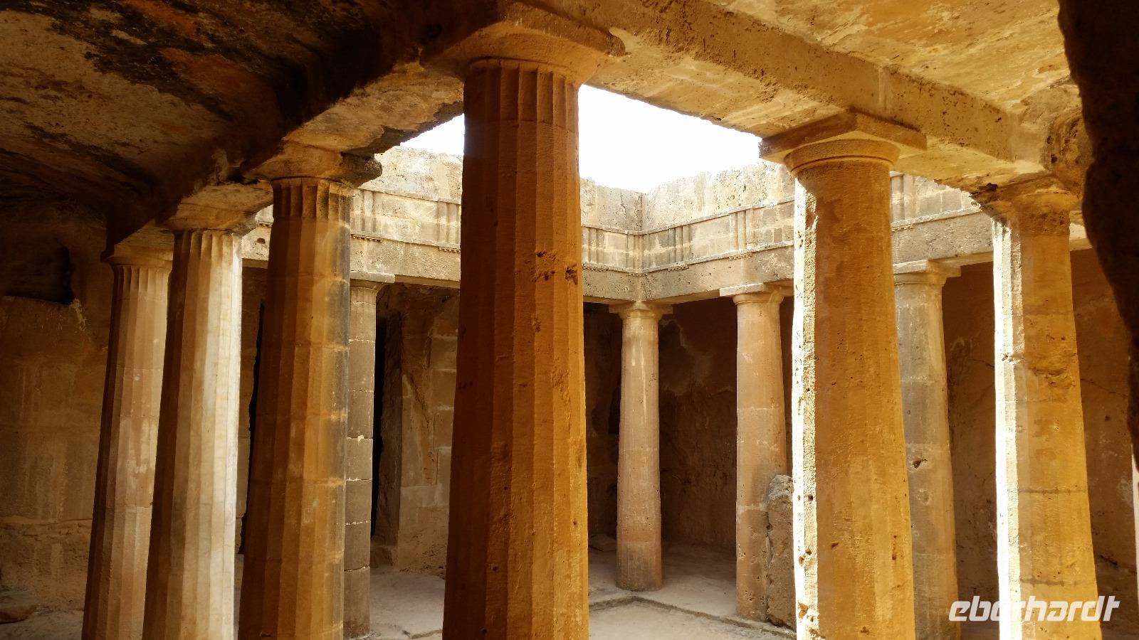 Nach dem Frühstück mit Meeresrauschen begann unser erster Ausflug unserer Rundreise Zypern. Im Bus begrüßte uns herzlich unser örtlicher Reiseleiter Jorgos und wir fuhren entlang der Küste bis zu den etwas außerhalb von Paphos gelegenen Königsgräbern, die aus dem 3. Jahrhundert stammen. In diesen historischen und begehbaren Ruhestätten wurden allerdings wahrscheinlich nie Könige beigesetzt, sondern sie wurden von der Oberschicht genutzt, weil es zu dieser Zeit keine Stadtkönige mehr auf Zypern gab. Nach nur wenigen Minuten Busfahrt erreichten wir dann die herausgeputzte Innenstadt von Paphos. Die Stadt ist in diesem Jahr gemeinsam mit der dänischen Stadt Aarhus „Kulturhauptstadt Europas" und es finden zahlreiche kulturelle Veranstaltungen vor den Kulissen des historischen Hafens und des archäologischen Parks statt. Den Archäologischen Park der Stadt Paphos, der sich unweit des Hafens befindet besuchten wir dann anschließend. Dort steht das Haus des Dionysos mit seinen Bodenmosaiken, geschützt von einem nachträglich errichteten Pavillon. Die Mosaiken aus dem 2. Jahrhundert n. Chr. wurden 1962 bei Bauarbeiten entdeckt und freigelegt. Es ist immer wieder beeindruckend, mit welcher Genauigkeit und ohne moderne Hilfsmittel die Menschen damals die Mosaike gesetzt haben. Im Anschluss bummelten wir noch entlang des Hafens, bevor wir die Stadt verließen und weiter zum Kloster des heiligen Neophytos-Kloster bei Mesogi fuhren. Dort stiegen wir die wenigen Stufen zur Eremitenhöhle und zur Höhlenkapelle hinauf, die der heilige Neophytos im 12. Jahrhundert eigenhändig errichtete und über 50 Jahre dort allein lebte. Zu seinen Ehren wurde nach seinem Tod in unmittelbarer Nähe das gleichnamige Kloster errichtet, dessen Kirche wir mit seinen zahlreichen Ikonen ebenfalls besuchten. Nach einem kleinen Spaziergang durch die Klosteranlagen fuhren wir anschließend weiter in Richtung Akamas-Halbinsel. Doch zuvor legten wir am Mittag noch einen Stopp in dem urigen Weindorf Kathikas ein um in der örtlichen Taverne ein typisch zypriotisches Meze-Essen zu genießen. Ein Meze-Essen Meze besteht aus vielen verschiedenen Speisen, die nacheinander auf kleinen Tellern serviert werden. Typisch dazu trinkt man Wein, Wasser und Schnaps. Nach diesem kulinarischen Höhepunkt setzten wir unsere Fahrt Richtung Akamas durch die Weinberge fort und erreichten am frühen Nachmittag den kleinen Fischerort Latchi. Von hier waren es dann nur noch wenige Kilometer bis zum Eingang des Naturschutzgebiet Akamas. Wir verließen den Bus und spazierten ein Stück entlang der zerklüfteten Küste. Während des Spazierganges besuchten wir das „Bad der Aphrodite", wo die Göttin der Liebe und Fruchtbarkeit laut der Mythen im Schatten eines Feigenbaumes gebadet haben soll. Die Akamas-Halbinsel verdankt ihren Namen dem Sohn des Theseus, der hier auf dem Rückweg von der Stadt Troja an Land gegangen sein soll. Die Halbinsel ist ein beliebtes Wandergebiet und kann eine außergewöhnliche Flora und Fauna vorweisen. Außerdem ist sie noch relativ unberührt, denn das Gebiet des Naturparks darf nicht bebaut werden. Während unseres Spazierganges bot sich uns ein toller Blick über das türkisblaue Wasser und der weite Blick in die Bucht von Chrysochou. Nach einer entspannten Rückfahrt durch die Weinberge am späten Nachmittag erreichten wir dann wieder unser Hotel bei Paphos.