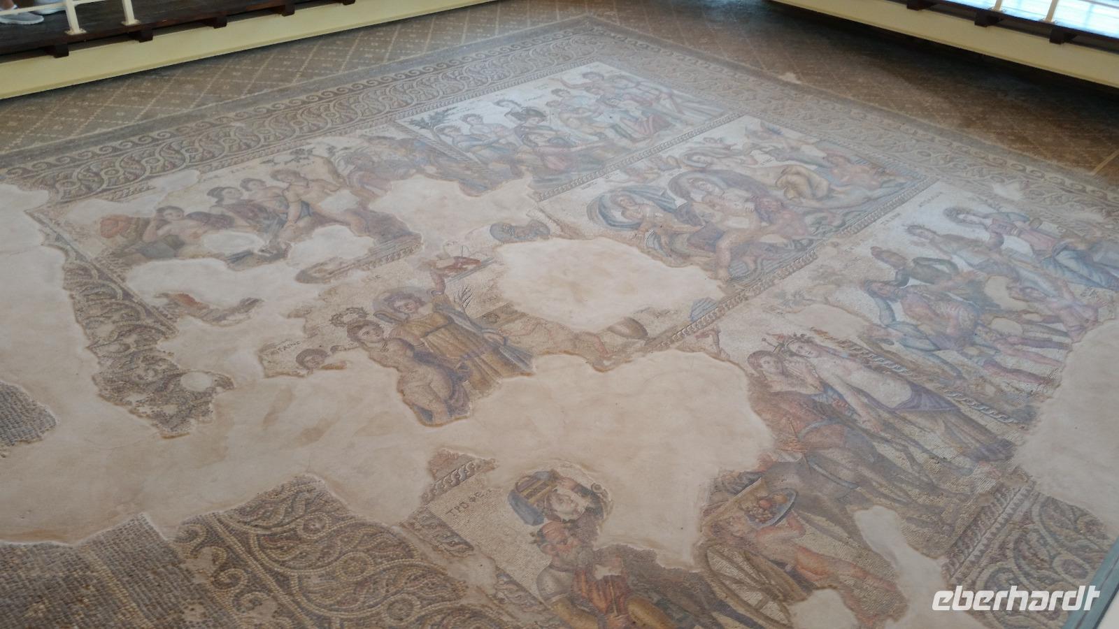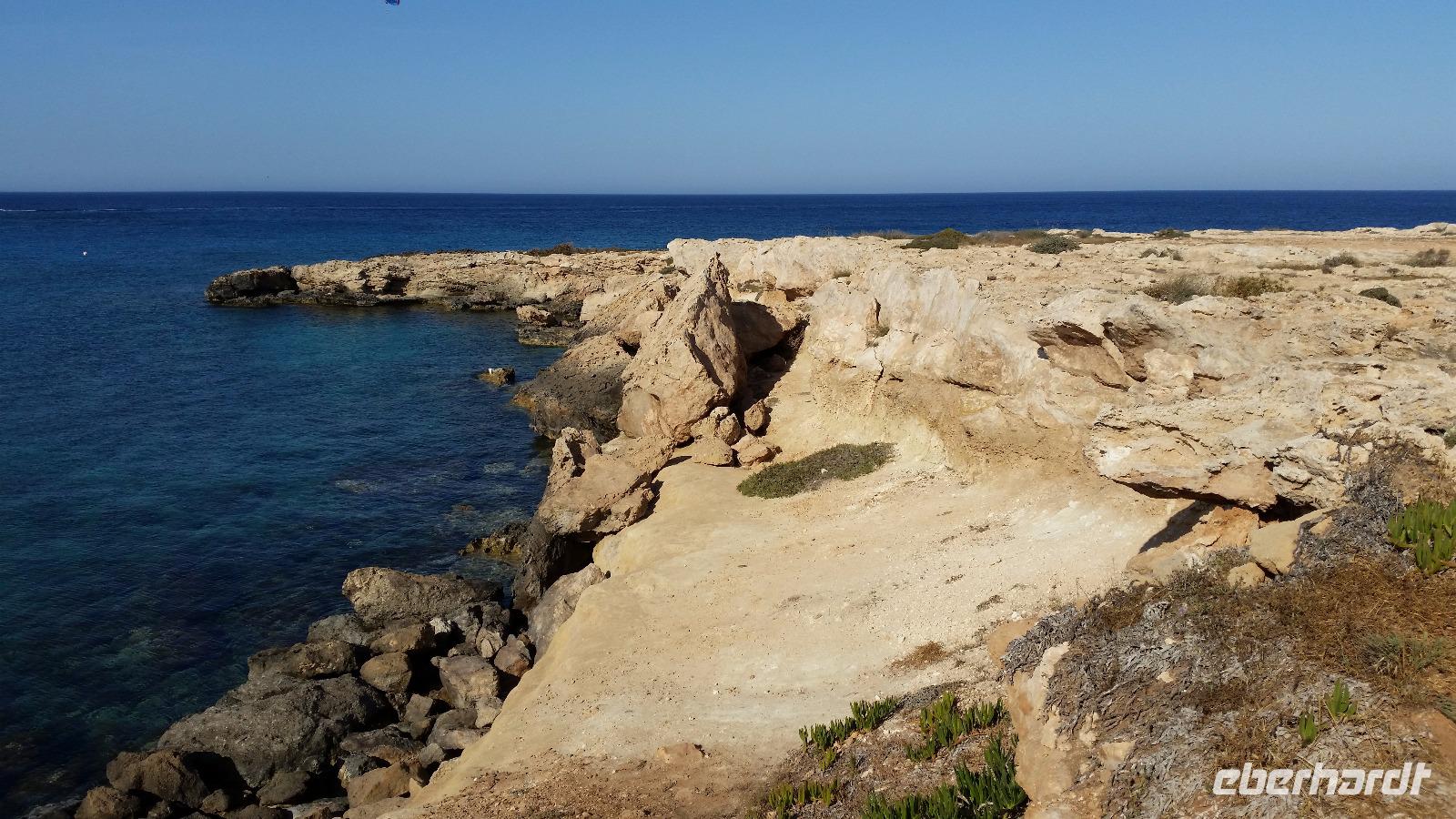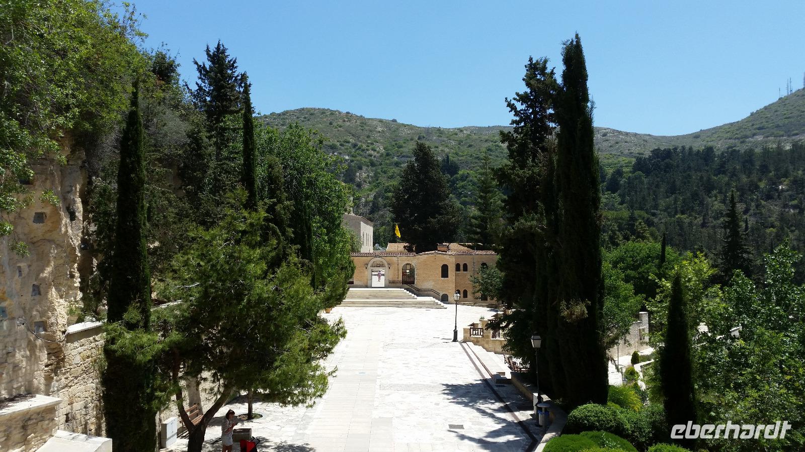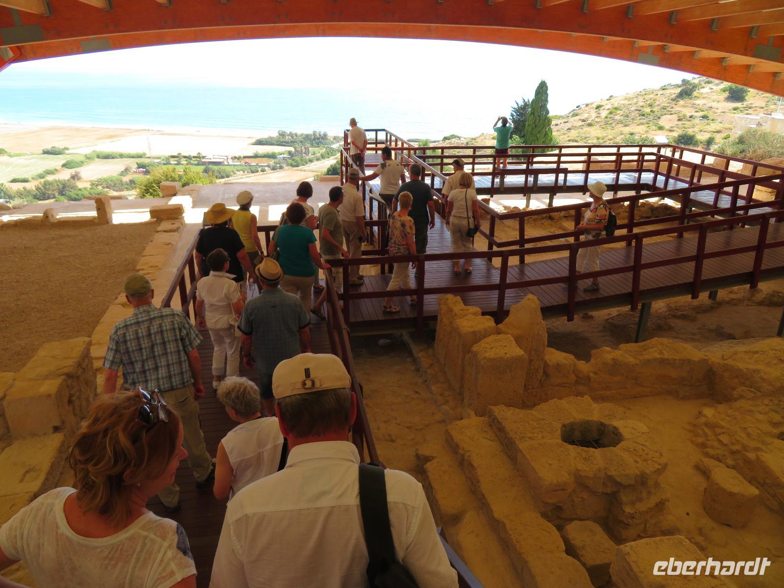 Nach dem Frühstück mit Meeresrauschen begann unser erster Ausflug unserer Rundreise Zypern. Im Bus begrüßte uns herzlich unser örtlicher Reiseleiter Jorgos und wir fuhren entlang der Küste bis zu den etwas außerhalb von Paphos gelegenen Königsgräbern, die aus dem 3. Jahrhundert stammen. In diesen historischen und begehbaren Ruhestätten wurden allerdings wahrscheinlich nie Könige beigesetzt, sondern sie wurden von der Oberschicht genutzt, weil es zu dieser Zeit keine Stadtkönige mehr auf Zypern gab. Nach nur wenigen Minuten Busfahrt erreichten wir dann die herausgeputzte Innenstadt von Paphos. Die Stadt ist in diesem Jahr gemeinsam mit der dänischen Stadt Aarhus „Kulturhauptstadt Europas" und es finden zahlreiche kulturelle Veranstaltungen vor den Kulissen des historischen Hafens und des archäologischen Parks statt. Den Archäologischen Park der Stadt Paphos, der sich unweit des Hafens befindet besuchten wir dann anschließend. Dort steht das Haus des Dionysos mit seinen Bodenmosaiken, geschützt von einem nachträglich errichteten Pavillon. Die Mosaiken aus dem 2. Jahrhundert n. Chr. wurden 1962 bei Bauarbeiten entdeckt und freigelegt. Es ist immer wieder beeindruckend, mit welcher Genauigkeit und ohne moderne Hilfsmittel die Menschen damals die Mosaike gesetzt haben. Im Anschluss bummelten wir noch entlang des Hafens, bevor wir die Stadt verließen und weiter zum Kloster des heiligen Neophytos-Kloster bei Mesogi fuhren. Dort stiegen wir die wenigen Stufen zur Eremitenhöhle und zur Höhlenkapelle hinauf, die der heilige Neophytos im 12. Jahrhundert eigenhändig errichtete und über 50 Jahre dort allein lebte. Zu seinen Ehren wurde nach seinem Tod in unmittelbarer Nähe das gleichnamige Kloster errichtet, dessen Kirche wir mit seinen zahlreichen Ikonen ebenfalls besuchten. Nach einem kleinen Spaziergang durch die Klosteranlagen fuhren wir anschließend weiter in Richtung Akamas-Halbinsel. Doch zuvor legten wir am Mittag noch einen Stopp in dem urigen Weindorf Kathikas ein um in der örtlichen Taverne ein typisch zypriotisches Meze-Essen zu genießen. Ein Meze-Essen Meze besteht aus vielen verschiedenen Speisen, die nacheinander auf kleinen Tellern serviert werden. Typisch dazu trinkt man Wein, Wasser und Schnaps. Nach diesem kulinarischen Höhepunkt setzten wir unsere Fahrt Richtung Akamas durch die Weinberge fort und erreichten am frühen Nachmittag den kleinen Fischerort Latchi. Von hier waren es dann nur noch wenige Kilometer bis zum Eingang des Naturschutzgebiet Akamas. Wir verließen den Bus und spazierten ein Stück entlang der zerklüfteten Küste. Während des Spazierganges besuchten wir das „Bad der Aphrodite", wo die Göttin der Liebe und Fruchtbarkeit laut der Mythen im Schatten eines Feigenbaumes gebadet haben soll. Die Akamas-Halbinsel verdankt ihren Namen dem Sohn des Theseus, der hier auf dem Rückweg von der Stadt Troja an Land gegangen sein soll. Die Halbinsel ist ein beliebtes Wandergebiet und kann eine außergewöhnliche Flora und Fauna vorweisen. Außerdem ist sie noch relativ unberührt, denn das Gebiet des Naturparks darf nicht bebaut werden. Während unseres Spazierganges bot sich uns ein toller Blick über das türkisblaue Wasser und der weite Blick in die Bucht von Chrysochou. Nach einer entspannten Rückfahrt durch die Weinberge am späten Nachmittag erreichten wir dann wieder unser Hotel bei Paphos.