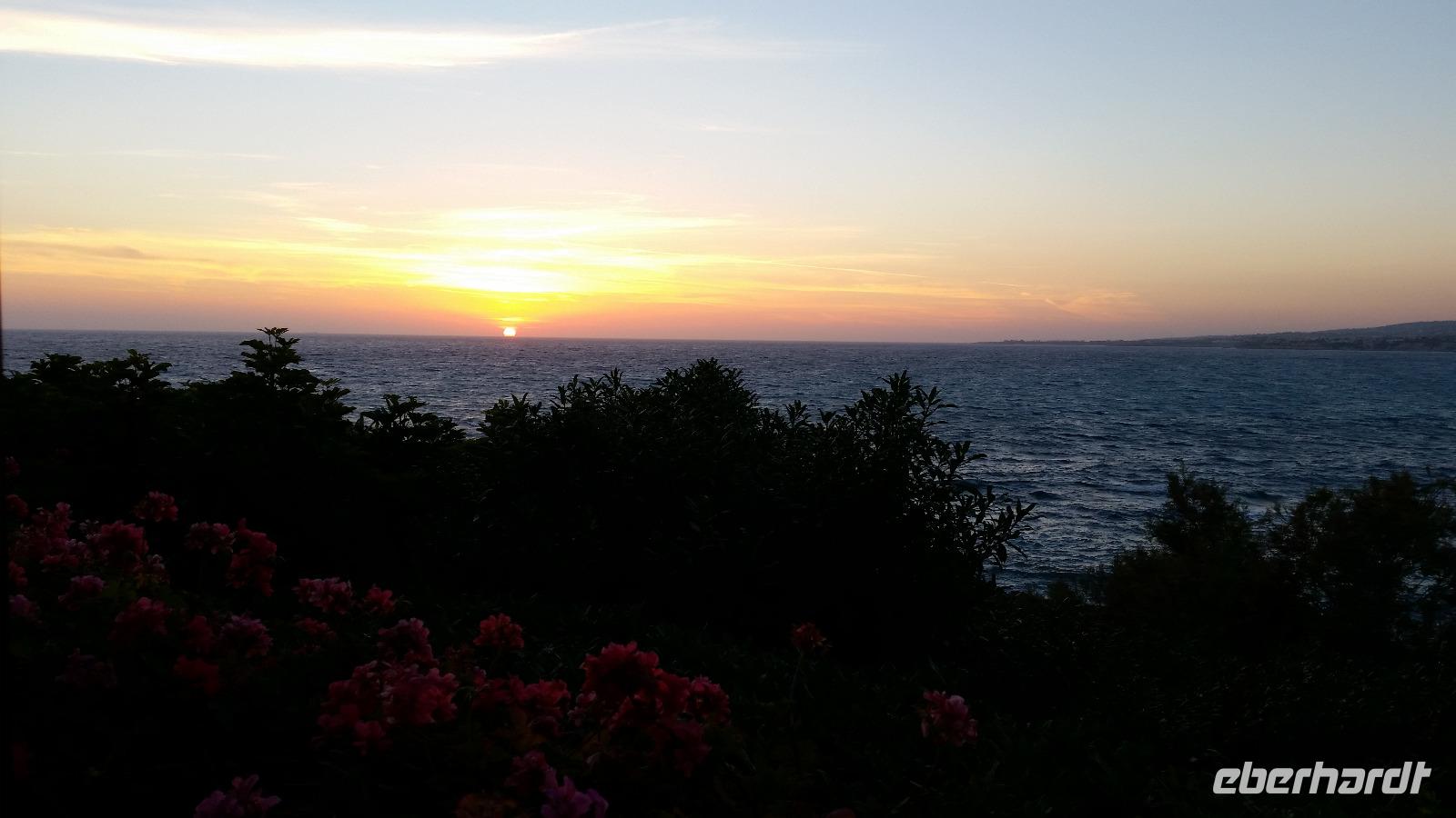 Am Morgen verließen wir die Gegend der roten Dörfer und fuhren südlich über Ayia Napa in Richtung Larnaca. Auf dem Weg in die Hafenstadt kamen wir unter anderem auch an dem kleinen Ort Phyla, der sich unmittelbar an der Demarkationslinie befindet. Das Dorf demonstriert unweit der zypriotisch-zypriotischen Grenze, dass auch ein Minarett neben einer Kirche stehen kann. In diesem Dorf leben Griechen-Zyprioten und Türken-Zyprioten gemeinsam Haus an Haus und die Dorfgemeinschaft funktioniert bestens. Auch anderswo versteht sich die Bevölkerung beider Seiten gut. Nach unserer Ankunft in Larnaca besuchten wir die Lazaruskirche und flanierten anschließend auf der langen Promenade der 77.000 Einwohnerstadt. Der Name stammt von den vielen Sarkophagen (griechisch Larnax) ab, die hier gefunden wurden. Nach kurzer Fahrt gelangten wir dann zum Mittag an den Salzsee der Stadt, einem von zwei Salzseen auf Zypern. Wir besuchten die Sultan-Tekke-Moschee, bevor wir weiter in Richtung Limassol fuhren, der zweitgrößten Stadt der Insel. Hier erwartete uns dann direkt an der Küste ein typisch zypriotisches Picknick mit Salat, Feta, Olivenöl, Wein, Zivania und vielen weiteren Leckereien. Nach dem köstlichen Mittagessen fuhren wir dann weiter durch die Stadt entlang der neu geschaffenen Marina, bevor wir vor den Toren der Stadt den ehemaligen Sitz des Johanniterordens in Kolossi erreichten. Vom Dach der Burg reicht der Blick bis ans Mittelmeer und die Ausläufer des Troodosgebirges. Die Gegend um Kolossi ist außerdem das Hauptanbaugebiet des Commandaria, eines süßen Dessertweins, den nur acht Dörfer auf Zypern herstellen dürfen. Nächstes Ziel war die antike Ausgrabungsstätte Kourion und die Säulen des Apollon-Heiligtums, hier verabschieden wir uns in einem würdigen Rahmen herzlich von unserm Reiseleiter Jorgos und unserem Busfahrer Kyriakos und dankten für die erlebnisreiche und amüsante Woche. Im Anschluss fuhren wir weiter an den Felsen der Aphrodite, wo die schönste aller schönen der Legende nach geboren sein soll. Nach einem längeren Fotostopp bei der hübschen Dame schloss sich auf unserer Reise langsam der Kreis, denn wir erreichten am Abend nach ca. 870 km wieder das Cynthiana-Hotel in Paphos und ließen den Abend bei einem traumhaften Sonnenuntergang ausklingen.