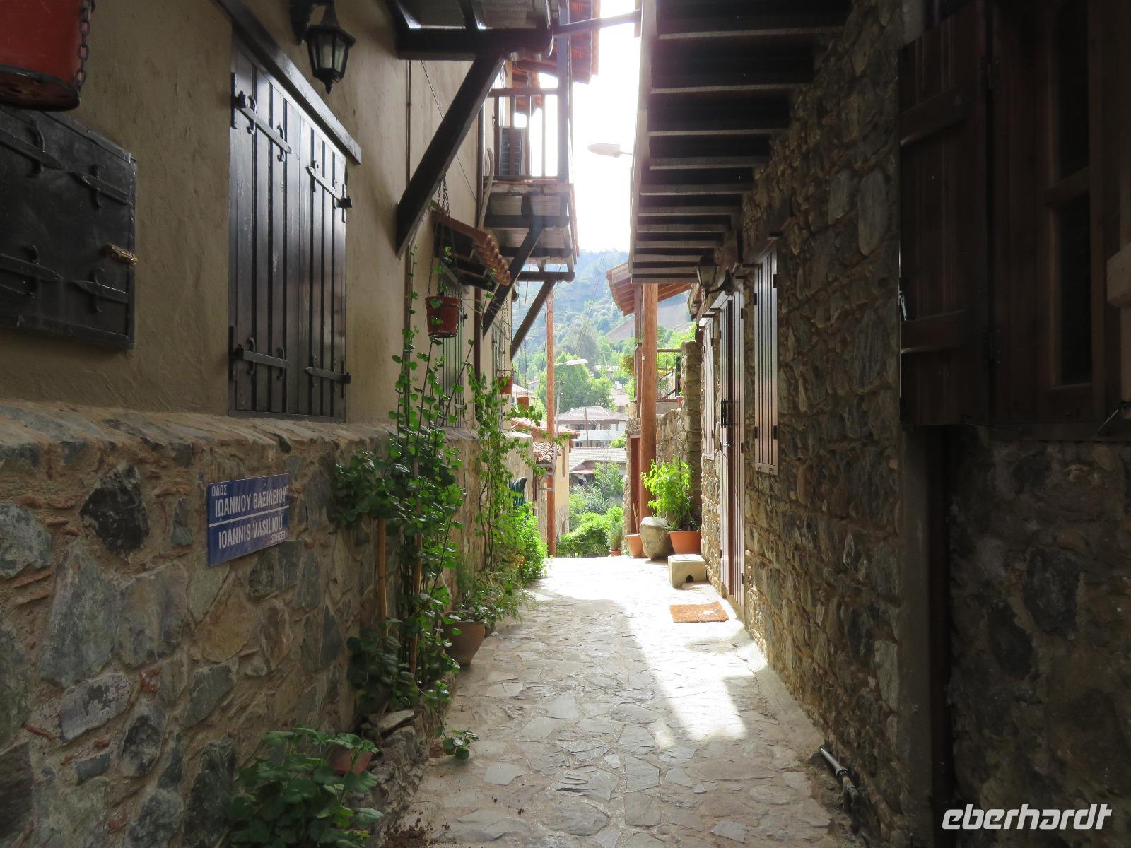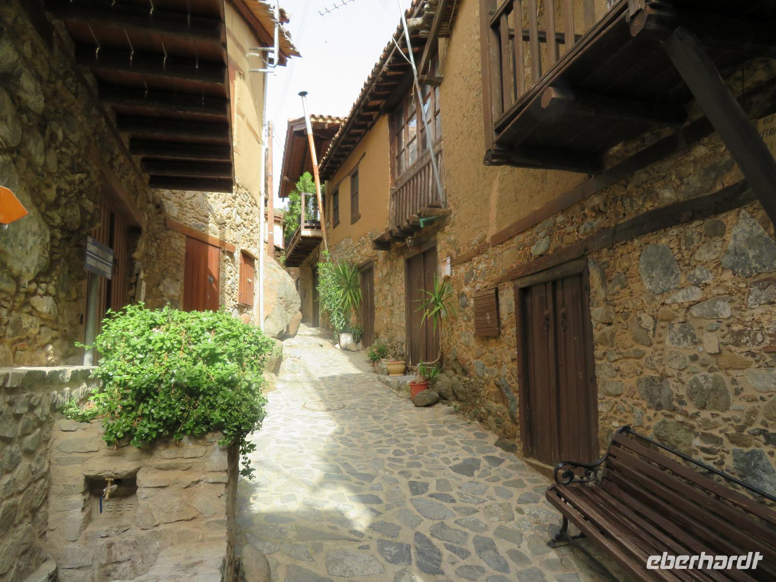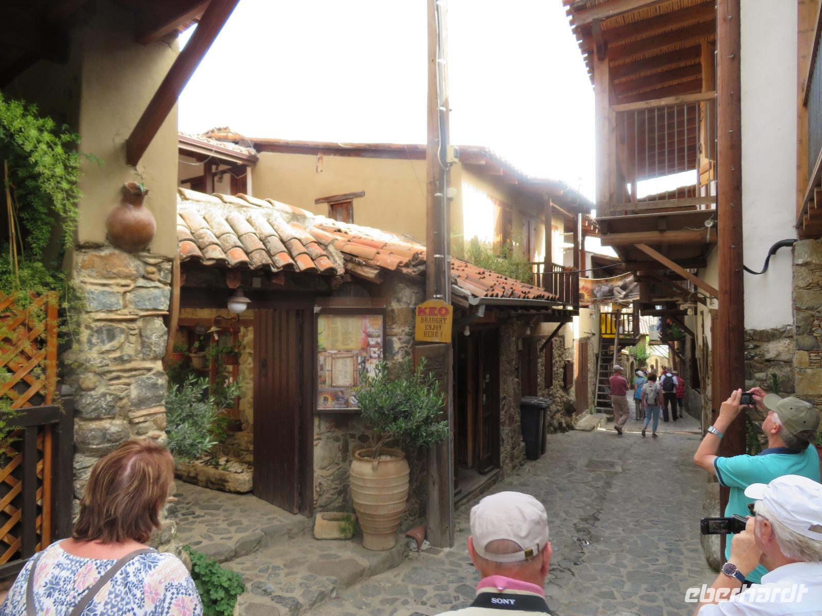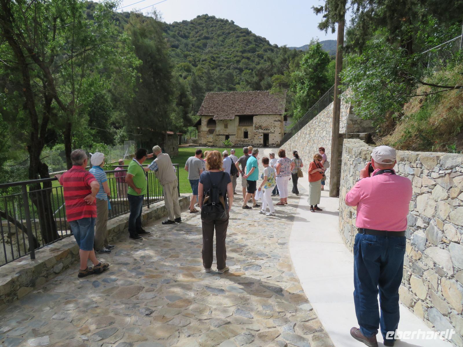 Am dritten Tag unserer Rundreise verließen wir die Küste und fuhren weiter in das Landesinnere. Begleitet von zahlreichen Obst-, Gemüse- und Zitrusplantagen erreichten wir am frühen Mittag die Gerolemos-Weinkelterei in Omodos. Nach einer genussvollen Weinverkostung mit zypriotischen Leckereien in dem idyllisch gelegenen Weingut fuhren wir nur wenige Kilometer bis in den Ortskern von Omodos. Hier unternahmen wir einen kleinen Spaziergang durch die kleinen Gassen des 300-Seelendorfes und besuchten unter anderem die aus dem 19. Jahrhundert stammende Kreuzkirche Timiou Stavrou sowie die älteste Weinpresse der Insel Zypern. Nach etwas Zeit zum Bummel durch das kleine Dorf stiegen wir wieder in den Bus, denn es stand ein längerer Bergaufstieg im Troodosgebirge an. Denn Ziel war der Berg Olympos, dem mit 1952 Metern höchste Berg der Insel Zypern. Auf dem Plateau unterhalb des Gipfels hielten wir dann mit dem Bus und jeder konnte den Ausblick genießen, ein Stück spazieren oder in einem der zahlreichen Restaurants etwas zum Mittag essen. Troodos verdankt seinen Namen ursprünglich den drei Wegen, die von Paphos, Limassol und Nikosia auf den höchsten Berg des Gebirges führen und dort aufeinander treffen. Übersetzt heißt so das Troodosgebirge, Dreiwegegebirge. Nach unserer Mittagsrast fuhren wir dann weiter hinein in das bewaldete Gebirge bis wir nach dem Mittag unser Hotel für die nächsten zwei Tage in Kyperounta erreichten. Bis wir am Nachmittag das Bergdorf Agros besuchten, blieb zum Mittag noch ausreichend Zeit, eine Abkühlung im Pool des Hotels genießen oder einfach beim Blick in die Berge die Seele baumeln zu lassen. In Agros, einem kleinen Nachbardorf von Kyperounta befinden sich viele kleine Familienbetriebe, von denen wir einige besuchten. So unter anderem die Rosen- und Süßwarenmanufaktur, in denen wir einige leckere Sachen verkosteten. Im Dorf war dann schon viel los, überall wurden kleine Stände aufgebaut, denn das jährliche Rosenfest stand an. Nach unseren Besuchen in den Manufakturen spazierten wir durch das Dorf und tranken im Kafenio, dem Kaffeehaus einen typischen zypriotischen Kaffee. Am Abend wurden wir dann bei Nikos in seiner Taverne herzlich empfangen und wir genossen ein köstliches Meze-Essen mit Wein.