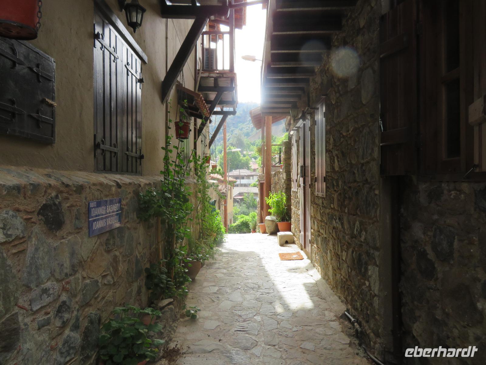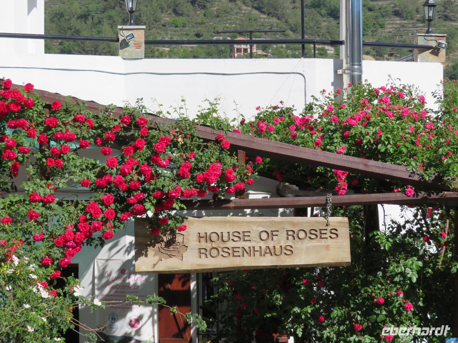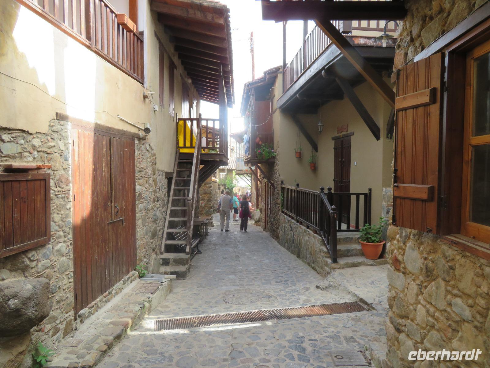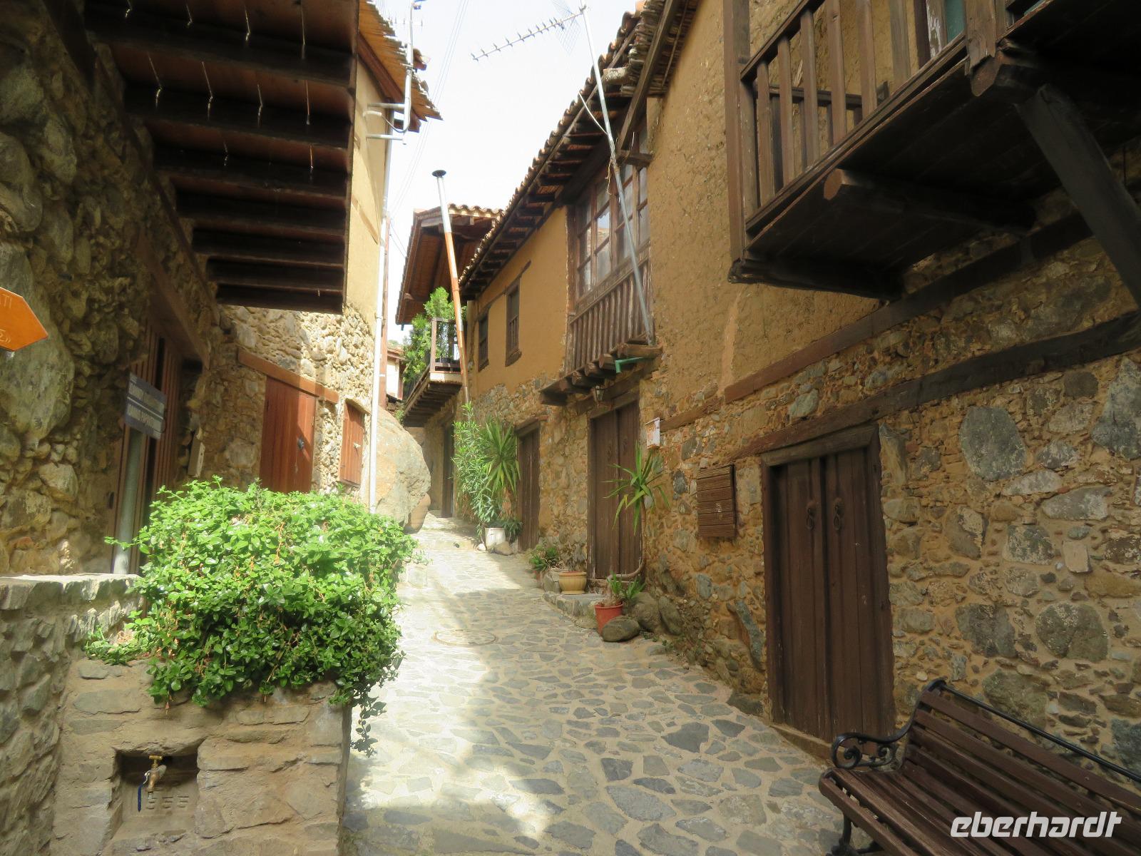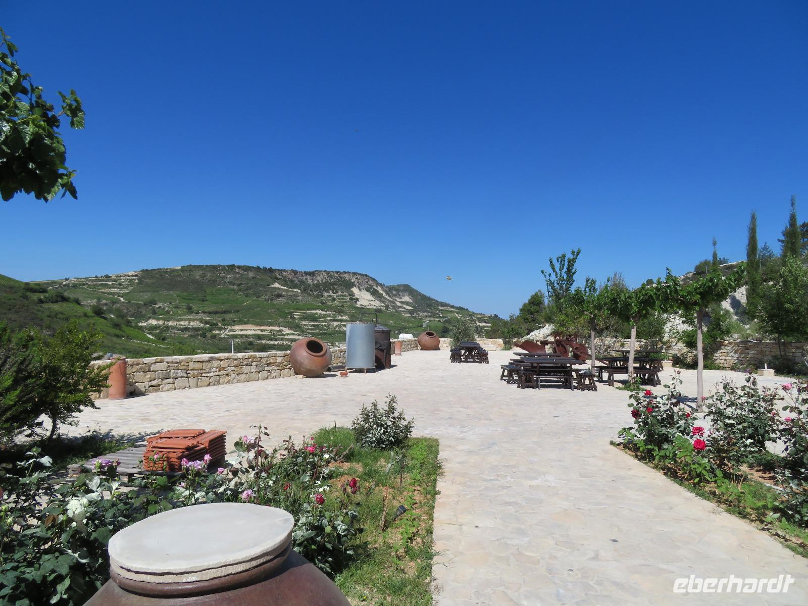 Am dritten Tag unserer Rundreise verließen wir die Küste und fuhren weiter in das Landesinnere. Begleitet von zahlreichen Obst-, Gemüse- und Zitrusplantagen erreichten wir am frühen Mittag die Gerolemos-Weinkelterei in Omodos. Nach einer genussvollen Weinverkostung mit zypriotischen Leckereien in dem idyllisch gelegenen Weingut fuhren wir nur wenige Kilometer bis in den Ortskern von Omodos. Hier unternahmen wir einen kleinen Spaziergang durch die kleinen Gassen des 300-Seelendorfes und besuchten unter anderem die aus dem 19. Jahrhundert stammende Kreuzkirche Timiou Stavrou sowie die älteste Weinpresse der Insel Zypern. Nach etwas Zeit zum Bummel durch das kleine Dorf stiegen wir wieder in den Bus, denn es stand ein längerer Bergaufstieg im Troodosgebirge an. Denn Ziel war der Berg Olympos, dem mit 1952 Metern höchste Berg der Insel Zypern. Auf dem Plateau unterhalb des Gipfels hielten wir dann mit dem Bus und jeder konnte den Ausblick genießen, ein Stück spazieren oder in einem der zahlreichen Restaurants etwas zum Mittag essen. Troodos verdankt seinen Namen ursprünglich den drei Wegen, die von Paphos, Limassol und Nikosia auf den höchsten Berg des Gebirges führen und dort aufeinander treffen. Übersetzt heißt so das Troodosgebirge, Dreiwegegebirge. Nach unserer Mittagsrast fuhren wir dann weiter hinein in das bewaldete Gebirge bis wir nach dem Mittag unser Hotel für die nächsten zwei Tage in Kyperounta erreichten. Bis wir am Nachmittag das Bergdorf Agros besuchten, blieb zum Mittag noch ausreichend Zeit, eine Abkühlung im Pool des Hotels genießen oder einfach beim Blick in die Berge die Seele baumeln zu lassen. In Agros, einem kleinen Nachbardorf von Kyperounta befinden sich viele kleine Familienbetriebe, von denen wir einige besuchten. So unter anderem die Rosen- und Süßwarenmanufaktur, in denen wir einige leckere Sachen verkosteten. Im Dorf war dann schon viel los, überall wurden kleine Stände aufgebaut, denn das jährliche Rosenfest stand an. Nach unseren Besuchen in den Manufakturen spazierten wir durch das Dorf und tranken im Kafenio, dem Kaffeehaus einen typischen zypriotischen Kaffee. Am Abend wurden wir dann bei Nikos in seiner Taverne herzlich empfangen und wir genossen ein köstliches Meze-Essen mit Wein.