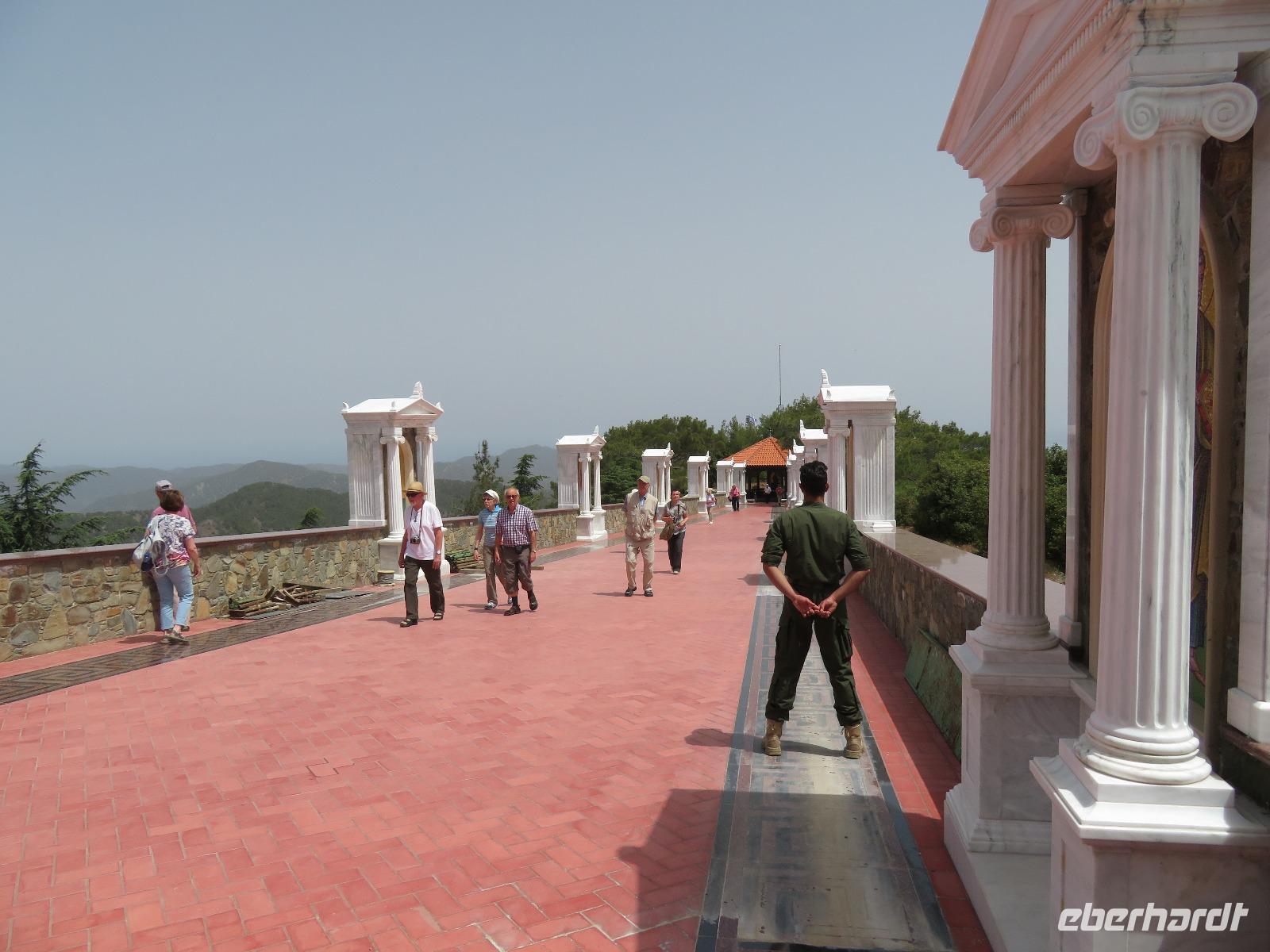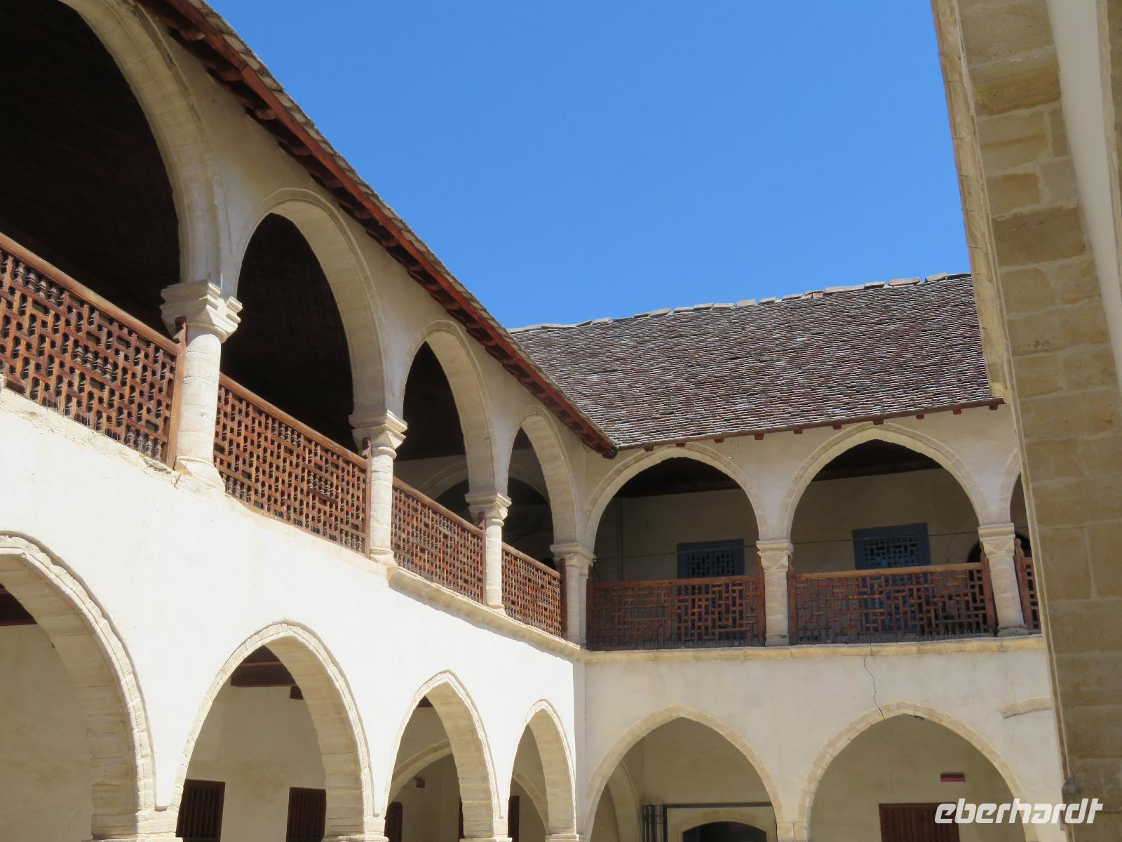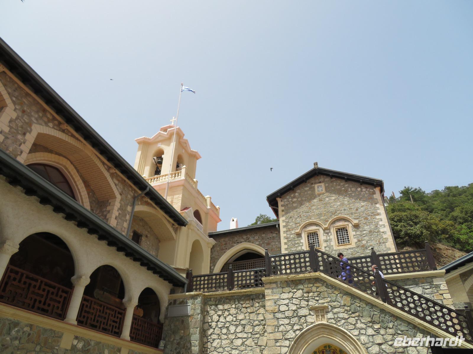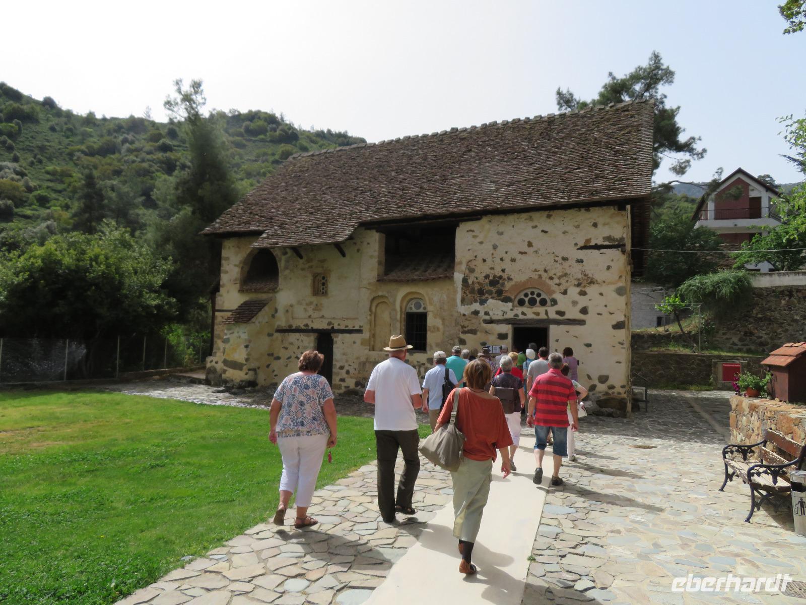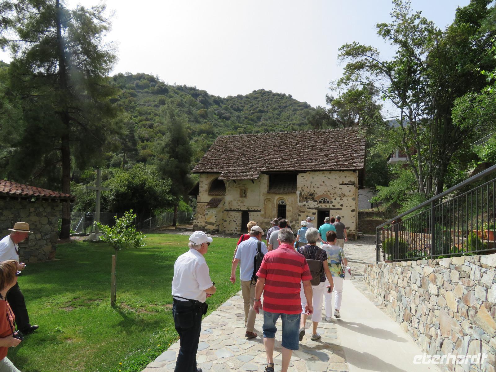 Heute blieben wir im grünen Herzen der Insel - im Troodosgebirge. Am Morgen besuchten wir zunächst die aus dem 11. Jahrhundert stammende Scheunendachkirche Agios Nikolaos tis Stegis. In unmittelbarer Nähe befindet sich der zum größten Teil unter Denkmalschutz stehende Ort Kakopetria mit seinen urigen Häusern. Wir spazierten durch die malerischen Gassen des kleinen Dorfes, das zu dieser Zeit noch ganz verschlafen war und genossen die angenehmen Temperaturen am kleinen Bach des Dorfes. Im Anschluss fuhren wir weiter durch das grüne Troodosgebirge entlang kleiner Bergdörfer und erreichten am Mittag das Kykkos - Kloster, das wegen seines großen politischen Einflusses als mächtigstes Kloster Zyperns gilt. Die Wände des Innenhofes sind fast vollständig mit Mosaiken ausgestattet und das bekannteste Bild ist das der Gottesmutter Maria. Nur wenige hunderte Meter oberhalb des Klosters, befindet sich die Grabstätte des Erzbischofs Makarios, die von einer Ehrenwache bewacht wird und die wie ebenfalls besuchten. Von hier oben hat man außerdem einen tollen Blick durch die dichten Zedernwälder bis an die Küste und nach Nordzypern. Nach einer Mittagsrast am Kloster fuhren wir dann entlang der Kupfermine Skouriotissa, der einst größten Kupfermine auf der Insel Zypern bis in den kleinen Ort Galata. Hier besuchten wir noch die malerischen und unscheinbaren Scheunendachkirchen Panagia tis Podithou und die des Erzengel Michael, die beide zum UNESCO-Welterkulturerbe gehören. Den Abend ließen wir dann in unserem gemütlichen und familiengeführten Hotel „Livadia" ausklingen.