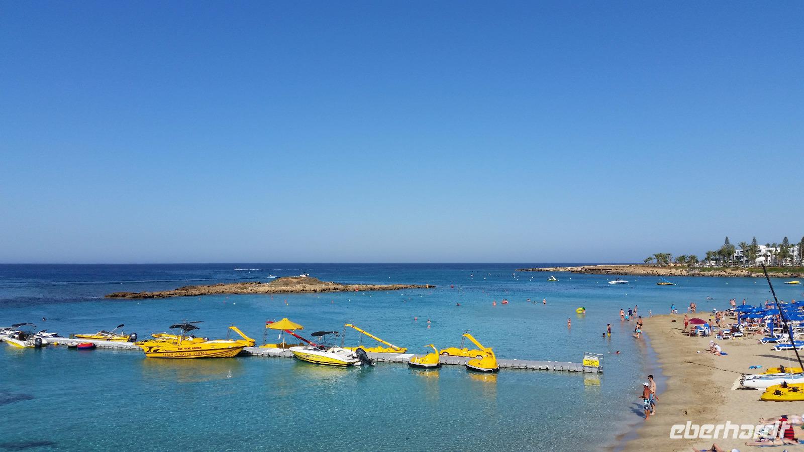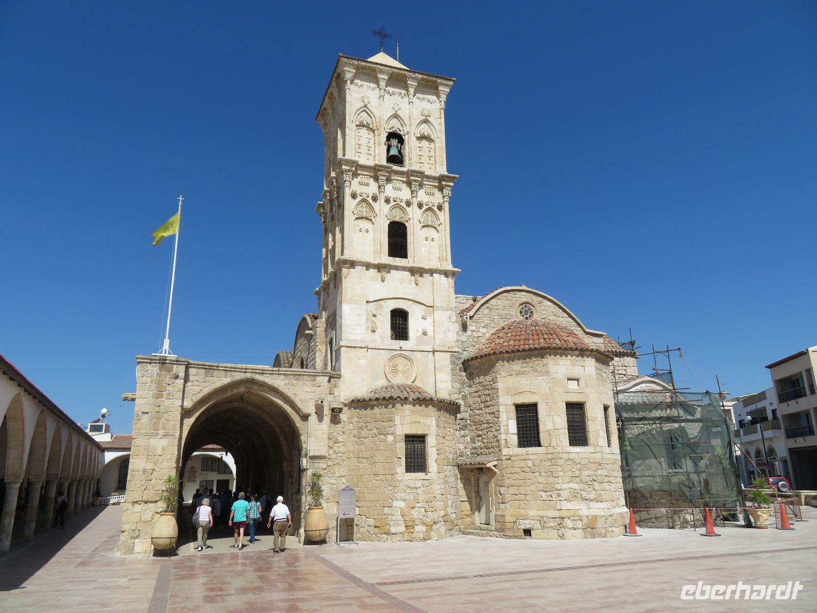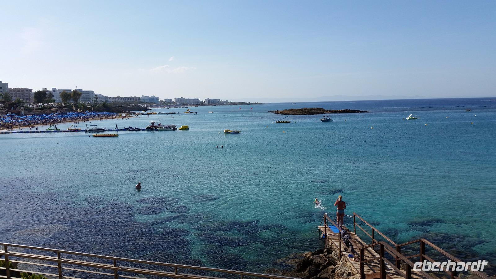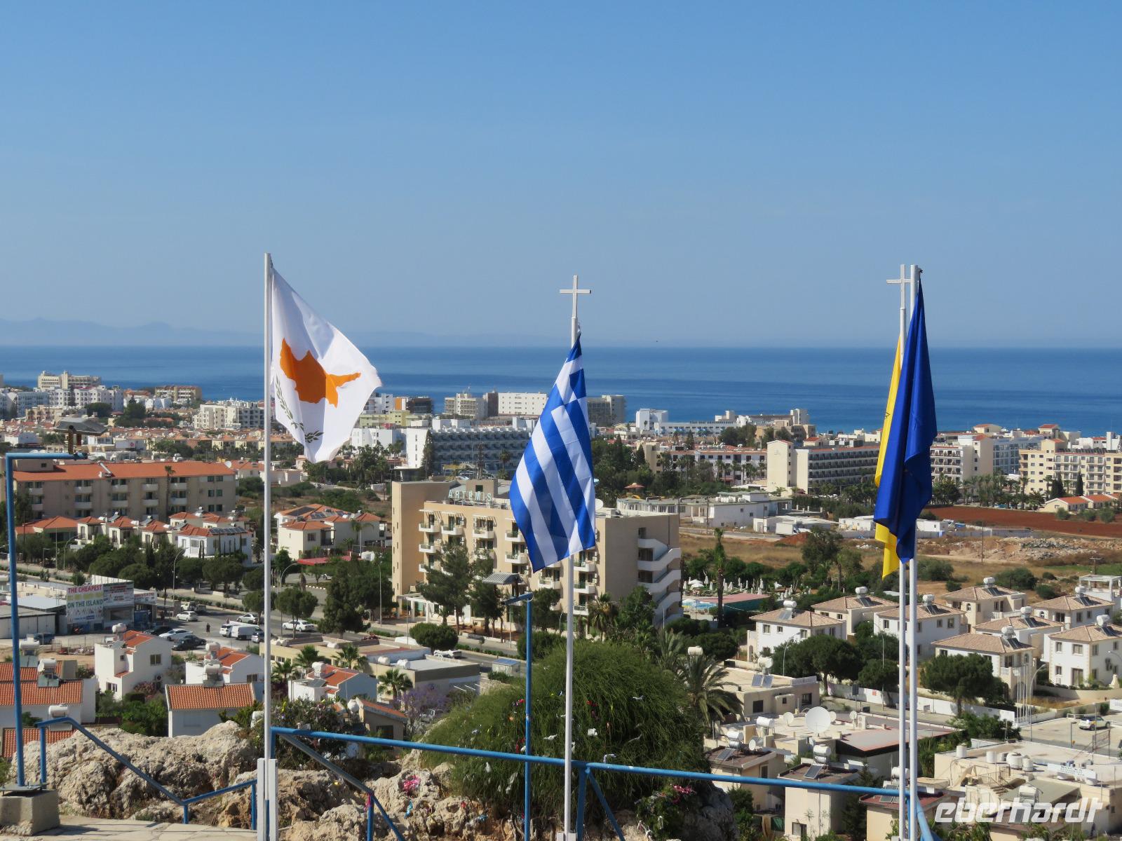 Nur wenige Kilometer sind es eigentlich von Protaras entlang der roten Dörfer bis zur Grenze in den Nordteil der Insel, doch durch den Grenzübergang muss man einen Umweg von 15 Kilometern nehmen. Der Ort Protaras, in dem sich vorrangig Hotelanlagen befinden, wurde erst nach der Teilung Zyperns errichtet und ist heute ein beliebter Badeort. Die roten Dörfer verdanken ihren Namen der roten Farbe der fruchtbaren Erde in dieser Region. Besonders viele Kartoffeln werden hier angebaut und das Schattengewächs ist außerdem das meist exportierte Gemüse der Insel. Auf Platz zwei und drei folgen Wein und die Zitrusfrüchte. An der Grenze mussten wir wieder die Ausweise vorzeigen, bevor wir die 45.000 Einwohner zählende Stadt Famagusta erreichten. Wir passierten die sehr gut erhaltene Stadtmauer und erkundeten zu Fuß die Altstadt mit der ehemaligen Nikolauskathedrale, die seit ca. 500 Jahren eine Moschee ist. Im Anschluss fuhren wir entlang des Stadtteils Varosha, auch „Tote Stadt" genannt, die sich nur unweit des Stadtzentrums befindet. Die „Tote Stadt" ist ein ehemaliges Stadtviertel von Famagusta, das bis zur Teilung von Griechisch-Zyprioten bewohnt war. Nach der Teilung wurde das Viertel zur Sperrzone erklärt und blieb seitdem sich selbst überlassen. So steht z.B. in der Nähe des Meeres ein halb fertiggestellter Hotelkomplex mit einem Kran, der seit fast 40 Jahren nicht mehr bewegt wurde. Ein Symbol, das nachdenklich macht und berührt. Nur wenige Minuten entfernt und direkt am Mittelmeer gelegen, erstreckt sich bei der heutigen Stadt Salamis die größte und bedeutendste Ausgrabungsstätte der Insel. Während eines Rundgangs durch die Reste der ca. 4.000 Jahre alten Stadt konnten wir verschiedene historische Gemäuer wie z. B. das Theater, das zu seinen Blütezeiten bis zu 15.000 Zuschauern Platz bot oder die noch sehr gut erhaltenen Badeanlagen besichtigen. Nach einem reichlichen Mittagessen in einem direkt am Mittelmeer gelegenen Restaurant besuchten wir im Anschluss noch das ehemalige Kloster des heiligen St. Barnabas. Hier befindet sich die Grabstätte des Heiligen Barnabas, dem Nationalheiligen der Insel. Unweit der Grabstelle wurde bereits im 5. Jahrhundert ein Kloster errichtet, heute ist es Museum mit einem artenreichen Garten. Nachdem wir im inneren der ehemaligen Klosteranlage einen frisch gepressten Orangensaft in der Mittagssonne genossen hatten, fuhren wir wieder in Richtung Süden und überquerten wieder die Grenze. Am frühen Nachmittag waren wir dann wieder in unserem Hotel in Protaras und jeder konnte noch die das erfrischende Nass des Mittelmeeres am hoteleigenen Strand genießen. Ich unternahm mit einigen Gästen noch einen Spaziergang durch die pulsierende Stadt und wir besuchten unter anderem die Profitis Ilias Kirche, die sich auf einem kleinen Berg in unmittelbarer Stadtnähe befindet und von der man einen sehr schönen Blick über die Stadt hat.