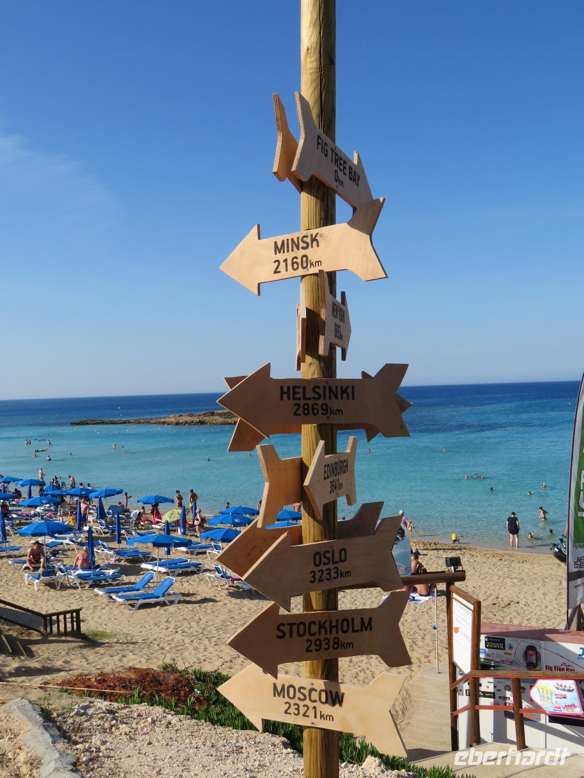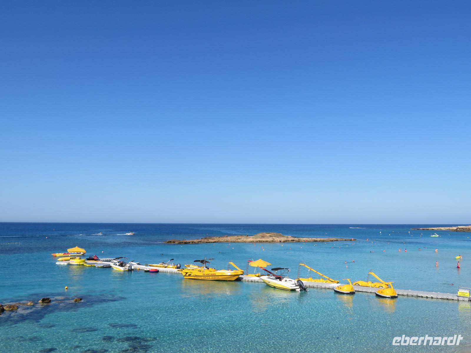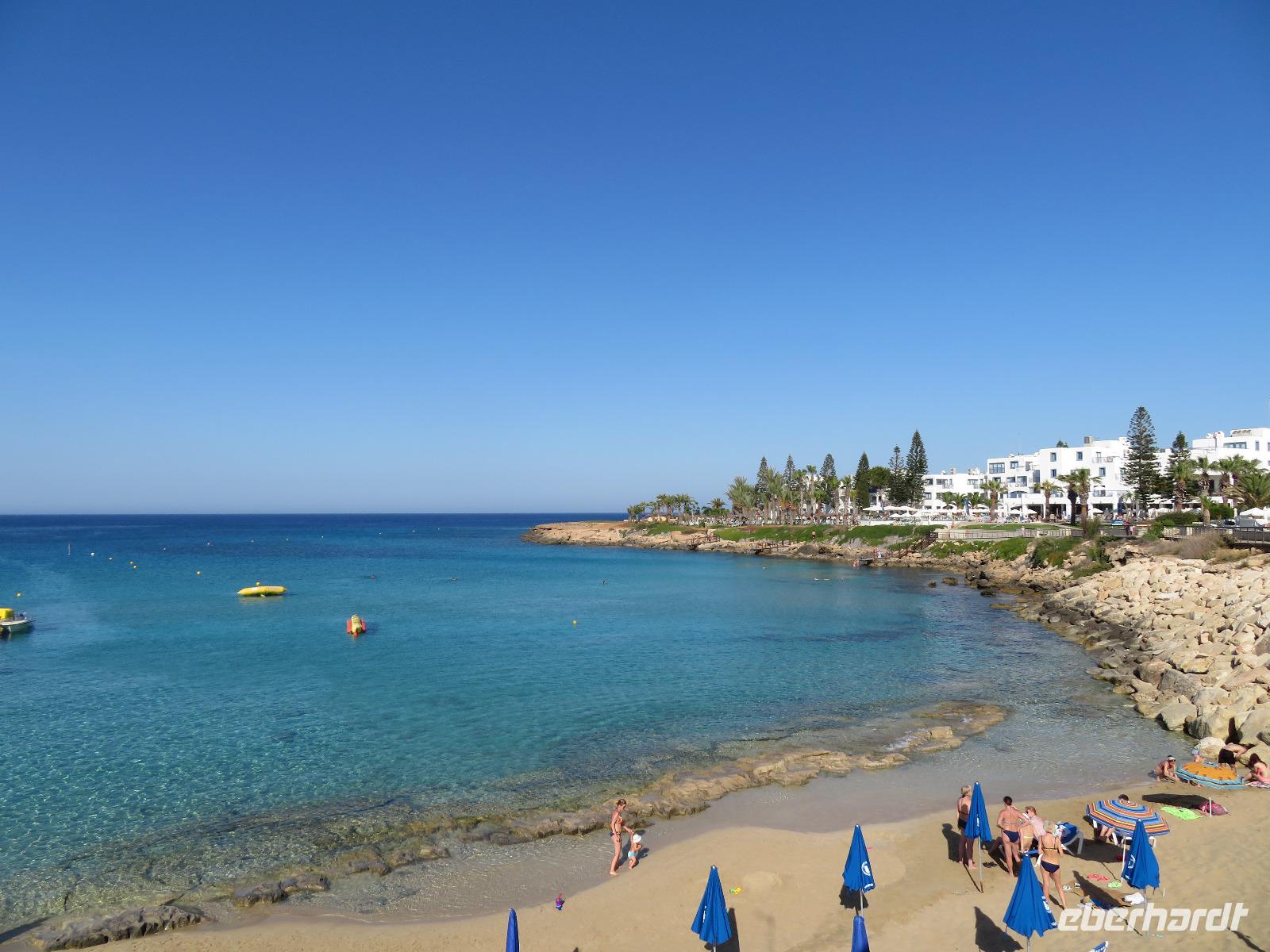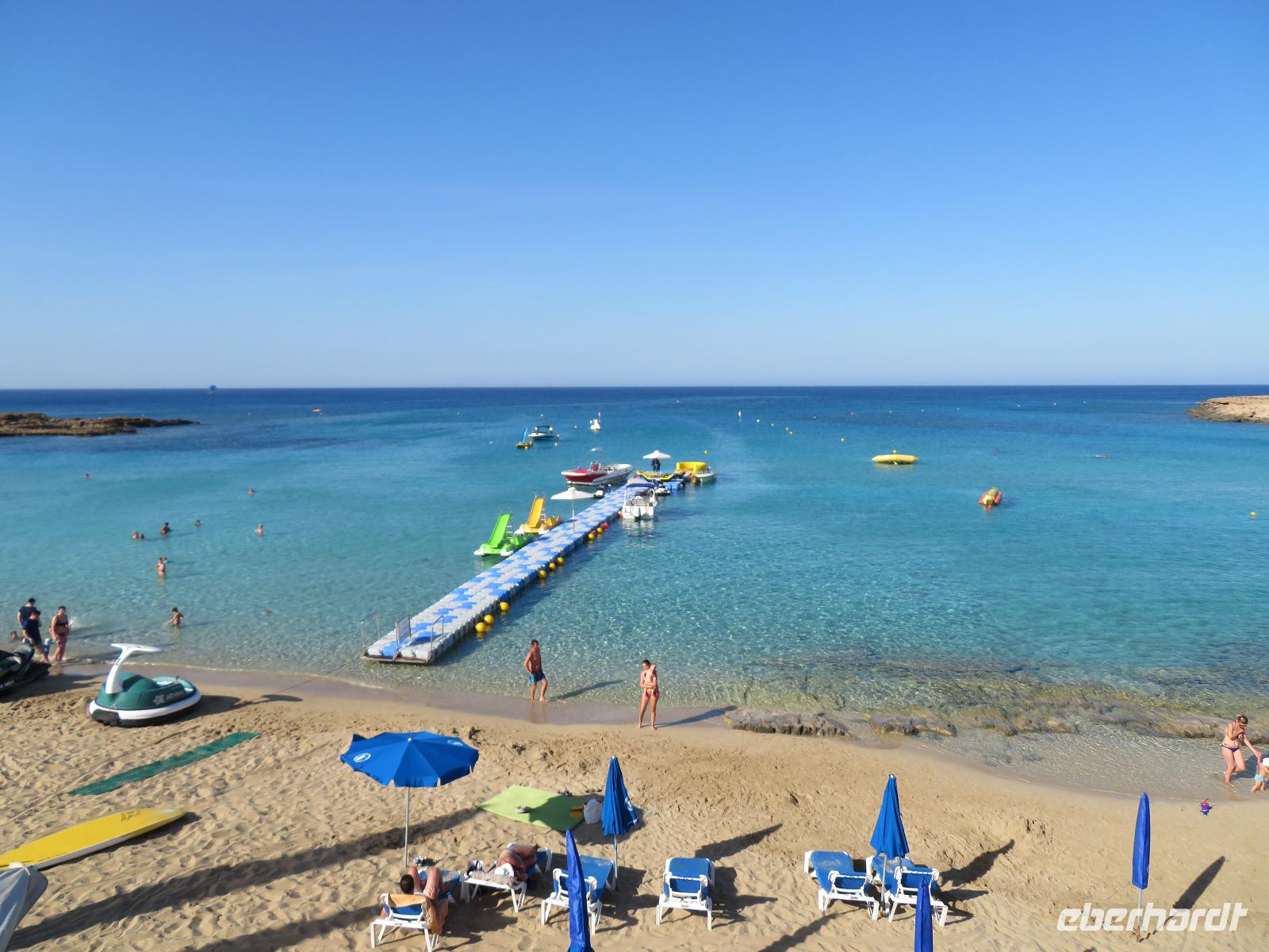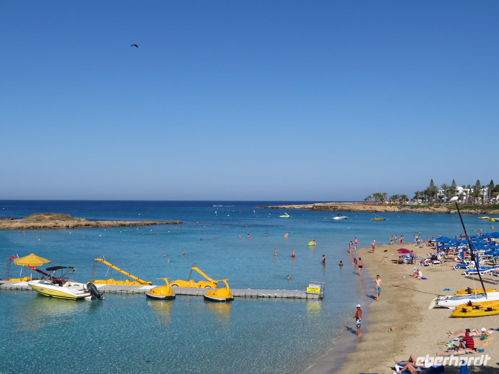 Nur wenige Kilometer sind es eigentlich von Protaras entlang der roten Dörfer bis zur Grenze in den Nordteil der Insel, doch durch den Grenzübergang muss man einen Umweg von 15 Kilometern nehmen. Der Ort Protaras, in dem sich vorrangig Hotelanlagen befinden, wurde erst nach der Teilung Zyperns errichtet und ist heute ein beliebter Badeort. Die roten Dörfer verdanken ihren Namen der roten Farbe der fruchtbaren Erde in dieser Region. Besonders viele Kartoffeln werden hier angebaut und das Schattengewächs ist außerdem das meist exportierte Gemüse der Insel. Auf Platz zwei und drei folgen Wein und die Zitrusfrüchte. An der Grenze mussten wir wieder die Ausweise vorzeigen, bevor wir die 45.000 Einwohner zählende Stadt Famagusta erreichten. Wir passierten die sehr gut erhaltene Stadtmauer und erkundeten zu Fuß die Altstadt mit der ehemaligen Nikolauskathedrale, die seit ca. 500 Jahren eine Moschee ist. Im Anschluss fuhren wir entlang des Stadtteils Varosha, auch „Tote Stadt" genannt, die sich nur unweit des Stadtzentrums befindet. Die „Tote Stadt" ist ein ehemaliges Stadtviertel von Famagusta, das bis zur Teilung von Griechisch-Zyprioten bewohnt war. Nach der Teilung wurde das Viertel zur Sperrzone erklärt und blieb seitdem sich selbst überlassen. So steht z.B. in der Nähe des Meeres ein halb fertiggestellter Hotelkomplex mit einem Kran, der seit fast 40 Jahren nicht mehr bewegt wurde. Ein Symbol, das nachdenklich macht und berührt. Nur wenige Minuten entfernt und direkt am Mittelmeer gelegen, erstreckt sich bei der heutigen Stadt Salamis die größte und bedeutendste Ausgrabungsstätte der Insel. Während eines Rundgangs durch die Reste der ca. 4.000 Jahre alten Stadt konnten wir verschiedene historische Gemäuer wie z. B. das Theater, das zu seinen Blütezeiten bis zu 15.000 Zuschauern Platz bot oder die noch sehr gut erhaltenen Badeanlagen besichtigen. Nach einem reichlichen Mittagessen in einem direkt am Mittelmeer gelegenen Restaurant besuchten wir im Anschluss noch das ehemalige Kloster des heiligen St. Barnabas. Hier befindet sich die Grabstätte des Heiligen Barnabas, dem Nationalheiligen der Insel. Unweit der Grabstelle wurde bereits im 5. Jahrhundert ein Kloster errichtet, heute ist es Museum mit einem artenreichen Garten. Nachdem wir im inneren der ehemaligen Klosteranlage einen frisch gepressten Orangensaft in der Mittagssonne genossen hatten, fuhren wir wieder in Richtung Süden und überquerten wieder die Grenze. Am frühen Nachmittag waren wir dann wieder in unserem Hotel in Protaras und jeder konnte noch die das erfrischende Nass des Mittelmeeres am hoteleigenen Strand genießen. Ich unternahm mit einigen Gästen noch einen Spaziergang durch die pulsierende Stadt und wir besuchten unter anderem die Profitis Ilias Kirche, die sich auf einem kleinen Berg in unmittelbarer Stadtnähe befindet und von der man einen sehr schönen Blick über die Stadt hat.