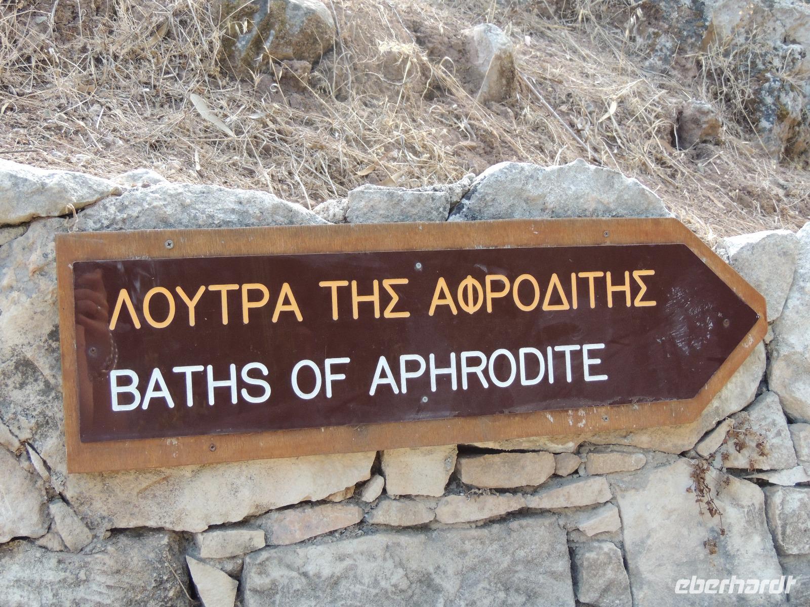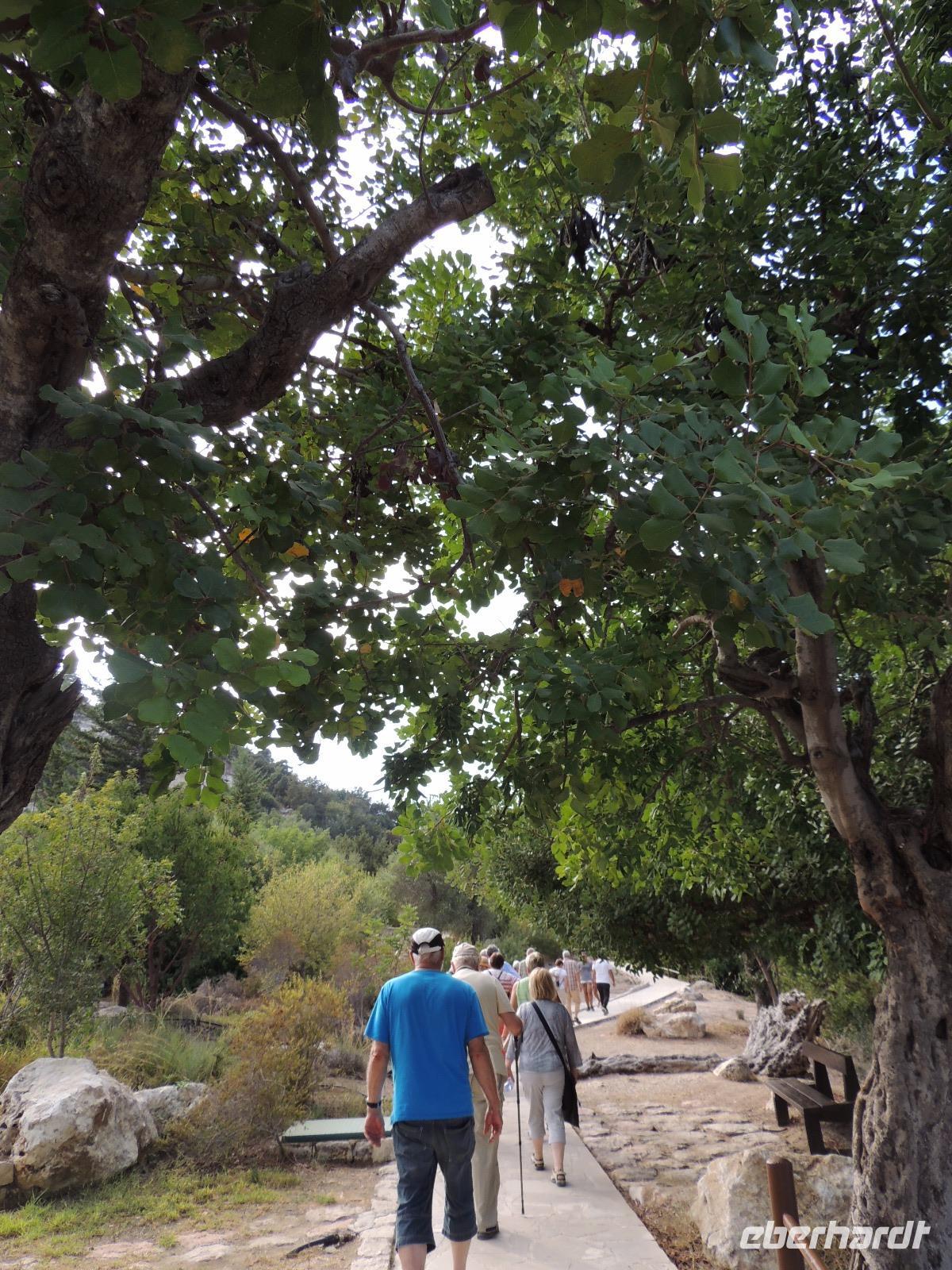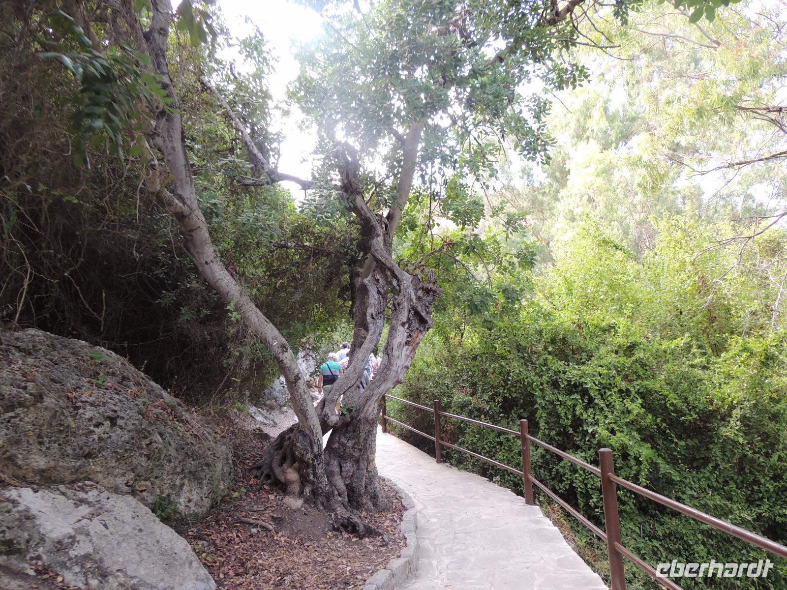 Weiter ging unsere Tour nach Kathikas zu Yiannis Taverne. Dort genossen wir in ausgelassener Stimmung und typischem, gemütlichem Ambiente ein wunderbares Meze-Essen. Uns wurden zahlreiche, leckere Kleinigkeiten aufgetischt, die sehr satt machten. Dabei hatten wir schon nur die Hälfte der Anzahl der Gänge eines eigentlichen Meze-Essens erhalten. Voll gegessen fuhren wir mit dem Bus weiter und machten aber nach kurzem zunächst einen Stopp zum Orangen pflücken. Alle waren sehr erfreut über diese Überraschung und mit prall gefüllten Tüten ging es weiter zum Bad der Aphrodite. Dort konnten wir sehr nah mit dem Bus heran fahren, was für einige Gäste eine Erleichterung darstellte. In dieser Quelle badete einst die schönste Frau, um stets noch schöner und jünger zu werden. Das Wasser der Quelle soll ganze 20 Jahre junger machen. Einige spazierten noch ein Stück durch das Naturschutzgebiet, andere gingen einen Kaffee oder ähnliches trinken.