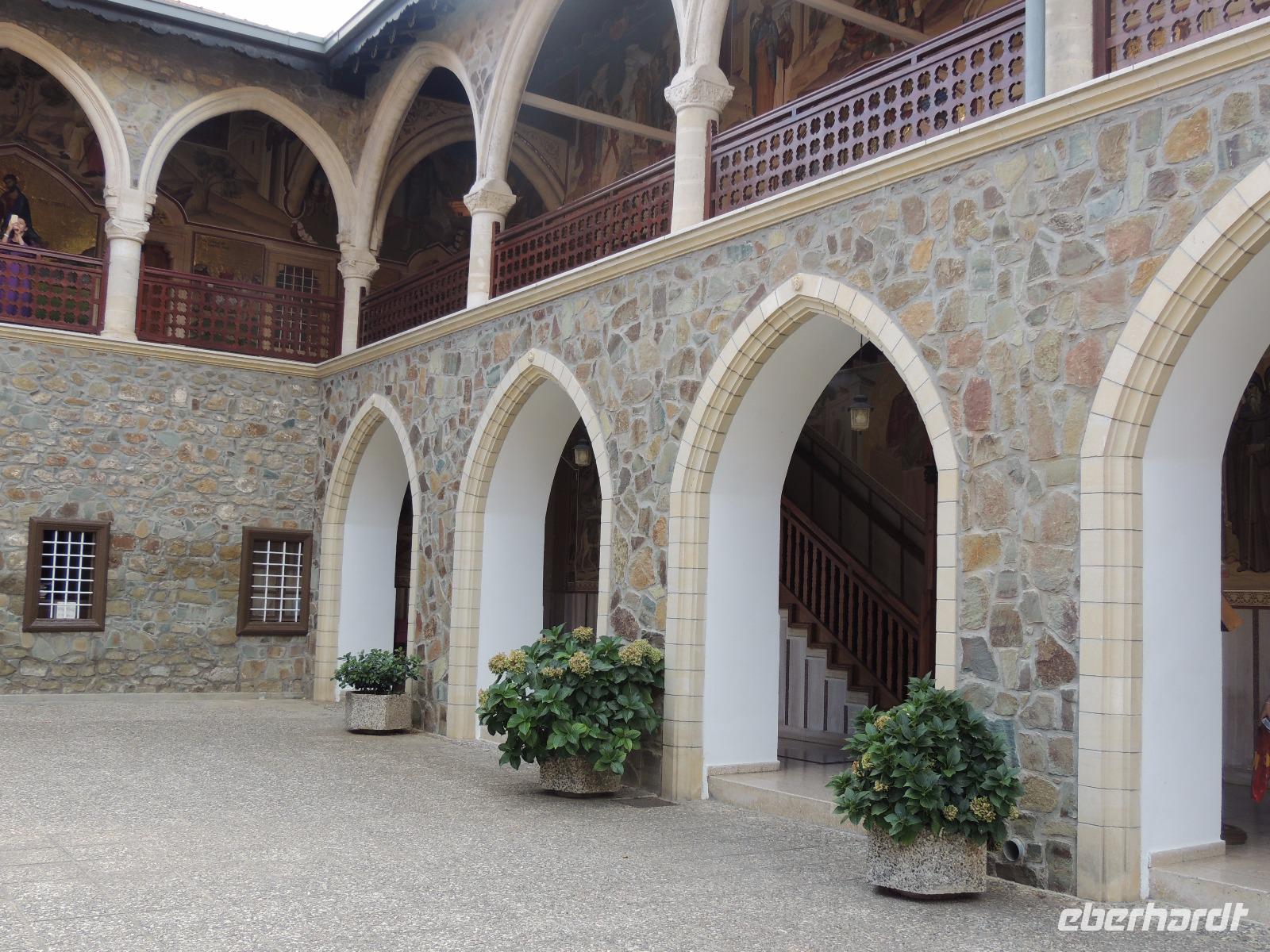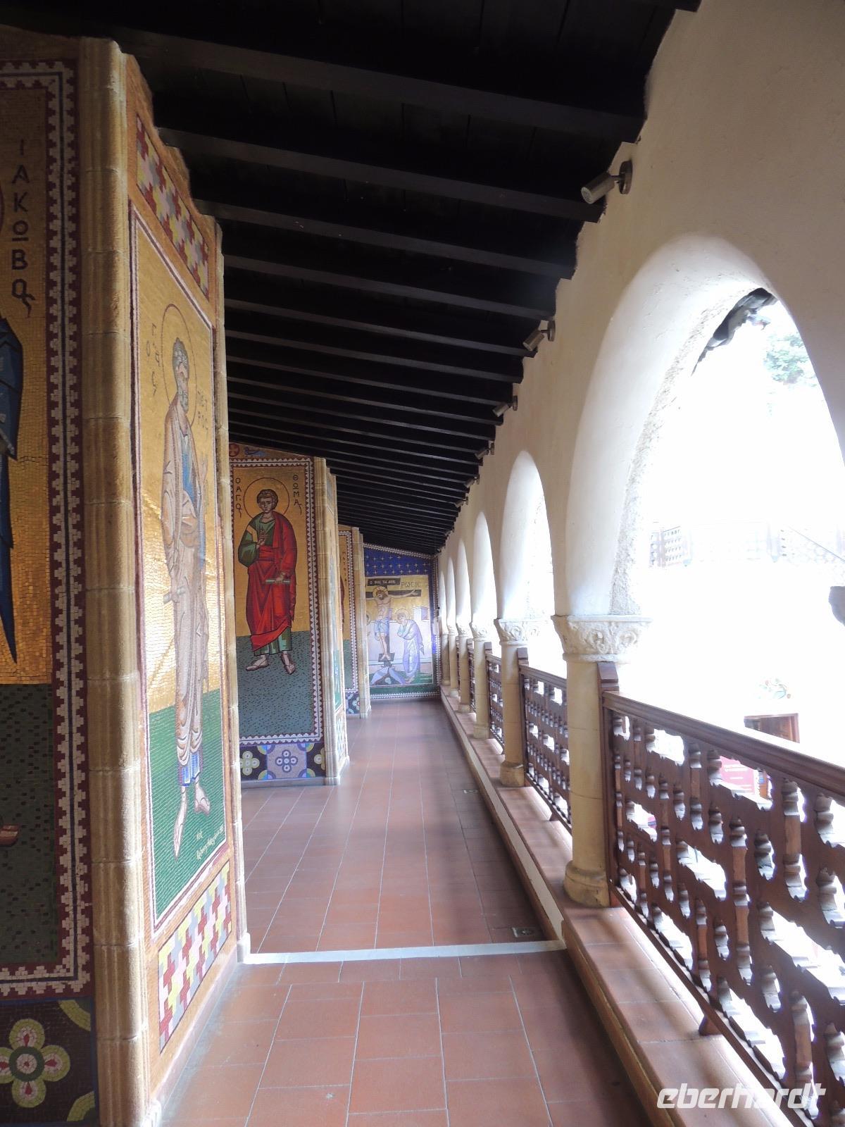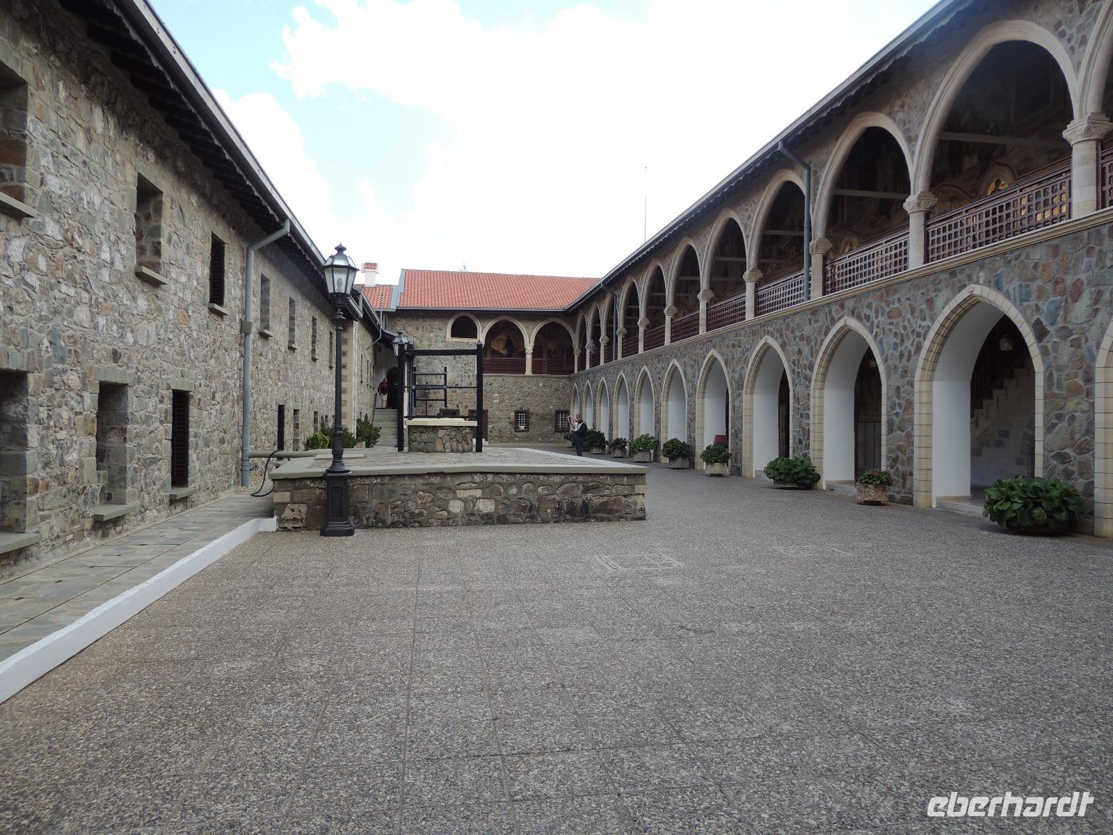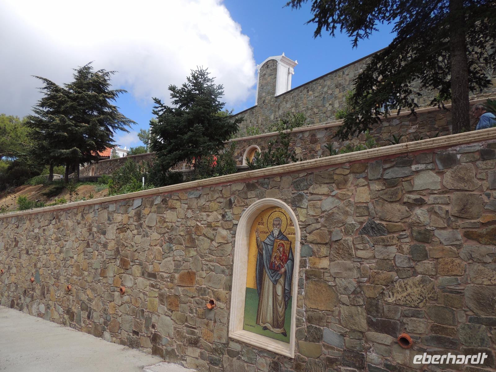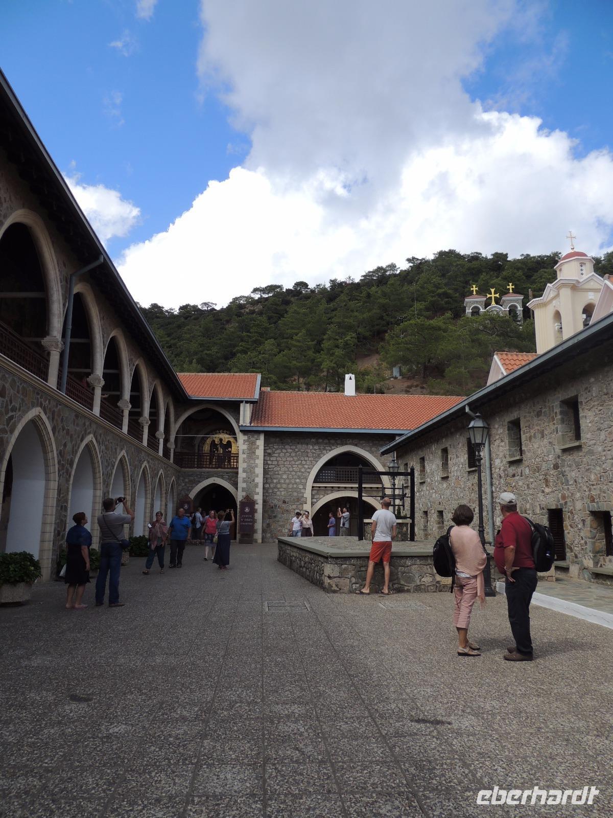 Weiter ging es dann über unendlich viele Serpentinen zu dem Kykkos Kloster. Dort konnten wir einen Rundgang machen, Jorgos erzählte uns zuvor viel über das Kloster. Besonders prunkvoll war die Kapelle. Überall glänzte und glitzerte es aus Gold, natürlich waren auch Heilige abgebildet, auch sterbliche Überreste konnte man betrachten.