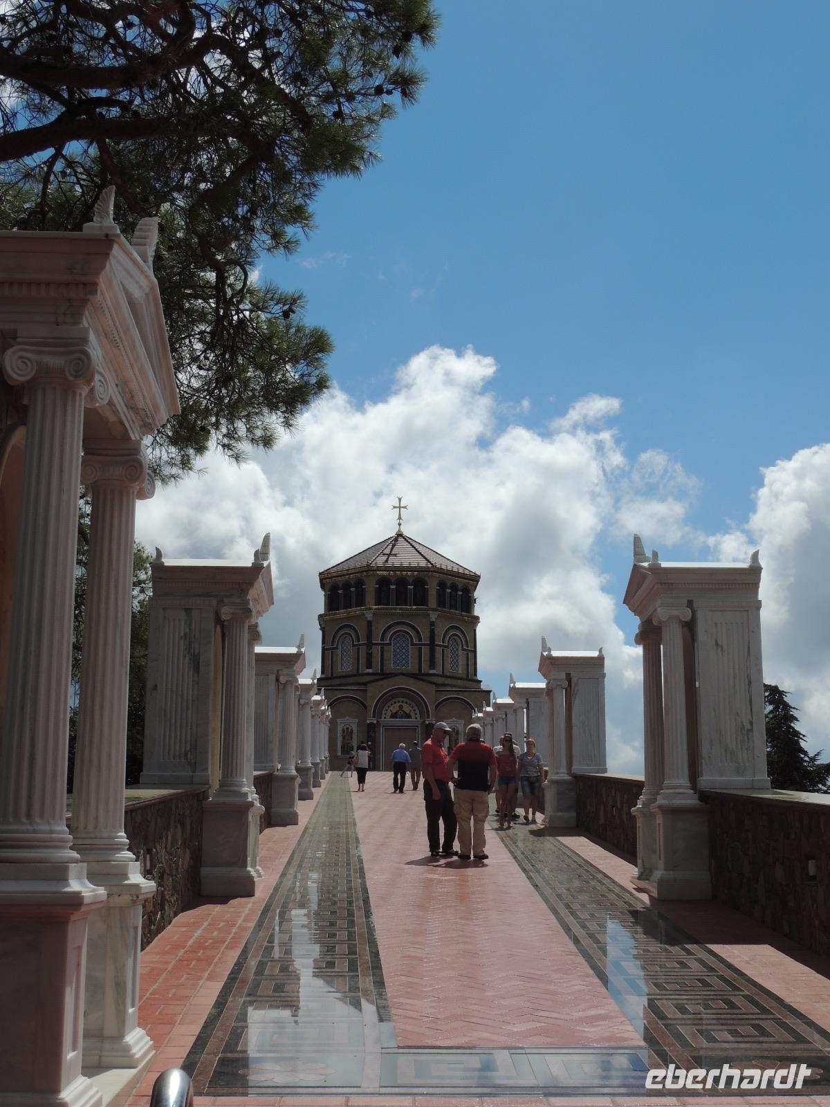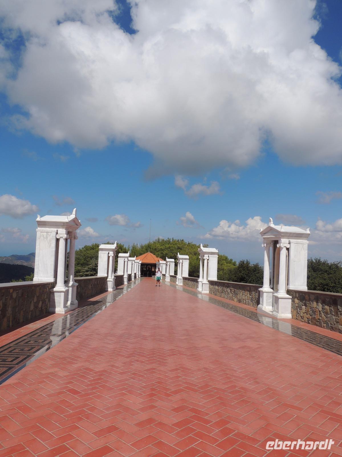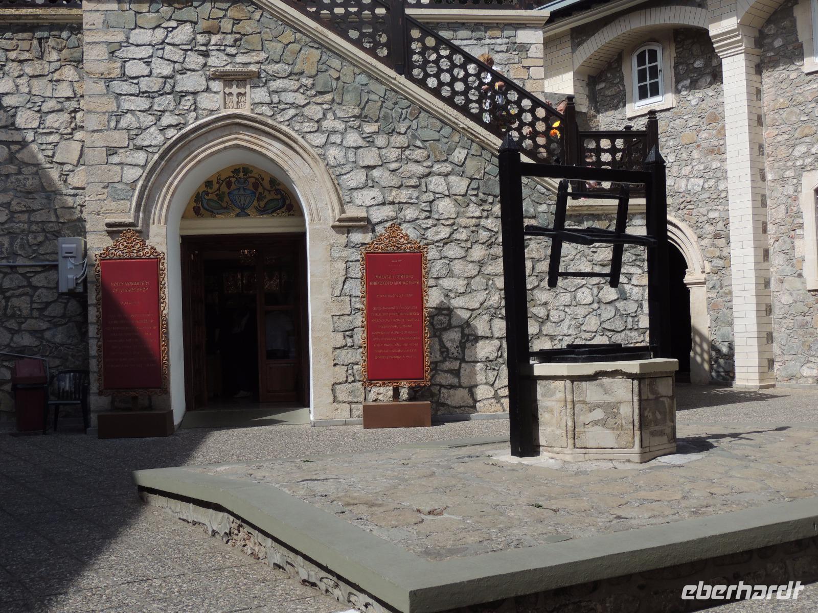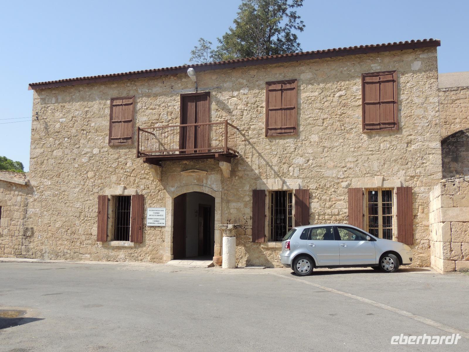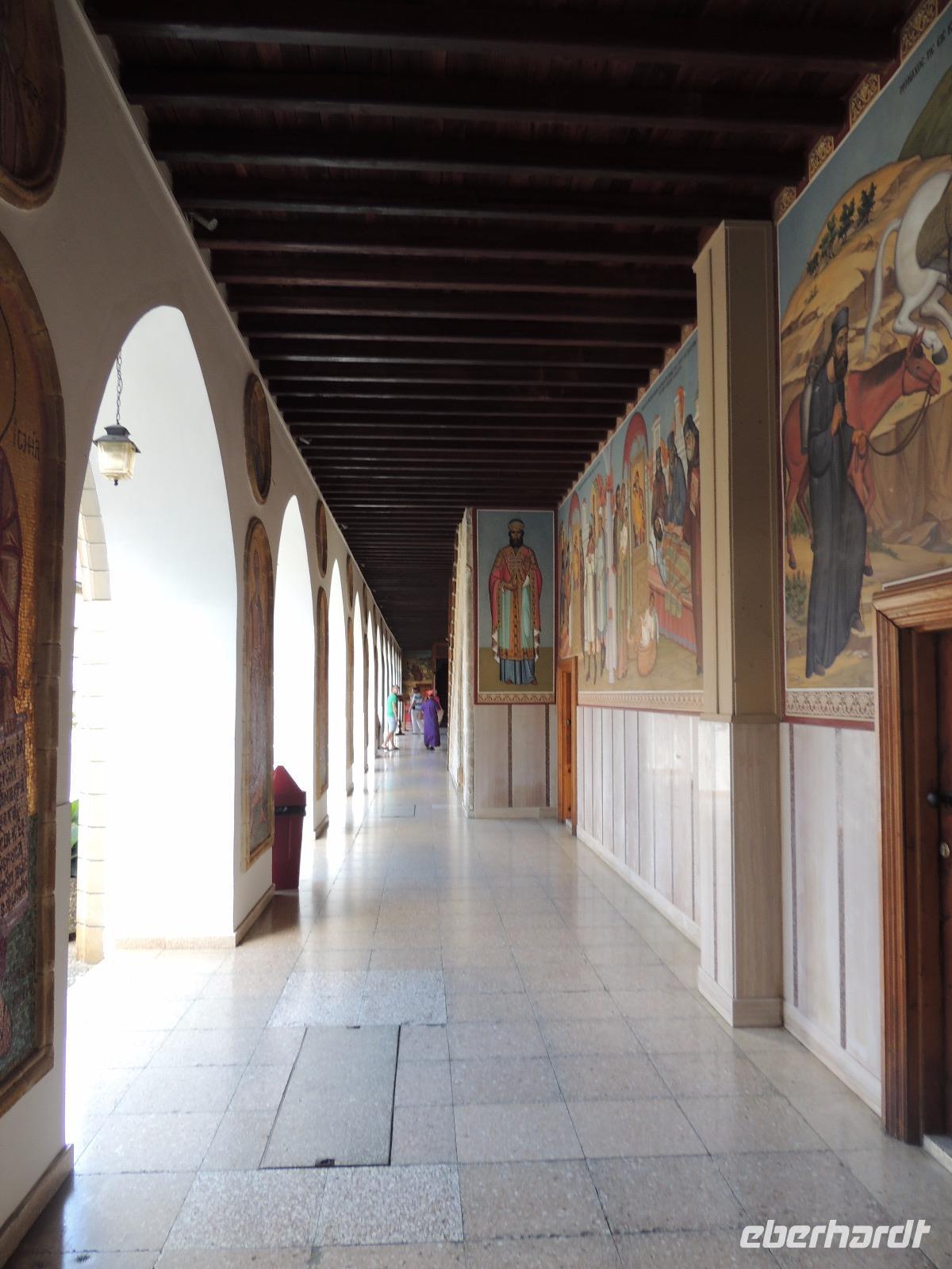 Weiter ging es dann über unendlich viele Serpentinen zu dem Kykkos Kloster. Dort konnten wir einen Rundgang machen, Jorgos erzählte uns zuvor viel über das Kloster. Besonders prunkvoll war die Kapelle. Überall glänzte und glitzerte es aus Gold, natürlich waren auch Heilige abgebildet, auch sterbliche Überreste konnte man betrachten.