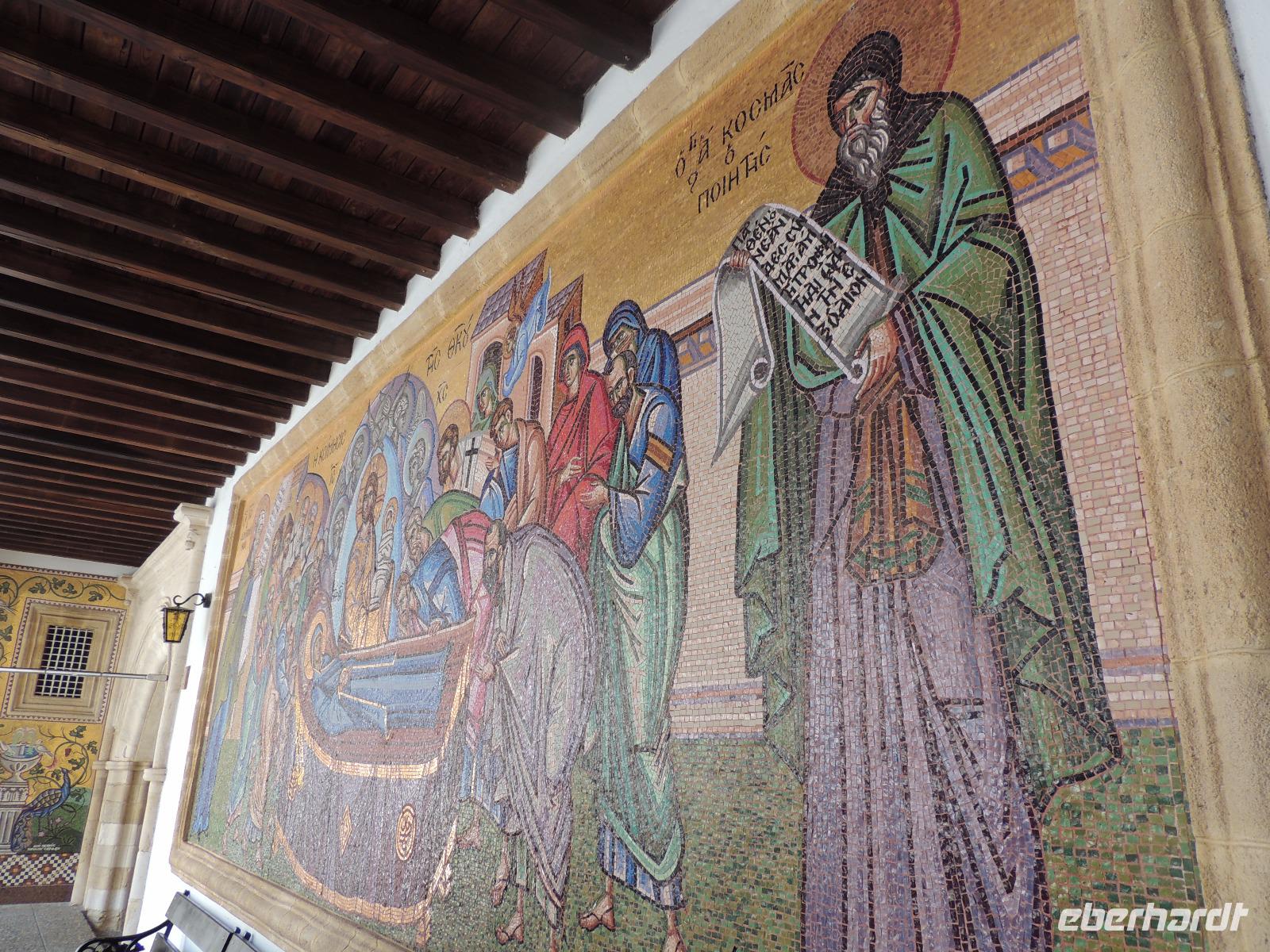 Der heutige Tag war der Religion gewidmet. Wir fuhren, wie immer 8:30 Uhr vom Hotel los, und besuchten zunächst Scheunendachkirchen in dem Dorf Kyperounta. Diese stammen aus dem 11. oder 15. Jahrhundert und sind immer noch sehr gut erhalten. Besonders erstaunlich ist, wie gut erhalten noch die baskische Malerei ist, es ist kaum etwas beschädigt.