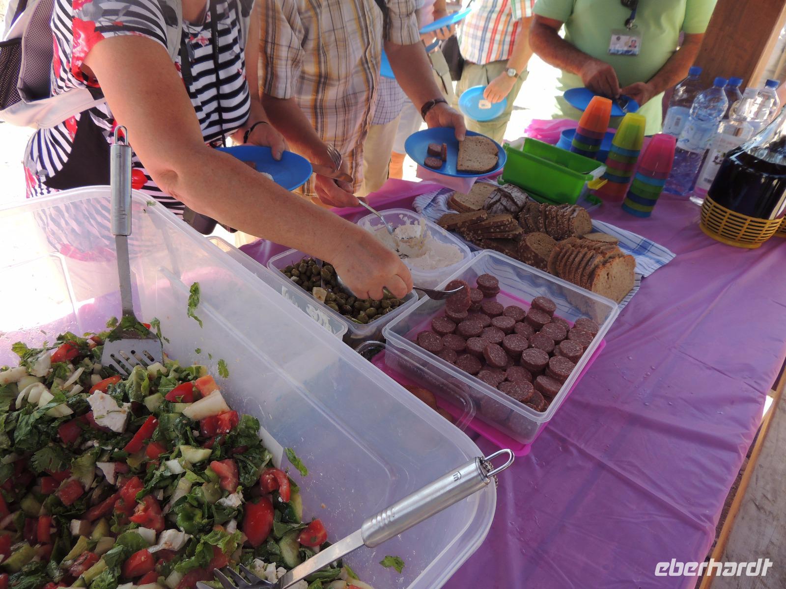 Es dauerte nicht mehr lange und wir waren beim Picknick. Dort hatte Antonious leckere Kleinigkeiten für uns zu bereitet. Allen schmeckte es und wir genossen den Ausblick. Nach dem Picknick fand dann auch die Verabschiedung von unserem Reiseleiter Jorgos und unserem Busfahrer Kyriakos statt. Wir fuhren dann noch circa 30 Minuten zum Hotel, checkten dort ein und hatten den Nachmittag zur freien Verfügung. Einige nutzten diese noch einmal zum Schwimmen im Meer. Ein letztes gemeinsames Abendessen nahmen wir vom Buffet im Restaurant ein, bei vielen hat sich der Hunger allerdings noch in Grenzen gehalten, da das Picknick so gut war.
