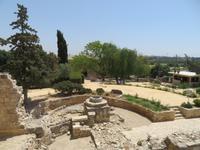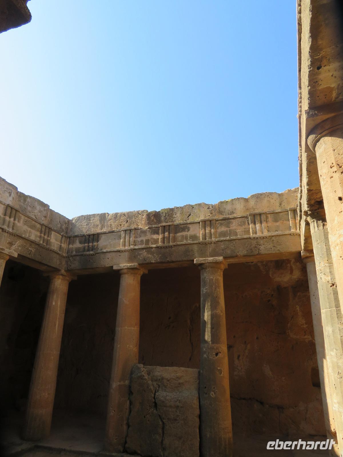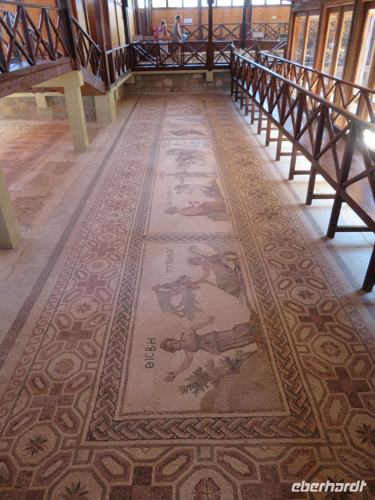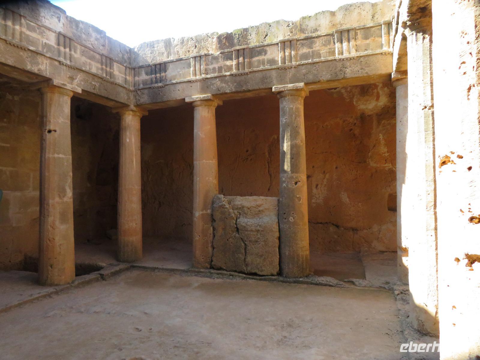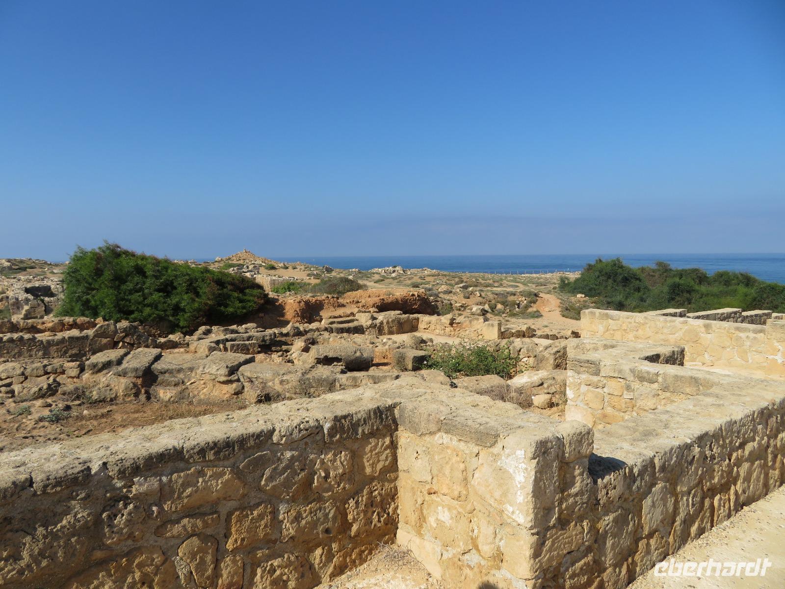 Zum Abschluss steht uns noch ein gemäßigter Ausflugstag bevor. Zunächst reisen wir nur nach in die Nähe von Paphos, das von unserem Hotel etwa 10 Minuten entfernt liegt. Die Königsgräber von Neo Paphos zählen zu einer der wichtigsten Ausgrabungen Zyperns. Die Gräber sind noch gut erhalten, sowohl der lichdurchflutete Innenhof, der von Säulen gesäumt wird, als auch die Gräber. Ob hier wirklich Könige begraben sind ist fraglich. Es ist wahrscheinlicher, dass sich hier die reichen Bürger der Stadt Ihre letzte Ruhestätte errichten ließen. Wir lassen unseren Blick ein letztes Mal über die Ausgrabungsstätte streifen und fahren weiter in die Kulturhauptstadt 2017. Paphos. Im Haus des Dionysos erzählen Bodenmosaike Geschichten über die Mythologie des Dionysos und anderen Figuren. Die Boddenmosaike sind Teil von ehemaligen Villen, dass es keine Maßanfertigungen sind bzw. zum Teil schlecht gearbeitet wurde, sieht man an dem Adler, dessen Flügel gestutzt werden mussten. Trotzdem ist es eine beeindruckende Sammlung, die viel Pflege benötigt. Wir fahren weiter zum Kloster des Heiligen Neophystos, welches aus einer Höhle mit Fresken besteht, einer Kirche mit einer prächtigen Ikonenwand und einem Museum. Im Museum wird die Gruppe noch einmal geprüft, ob Sie aufgepasst hat: große Augen, kleiner, fleischiger Mund? Welches Jahrhundert ist es wohl? Im Anschluss kehren wir in Yiannys Taverne ein. Das Meze-Essen besteht dieses Mal aus verschiedenen vegetarischen Gerichten. Immer mit der Ruhe, langsam, langsam, wie Antonis so gerne sagt, probieren wir die verschiedenen Gänge. Ein tolles, letztes gemeisames Mittagessen. Der Tag ist aber noch nicht vorbei, denn wir unternehmen noch einen kleinen Spaziergang im Naturschutzgebiet der Akamas Halbinsel. Dabei kommen wir vorbei an dem Bad der Aphrodite, einem verwunschenen Ort und wagen den Aufstieg, der sich lohnt: Wir überblicken die türkis-blau schimmernde Bucht, die doch fast ein wenig an die Karibik erinnert. Am Nachmittag können wir auch nochmal ein Bad im Meer nehmen, die Sonne geht unter und der Tag geht zu Ende.