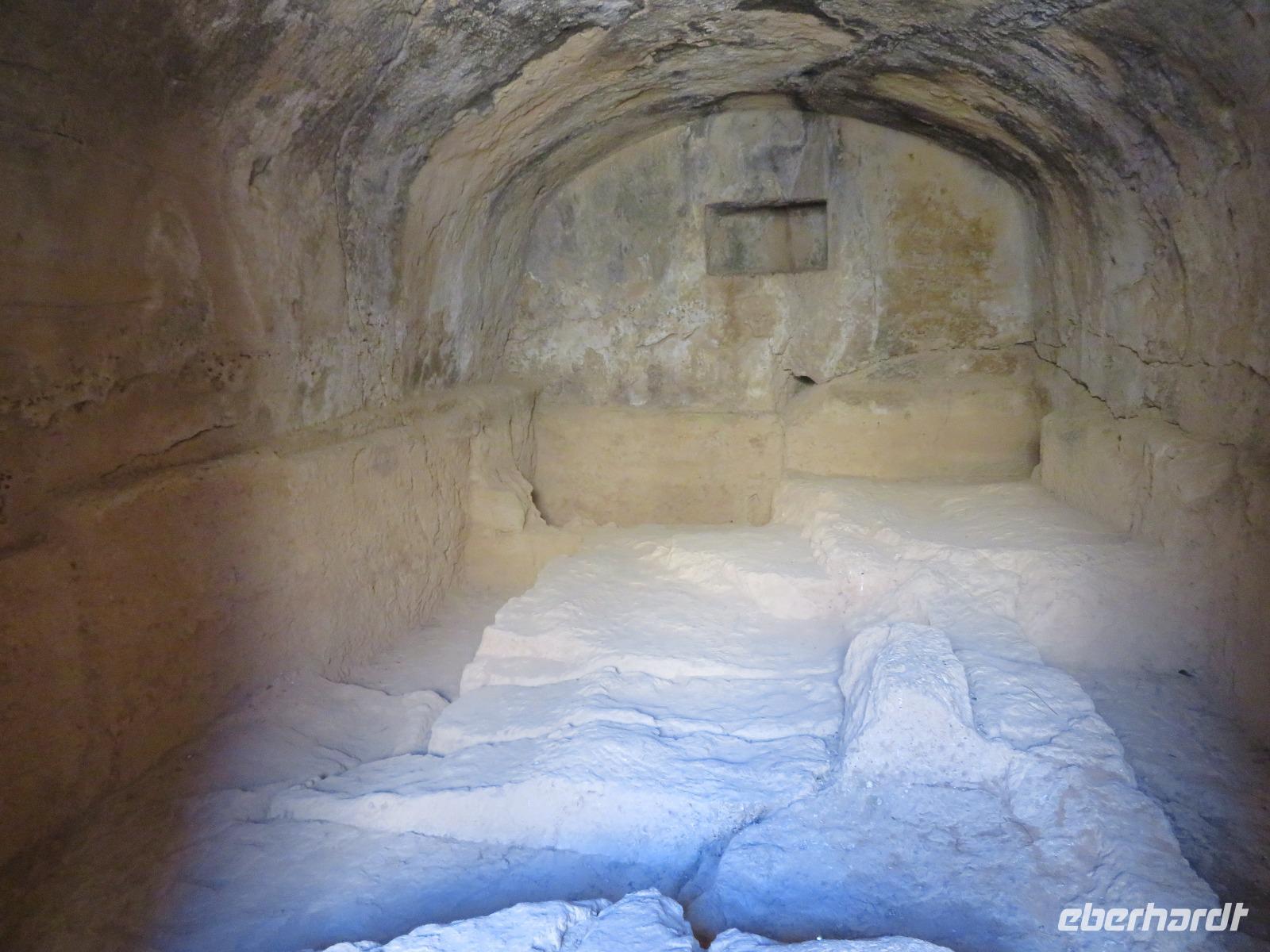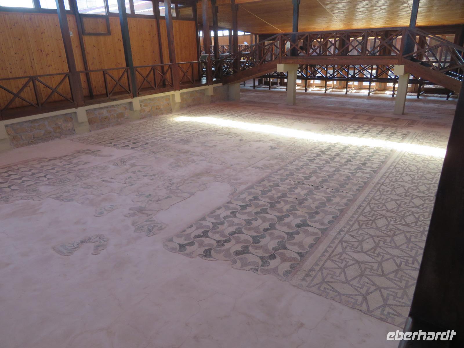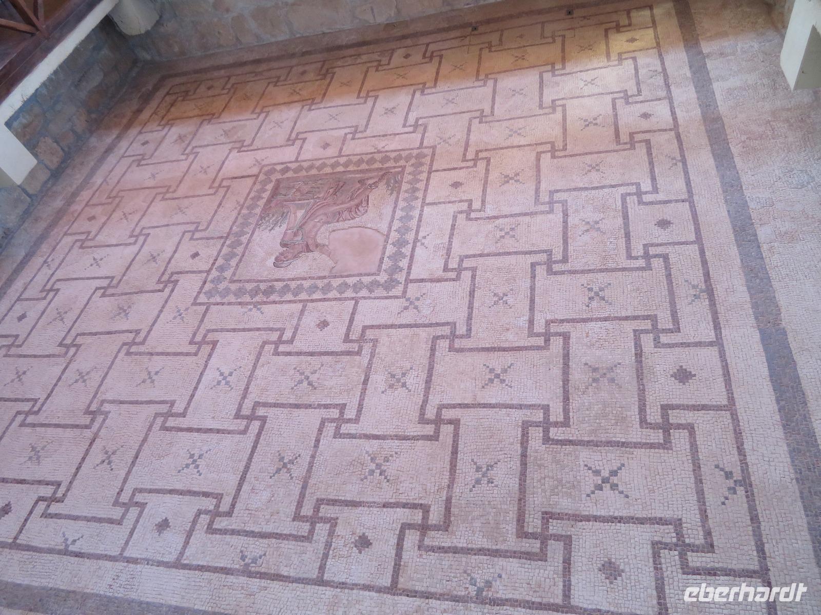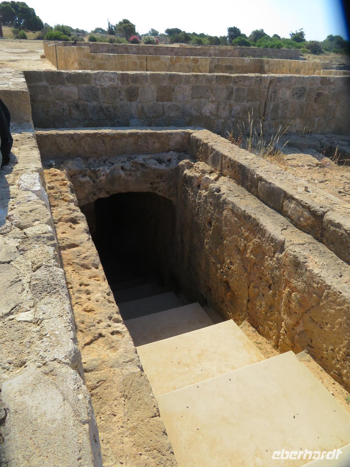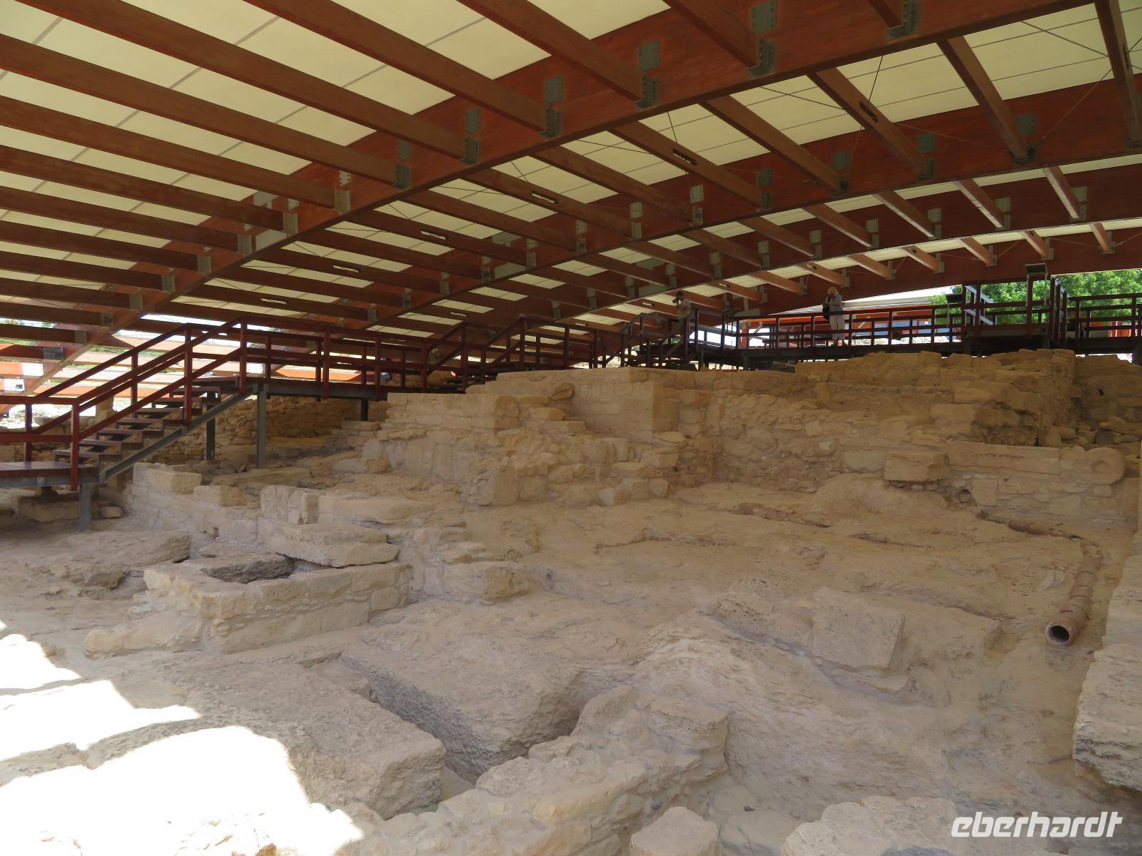 Zum Abschluss steht uns noch ein gemäßigter Ausflugstag bevor. Zunächst reisen wir nur nach in die Nähe von Paphos, das von unserem Hotel etwa 10 Minuten entfernt liegt. Die Königsgräber von Neo Paphos zählen zu einer der wichtigsten Ausgrabungen Zyperns. Die Gräber sind noch gut erhalten, sowohl der lichdurchflutete Innenhof, der von Säulen gesäumt wird, als auch die Gräber. Ob hier wirklich Könige begraben sind ist fraglich. Es ist wahrscheinlicher, dass sich hier die reichen Bürger der Stadt Ihre letzte Ruhestätte errichten ließen. Wir lassen unseren Blick ein letztes Mal über die Ausgrabungsstätte streifen und fahren weiter in die Kulturhauptstadt 2017. Paphos. Im Haus des Dionysos erzählen Bodenmosaike Geschichten über die Mythologie des Dionysos und anderen Figuren. Die Boddenmosaike sind Teil von ehemaligen Villen, dass es keine Maßanfertigungen sind bzw. zum Teil schlecht gearbeitet wurde, sieht man an dem Adler, dessen Flügel gestutzt werden mussten. Trotzdem ist es eine beeindruckende Sammlung, die viel Pflege benötigt. Wir fahren weiter zum Kloster des Heiligen Neophystos, welches aus einer Höhle mit Fresken besteht, einer Kirche mit einer prächtigen Ikonenwand und einem Museum. Im Museum wird die Gruppe noch einmal geprüft, ob Sie aufgepasst hat: große Augen, kleiner, fleischiger Mund? Welches Jahrhundert ist es wohl? Im Anschluss kehren wir in Yiannys Taverne ein. Das Meze-Essen besteht dieses Mal aus verschiedenen vegetarischen Gerichten. Immer mit der Ruhe, langsam, langsam, wie Antonis so gerne sagt, probieren wir die verschiedenen Gänge. Ein tolles, letztes gemeisames Mittagessen. Der Tag ist aber noch nicht vorbei, denn wir unternehmen noch einen kleinen Spaziergang im Naturschutzgebiet der Akamas Halbinsel. Dabei kommen wir vorbei an dem Bad der Aphrodite, einem verwunschenen Ort und wagen den Aufstieg, der sich lohnt: Wir überblicken die türkis-blau schimmernde Bucht, die doch fast ein wenig an die Karibik erinnert. Am Nachmittag können wir auch nochmal ein Bad im Meer nehmen, die Sonne geht unter und der Tag geht zu Ende.