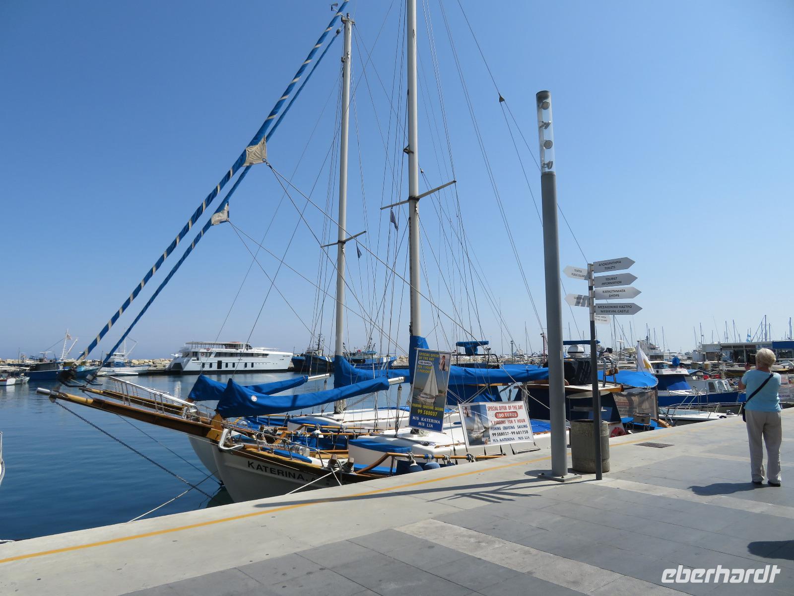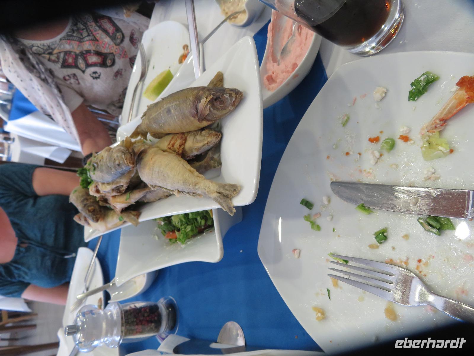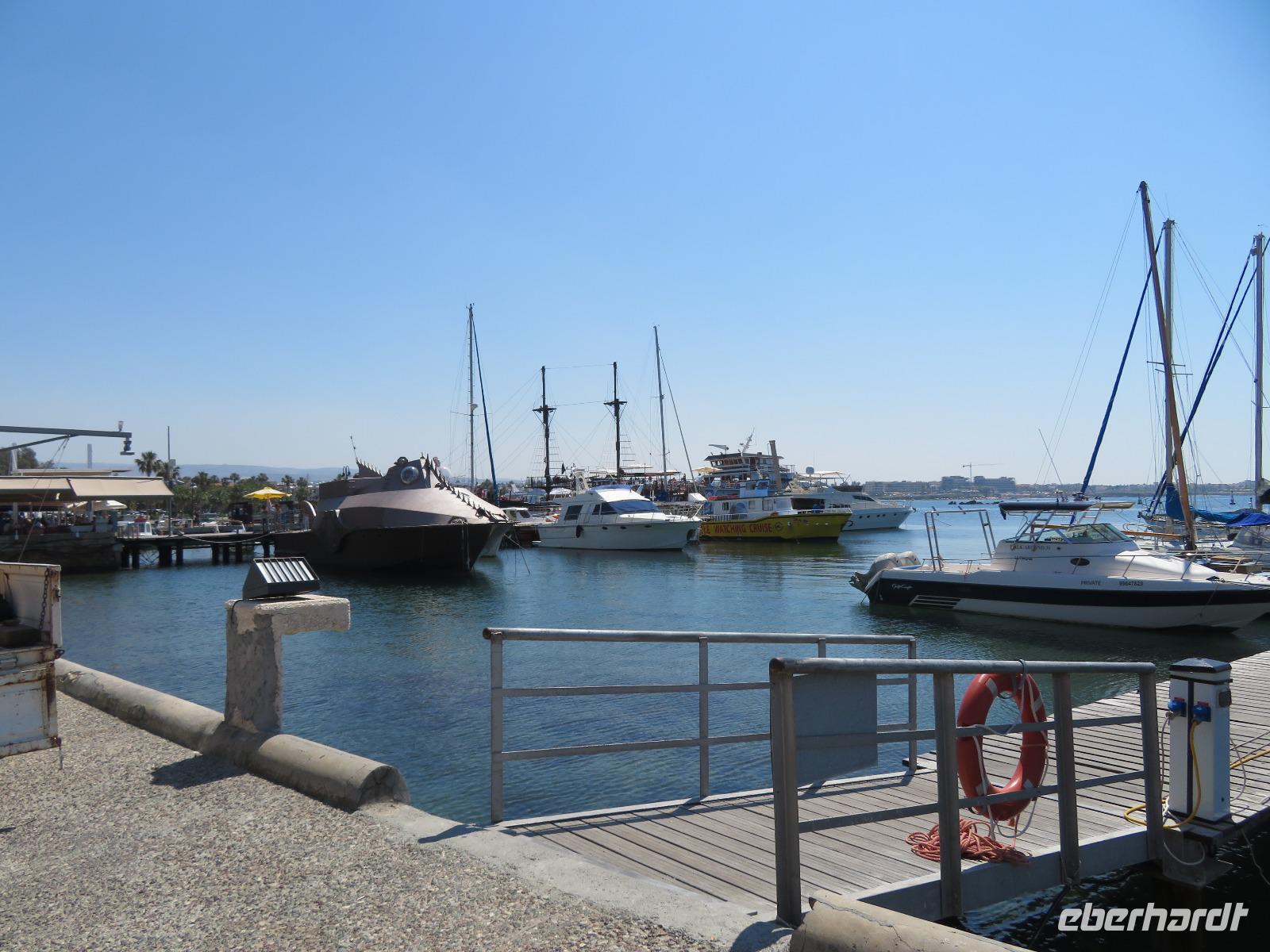 Am Morgen werden wir bereits von der Sonne geweckt, es scheint ein schöner Tag zu werden. Auf dem Weg zur Ausgrabungsstätte von Kourion legten wir einen Fotostopp an einem Parkplatz mit Blick auf den Felsen der Aphrodite ein. Legenden zufolge die Liebesgöttin Aphrodite hier geboren worden sein. Es gibt noch mehr Gerüchte, die sich um den Felsen ranken. Angeblich soll man 10 Jahre jünger werden, wenn man hier im Meer badet und mit dem Strom schwimmt. Doch diese Theorie können wir leider nicht testen und so fahren wir weiter nach Kourion. Zunächst besuchen wir den Teil der Ausgrabungsstätte mit dem so genannte Erdbebenhaus. Antonis erklärt anhand der Ruinen und einer Zeichnung, wie die antiken Städte damals aufgebaut waren. Auch einige Wörter, die wir heute in unserem Sprachgebrauch benutzen haben, in der damaligen Zeit. Wie zum Beispiel, dass die Städte in Viertel aufgeteilt sind. Die Römer hatten immer zwei Hauptstraßen, die sich in der Mitte kreuzten. Die Wohngebiete waren in den Bereichen um die beiden Hauptstraßen aufgeteilt. Da es immer vier Teile waren, ergab sich der Name Viertel. Unser Rundgang führt uns weiter, wir können die Umrisse einer frühchristlichen Basilika erkennen und die Überreste der Agora. Am beeindruckensten ist aber das Amphietheater von Kourion. Dieses wurde vom Erdbeben im Jahr 365 n. Chr. zerstört, aber heute ist es komplett restauriert und wird auch wieder für Veranstaltungen genutzt. Eine traumhafte Kulisse. Auch die Villa des Eustolios ist sehenswert in der sich zum Teil gut erhaltene Bodenmosaike befinden. Gestärkt begeben wir uns auf Erkundungstour der Johanniterburg, ein Zeugnis des Mittelalters. Nun ist es Zeit für das Mittagessen, welches wir uns wohlverdient haben. Wir lernen das zypriotische Meze-Essen kennen. Nur heute besteht es aus den unterschiedlichsten Fisch-Gerichten. Von Calamari, über Muscheln, Garnelen, Schwertfischsteak und vielem mehr können wir kosten. Alle sind begeistert. Ein Verdauungsspaziergang ist genau das Richtige nach so einem Festmahl und so schlendern wir im Anschluss durch die Straßen von Limassol bis zum neuen Hafen. Nachdem wir wieder im Hotel angekommen sind, bleibt etwas Zeit um einmal die Temperatur des Meerwassers zu testen, bevor wir uns zum Abendessen treffen, das heute etwas kleiner ausfällt.