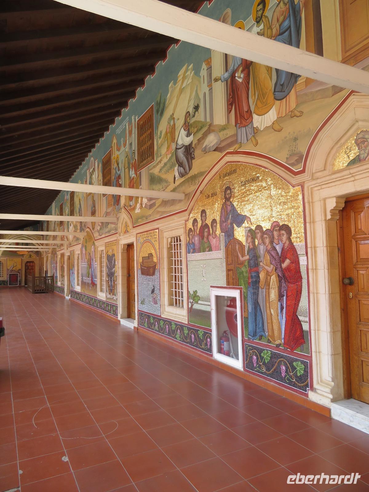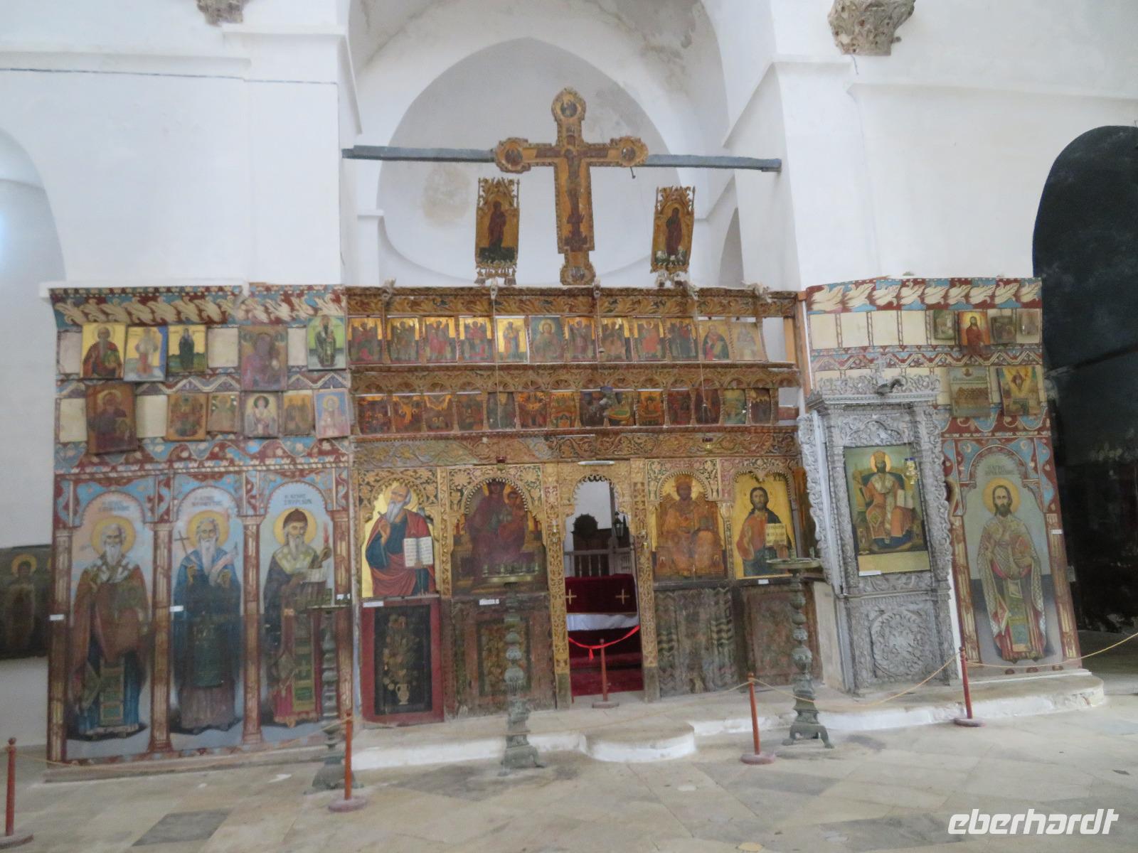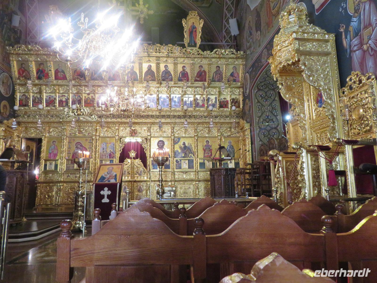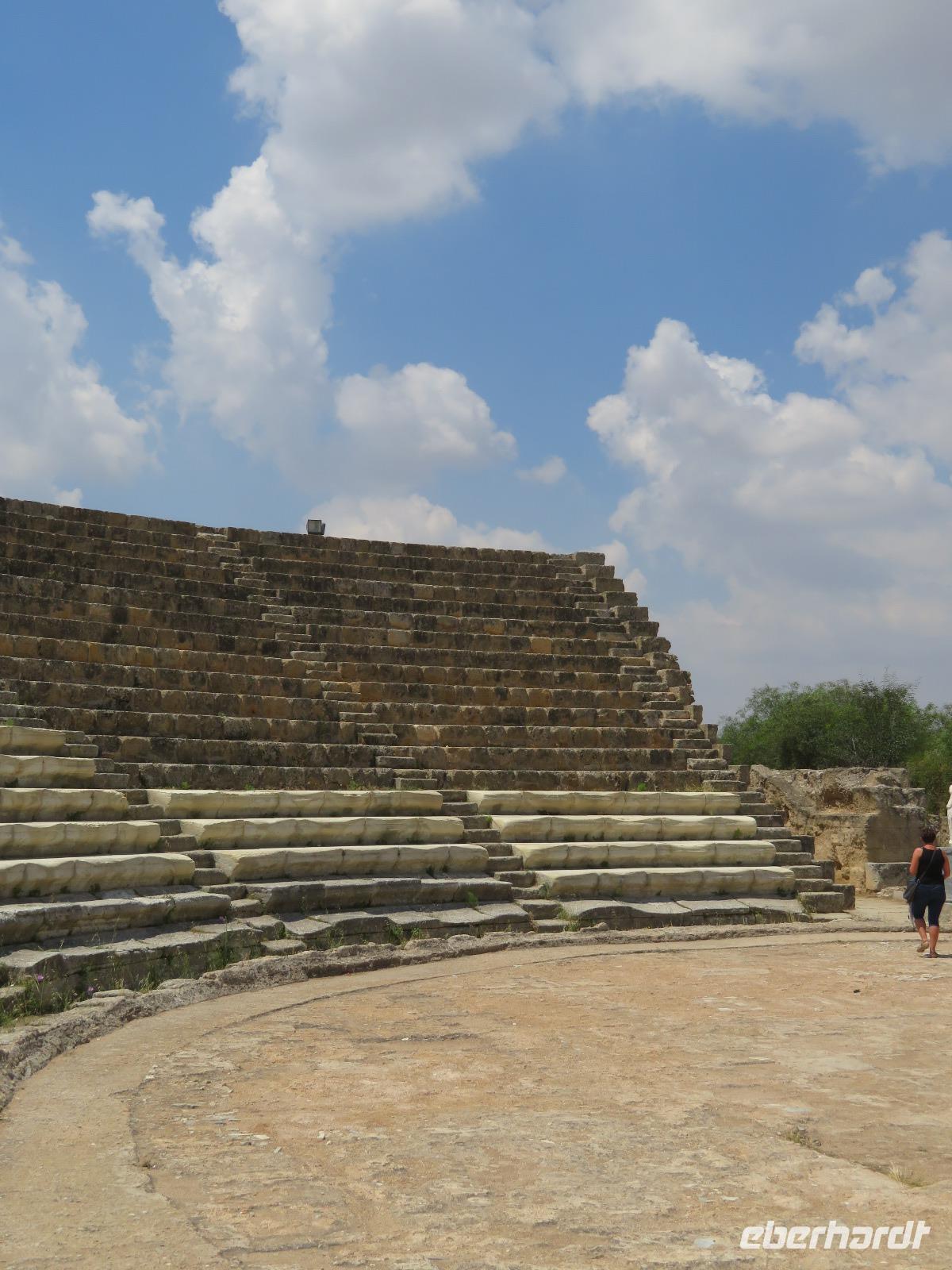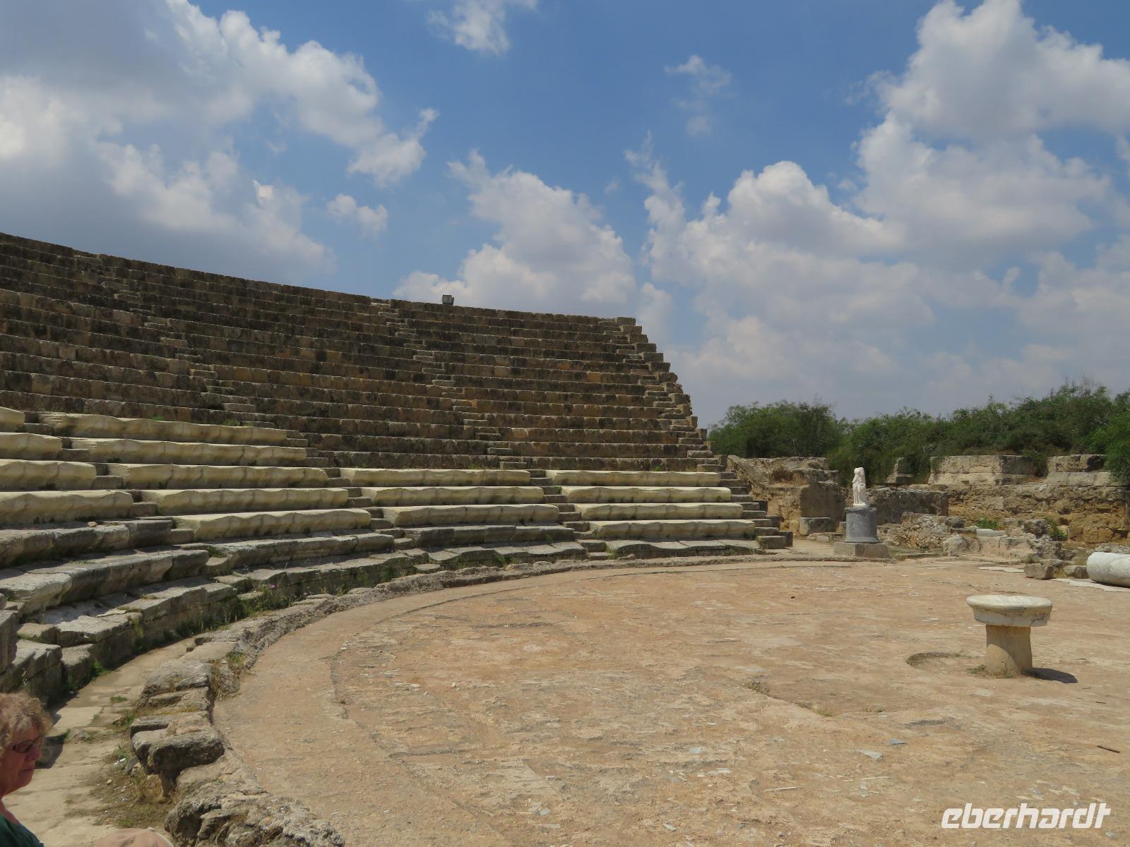 Wir beschließen den Tag früher, als geplant zu starten, da wir heute einen langen Weg vor uns haben. Einmal von Nord nach Süd. Zunächst beginnen wir den Norden, was für uns heißt: Pässe bereithalten. Heute haben wir auch wieder eine Begleitung an Board, einen Griechen-Zyprioten, der aber jetzt in Nord-Zypern lebt. Wir beginnen mit dem Barnabas-Kloster und der Grabstätte einer der wichtigsten frühchristlichen Missionäre, der erste Bischof der Insel, Barnabas. Aber auf der Nord-Seite wurde wohl kaum Geld in die Instandhaltung investiert, da die Kapelle zu verfallen zu scheint. Wir sehen uns noch etwas um und Antonis führt uns durch das Museum für Ikonen, einige Ikonen wurden auch in der früheren Ikonenwerkstatt des Klosters gemalt. Wir bleiben in Nord-Zypern und besichtigen die Ruinen der Stadt Salamis. Legenden zufolge soll Teukros, ein Kämpfer im Krieg von Troja, die Stadt gegründet haben. Da er seine Heimat, die Insel Salamis nicht mehr wieder sehen sollte, nannte er die neue Stadt wie seine Heimatinsel. Das beeindruckende Theater umfasste etwa 150.000 Menschen und war selbst erdbebensicher. Es ist eines der größten im östlichen Mittelmeer. Die weitläufige Anlage der Augrabungsstätte umfasst ein Gymnasium und mehrere Thermen mit Fußbodenheizung. Nun sind wir bereit für die zweite Etappe des Tages. In Famagusta angekommen unternehmen wir einen Spaziergang durch die Stadt. Alles ist bunt bepflanzt und die Blumen blühen. Wir erreichen die Lala Mustafa Pasha Moschee, die auch ehemals als Kathedrale erbaut wurde. Der gotische Baustil lässt kaum erahnen, dass dies eine Moschee ist. Unser Spaziergang führt uns weiter durch die Straßen. Mit dem Bus drehen wir noch eine extra Runde durch die Stadt. Doch nicht nur so, nein, wir umrunden die Geisterstadt Varosha. Man traut keinen Augen kaum, wenn man an den Zaun heranfährt, die die ehemalige Touristenhochburg umgibt. Nach der Invavsion der Türken wurde die Stadt zum Sperrgebiet erklärt und seitdem kann man den Häusern beim Verfallen zusehen. Wir drehen eine letzte Runde um die Stadt und fahren weiter nach Larnaca. Dort besichtigen wir die kleine orthodoxe Lazarus-Kirche. Hier kommt es wieder zu einer spannenden Begegnung, Antonis trifft den Priester der Gemeinde, Makarios, der und noch alles Gute auf unserem weiten Weg mitgibt. Nachdem wir noch entlang der Hafenpromenade gebummelt sind, oder einige Souveniers gekauft haben, fahren wir zurück zum Hotel Cynthiana Beach in Südzypern.