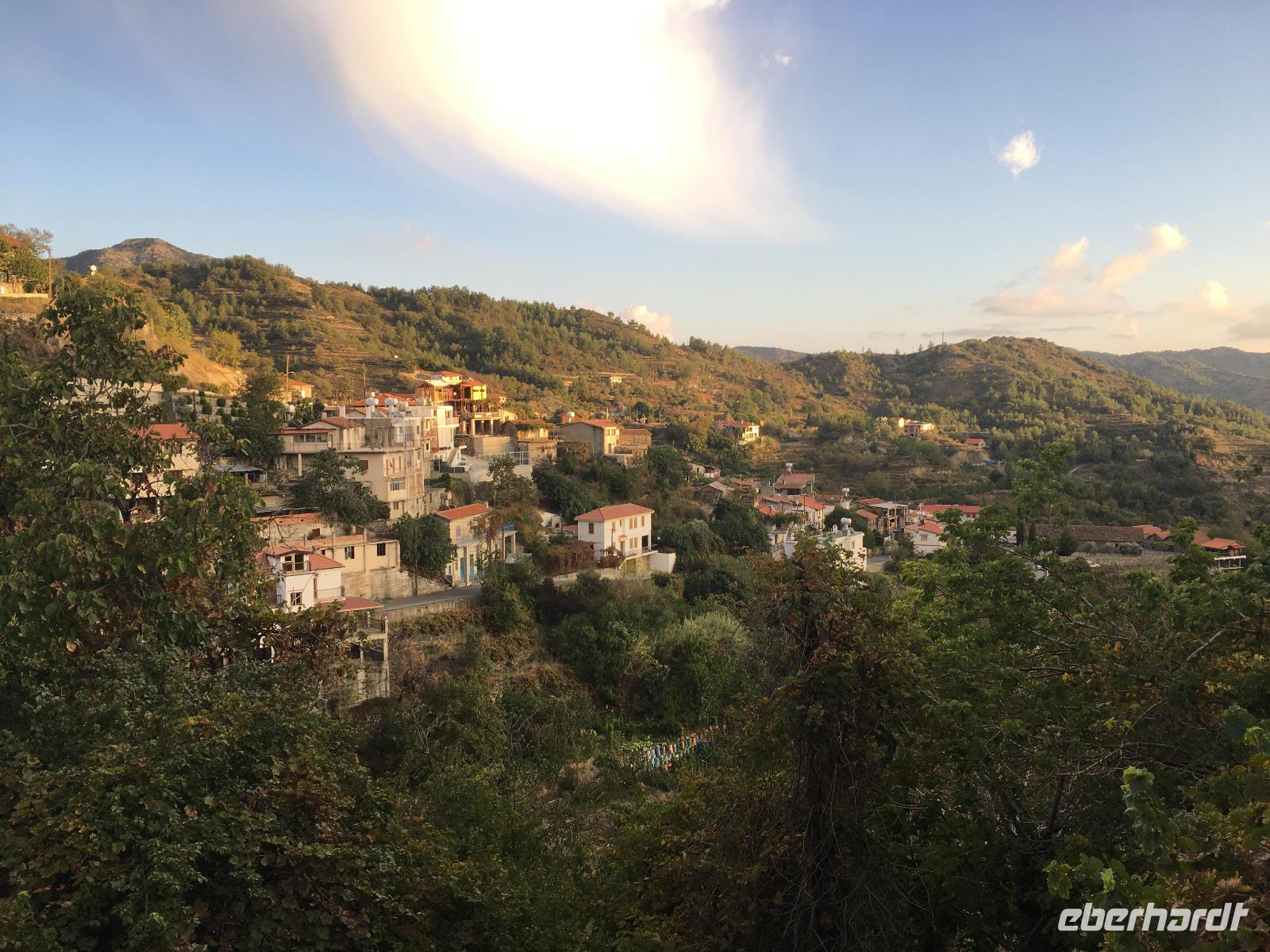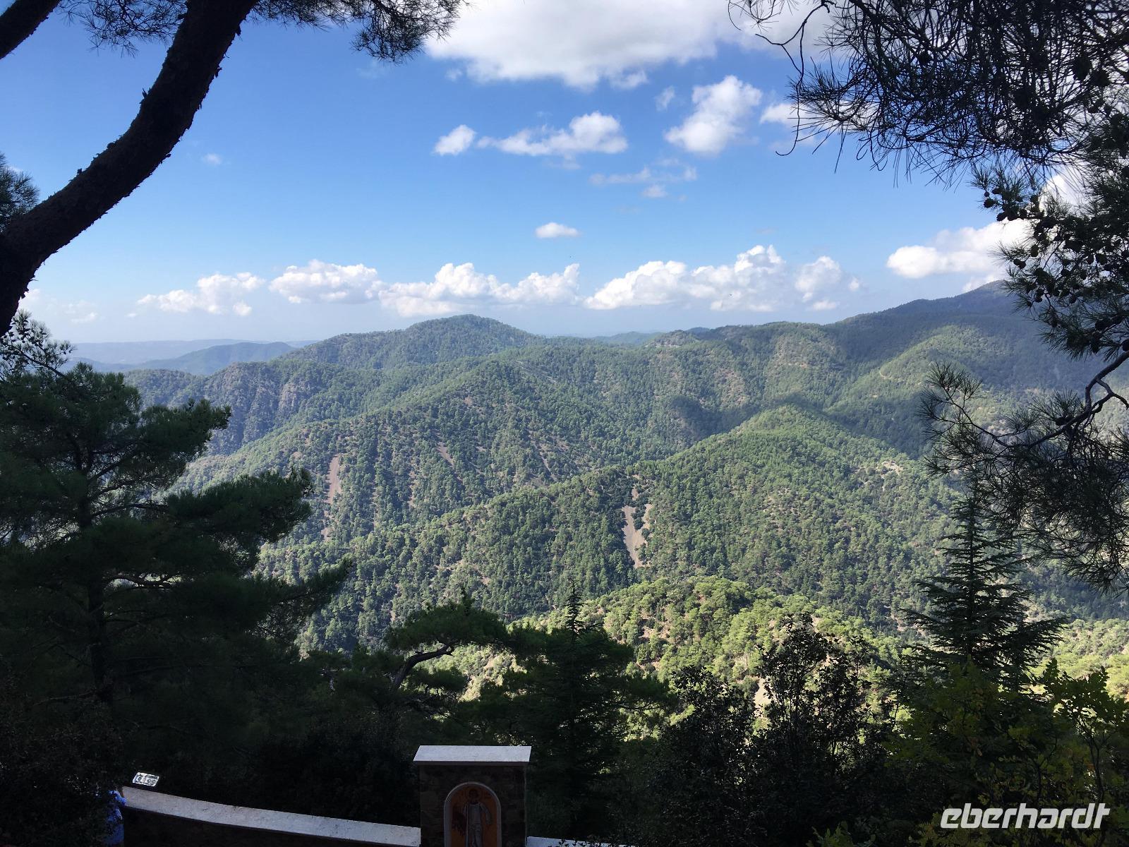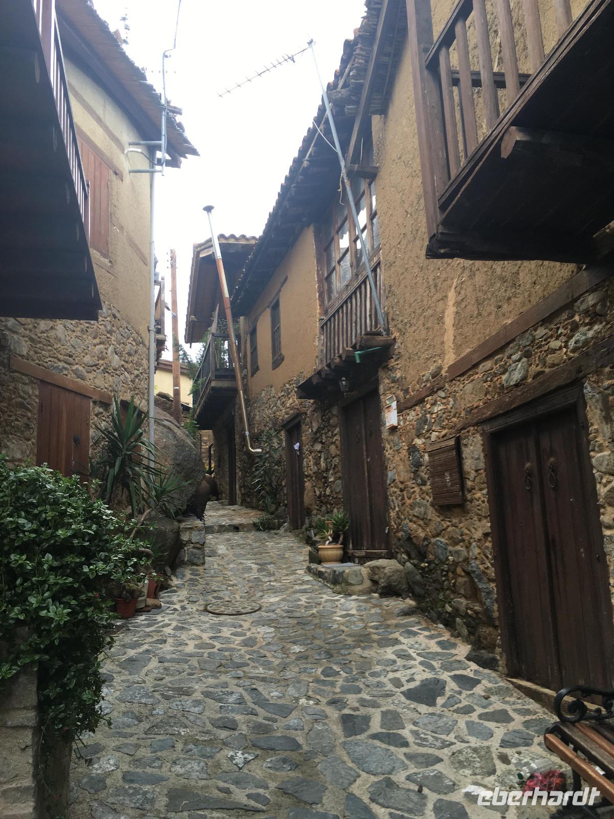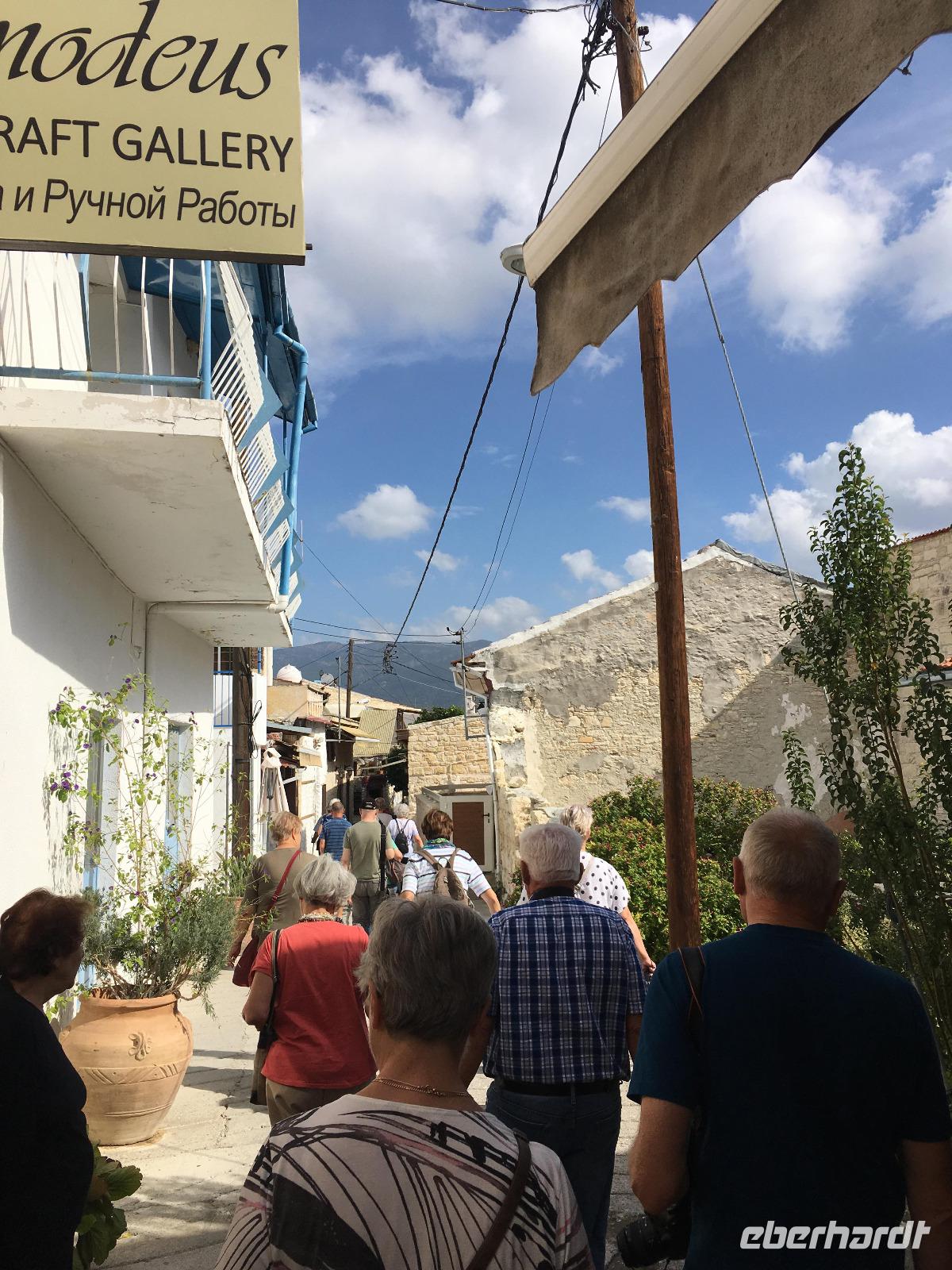 Bereits 8 Uhr trafen wir uns gemeinsam am Bus um die Fahrt in das Gebirge von Zypern zu starten. Zunächst gelangten wir in das Dorf Omodhos. Dieses lag in mitten eines Weingebietes und begeisterte durch die malerischen Gassen. Dort besuchten wir das ehemalige Kloster am Hauptplatz, namens Timios Stavros. Unweit davon entfernt befindet die sich auch noch heute genutzte Weinpresse aus dem 19. Jahrhundert. Zunächst verschafften wir uns dort einen Eindruck der Herstellung verschiedenster Weinprodukte, bevor es im Anschluss an die Dorfbesichtigung und Freizeit zu dem Weingut „Gerolemos" ging. Ein rumänischer Mitarbeiter erzählte uns bei der Verkostung 5 verschiedener Weine die unterschiedlichen Herstellungsmethoden. Am frühen Nachmittag erreichten wir unser zweites Hotel für diese Reise im Toodosgebirge. Nach einem schnellen Check in und einem Rosenwasser zur Begrüßung nutzen wir alle die Zeit bis zum Nachmittag für eine Verschnaufpause. Pünktlich 16 Uhr trafen wir uns in der Hotel Lobby um unser heutiges Programm fort zu setzen. Das Wetter war leider nicht auf unsere Seite und die dunklen Wolken zogen sich immer mehr zu. Deshalb entschieden wir uns kurzer Hand den Bus bis ins Dorf zu nehmen. Unsere Fahrer Kyriakos brachte uns direkt vor den Eingang der Süßwarenmanufaktur. Dort angekommen mussten wir einen kleinen Augenblick warten, da die zweite Eberhardt Wandergruppe vor uns war. Die Familie des Hauses begrüßte uns herzlich und führte durch die Küchen im Erdgeschoss. Natürlich durften wir im Anschluss daran die Leckereien verkosten und der ein oder andere nahm sich eine Süßigkeit für Zuhause mit. Weiter ging es zu Fuß zur Rosenmanufaktur. Auch dort wurde uns die Herstellung der verschiedenen Produkte durch einen sehr engagierten Besitzer vorgestellt. Die Frauen ließen sich von den Düften verwöhnen, während die meisten Männer vor dem Gebäude warteten. Gut duftend setzten wir unseren Spaziergang durch das Dorf Agros fort und nach ca. 20 Minuten erreichten wir die Taverne von Nikos. Bei einem leckeren Meze Essen und viel Wein ließen wir den ersten Abend im Gebirge ausklingen. Als Highlight überraschte uns Reisebegleiterin Laura für die Rückfahrt noch mit einer Fahrt in einem Oldtimer Beford Bus.