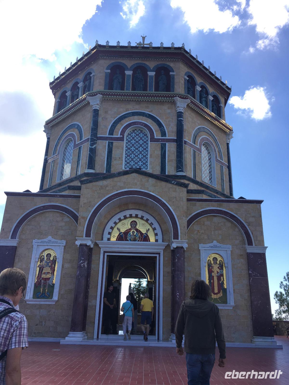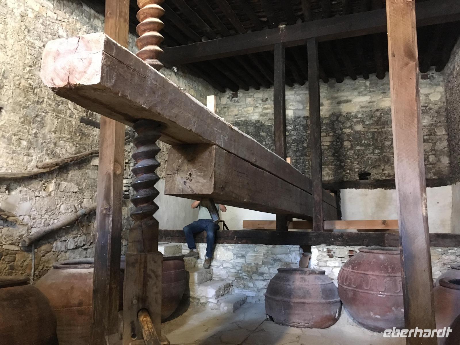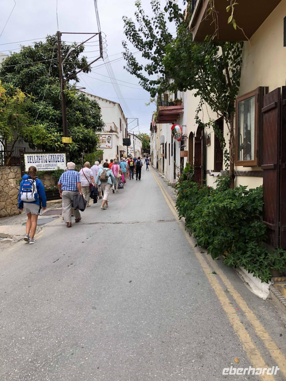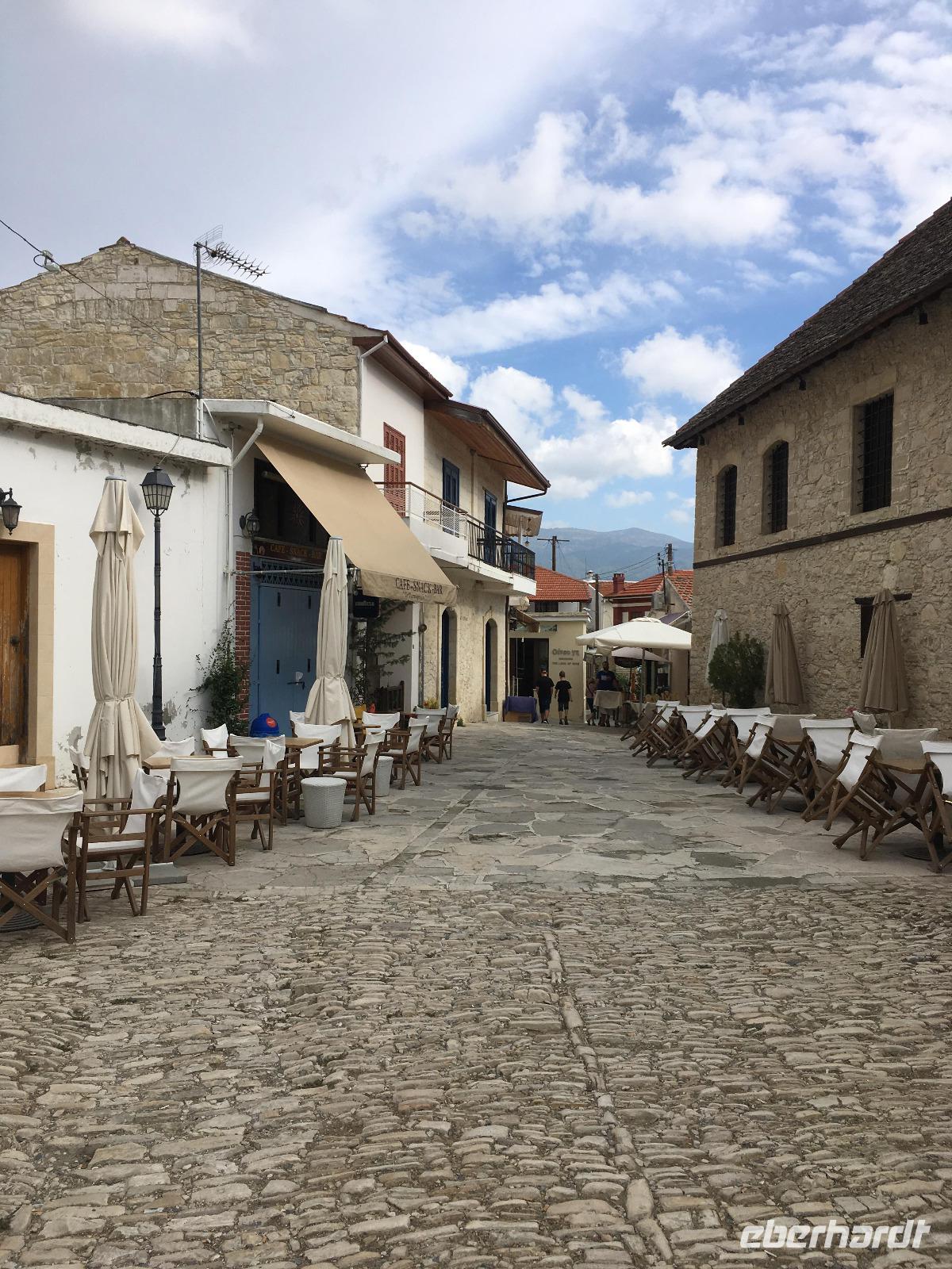 Bereits 8 Uhr trafen wir uns gemeinsam am Bus um die Fahrt in das Gebirge von Zypern zu starten. Zunächst gelangten wir in das Dorf Omodhos. Dieses lag in mitten eines Weingebietes und begeisterte durch die malerischen Gassen. Dort besuchten wir das ehemalige Kloster am Hauptplatz, namens Timios Stavros. Unweit davon entfernt befindet die sich auch noch heute genutzte Weinpresse aus dem 19. Jahrhundert. Zunächst verschafften wir uns dort einen Eindruck der Herstellung verschiedenster Weinprodukte, bevor es im Anschluss an die Dorfbesichtigung und Freizeit zu dem Weingut „Gerolemos" ging. Ein rumänischer Mitarbeiter erzählte uns bei der Verkostung 5 verschiedener Weine die unterschiedlichen Herstellungsmethoden. Am frühen Nachmittag erreichten wir unser zweites Hotel für diese Reise im Toodosgebirge. Nach einem schnellen Check in und einem Rosenwasser zur Begrüßung nutzen wir alle die Zeit bis zum Nachmittag für eine Verschnaufpause. Pünktlich 16 Uhr trafen wir uns in der Hotel Lobby um unser heutiges Programm fort zu setzen. Das Wetter war leider nicht auf unsere Seite und die dunklen Wolken zogen sich immer mehr zu. Deshalb entschieden wir uns kurzer Hand den Bus bis ins Dorf zu nehmen. Unsere Fahrer Kyriakos brachte uns direkt vor den Eingang der Süßwarenmanufaktur. Dort angekommen mussten wir einen kleinen Augenblick warten, da die zweite Eberhardt Wandergruppe vor uns war. Die Familie des Hauses begrüßte uns herzlich und führte durch die Küchen im Erdgeschoss. Natürlich durften wir im Anschluss daran die Leckereien verkosten und der ein oder andere nahm sich eine Süßigkeit für Zuhause mit. Weiter ging es zu Fuß zur Rosenmanufaktur. Auch dort wurde uns die Herstellung der verschiedenen Produkte durch einen sehr engagierten Besitzer vorgestellt. Die Frauen ließen sich von den Düften verwöhnen, während die meisten Männer vor dem Gebäude warteten. Gut duftend setzten wir unseren Spaziergang durch das Dorf Agros fort und nach ca. 20 Minuten erreichten wir die Taverne von Nikos. Bei einem leckeren Meze Essen und viel Wein ließen wir den ersten Abend im Gebirge ausklingen. Als Highlight überraschte uns Reisebegleiterin Laura für die Rückfahrt noch mit einer Fahrt in einem Oldtimer Beford Bus.