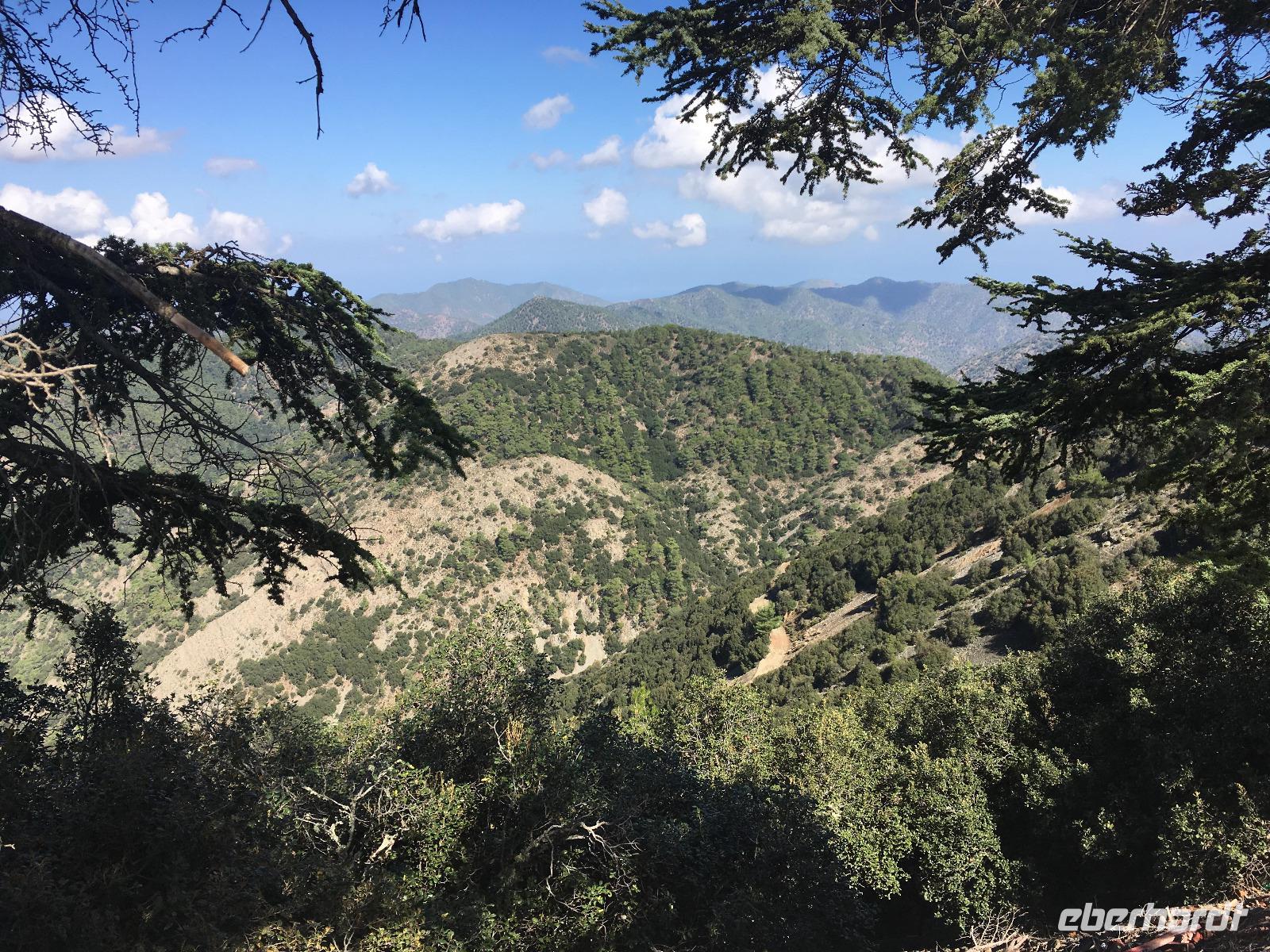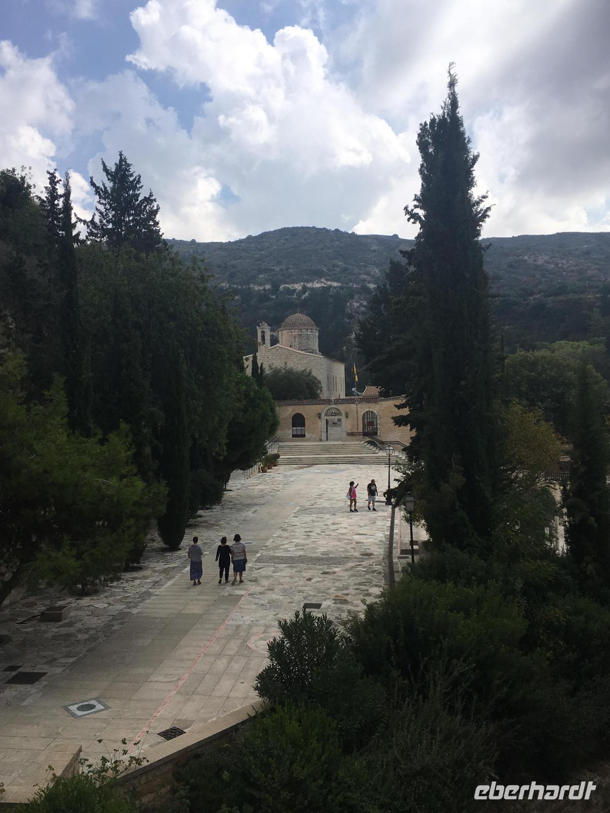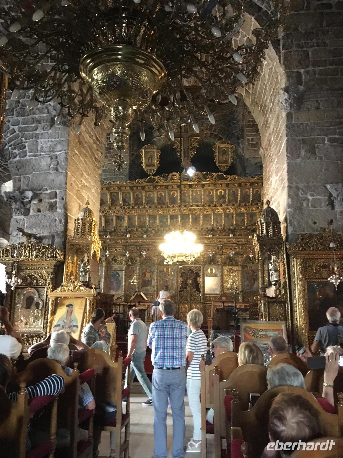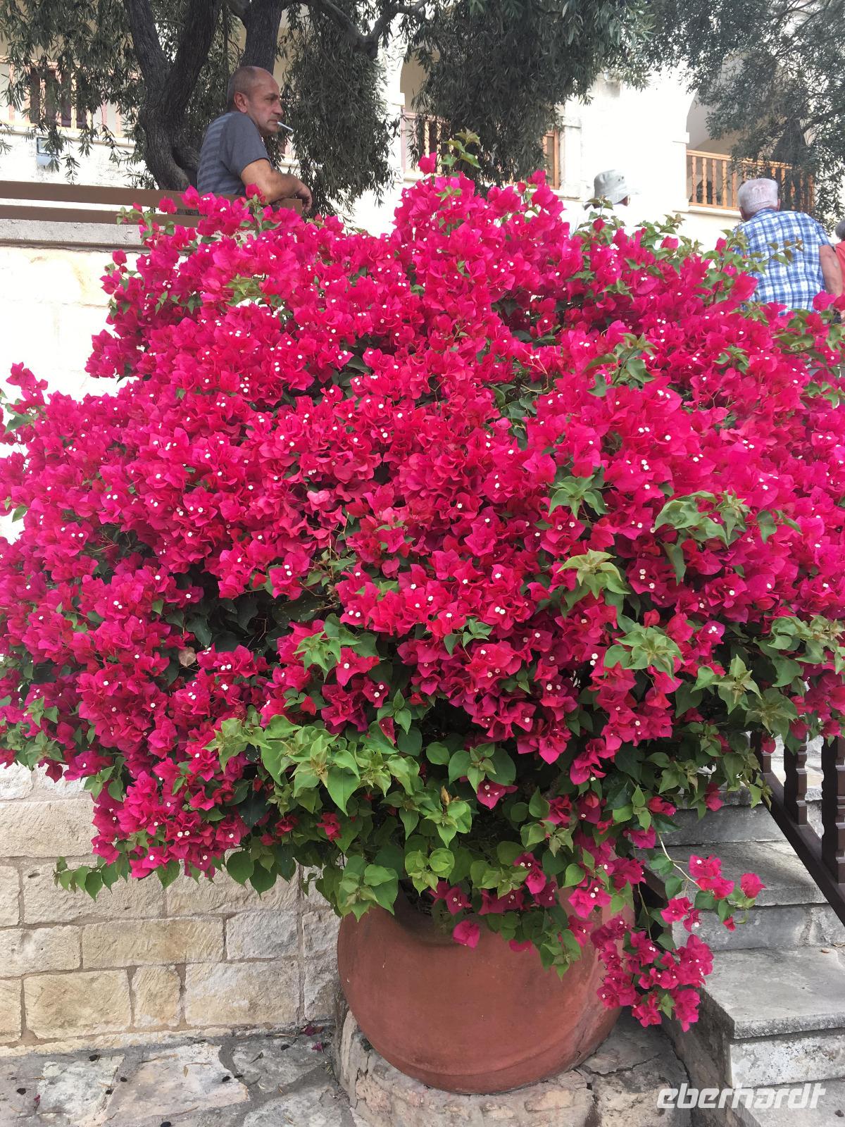 Bereits 8 Uhr trafen wir uns gemeinsam am Bus um die Fahrt in das Gebirge von Zypern zu starten. Zunächst gelangten wir in das Dorf Omodhos. Dieses lag in mitten eines Weingebietes und begeisterte durch die malerischen Gassen. Dort besuchten wir das ehemalige Kloster am Hauptplatz, namens Timios Stavros. Unweit davon entfernt befindet die sich auch noch heute genutzte Weinpresse aus dem 19. Jahrhundert. Zunächst verschafften wir uns dort einen Eindruck der Herstellung verschiedenster Weinprodukte, bevor es im Anschluss an die Dorfbesichtigung und Freizeit zu dem Weingut „Gerolemos" ging. Ein rumänischer Mitarbeiter erzählte uns bei der Verkostung 5 verschiedener Weine die unterschiedlichen Herstellungsmethoden. Am frühen Nachmittag erreichten wir unser zweites Hotel für diese Reise im Toodosgebirge. Nach einem schnellen Check in und einem Rosenwasser zur Begrüßung nutzen wir alle die Zeit bis zum Nachmittag für eine Verschnaufpause. Pünktlich 16 Uhr trafen wir uns in der Hotel Lobby um unser heutiges Programm fort zu setzen. Das Wetter war leider nicht auf unsere Seite und die dunklen Wolken zogen sich immer mehr zu. Deshalb entschieden wir uns kurzer Hand den Bus bis ins Dorf zu nehmen. Unsere Fahrer Kyriakos brachte uns direkt vor den Eingang der Süßwarenmanufaktur. Dort angekommen mussten wir einen kleinen Augenblick warten, da die zweite Eberhardt Wandergruppe vor uns war. Die Familie des Hauses begrüßte uns herzlich und führte durch die Küchen im Erdgeschoss. Natürlich durften wir im Anschluss daran die Leckereien verkosten und der ein oder andere nahm sich eine Süßigkeit für Zuhause mit. Weiter ging es zu Fuß zur Rosenmanufaktur. Auch dort wurde uns die Herstellung der verschiedenen Produkte durch einen sehr engagierten Besitzer vorgestellt. Die Frauen ließen sich von den Düften verwöhnen, während die meisten Männer vor dem Gebäude warteten. Gut duftend setzten wir unseren Spaziergang durch das Dorf Agros fort und nach ca. 20 Minuten erreichten wir die Taverne von Nikos. Bei einem leckeren Meze Essen und viel Wein ließen wir den ersten Abend im Gebirge ausklingen. Als Highlight überraschte uns Reisebegleiterin Laura für die Rückfahrt noch mit einer Fahrt in einem Oldtimer Beford Bus.