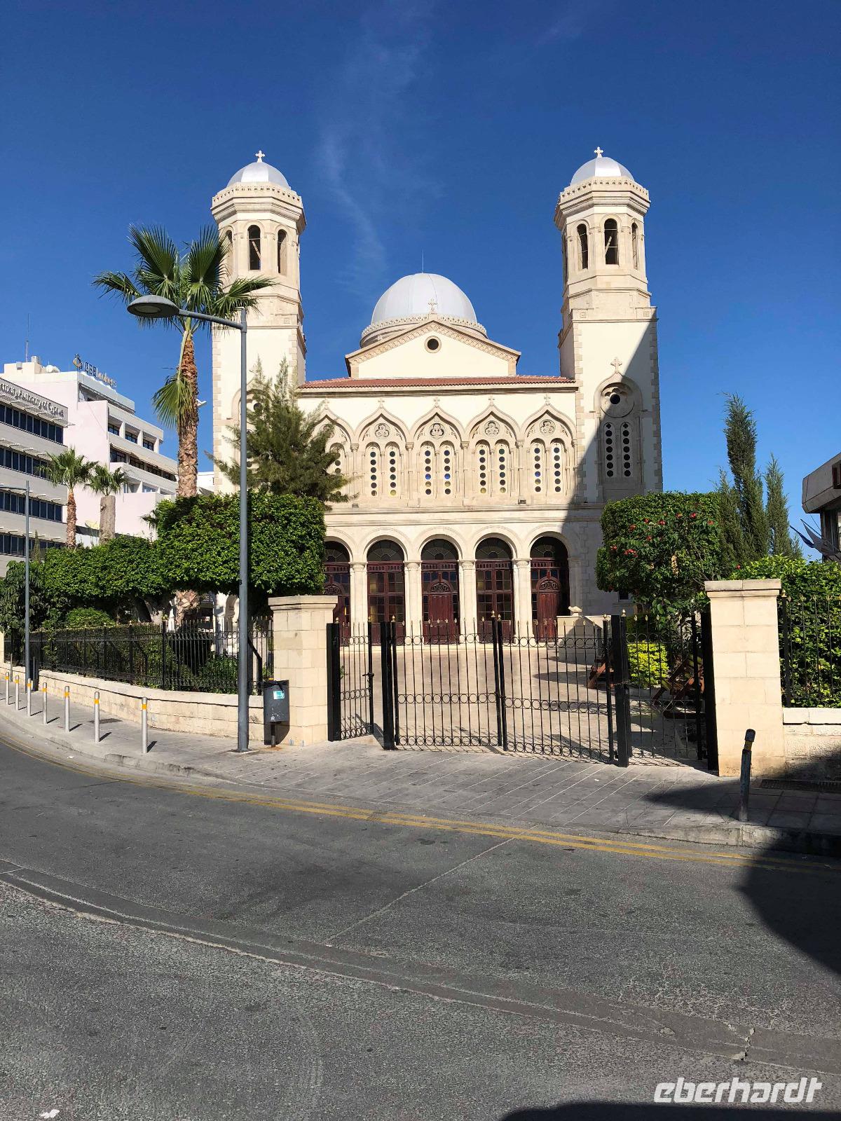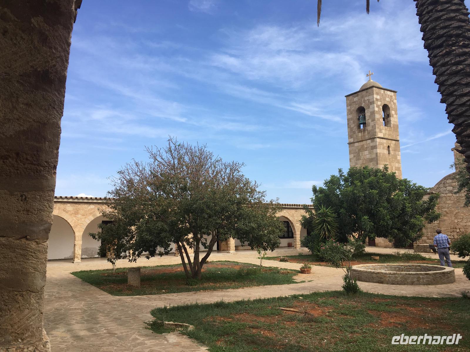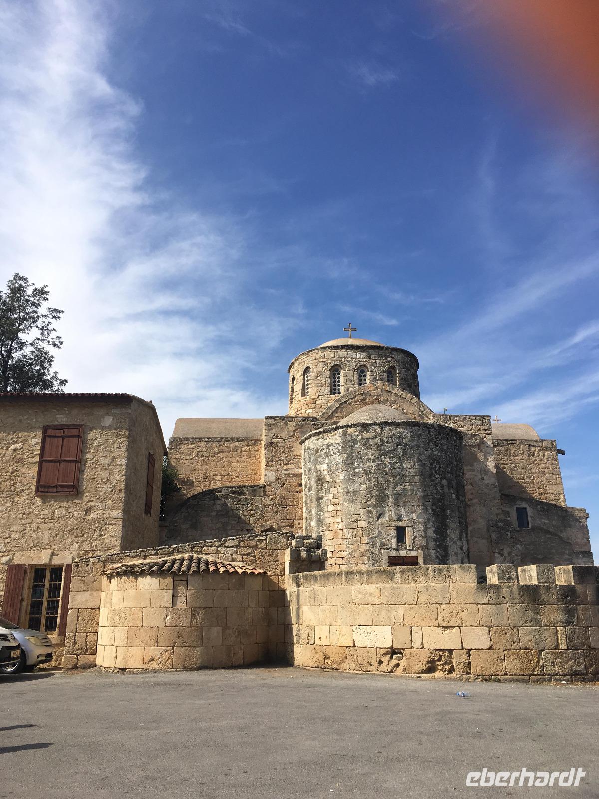 Am Morgen verabschiedeten wir uns mit gepackten Koffern von dem Troodosgebirge und fuhren noch einmal in den türkischen Teil der Insel. Der erste Stopp führte uns zum Barnabas Kloster, wo der Märtyrer Barnabas als zypriotischer Nationalheiliger verehrt wird. Der heilige Barnabas war ein Apostel der aber nicht zum inneren Kreis der zwölf Apostel Jesu gehörte. Nach einer kurzen Einführung konnten wir uns die Anlage individuell ansehen und wir setzten die Führung weiter zur Ausgrabungsstätte von Salamis. Die Ausgrabungsstätte der antiken Großstadt beeindruckte durch ein noch gut erhaltenes Amphitheater, den Bädern und dem Gymnasium. Nach den Besichtigungen in der prallen Sonne hatten wir uns eine Mittagspause redlich verdient. Laura überraschte uns von Eberhardt Travel aus mit einem zusätzlichen Mittagessen in einer Taverne mit Blick auf das Meer am Rand der der Ausgrabungsstätte. Nach der Stärkung ging es weiter nach Famagusta, zu der Mustafa Pasa-Moschee. Diese besichtigten wir sowohl von Innen, als auch von außen bevor wir individuell Zeit für eine Kaffeepause hatten. Vorbei an der Geisterstadt in der grünen Demarkationslinie ging es nun zurück nach Paphos. 140 km vor Paphos besuchten wir die Touristenstadt Larnaca mit der Lazarus-Kirche. Es handelt sich um eine griechisch-orthodoxe Kirche im byzanthinischen Stil, die dem Heiligen Lazarus von Bethanien geweiht ist, der hier 30 Jahre als Bischof wirkte. Von dort aus ging es dann ohne weiteren Halt in unser erstes Hotel Cynthiana Beach. Alle Zimmer waren bereits bezugsfertig und wir freuten uns auf ein leckeres Abendessen im Hotelrestaurant.