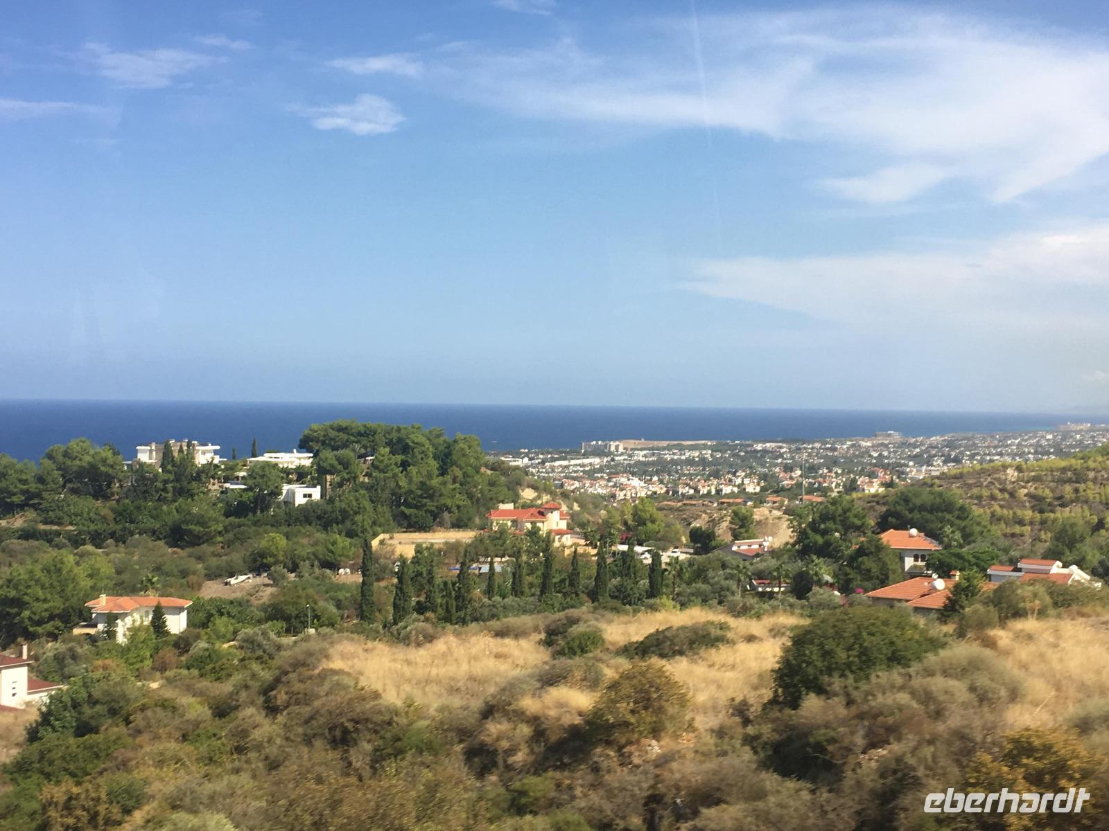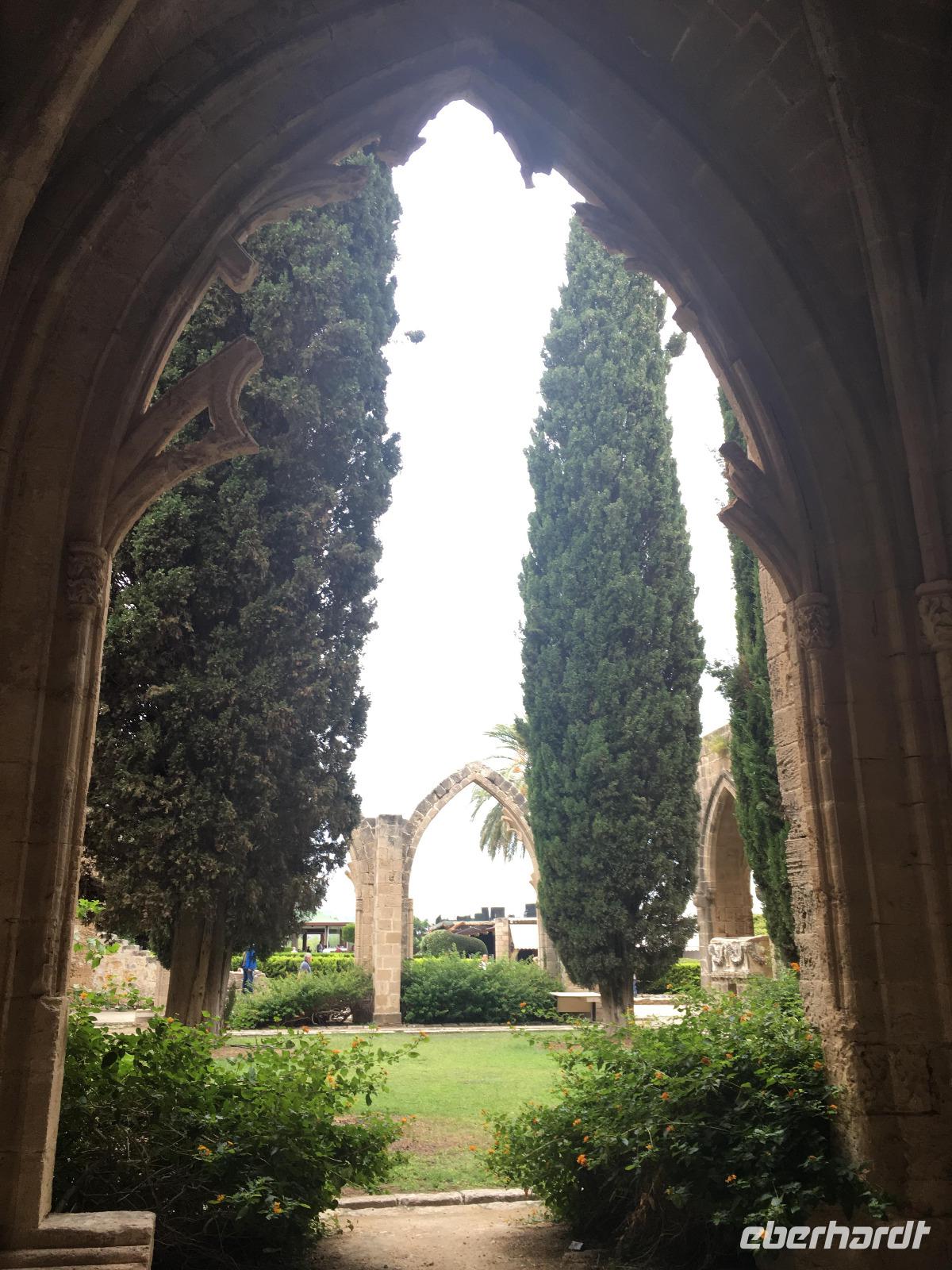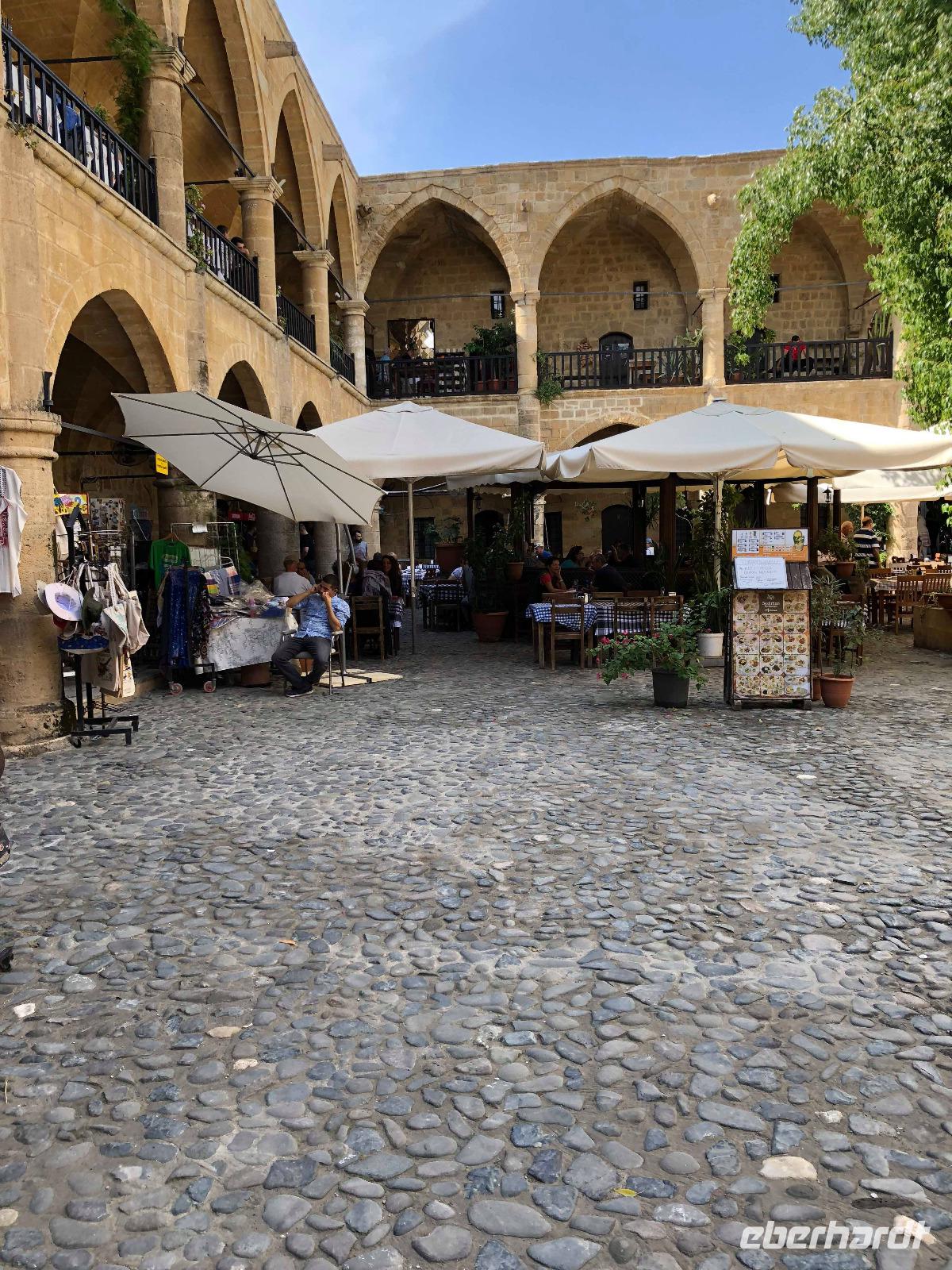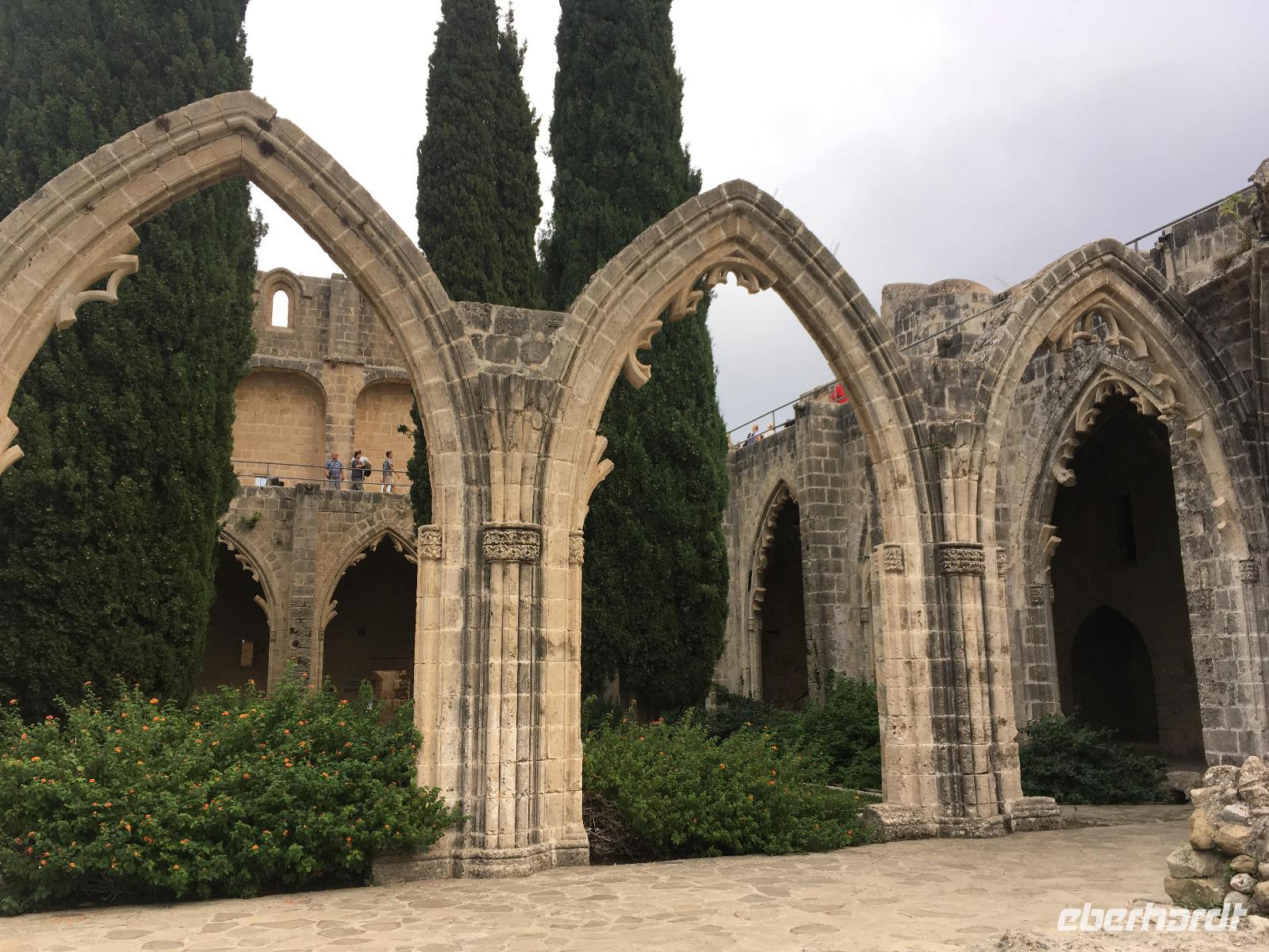 Heute stand die Erkundung des türkischen Teils der geteilten Insel im Vordergrund. Zunächst fuhren wir dafür in die Hauptstadt der Insel, nach Nikosia oder auf Griechisch auch Lefkosia genannt. Der Bus hielt an der alten venezianischen Mauer, von wo aus wir die letzten Meter in die Innenstadt zu Fuß zurücklegten. Angekommen auf der Einkaufsmeile Ledrastraße nutzen wir erst einmal die Zeit für eigene Erkundungen. Gemeinsam überquerten wir den Checkpoint um die türkische Seite der Stadt zu erreichen. Entlang der schmalen Gassen mit Verkaufsständen an jeder Ecke, besichtigten wir die ehemalige Sophien-Kathedrale. Die einstig christliche Kathedrale wird heute als Moschee genutzt. Nur zwei Straßen weiter befindet sich die alte Karawanserei Büyük Han. Sie wurde 1572 kurz nach der türkischen Eroberung Zyperns erbaut und ist wahrscheinlich das älteste türkische Bauwerk der Insel. Im Innenhof wurden uns leckere Teigtaschen gefüllt mit süßem Quark gereicht. Nach einem ca. 20 minütigen Spaziergang zum Bus fuhren wir weiter nach Kyrenia. Dort angekommen besuchten wir zunächst die Burganlage, welche von einer massiven Mauer umfasst war. Diese lag an dem kleinen malerischen Hafen der Stadt. Wir stärkten uns bei einem Mittagssnack und starten zum letzten Stopp an diesem Tag. Es ging oberhalb der Stadt zu der gotischen Klosterruine Bellapais. Die Abtei wurde um 1198 von aus Jerusalem geflüchteten Augustiner-Chorherren gegründet. Von dort genoss man einen herrlichen Blick auf die Küste, von wo man bei gutem Wetter auch einen Teil der Türkei erblicken kann. Am Abend trafen wir mit einer lautstarken Begrüßung durch eine Vielzahl an Zyprioten wieder im Hotel ein. Diese feierten eine landestypische Familienfeier. Nach dem Abendessen trafen wir uns noch einmal gemeinsam in der Hotellobby, um die Ruhe bei einem Getränk des Hauses zu genießen.