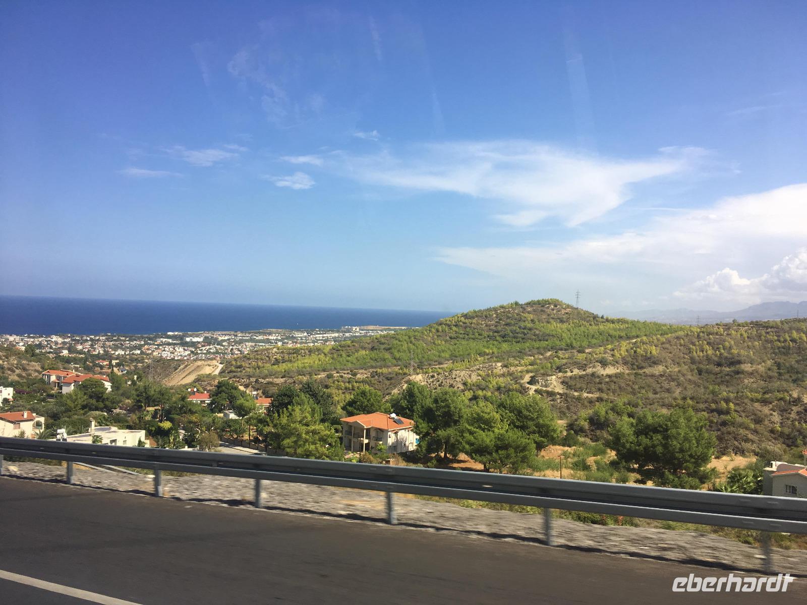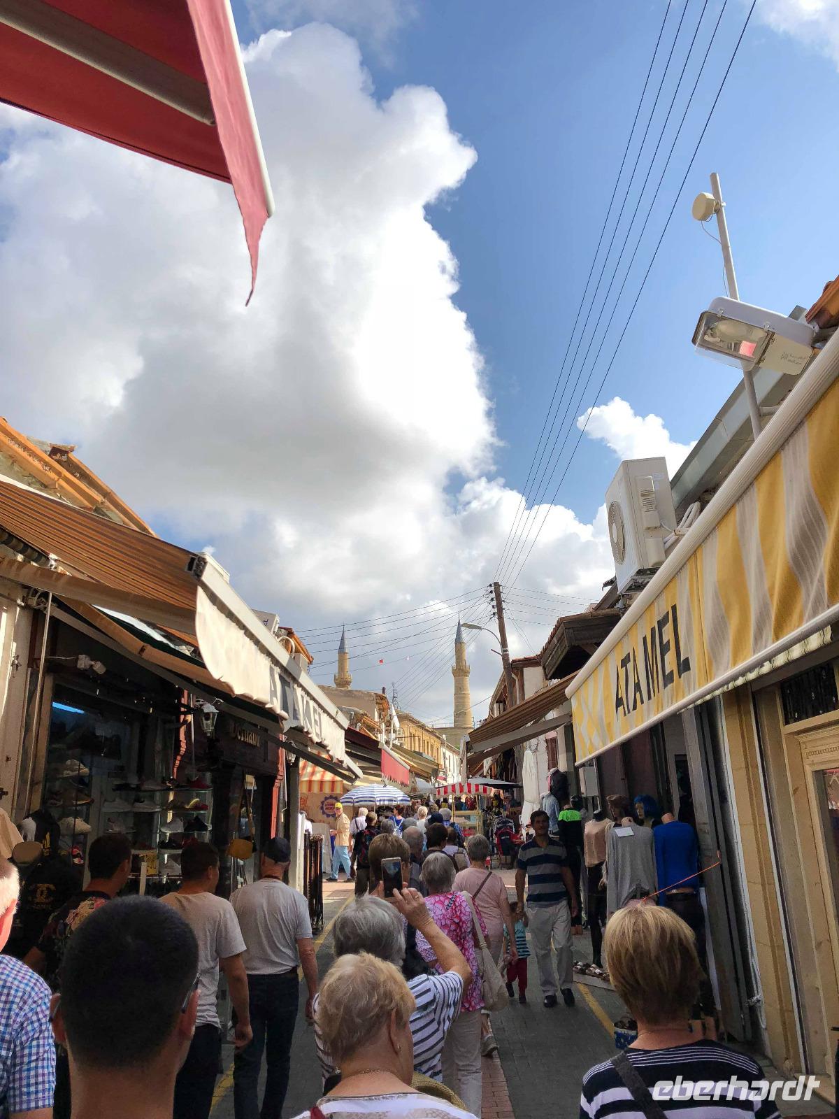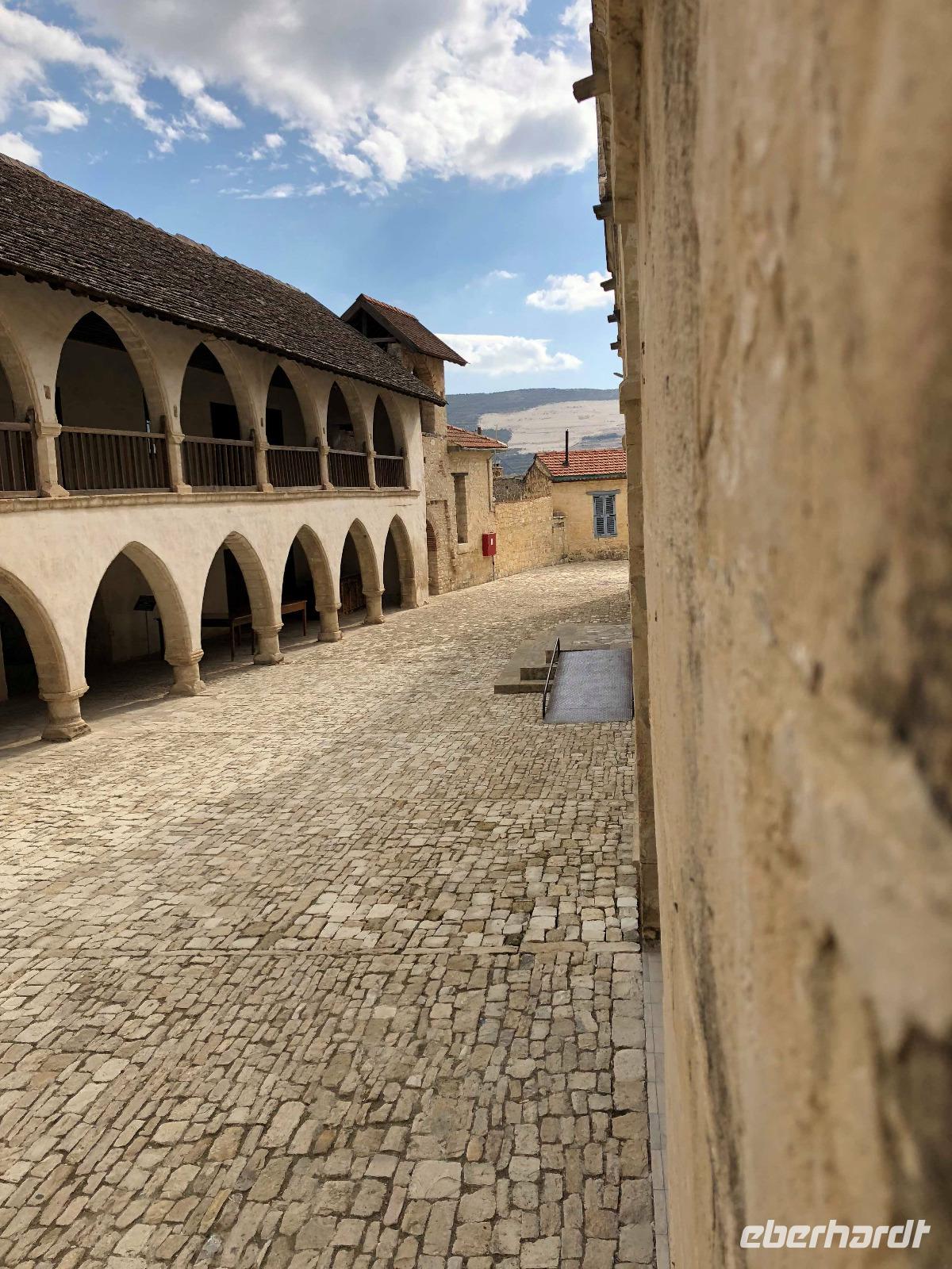 Heute stand die Erkundung des türkischen Teils der geteilten Insel im Vordergrund. Zunächst fuhren wir dafür in die Hauptstadt der Insel, nach Nikosia oder auf Griechisch auch Lefkosia genannt. Der Bus hielt an der alten venezianischen Mauer, von wo aus wir die letzten Meter in die Innenstadt zu Fuß zurücklegten. Angekommen auf der Einkaufsmeile Ledrastraße nutzen wir erst einmal die Zeit für eigene Erkundungen. Gemeinsam überquerten wir den Checkpoint um die türkische Seite der Stadt zu erreichen. Entlang der schmalen Gassen mit Verkaufsständen an jeder Ecke, besichtigten wir die ehemalige Sophien-Kathedrale. Die einstig christliche Kathedrale wird heute als Moschee genutzt. Nur zwei Straßen weiter befindet sich die alte Karawanserei Büyük Han. Sie wurde 1572 kurz nach der türkischen Eroberung Zyperns erbaut und ist wahrscheinlich das älteste türkische Bauwerk der Insel. Im Innenhof wurden uns leckere Teigtaschen gefüllt mit süßem Quark gereicht. Nach einem ca. 20 minütigen Spaziergang zum Bus fuhren wir weiter nach Kyrenia. Dort angekommen besuchten wir zunächst die Burganlage, welche von einer massiven Mauer umfasst war. Diese lag an dem kleinen malerischen Hafen der Stadt. Wir stärkten uns bei einem Mittagssnack und starten zum letzten Stopp an diesem Tag. Es ging oberhalb der Stadt zu der gotischen Klosterruine Bellapais. Die Abtei wurde um 1198 von aus Jerusalem geflüchteten Augustiner-Chorherren gegründet. Von dort genoss man einen herrlichen Blick auf die Küste, von wo man bei gutem Wetter auch einen Teil der Türkei erblicken kann. Am Abend trafen wir mit einer lautstarken Begrüßung durch eine Vielzahl an Zyprioten wieder im Hotel ein. Diese feierten eine landestypische Familienfeier. Nach dem Abendessen trafen wir uns noch einmal gemeinsam in der Hotellobby, um die Ruhe bei einem Getränk des Hauses zu genießen.