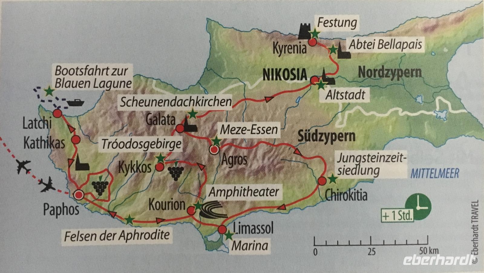 Der erste Weg führte uns heute in die Hafenstadt Latchi. Nach einer einstündigen Fahrt wechselten wir das Transportmittel. Auf einem exklusiv für uns gemieteten Schiff, schipperten wir zur Blauen Lagune. Auf dem Weg dahin genossen wir die Aussicht auf das Naturschutzgebiet Akamas und tranken das eine oder andere kalte Getränk. In dem türkisblauen Wasser konnten wir die kleinen Fische gut erkennen. Einige Gäste nutzen die Gelegenheit im 2,5 m tiefen Wasser etwas zu schwimmen, andere saßen in der Sonne. Wieder zurück im Hafen schlenderten wir noch über die kleine Promenade der Hafenstadt. Zum Mittagessen fuhren wir zu Yiannis Taverne in Kathikas und genossen unser letztes gemeinsames Meze Essen mit vielen zypriotischen Spezialitäten. Als kulturellen Abschluss besichtigten wir das, im 12. Jahrhundert gegründete Kloster des Heiligen Neophytos. Die Kammern wurden direkt in den Felsen hinein gebaut. Im Hotel zurück hieß es heute für die Hälfte der Gäste Koffer packen.