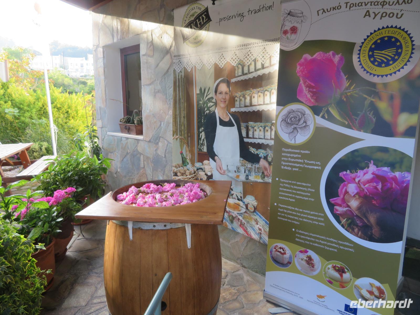 Nach einem ausgiebigen Frühstück besuchten wir drei der zahlreichen Scheunendachkirchen in der Region um das Tróodosgebirge. Die Kirche Agios Nikolaos tis Stetis wurde im 11. Jahrhundert erbaut. Wenige Minuten Busfahrt später bestaunten wir die Panagia Podithou und Panagia Theotokos (Erzengelkirche), die sich etwa 100 Meter voneinander entfernt befinden. Zum Schutz vor der Witterung und vor Zerstörung erhielten die Kirchen ein Scheunendach, ein übergestülptes Ziegeldach im Scheuenstil. Aufgrund ihrer aufwendigen Wandmalereien nahm die UNESCO die Kirchen als Teil der Weltkulturerbestätte auf. In einem kleinen idyllischen Café mit fantastischer Aussicht, aber doch noch etwas frischen Temperaturen, lud uns Antonis auf einen Mokka und einem Stück Sesamkuchen ein, eine lokale Spezialität. Gestärkt fuhren wir zum Berg Throni und bestaunten die 9 m hohe Statue des Erzbischofs Makarios III aus Zinn, die in nur 3 Teilen auf den Berg transportiert wurde. Weiter oben befinden sich, das von zypriotischen Soldaten bewachte Felsengrab und die 2014 fertig gestellte Kapelle. Am Fuße des Bergs Throni, versteckt hinter den Wäldern des Tróodos, liegt das bekannteste und reichste Kloster Zyperns, das Kýkkos Kloster. Die Klostergänge zieren zahlreiche Wandgemälde und Mosaike. Am Bus zurück, empfang uns Kyrakos mit einem Ouzo/Grappa, keiner wusste es so genau. Nach einem Spaziergang im unter Denkmalschutz stehenden Dorf Kakopetria, kehrten wir am späten Nachmittag nach Agros zurück. Wir besuchten eine kleine Süßwarenmanufaktur, wo wir einen neugierigen Blick in die Küche werfen und uns durch die selbst produzierten Leckereien, wie verschiedene kandierte Früchte, Marmeladen und Aufstriche, kosten durften. Gleich nebenan befindet sich die alte Rosenwasser-Destillerie. Zu dieser Zeit liegt in ganz Agros der betörende Rosenduft in der Luft. Zu dieser Zeit bringen die Bauern körbeweise Rosenblätter in die Fabrik, wo sie zu Duftöl und Konfitüre verarbeitet werden. Gerademal 10 Liter Duftöl entsteht aus 600.000 Rosenblüten, erzählt uns Antonis. Nach einer 15-minütgen Wanderung hinauf zu Nikos Taverne, genossen wir ein ausgiebiges Meze Abendessen. Nach reichlich zypriotischen Köstlichkeiten und vor allem Wein, fuhr uns Kyrakos wieder in unser Hotel welches im Übrigen 2.000 Kleinaktionären in Agros und Umgebung gehört.