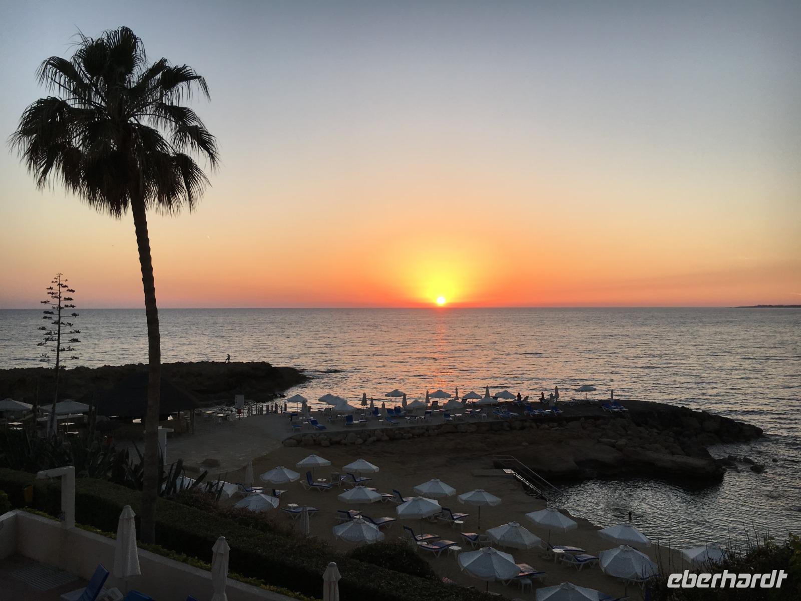 Am Morgen verließen wir mit Gepäck das Rodon Hotel und das Tróodosgebirge. Nach einer eineinhalbstündigen Fahrt gab uns Antonis auf der Ziegenfarm von Loulla einen Einblick in die Herstellung des für die Region bekannten Halloumikäses. Den gerade hergestellten Käse dürfen wir noch im warmen Zustand verkosten. Im Wohnzimmer von Loulla nahmen wir ein typisch zypriotisches Frühstück zu uns. Tomaten, Gurken, Oliven, Brot und natürlich darf der Halloumi nicht fehlen. Das Nebenprodukt Parmesankäse schmeckte ebenfalls hervorragend und erinnerte eher an Feta. Nach einem Mokka ging es dann schon weiter. In Chirokitia angekommen, bekamen wir in der Jungsteinzeitsiedlung einen Eindruck, wie die Menschen 11.000 v. Chr. lebten. Einige Gäste wagten den treppenreichen Aufstieg zum Gipfel bei 28 °C. Die Siedlung verteilte sich vom Fuße des Berges, dem Hang hinauf bis auf den Gipfel. Antonis erklärte uns sehr anschaulich, wie die Menschen in der Jungsteinzeit lebten. Kyrakos empfang uns am Bus mit frischen saftigen Mispeln. Die Fahrt ging weiter nach Limassol, der zweitgrößten Stadt auf Zypern. Wir spazierten bis in die Altstadt, wo wir zahlreiche leerstehende Gebäude vorfanden. Antonis erzählte uns wie belebt und überfüllt die Innenstadt von Limassol einst war. Davon blieb nicht sehr viel übrig, doch langsam kehrt das Leben in die Stadt zurück. Unser Bus wartet bereits. Nach einer kurzen Fahrt direkt an der Küste entlang stiegen wir am Hafen aus. Hier reiht sich eine Yacht an die andere, eine größer als die andere. Es scheint, als ob sich hier ganz Limassol zu einem Kaffee, Eis oder zum Flanieren trifft. Dem taten wir es gleich. Von hier aus war es dann auch nicht mehr weit zum Plateu von Kourion, einer beeindruckenden archäologische Ausgrabungsstätte. Etwa 18:00 erreichten wir nun das Cynthiana Beach Hotel. Alle Gäste begutachteten ihre Zimmer und waren von dem Meerblick und der hervorragenden Aussicht auf Paphos begeistert. Wir beendeten den Tag mit dem reichhaltigen Abendessen vom Buffet und einem Sonnenuntergang wie auf einer Postkarte.