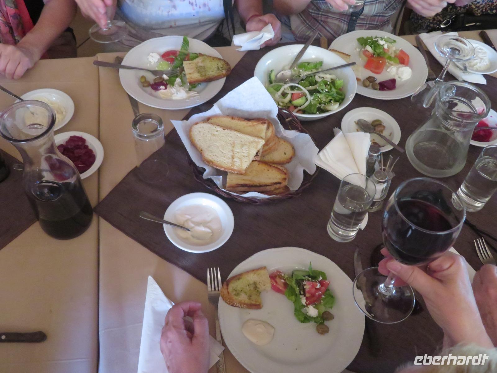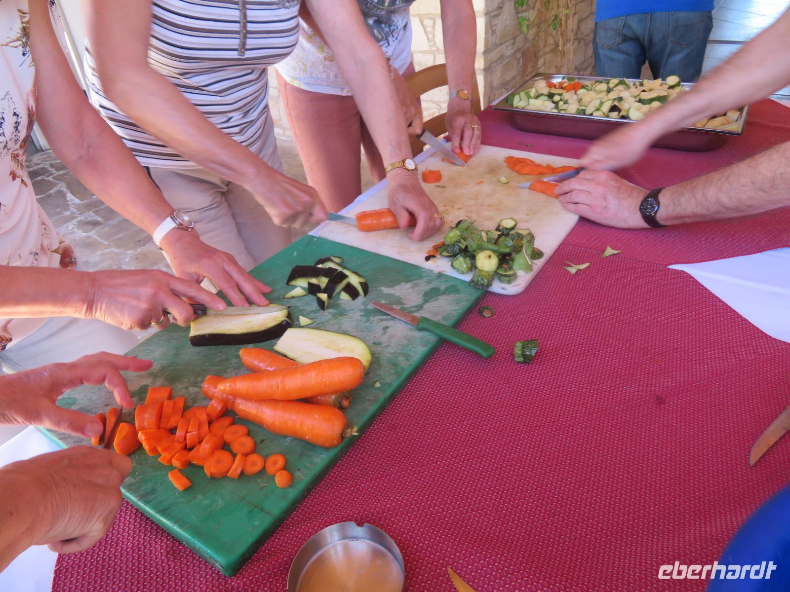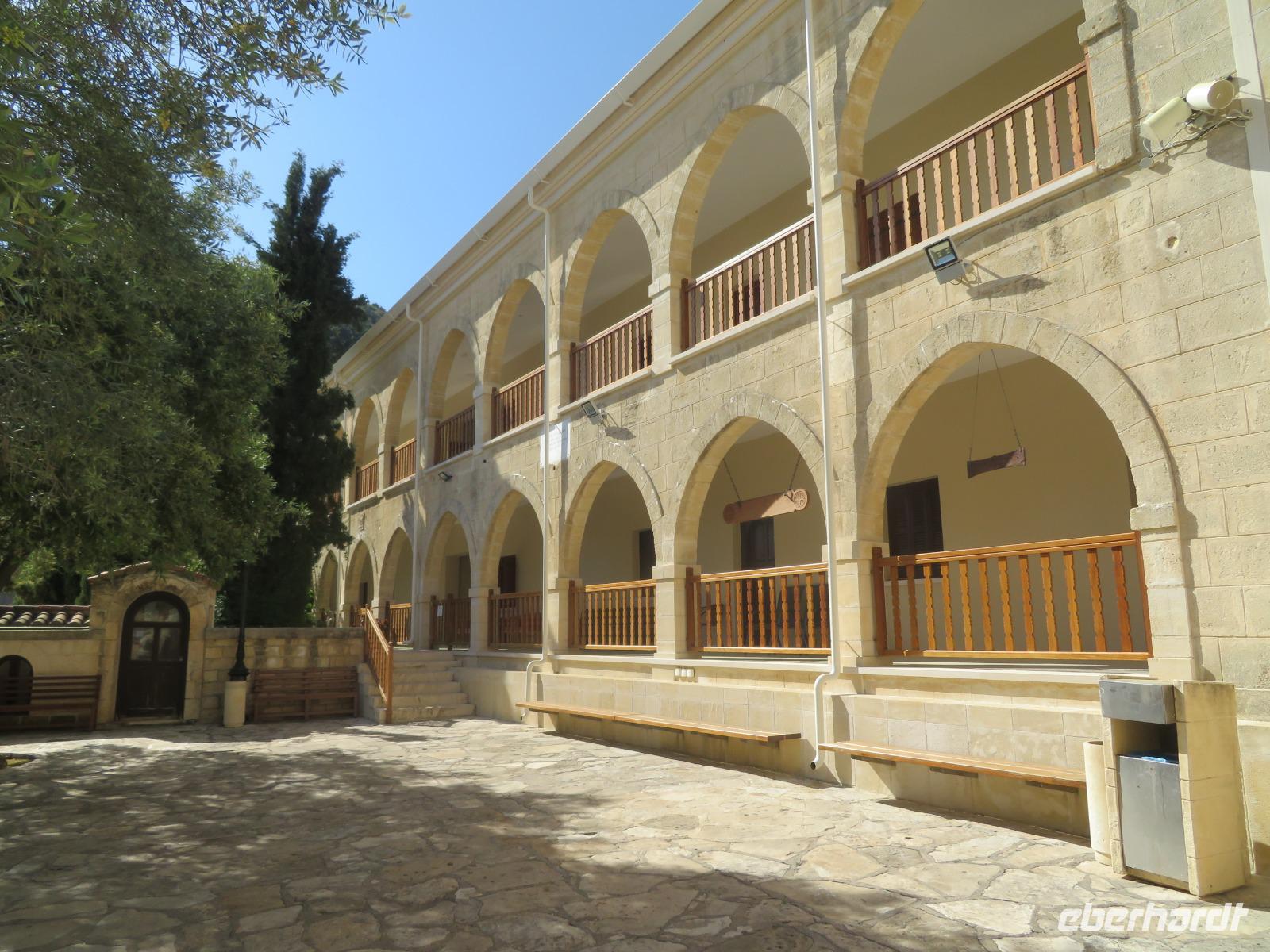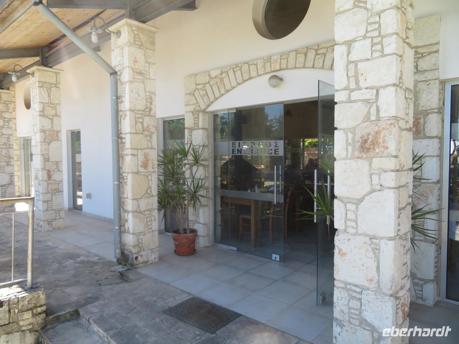 Unser Mittagessen sollten wir heute selbst zubereiten. Kyrakos brachte uns in eine kleine Taverne in das nahegelegene Bergdorf Pano Panagia. Dort angekommen, ging die Arbeit gleich los, alles in kleine mundgerechte Stücke schneiden. Wir kosteten die bechamel-ähnliche Sauce, die zur Zubereitung von Makaronia tou Fournou benötigt wird. Der Küchenchef stapelte Speisen in einen Lehmofen auf der Terrasse der Taverne zum Garen. Das dauert allerdings einige Stunden. Mit dem Bus fuhren wir zu einer familiengeführten Weinkellerei. Antonis wies uns in die Geheimnisse der Weinherstellung ein und führte uns durch den riesigen Weinkeller des Familienbetriebs. Pavlos, einer der beiden Söhne der Familie, schenkte uns einen nach den anderen seiner besten zypriotischen Weine zum Verkosten ein. Anschließend besichtigten wir das Geburtshaus des im Jahre 1913 geborenen Makarios III und das dazugehörige Museum. Auf Zypern wird Makarios III, Erzbischof und erster Staatspräsident, als Volksheld verehrt und gefeiert. Das Kloster Chrysorrogiatissa liegt nur wenige Minuten entfernt, inmitten der Weinberge umgeben von Kirsch- und Apfelbaumhaine. Bevor wir uns auf den Weg machten, stießen wir gemeinsam auf unser heutiges Geburtstagskind an und sangen gemeinsam ein kleines Ständchen. In der Taverne zurück, war für uns bereits der Tisch gedeckt. Wir ließen es uns bei Wein und Zitronenlimonade schmecken. Gegen 16:00 erreichten wir heute das Hotel und die Gäste nutzten die freie Zeit um die Gegend zu erkunden, im Meer zu schwimmen oder um an der Beach Bar ein kaltes Getränk am rauschenden Meer zu genießen.