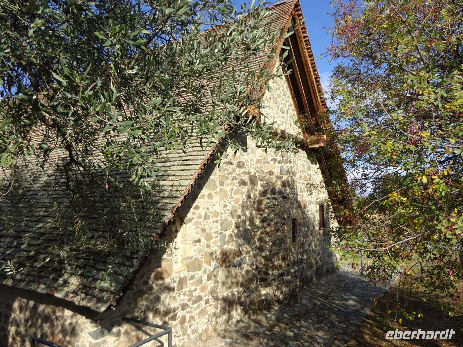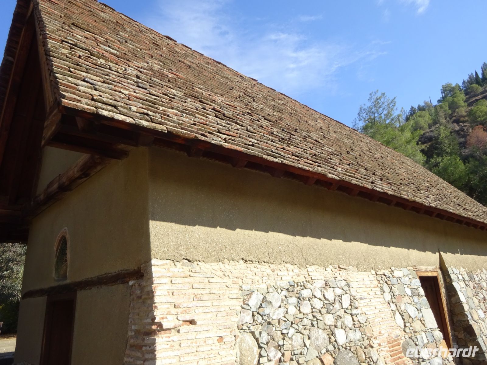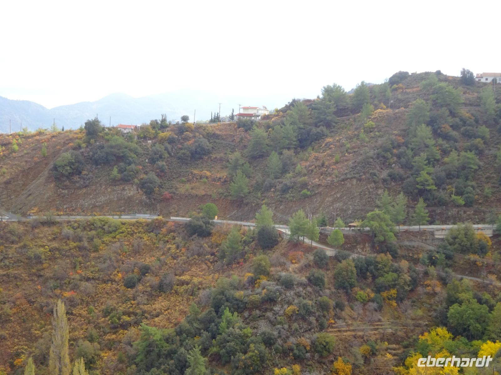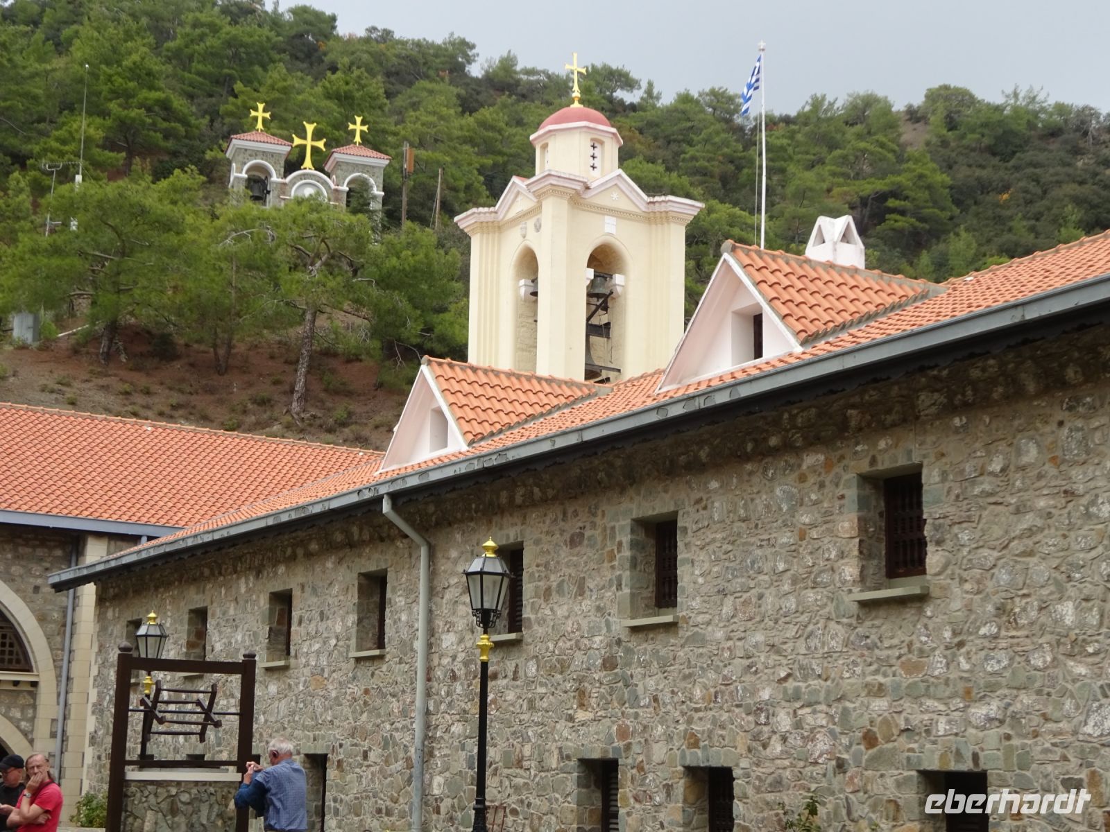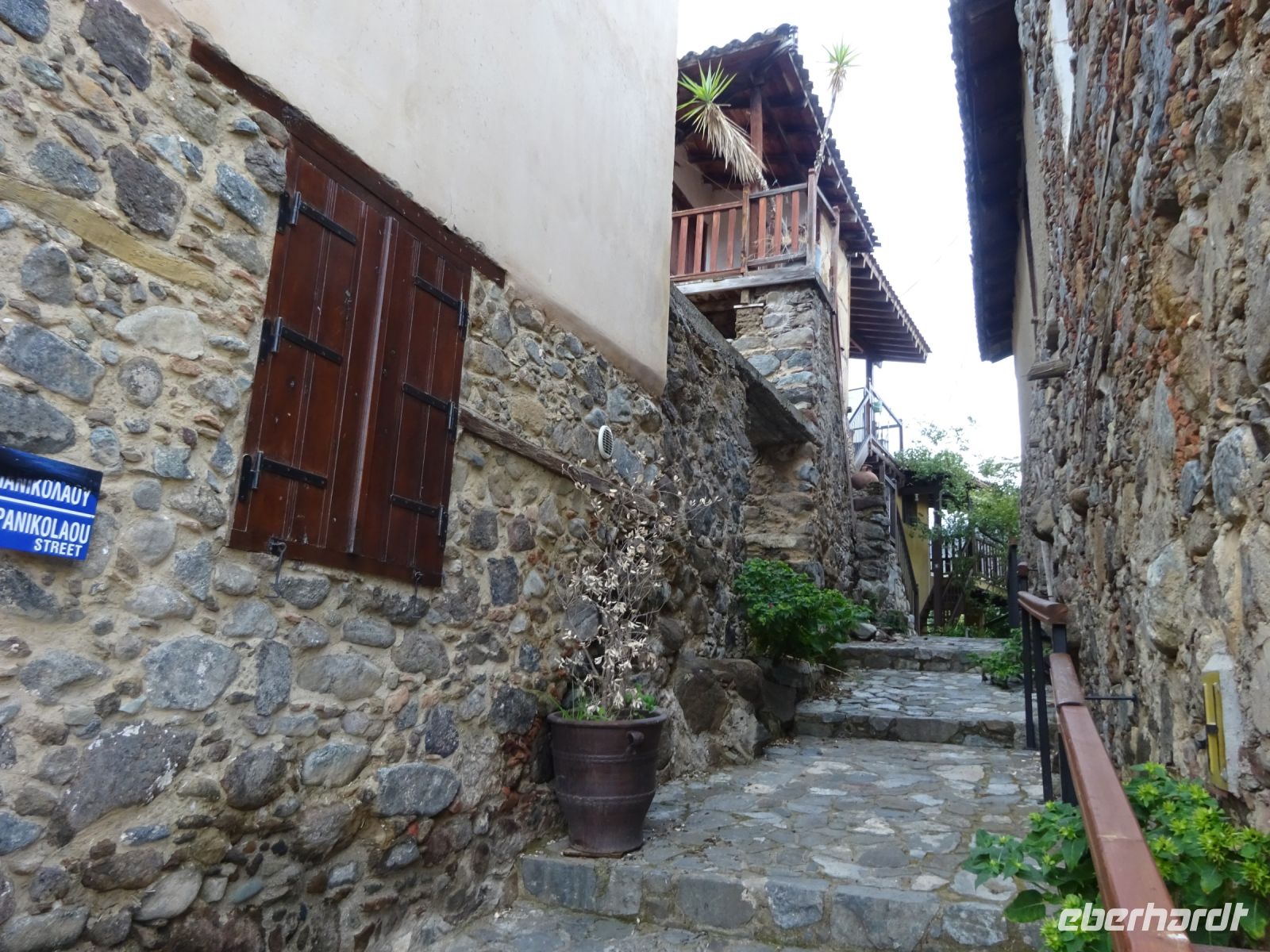 Heute lernen wir nun einige Sehenswürdigkeiten im Troodosgebirge kennen. Erster Programmpunkt sind zwei Scheunendachkirchen nahe beim Dorf Galata. Beide, die Panagia tis Podithou und die Kirche des Erzengel Michael gehören zum UNESCO-Weltkulturerbe. Äußerlich erinnern diese Kirchen eher an Scheunen, woher sie auch ihren Namen haben, im Inneren kann man sehr gut erhaltene Wandmalereien bewundern. Weiter fuhren wir durch das herrliche Troodosgebirge, auch durch kleine Bergdörfer, die uns Anlass waren, über die Landflucht zu sprechen, die auch hier ein Thema ist. Antonis machte uns unterwegs auf eine alte Kupfermine aufmerksam, die seit über 4.000 Jahren existiert. Nach einer Kaffeepause im nächsten Ort, ging es weiter hinauf. Unser Ziel war das Grab von Erzbischof Makarios auf Throni oberhalb des Kykkos-Klosters, das wir anschließend besuchen werden. Unterwegs erfuhren wir mehr über das Leben und Wirken von Makarios, dem wichtigen und bekannten Staatsmann Zyperns. Mit dem Bus fuhren wir anschließend das kurze Stück hinunter bis zum Kykkos-Kloster, das als eines der mächtigsten Klöster Zyperns gilt. Es wurde im 11. Jahrhundert gegründet. Die Wände der Gänge sind voller Darstellungen aus dem Alten und dem Neuen Testament. In der Kirche des Klosters sahen wir das berühmte Marienbild, im Museum dann die reiche Sammlung an wertvollen Reliquienschreinen. Bevor wir unsere Tour fortsetzten, gönnten wir uns in der Nähe des Klosters eine kleine Erfrischungspause, stöberten ein wenig in den Souvenirläden, genossen die herrlich frische Bergluft. Auf einem anderen Weg ging es dann hinunter. Die Straßen mit den vielen Serpentinen sind eine echte Herausforderung, aber unser Busfahrer Dimos meisterte die Strecke mit Bravour. Nun wollten wir noch auf einen kleinen Spaziergang durch das Dorf Kakopetria gehen, in dessen historischem Ortskern viele Gebäude unter Denkmalschutz stehen. Sie wurden denkmalgerecht saniert, auch mit staatlicher Unterstützung, und erwarten nun Feriengäste. Wieder hatten wir einen Tag voller unvergesslicher Erlebnisse. Zum Abendessen gingen wir in eine Taverne ganz in der Nähe unseres Hotels. Nach so vielen Eindrücken dieses Tages ließen wir uns die zypriotischen Köstlichkeiten ordentlich schmecken: Salat als Vorspeise, als Hauptgericht Mousaka. Ein feines Dessert schloss diese schöne Mahlzeit ab.
