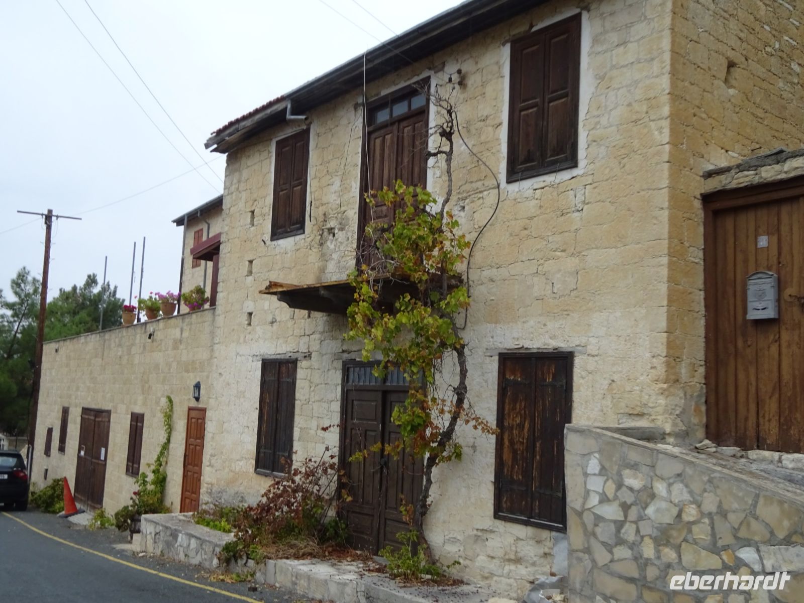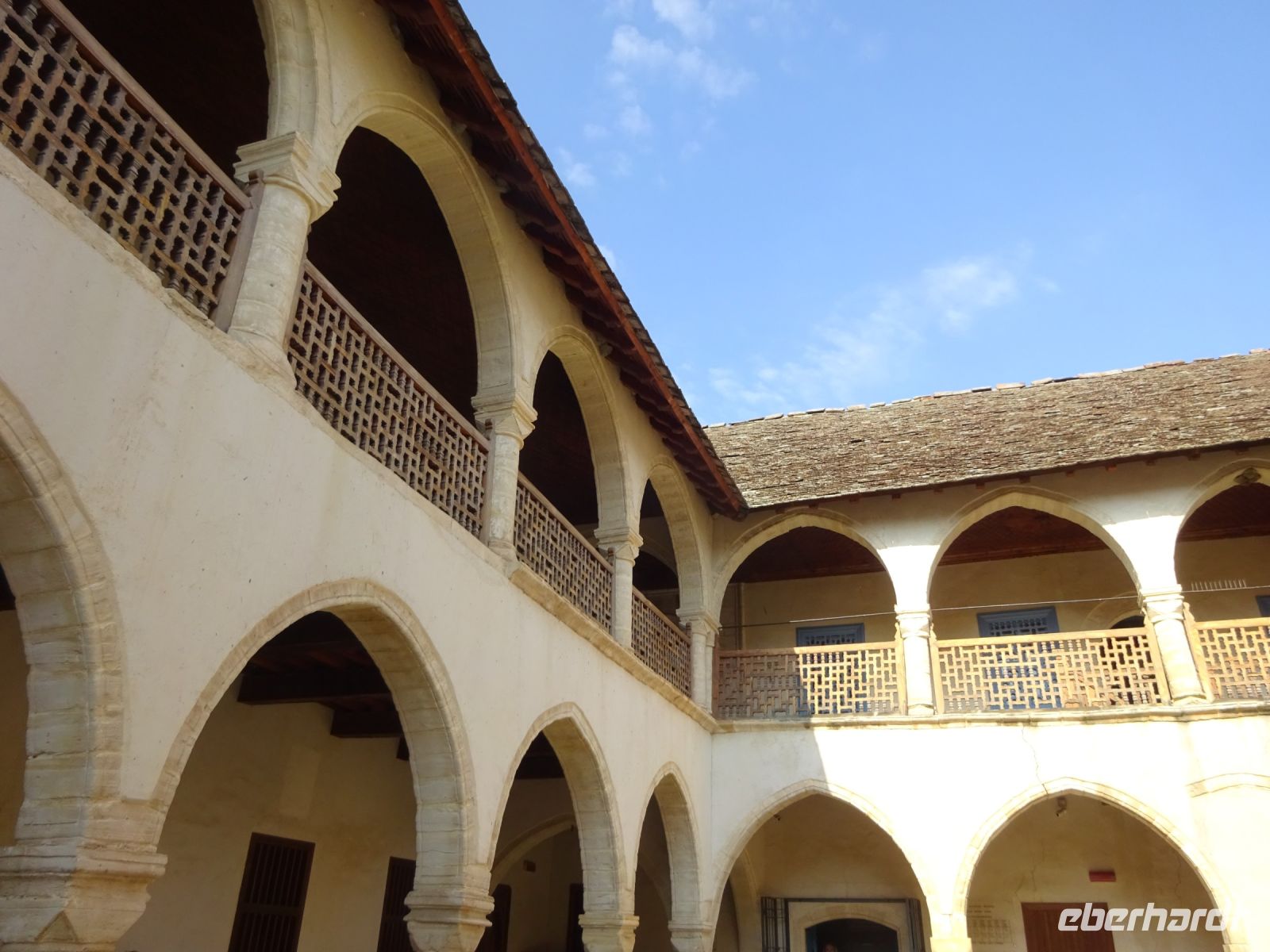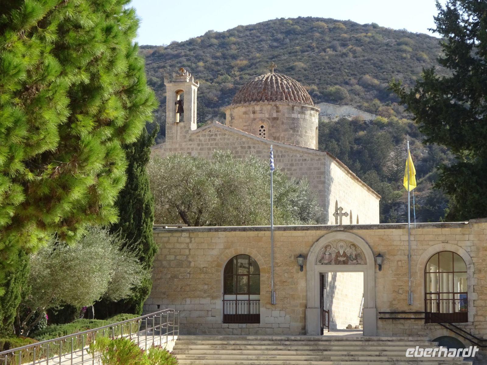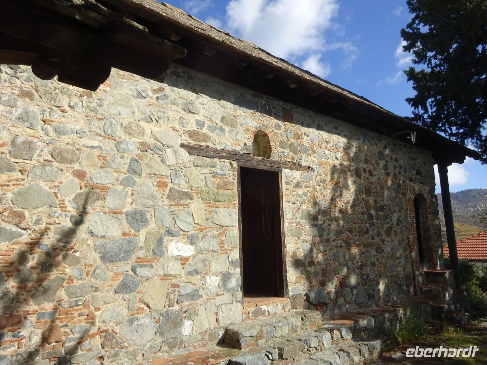 Heute lernen wir nun einige Sehenswürdigkeiten im Troodosgebirge kennen. Erster Programmpunkt sind zwei Scheunendachkirchen nahe beim Dorf Galata. Beide, die Panagia tis Podithou und die Kirche des Erzengel Michael gehören zum UNESCO-Weltkulturerbe. Äußerlich erinnern diese Kirchen eher an Scheunen, woher sie auch ihren Namen haben, im Inneren kann man sehr gut erhaltene Wandmalereien bewundern. Weiter fuhren wir durch das herrliche Troodosgebirge, auch durch kleine Bergdörfer, die uns Anlass waren, über die Landflucht zu sprechen, die auch hier ein Thema ist. Antonis machte uns unterwegs auf eine alte Kupfermine aufmerksam, die seit über 4.000 Jahren existiert. Nach einer Kaffeepause im nächsten Ort, ging es weiter hinauf. Unser Ziel war das Grab von Erzbischof Makarios auf Throni oberhalb des Kykkos-Klosters, das wir anschließend besuchen werden. Unterwegs erfuhren wir mehr über das Leben und Wirken von Makarios, dem wichtigen und bekannten Staatsmann Zyperns. Mit dem Bus fuhren wir anschließend das kurze Stück hinunter bis zum Kykkos-Kloster, das als eines der mächtigsten Klöster Zyperns gilt. Es wurde im 11. Jahrhundert gegründet. Die Wände der Gänge sind voller Darstellungen aus dem Alten und dem Neuen Testament. In der Kirche des Klosters sahen wir das berühmte Marienbild, im Museum dann die reiche Sammlung an wertvollen Reliquienschreinen. Bevor wir unsere Tour fortsetzten, gönnten wir uns in der Nähe des Klosters eine kleine Erfrischungspause, stöberten ein wenig in den Souvenirläden, genossen die herrlich frische Bergluft. Auf einem anderen Weg ging es dann hinunter. Die Straßen mit den vielen Serpentinen sind eine echte Herausforderung, aber unser Busfahrer Dimos meisterte die Strecke mit Bravour. Nun wollten wir noch auf einen kleinen Spaziergang durch das Dorf Kakopetria gehen, in dessen historischem Ortskern viele Gebäude unter Denkmalschutz stehen. Sie wurden denkmalgerecht saniert, auch mit staatlicher Unterstützung, und erwarten nun Feriengäste. Wieder hatten wir einen Tag voller unvergesslicher Erlebnisse. Zum Abendessen gingen wir in eine Taverne ganz in der Nähe unseres Hotels. Nach so vielen Eindrücken dieses Tages ließen wir uns die zypriotischen Köstlichkeiten ordentlich schmecken: Salat als Vorspeise, als Hauptgericht Mousaka. Ein feines Dessert schloss diese schöne Mahlzeit ab.