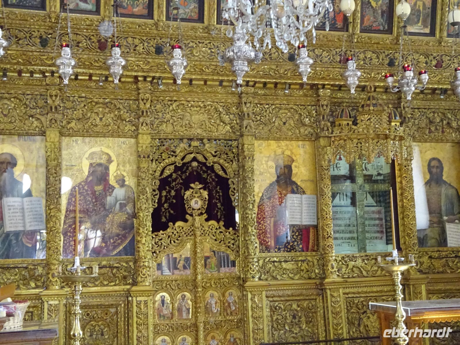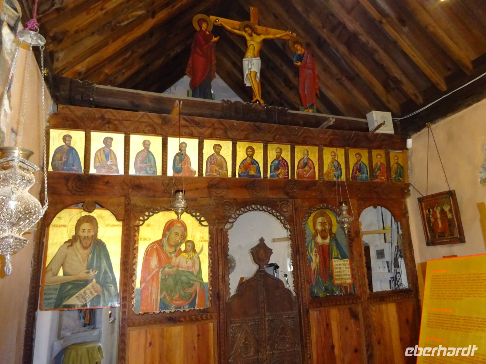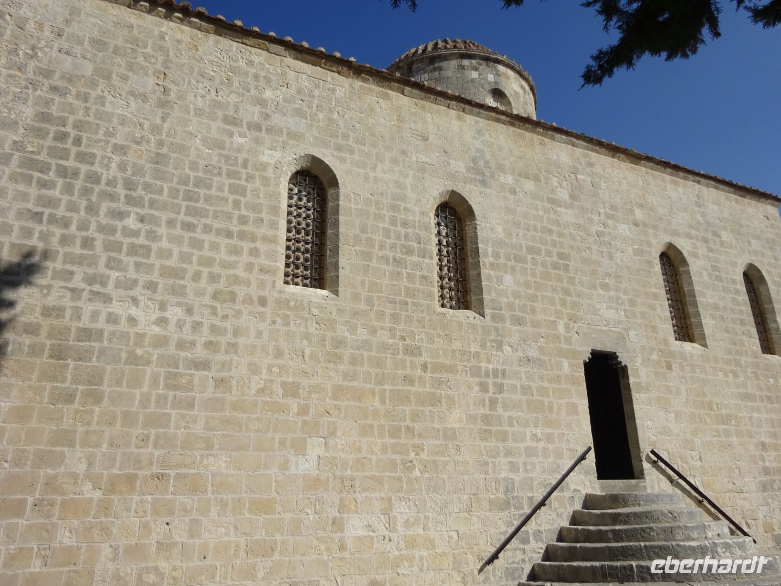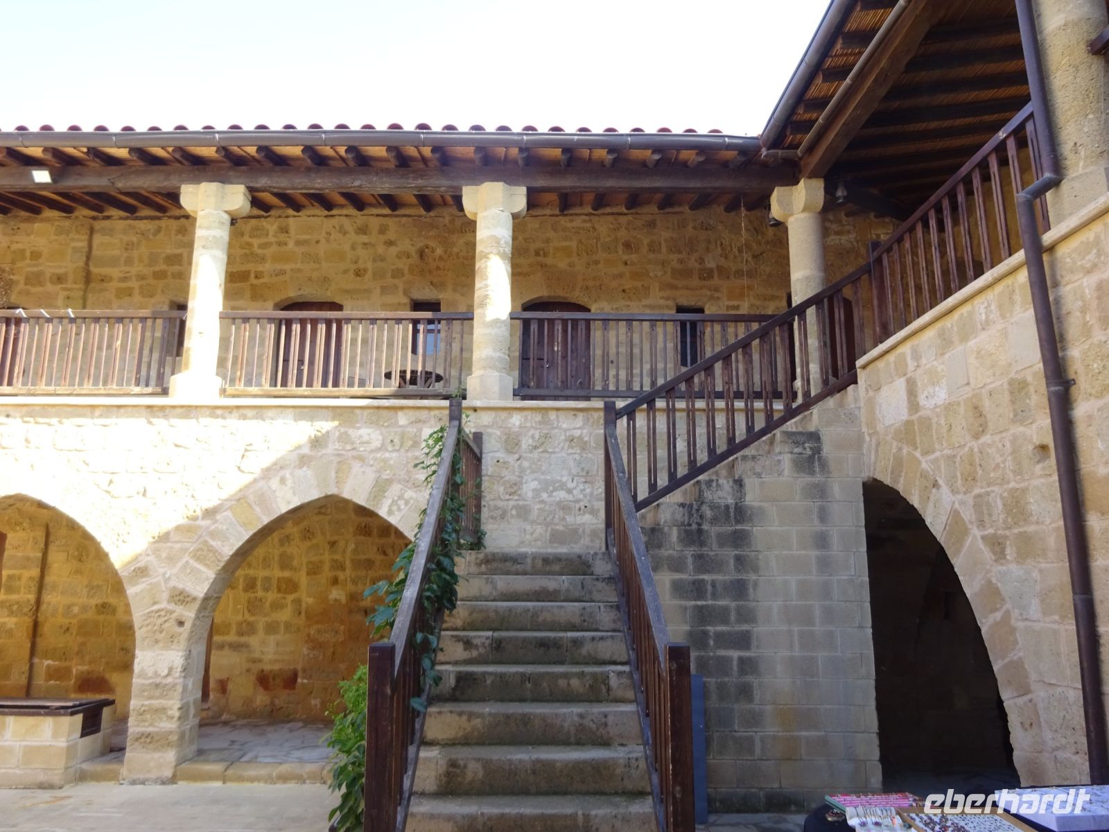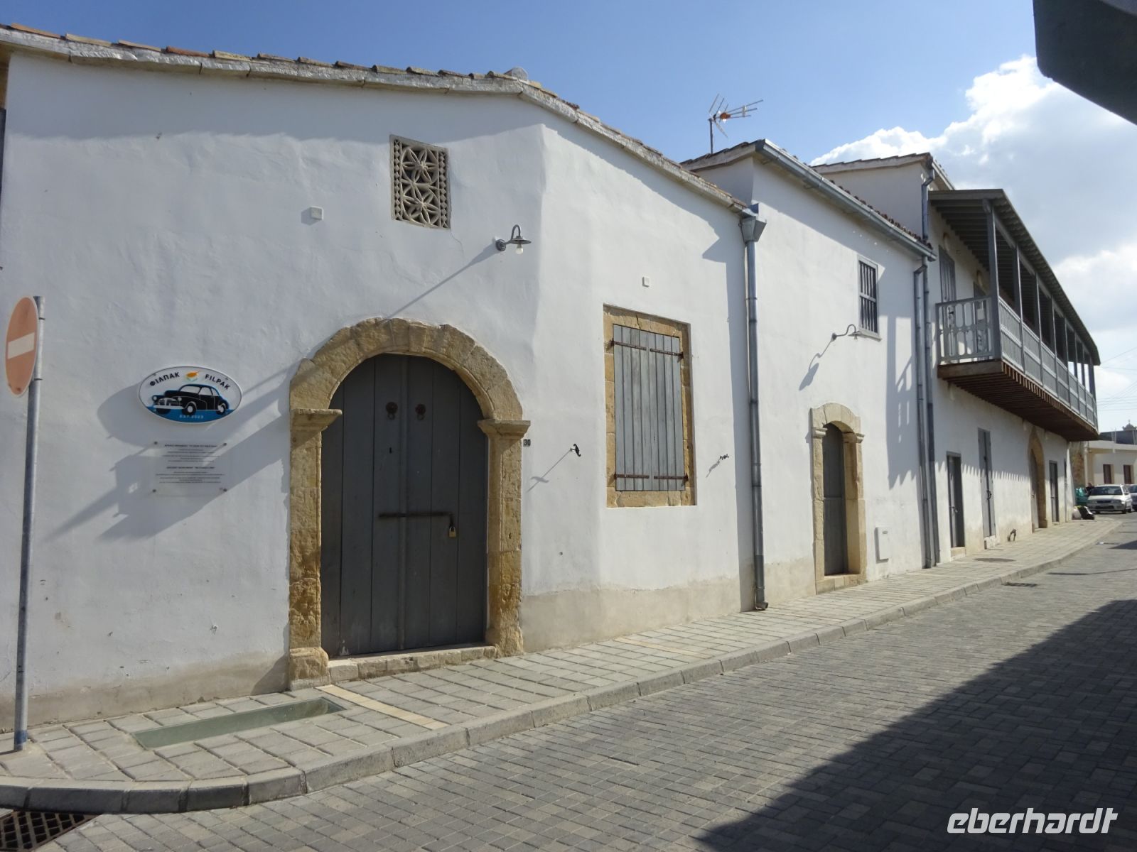 Heute lernen wir nun einige Sehenswürdigkeiten im Troodosgebirge kennen. Erster Programmpunkt sind zwei Scheunendachkirchen nahe beim Dorf Galata. Beide, die Panagia tis Podithou und die Kirche des Erzengel Michael gehören zum UNESCO-Weltkulturerbe. Äußerlich erinnern diese Kirchen eher an Scheunen, woher sie auch ihren Namen haben, im Inneren kann man sehr gut erhaltene Wandmalereien bewundern. Weiter fuhren wir durch das herrliche Troodosgebirge, auch durch kleine Bergdörfer, die uns Anlass waren, über die Landflucht zu sprechen, die auch hier ein Thema ist. Antonis machte uns unterwegs auf eine alte Kupfermine aufmerksam, die seit über 4.000 Jahren existiert. Nach einer Kaffeepause im nächsten Ort, ging es weiter hinauf. Unser Ziel war das Grab von Erzbischof Makarios auf Throni oberhalb des Kykkos-Klosters, das wir anschließend besuchen werden. Unterwegs erfuhren wir mehr über das Leben und Wirken von Makarios, dem wichtigen und bekannten Staatsmann Zyperns. Mit dem Bus fuhren wir anschließend das kurze Stück hinunter bis zum Kykkos-Kloster, das als eines der mächtigsten Klöster Zyperns gilt. Es wurde im 11. Jahrhundert gegründet. Die Wände der Gänge sind voller Darstellungen aus dem Alten und dem Neuen Testament. In der Kirche des Klosters sahen wir das berühmte Marienbild, im Museum dann die reiche Sammlung an wertvollen Reliquienschreinen. Bevor wir unsere Tour fortsetzten, gönnten wir uns in der Nähe des Klosters eine kleine Erfrischungspause, stöberten ein wenig in den Souvenirläden, genossen die herrlich frische Bergluft. Auf einem anderen Weg ging es dann hinunter. Die Straßen mit den vielen Serpentinen sind eine echte Herausforderung, aber unser Busfahrer Dimos meisterte die Strecke mit Bravour. Nun wollten wir noch auf einen kleinen Spaziergang durch das Dorf Kakopetria gehen, in dessen historischem Ortskern viele Gebäude unter Denkmalschutz stehen. Sie wurden denkmalgerecht saniert, auch mit staatlicher Unterstützung, und erwarten nun Feriengäste. Wieder hatten wir einen Tag voller unvergesslicher Erlebnisse. Zum Abendessen gingen wir in eine Taverne ganz in der Nähe unseres Hotels. Nach so vielen Eindrücken dieses Tages ließen wir uns die zypriotischen Köstlichkeiten ordentlich schmecken: Salat als Vorspeise, als Hauptgericht Mousaka. Ein feines Dessert schloss diese schöne Mahlzeit ab.
