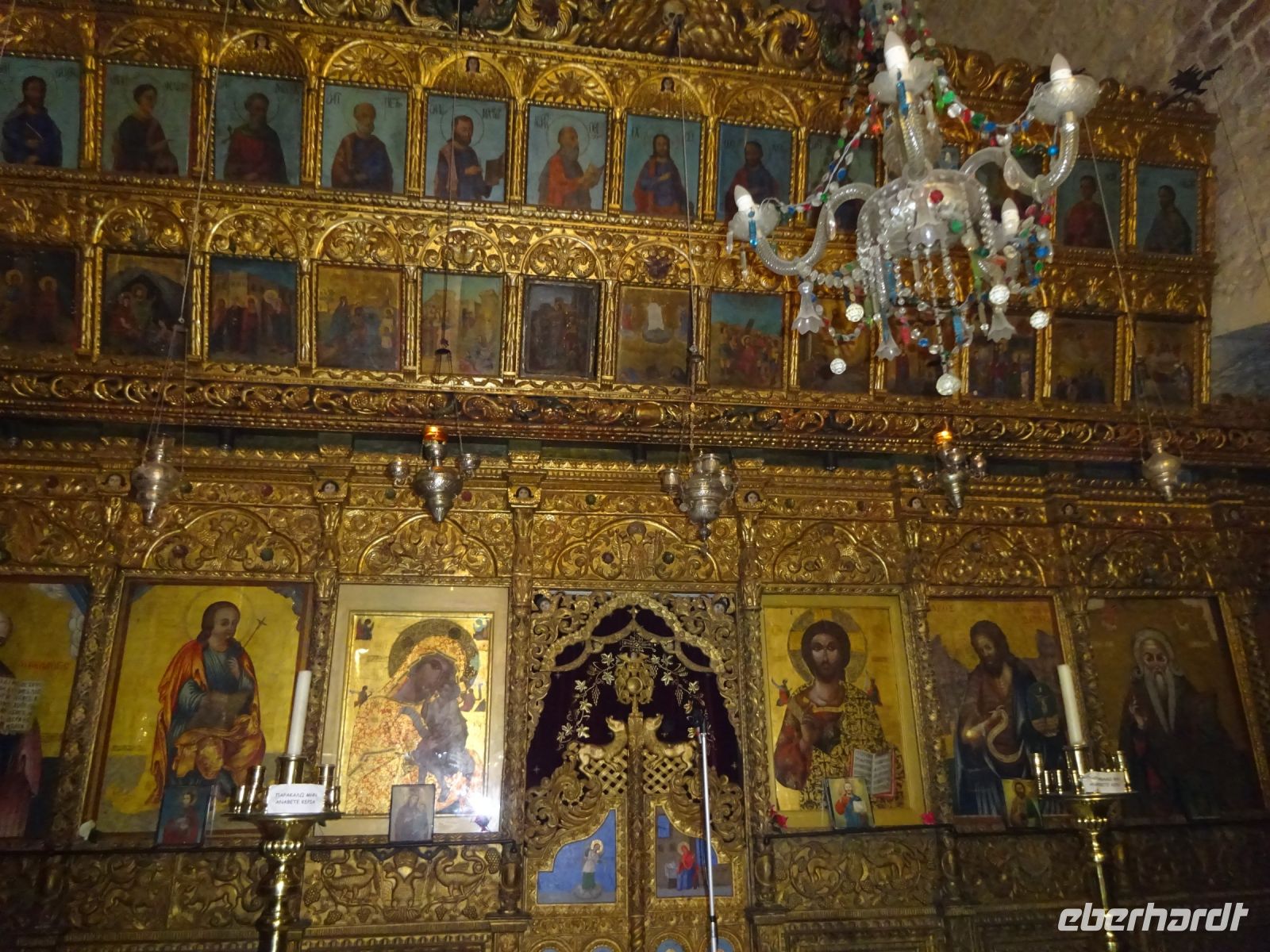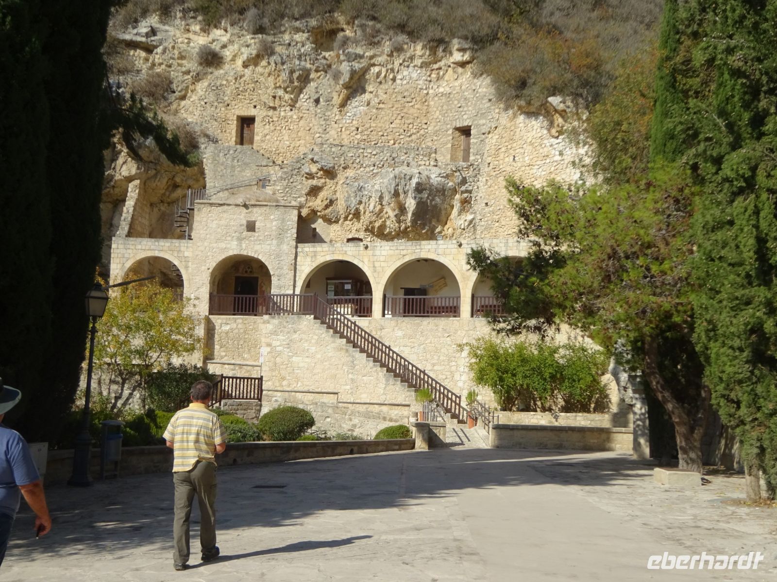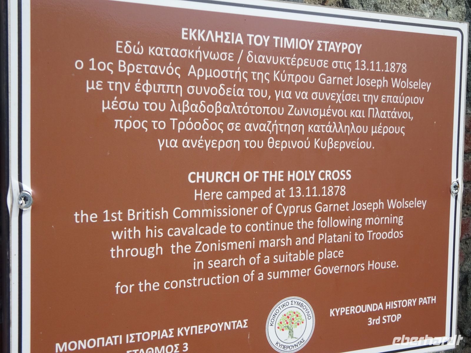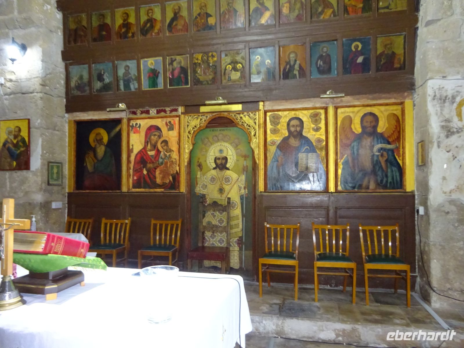 Heute lernen wir nun einige Sehenswürdigkeiten im Troodosgebirge kennen. Erster Programmpunkt sind zwei Scheunendachkirchen nahe beim Dorf Galata. Beide, die Panagia tis Podithou und die Kirche des Erzengel Michael gehören zum UNESCO-Weltkulturerbe. Äußerlich erinnern diese Kirchen eher an Scheunen, woher sie auch ihren Namen haben, im Inneren kann man sehr gut erhaltene Wandmalereien bewundern. Weiter fuhren wir durch das herrliche Troodosgebirge, auch durch kleine Bergdörfer, die uns Anlass waren, über die Landflucht zu sprechen, die auch hier ein Thema ist. Antonis machte uns unterwegs auf eine alte Kupfermine aufmerksam, die seit über 4.000 Jahren existiert. Nach einer Kaffeepause im nächsten Ort, ging es weiter hinauf. Unser Ziel war das Grab von Erzbischof Makarios auf Throni oberhalb des Kykkos-Klosters, das wir anschließend besuchen werden. Unterwegs erfuhren wir mehr über das Leben und Wirken von Makarios, dem wichtigen und bekannten Staatsmann Zyperns. Mit dem Bus fuhren wir anschließend das kurze Stück hinunter bis zum Kykkos-Kloster, das als eines der mächtigsten Klöster Zyperns gilt. Es wurde im 11. Jahrhundert gegründet. Die Wände der Gänge sind voller Darstellungen aus dem Alten und dem Neuen Testament. In der Kirche des Klosters sahen wir das berühmte Marienbild, im Museum dann die reiche Sammlung an wertvollen Reliquienschreinen. Bevor wir unsere Tour fortsetzten, gönnten wir uns in der Nähe des Klosters eine kleine Erfrischungspause, stöberten ein wenig in den Souvenirläden, genossen die herrlich frische Bergluft. Auf einem anderen Weg ging es dann hinunter. Die Straßen mit den vielen Serpentinen sind eine echte Herausforderung, aber unser Busfahrer Dimos meisterte die Strecke mit Bravour. Nun wollten wir noch auf einen kleinen Spaziergang durch das Dorf Kakopetria gehen, in dessen historischem Ortskern viele Gebäude unter Denkmalschutz stehen. Sie wurden denkmalgerecht saniert, auch mit staatlicher Unterstützung, und erwarten nun Feriengäste. Wieder hatten wir einen Tag voller unvergesslicher Erlebnisse. Zum Abendessen gingen wir in eine Taverne ganz in der Nähe unseres Hotels. Nach so vielen Eindrücken dieses Tages ließen wir uns die zypriotischen Köstlichkeiten ordentlich schmecken: Salat als Vorspeise, als Hauptgericht Mousaka. Ein feines Dessert schloss diese schöne Mahlzeit ab.