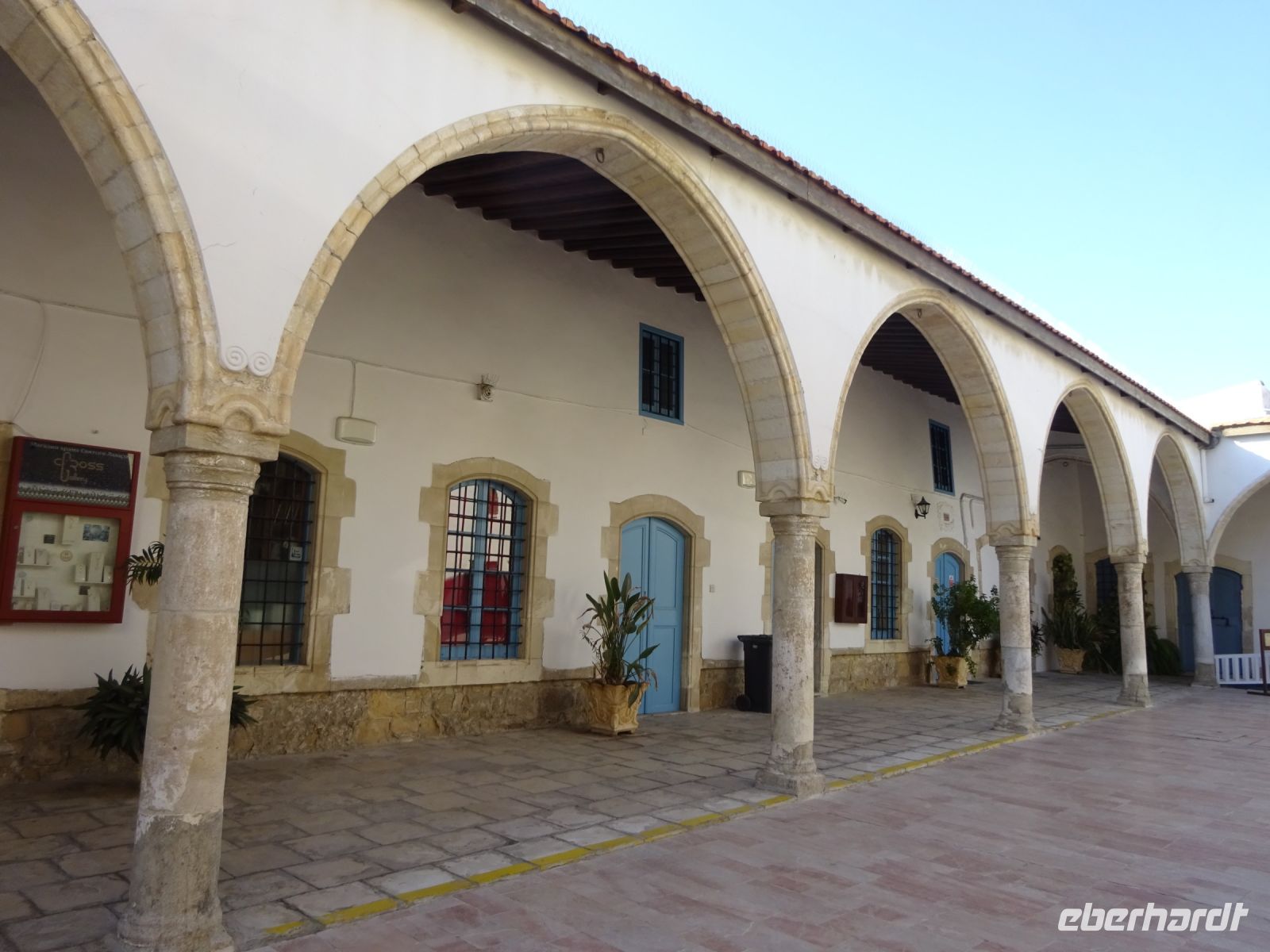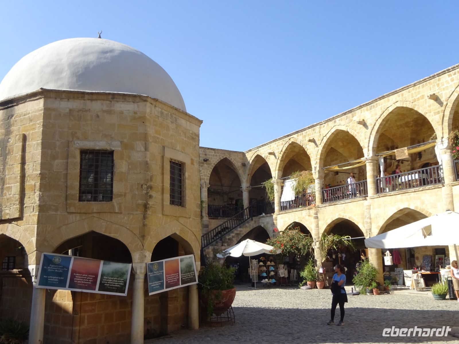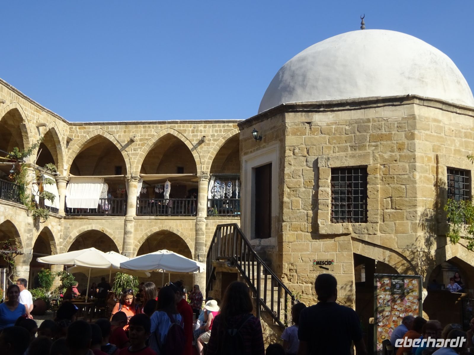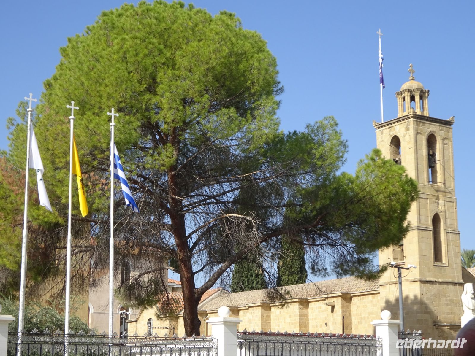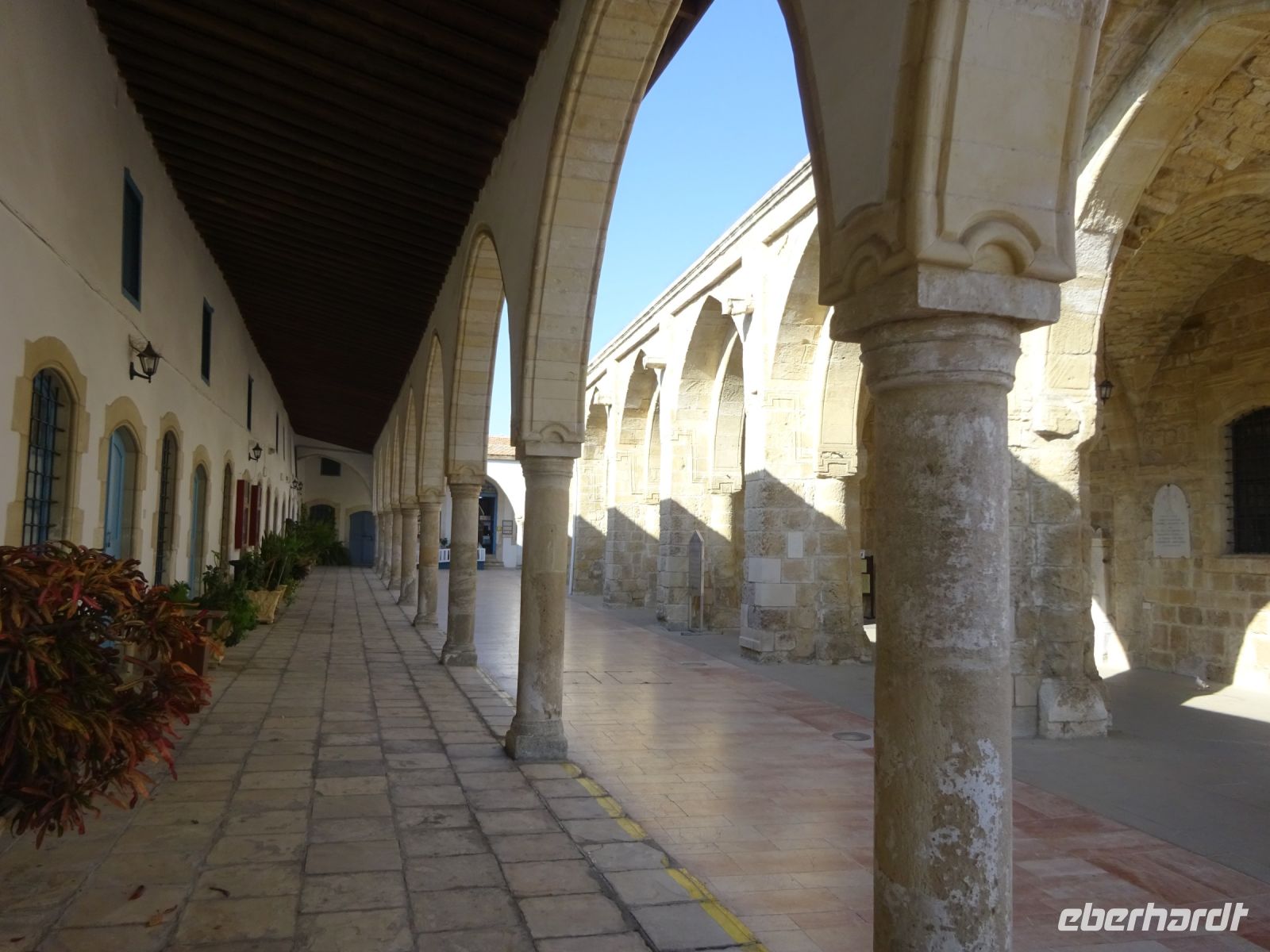 Schon zum Frühstück konnten wir uns ein herrliches Plätzchen auf der Terrasse des Hotels suchen. Da schmeckt alles gleich noch viel besser! Heute stand die Hauptstadt Zyperns auf dem Programm, Nikosia, die letzte geteilte Hauptstadt Europas. Unterwegs erfuhren wir von Antonis die wichtigsten Fakten, die im Jahre 1974 zur Teilung der Hauptstadt und auch der Insel geführt hatten. Nikosia zählt heute 280.000 Einwohner, verfügt über alle Institutionen, die zu einer Hauptstadt gehören. Unser erster Programmpunkt war das berühmte Archäologische Museum. Es beherbergt Ausstellungsstücke von unschätzbarem Wert, die uns Antonis vorstellte und erklärte. Schmuck, Münzen, Skulpturen, Gebrauchsgegenstände und vieles mehr kann man hier bestaunen. Anschließend brachte uns der Bus bis zum Freiheitsdenkmal. Erbaut im Jahre 1970, symbolisiert es das Ende der britischen Kolonialzeit. Nun gingen wir weiter, sahen den Palast des Erzbischofs, auch die gläserne Garage mit zwei Staatskarossen, die Makarios von Willy Brandt und John F. Kennedy geschenkt bekommen hatte. Gleich daneben ist die Johannes-Kathedrale, erbaut im Jahre 1662, die wir ebenfalls besichtigten. Auf dem Weg zum türkischen Teil der Stadt kamen wir vorbei am Neuen Rathaus, erbaut über antiken Ruinen, eine wirklich eindrucksvolle Lösung, Vergangenheit und Gegenwart so ansprechend zu verbinden. Wir gingen weiter in Richtung Grenze, vorbei an Wachposten, passierten an der Grenze die Passkontrolle. Hinter der Grenze erwartet uns unsere türkische Reisebegleitung. Gemeinsam gingen durch die malerischen Gassen, Einkaufsstraßen und historischen Viertel des türkischen Teils der Stadt. Wir sahen den Basar und dann die einzige erhaltene und fein restaurierte Karawansarai Büyük Han aus dem Jahre 1572. An diesem geschichtsträchtigen Ort erfahren wir auch allerhand über den Handel in dieser Region. An Fotomotiven mangelte es uns da wirklich nicht. Und Antonis „organisierte“ für uns Kostproben vom Börek, einer schmackhaften warmen Teigspeise mit Käsefüllung, die wir in ähnlicher Form schon aus anderen Ländern kennen. Zurück auf der griechischen Seite der Stadt, war noch Zeit für einen kleinen Bummel oder auch eine Erfrischung. Aber nun zog es uns ganz stark zurück in unsere herrliche Hotelanlage am Meer mit dem schönen Strand.