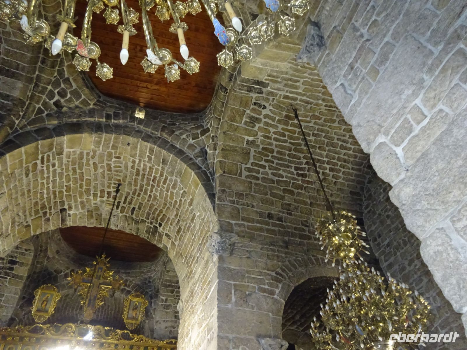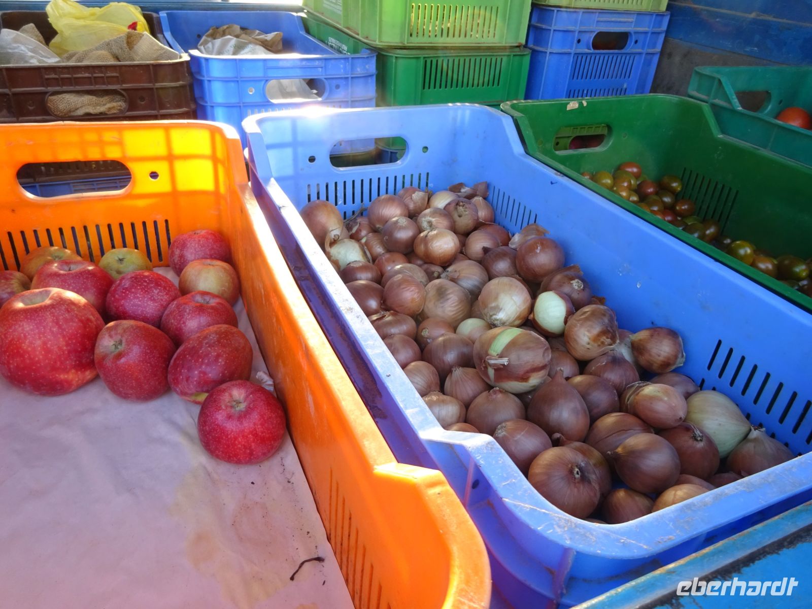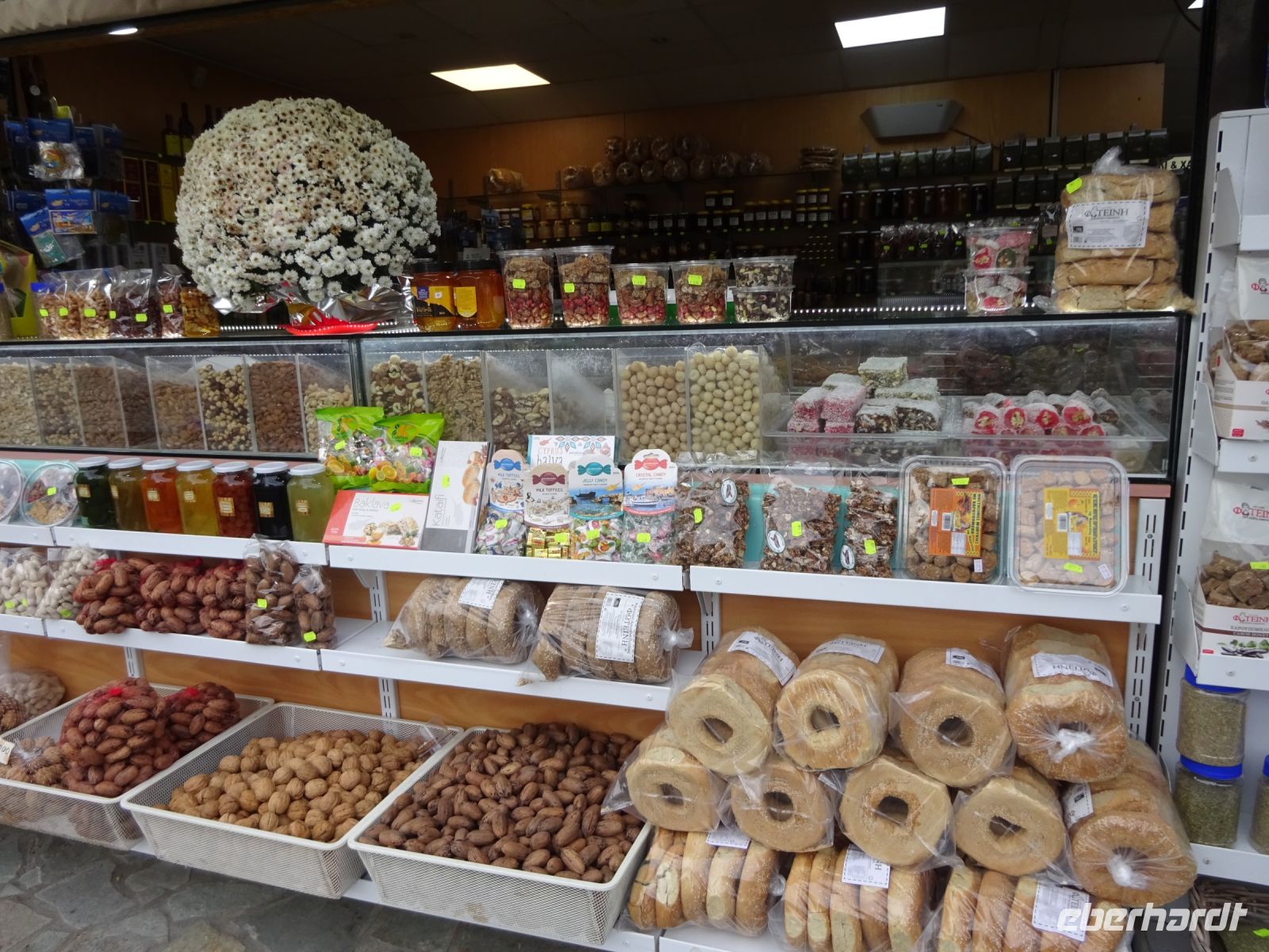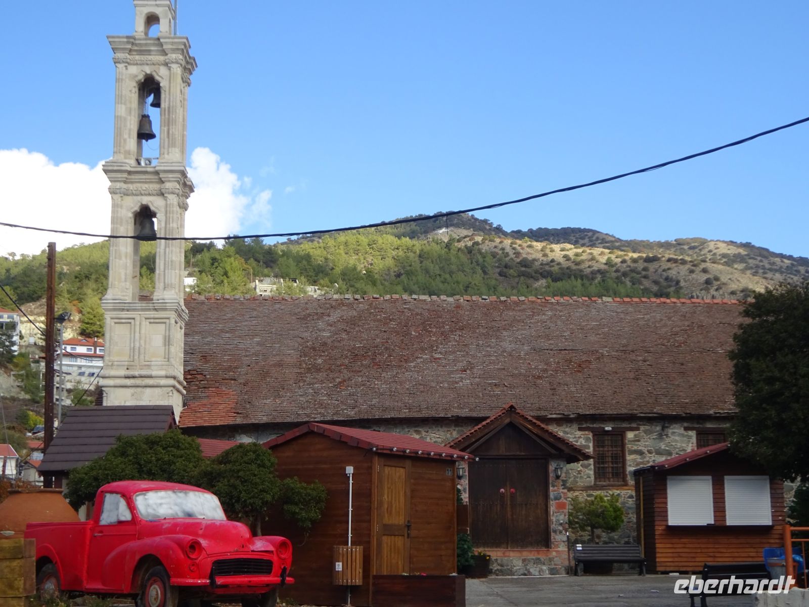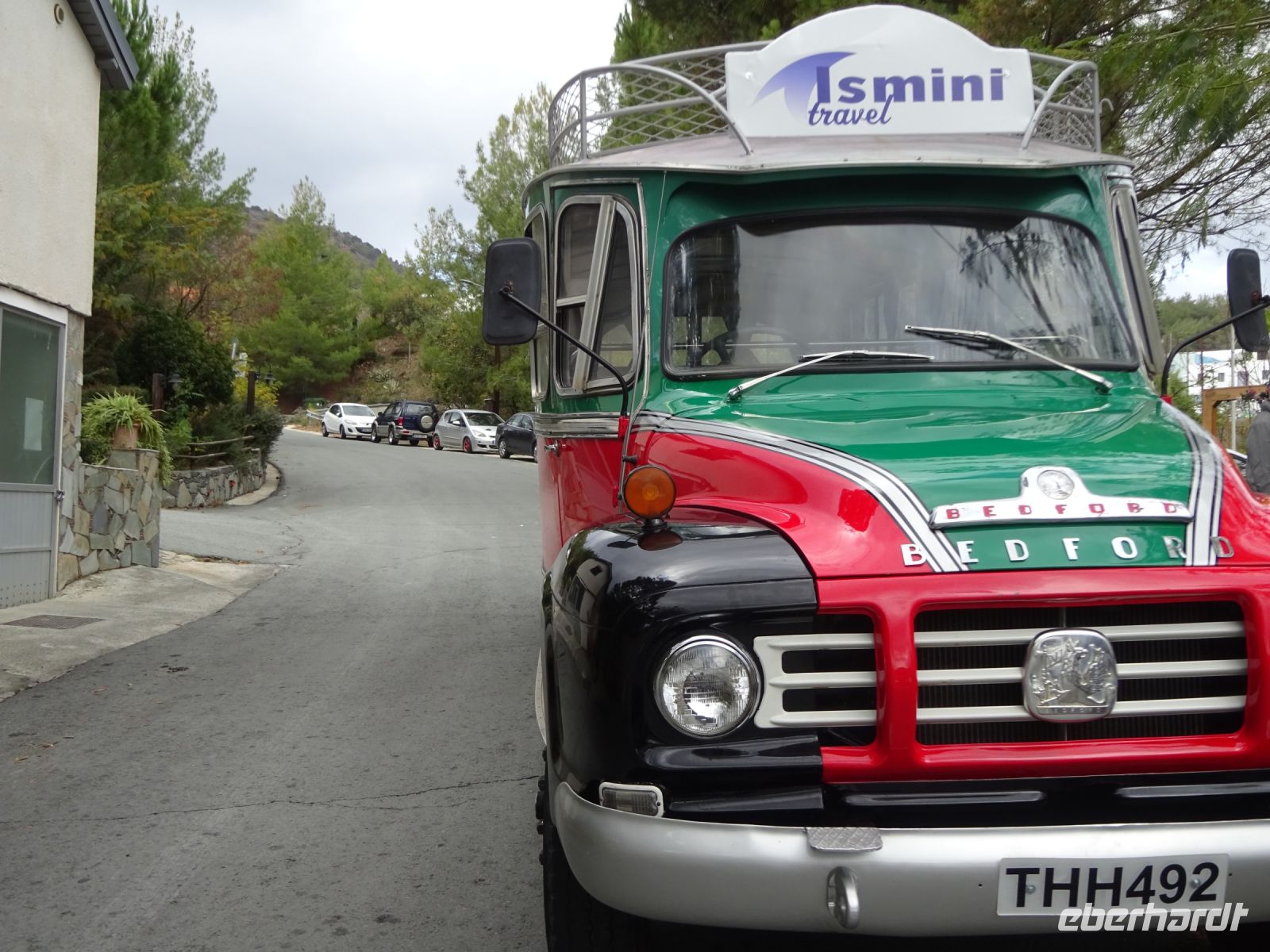 Heute erwartete uns eine echte Überraschung, ein Abenteuer der ganz besonderen Art, denn wir werden mit einem alten Bedford-Bus, einem echten Oldtimer, unterwegs sein. Unser erstes Ziel war der Nachbarort Kyperounda, auch als Apfeldorf bekannt. Zunächst besuchten wir das Heimatmuseum und bekamen einen Einblick in Geschichte und Tradition, nicht nur dieses Dorfes, sondern der ganzen Region. Und da Antonis gefühlt mit halb Zypern bekannt oder verwandt und mit den anderen Hälfte mindestens befreundet ist, war schnell der Bürgermeister des Ortes zur Stelle, schloss uns höchstpersönlich die beiden Kirchen auf, machte Fotos mit uns und war von unserem Besuch ausgesprochen angetan. Nachdem wir die Heiligkreuz-Kirche und auch die Kirche der Heiligen Marina besichtigt hatten, kehrten wir zur Kaffeepause ein. Übrigens, hier waren auf dem Marktplatz und im Ort schon die Vorbereitungen für den Weihnachtsmarkt im Gange, Verkaufsbuden wurden aufgebaut, die Weihnachtsdekoration war teilweise schon vorhanden! Nach dem Vormittagsprogramm in Kyperounta kehrten wir in unserem Bedford-Bus nach Agros zurück. Hier standen gleich eine ganze Reihe verschiedener Verkostungen auf unserem Programm. Zunächst besuchten wir eine Fleischerei und probierten Schinken und diverse Wurstsorten. Danach kamen Süßigkeiten und Marmeladen an die Reihe und zum Schluss noch die Rosenmanufaktur. Überall konnte man kosten und natürlich auch etwas kaufen. Ein paar Mitbringsel braucht man schließlich auch. Und mit all dem nicht genug, gingen wir noch zum Mittagessen in eine Taverne, wo wir erneut die lokale zypriotische Küche in vollen Zügen genießen konnten. Und nicht zu vergessen: die landestypischen Getränke, die wir inzwischen längst schätzen gelernt haben!