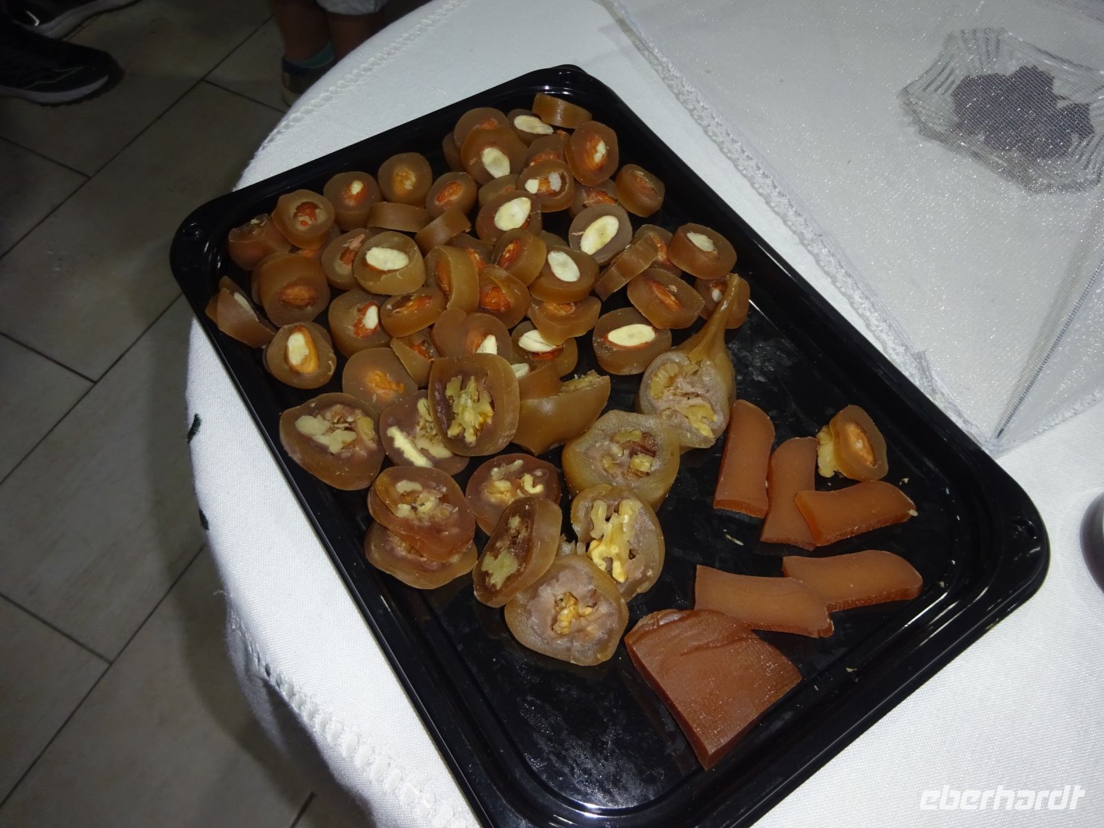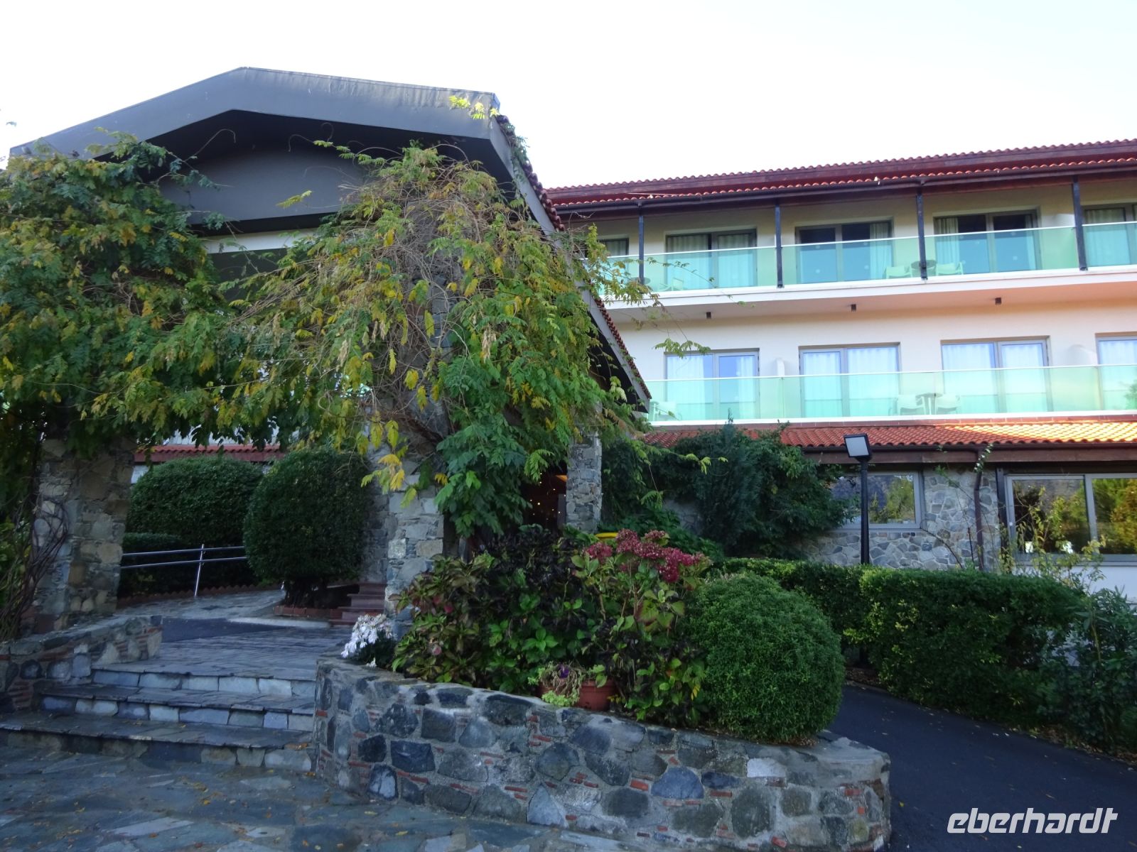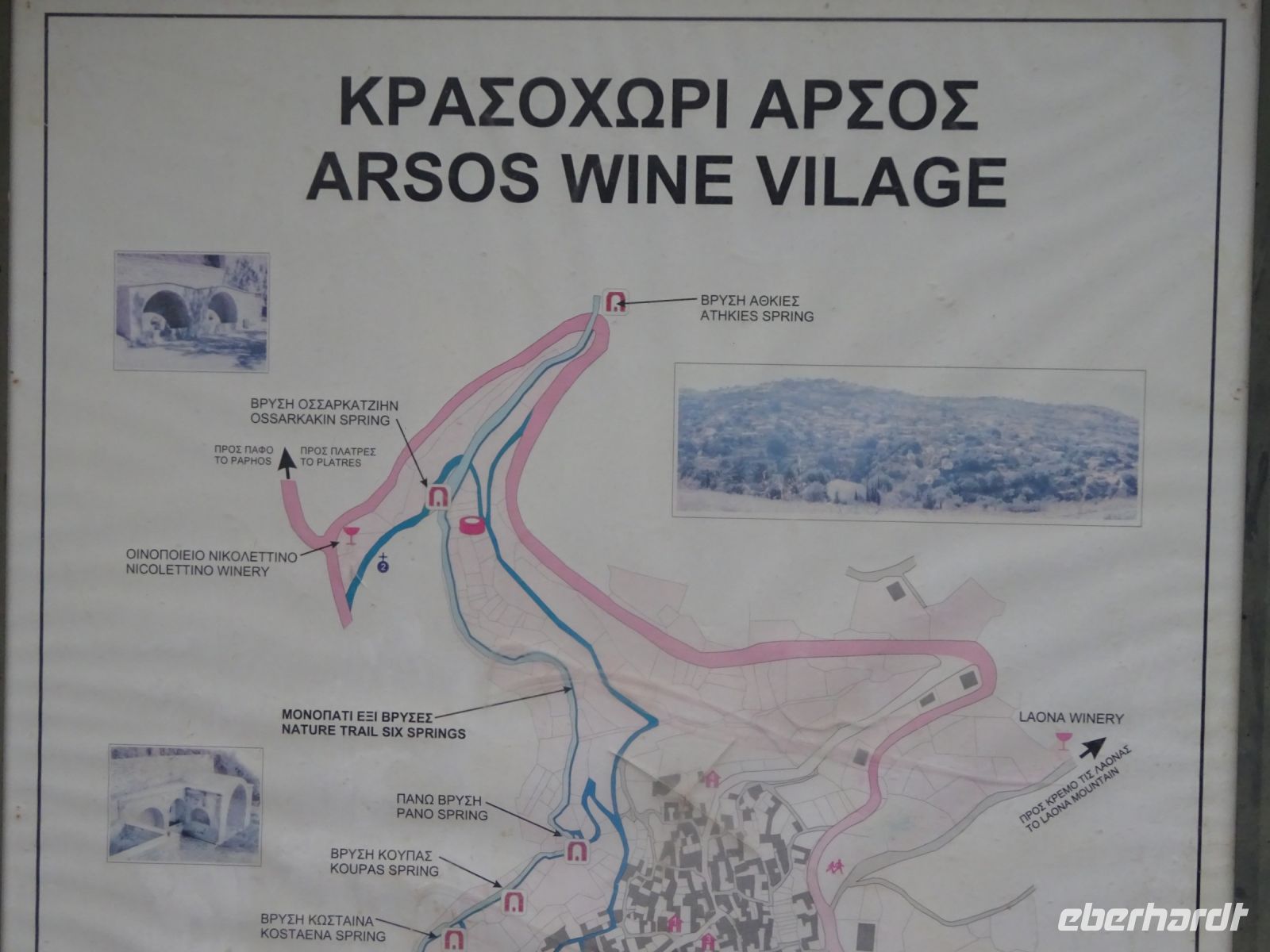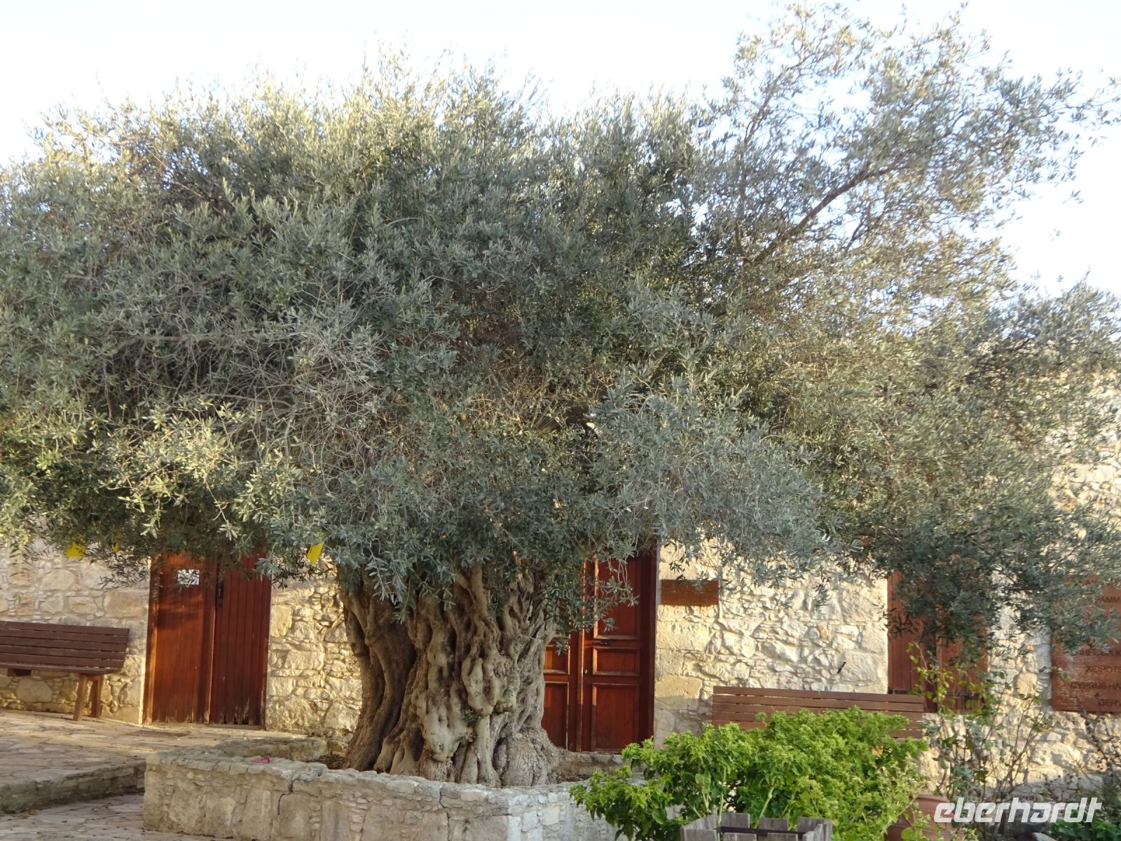 Heute verlassen wir Paphos, unser Hotel Cynthiana Beach und auch die Küste. Es geht nun erstmal weiter ins Landesinnere, ins Troodosgebirge. Auch auf der heutigen Fahrt lernten wir wieder eine Menge. Gerade bot sich die Landwirtschaft als Thema an, denn die Fahrt ging durch eine Art Garten Eden. Beiderseits der Straße sahen wir Plantagen. Alle Arten von Zitrusfrüchten wachsen hier, dazu Bananen und auch eine besondere Frucht, die Mandora, eine Kreuzung aus Mandarine und Orange. Vergleichbare Kreuzungen gibt es auch zwischen Apfel und Birne. Und es blieb nicht bei der Theorie. Antonis bot entsprechende Früchte zum Verkosten an. Immer wieder verwies er auch auf angewandte Forschungen auf dem Gebiet der Landwirtschaft, die gerade hier erfolgreich betrieben werden. Natürlich sahen wir unterwegs wieder Johannesbrotbäume, Olivenplantagen, Gemüsefelder und Gewächshäuser. Es gibt hier übrigens drei Kartoffelernten im Jahr. Übrigens sparte Antonis nicht mit Informationen zur schmackhaften zypriotischen Küche. Die praktischen Beispiele lernten wir jeweils bei Verkostungen und natürlich bei den täglichen Mahlzeiten kennen, ganz gleich, ob im Hotel oder in einer Taverne. Schnell waren wir bei unserem ersten Ziel des heutigen Tages angekommen, dem berühmten Felsen der Aphrodite. Während wir den Anblick der Felsen genossen, die dort direkt am Strand aus dem Wasser ragen, gab es von Antonis die entsprechenden Informationen, wieder eine echte Lehrstunde in griechischer Mythologie. Nun aber schnell zurück in den Bus, denn ein Gewitter zog auf. Die Blitze zuckten schon. Überhaupt war für heute Regen angesagt, über den man sich auf Zypern sehr freut, denn Wasser ist hier knapp, und es regnet eher selten. So waren wir die Regenbringer, was ausgesprochen positiv bewertet wird. Und wir fuhren weiter in Richtung des Troodosgebirges. Unterwegs stellte uns Antonis das zypriotische Schul- und Bildungswesen vor, wie schon bei anderen Themen, unter anderem auch am Beispiel seiner eigenen Familie. Die Landschaft veränderte sich, wir fuhren durch Weinberge, ältere und aber auch ganz neu angepflanzte Rebstöcke sahen wir. Hier hat man übrigens nicht das Problem mit der ansonsten bei Winzern so gefürchteten Reblaus. Den nächsten Stopp hatten wir im Weindorf Arsos geplant. Nach einem kurzen Spaziergang kamen wir in einem kleinen Laden an, wo Süßigkeiten verschiedenster Art zu sehen, zu verkosten und auch zu kaufen waren. Grundbestandteile dieser Köstlichkeiten sind Mandeln, Nüsse, Obst, Wein. Das schmeckte alles wirklich sehr gut und sah auch noch schön aus. Weiter ging es in ein Café, in ein typisches Kafenion, wo uns türkischer Kaffee und Brot mit selbst gekochter Marmelade erwartete. Unseren Aufenthalt im Café mussten wir allerdings unfreiwillig etwas ausdehnen, denn draußen ging ein ordentliches Gewitter nieder. Eine solche Menge Regen hatten wir ja eigentlich nicht bestellt. Aber was will man machen?! Schließlich gingen wir noch in die sehr schöne Philippus-Kirche, gleich gegenüber. Das Volkskundemuseum müssen wir leider wegen Zeitverzug durch das Gewitter streichen, denn wir haben heute noch eine Menge vor. Aber wir werden später noch die Gelegenheit haben, vergleichbare Museen zu besuchen. Nächster Termin war eine Weinverkostung im Dorf Omodos. Anschließend ließen uns von Antonis die älteste Weinpresse der Insel Zypern erklären. Nun stand eine weitere kulinarische Erfahrung auf unserem Programm, ein Meze-Essen. In der Taverne Takis im Dorf Vouni war alles für uns vorbereitet. Wir waren gespannt! Meze ist eine Zusammenstellung zypriotischer Spezialitäten, die nach und nach serviert werden. Es schmeckte vorzüglich! Wir hatten ganz schön zu tun! Gut gestärkt machten wir uns auf zu unserem Hotel Rodon im Bergdorf Agros im Troodosgebirge, wo wir unser Quartier für die nächsten drei Tage bezogen. Von unserem versierten Busfahrer Nikos verabschiedeten wir uns hier herzlich und bedankten uns, denn morgen erwarten wir einen anderen Fahrer.