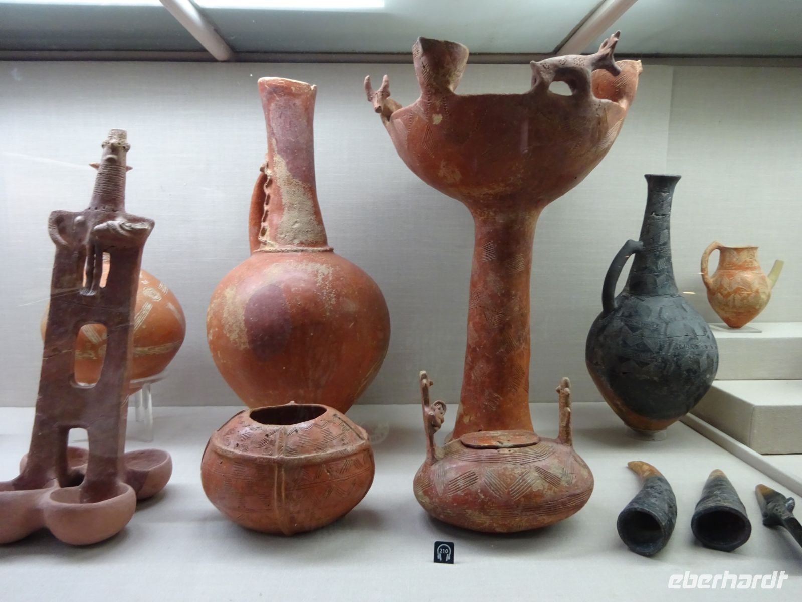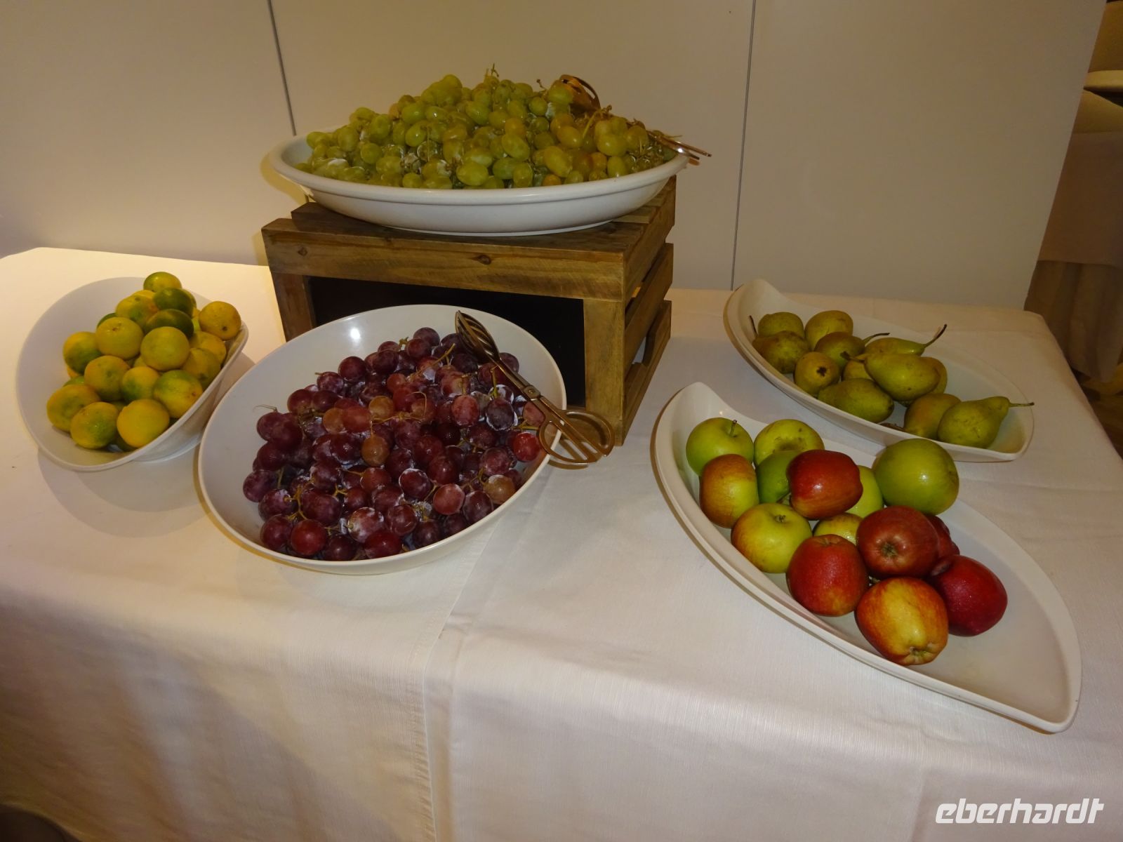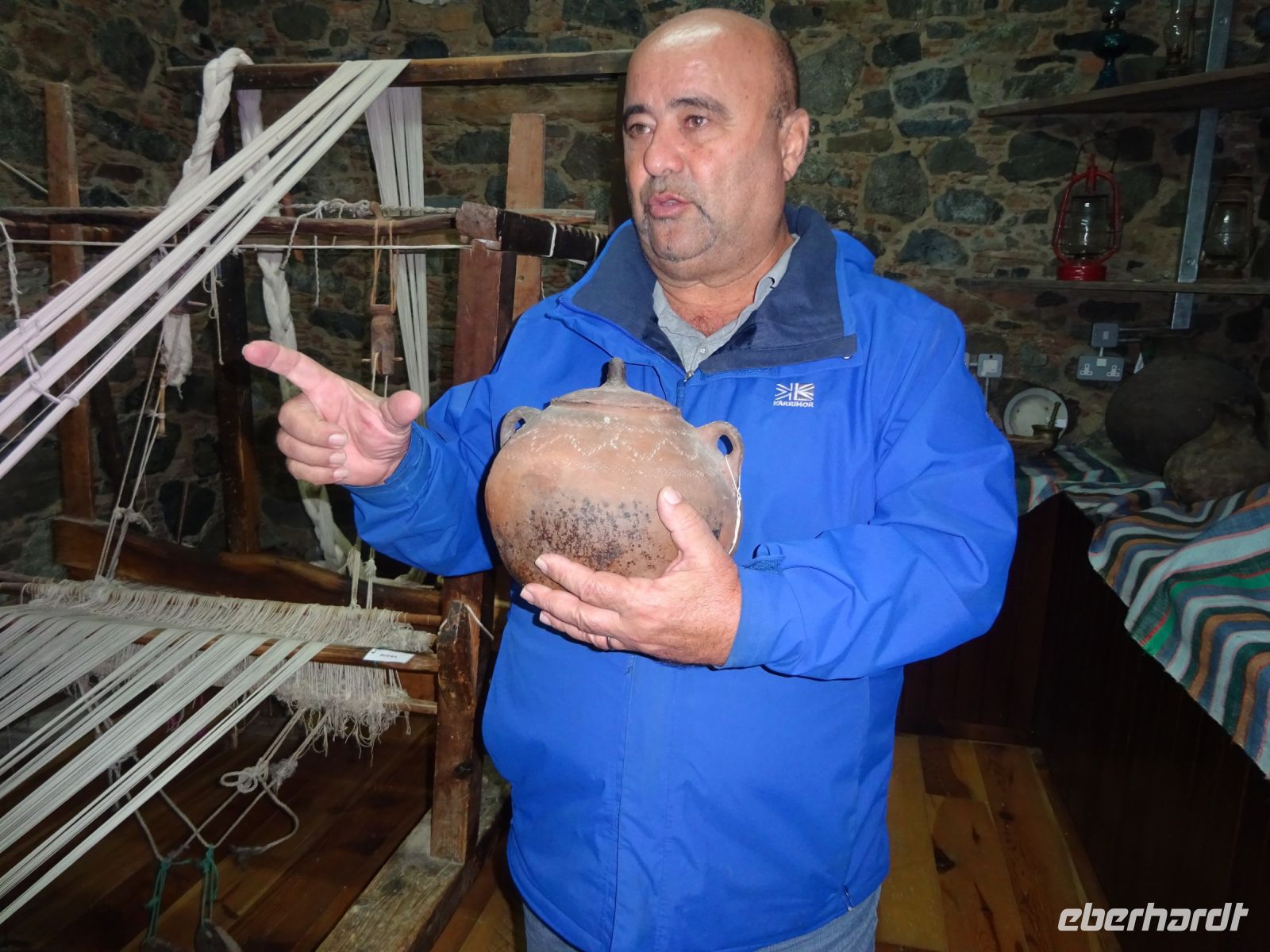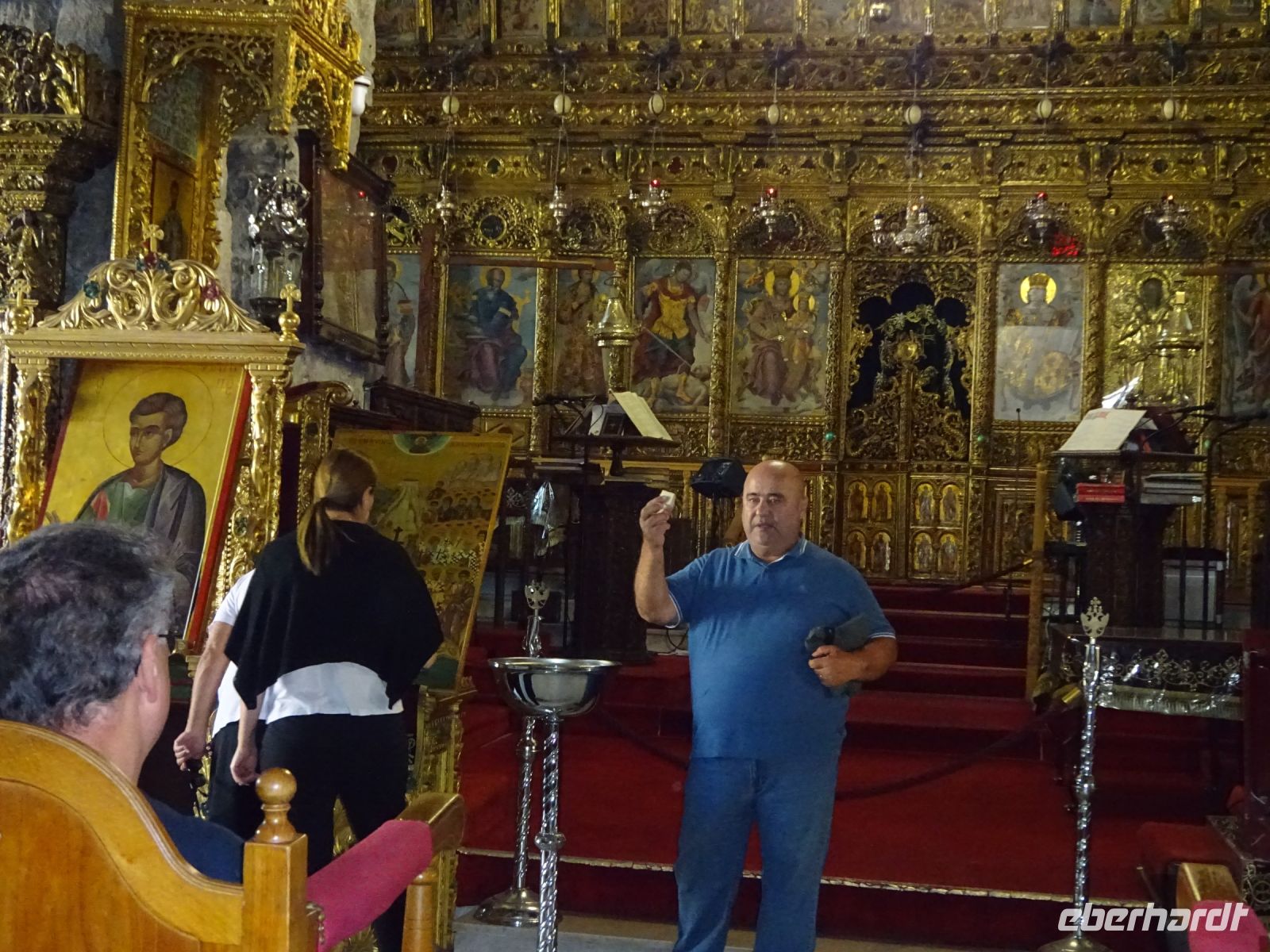 Heute verlassen wir Paphos, unser Hotel Cynthiana Beach und auch die Küste. Es geht nun erstmal weiter ins Landesinnere, ins Troodosgebirge. Auch auf der heutigen Fahrt lernten wir wieder eine Menge. Gerade bot sich die Landwirtschaft als Thema an, denn die Fahrt ging durch eine Art Garten Eden. Beiderseits der Straße sahen wir Plantagen. Alle Arten von Zitrusfrüchten wachsen hier, dazu Bananen und auch eine besondere Frucht, die Mandora, eine Kreuzung aus Mandarine und Orange. Vergleichbare Kreuzungen gibt es auch zwischen Apfel und Birne. Und es blieb nicht bei der Theorie. Antonis bot entsprechende Früchte zum Verkosten an. Immer wieder verwies er auch auf angewandte Forschungen auf dem Gebiet der Landwirtschaft, die gerade hier erfolgreich betrieben werden. Natürlich sahen wir unterwegs wieder Johannesbrotbäume, Olivenplantagen, Gemüsefelder und Gewächshäuser. Es gibt hier übrigens drei Kartoffelernten im Jahr. Übrigens sparte Antonis nicht mit Informationen zur schmackhaften zypriotischen Küche. Die praktischen Beispiele lernten wir jeweils bei Verkostungen und natürlich bei den täglichen Mahlzeiten kennen, ganz gleich, ob im Hotel oder in einer Taverne. Schnell waren wir bei unserem ersten Ziel des heutigen Tages angekommen, dem berühmten Felsen der Aphrodite. Während wir den Anblick der Felsen genossen, die dort direkt am Strand aus dem Wasser ragen, gab es von Antonis die entsprechenden Informationen, wieder eine echte Lehrstunde in griechischer Mythologie. Nun aber schnell zurück in den Bus, denn ein Gewitter zog auf. Die Blitze zuckten schon. Überhaupt war für heute Regen angesagt, über den man sich auf Zypern sehr freut, denn Wasser ist hier knapp, und es regnet eher selten. So waren wir die Regenbringer, was ausgesprochen positiv bewertet wird. Und wir fuhren weiter in Richtung des Troodosgebirges. Unterwegs stellte uns Antonis das zypriotische Schul- und Bildungswesen vor, wie schon bei anderen Themen, unter anderem auch am Beispiel seiner eigenen Familie. Die Landschaft veränderte sich, wir fuhren durch Weinberge, ältere und aber auch ganz neu angepflanzte Rebstöcke sahen wir. Hier hat man übrigens nicht das Problem mit der ansonsten bei Winzern so gefürchteten Reblaus. Den nächsten Stopp hatten wir im Weindorf Arsos geplant. Nach einem kurzen Spaziergang kamen wir in einem kleinen Laden an, wo Süßigkeiten verschiedenster Art zu sehen, zu verkosten und auch zu kaufen waren. Grundbestandteile dieser Köstlichkeiten sind Mandeln, Nüsse, Obst, Wein. Das schmeckte alles wirklich sehr gut und sah auch noch schön aus. Weiter ging es in ein Café, in ein typisches Kafenion, wo uns türkischer Kaffee und Brot mit selbst gekochter Marmelade erwartete. Unseren Aufenthalt im Café mussten wir allerdings unfreiwillig etwas ausdehnen, denn draußen ging ein ordentliches Gewitter nieder. Eine solche Menge Regen hatten wir ja eigentlich nicht bestellt. Aber was will man machen?! Schließlich gingen wir noch in die sehr schöne Philippus-Kirche, gleich gegenüber. Das Volkskundemuseum müssen wir leider wegen Zeitverzug durch das Gewitter streichen, denn wir haben heute noch eine Menge vor. Aber wir werden später noch die Gelegenheit haben, vergleichbare Museen zu besuchen. Nächster Termin war eine Weinverkostung im Dorf Omodos. Anschließend ließen uns von Antonis die älteste Weinpresse der Insel Zypern erklären. Nun stand eine weitere kulinarische Erfahrung auf unserem Programm, ein Meze-Essen. In der Taverne Takis im Dorf Vouni war alles für uns vorbereitet. Wir waren gespannt! Meze ist eine Zusammenstellung zypriotischer Spezialitäten, die nach und nach serviert werden. Es schmeckte vorzüglich! Wir hatten ganz schön zu tun! Gut gestärkt machten wir uns auf zu unserem Hotel Rodon im Bergdorf Agros im Troodosgebirge, wo wir unser Quartier für die nächsten drei Tage bezogen. Von unserem versierten Busfahrer Nikos verabschiedeten wir uns hier herzlich und bedankten uns, denn morgen erwarten wir einen anderen Fahrer.