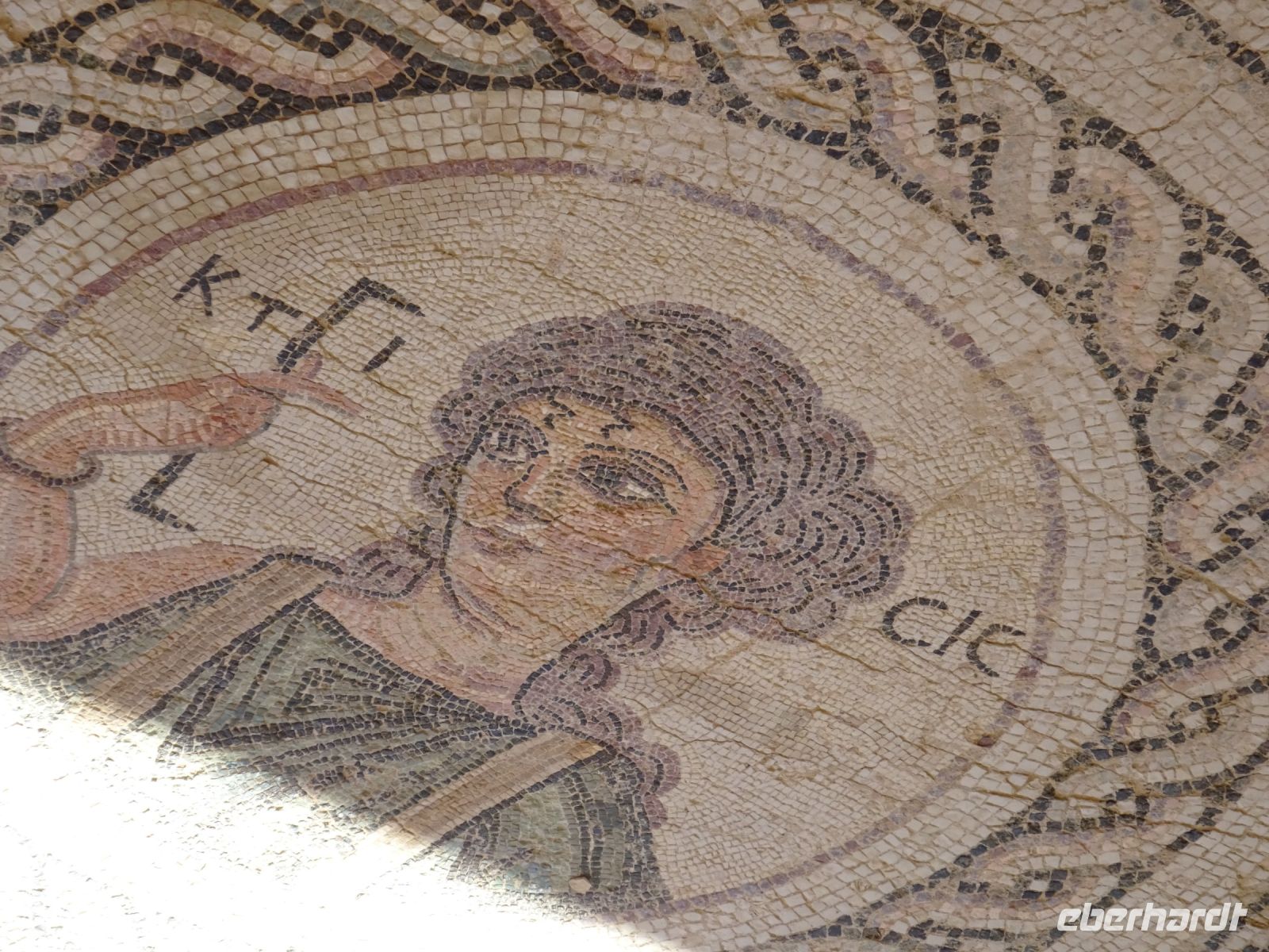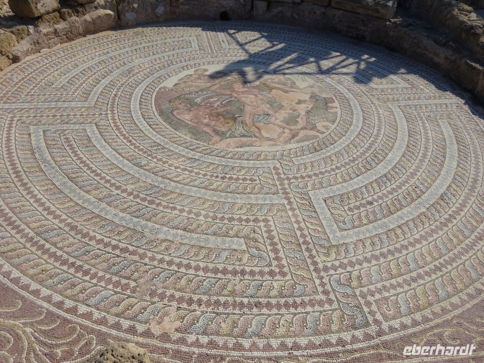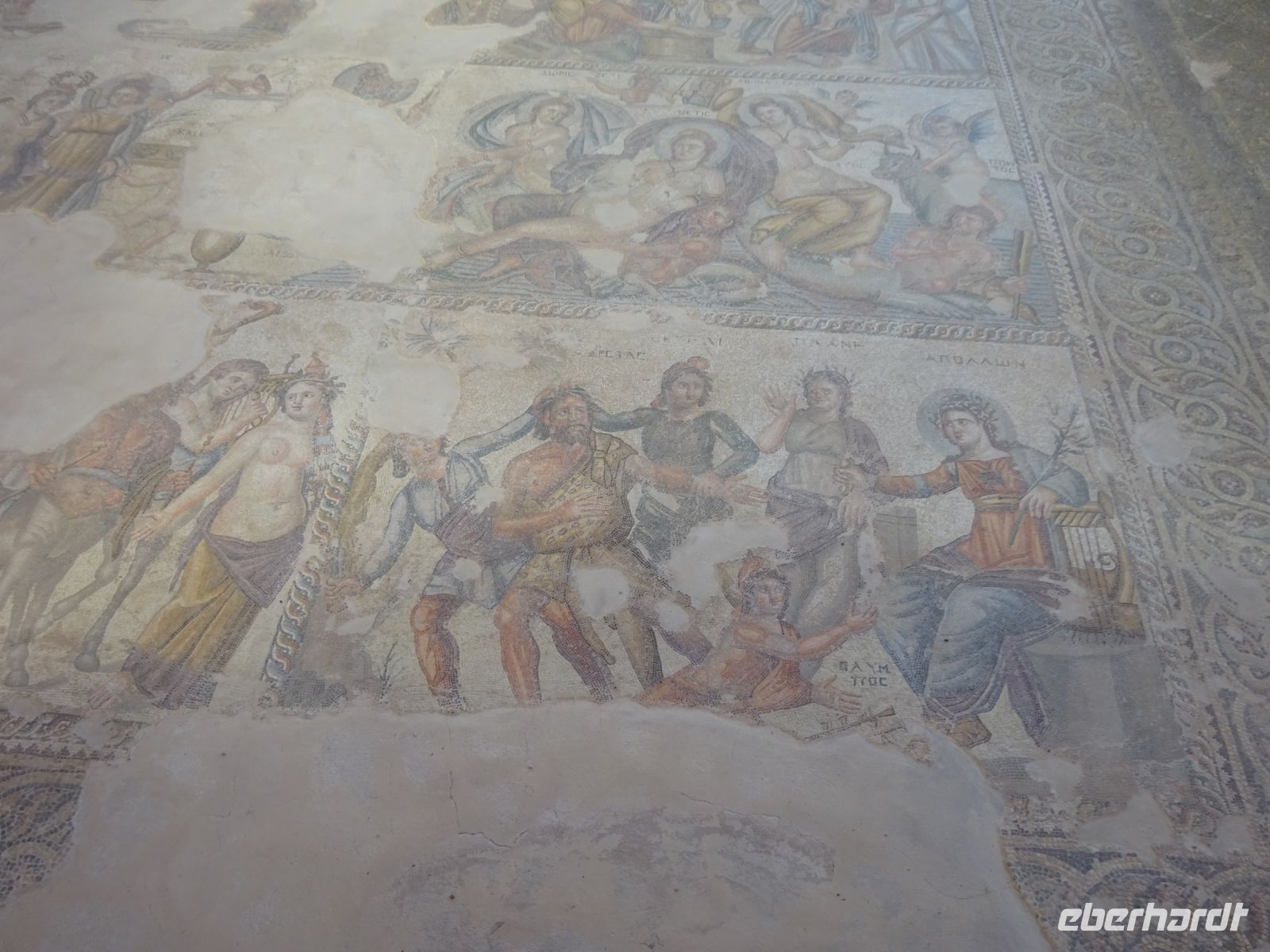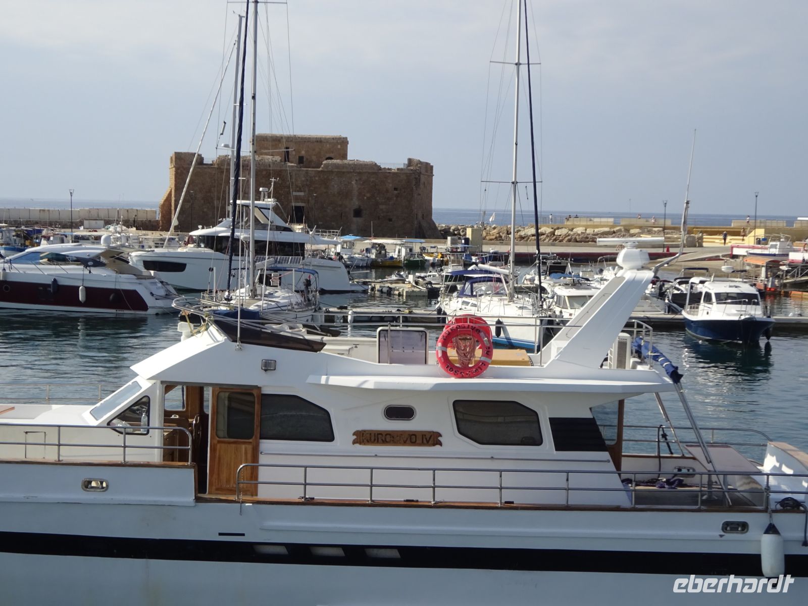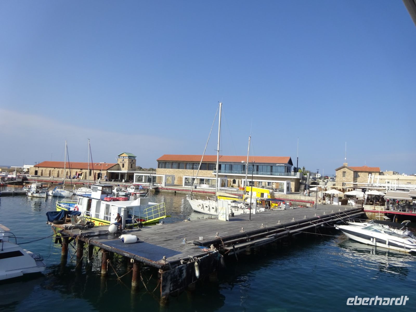 Heute gibt es eine wetterbedingte Programmänderung. Wegen ungünstiger Witterungsverhältnisse, können zur Zeit die Boote nicht, wie ursprünglich auch für uns geplant, hinaus in die Blaue Lagune fahren. So gingen wir diesmal von Paphos aus auf eine Bootsfahrt mit einer Bademöglichkeit im Meer und einem schönen Essen auf dem Schiff. Das fanden wir richtig gut. Der Großteil der Gruppe gönnte sich das einmalige Badeerlebnis. Zuvor hatten wir jedoch gleich am Morgen den Archäologischen Park der Stadt Paphos, der sich nur unweit des Hafens befindet, besucht. Dort steht das Haus des Dionysos mit seinen wertvollen Bodenmosaiken, geschützt von einem nachträglich errichteten Pavillon. Die Mosaike aus dem 2. Jahrhundert n. Chr. wurden 1962 entdeckt und anschließend in mühevoller Kleinarbeit freigelegt. Es ist immer wieder beeindruckend, mit welcher Präzision und ganz ohne moderne Hilfsmittel die Menschen damals diese einzigartigen Kunstwerke geschaffen haben. Seit dem Jahr 1980 gehören diese Mosaike zum UNESCO-Weltkulturerbe. Wir besuchten innerhalb des Archäologischen Parks auch noch das Haus des Aion, mit ähnlich beeindruckenden Kunstwerken. Und am Nachmittag, zurück von der entspannten Bootspartie, sahen wir die Chrysopolitissa-Kirche, konnten sogar hineingehen. Wieder gab es von Antonis ausführliche Erklärungen zu diesem geschichtsträchtigen Ort, an dem auch die Erinnerungssäule für den Apostel Paulus steht, der hier ausgepeitscht worden sein soll, bevor er im Hafen von Paphos aufbrach, um das Christentum zu verbreiten.
